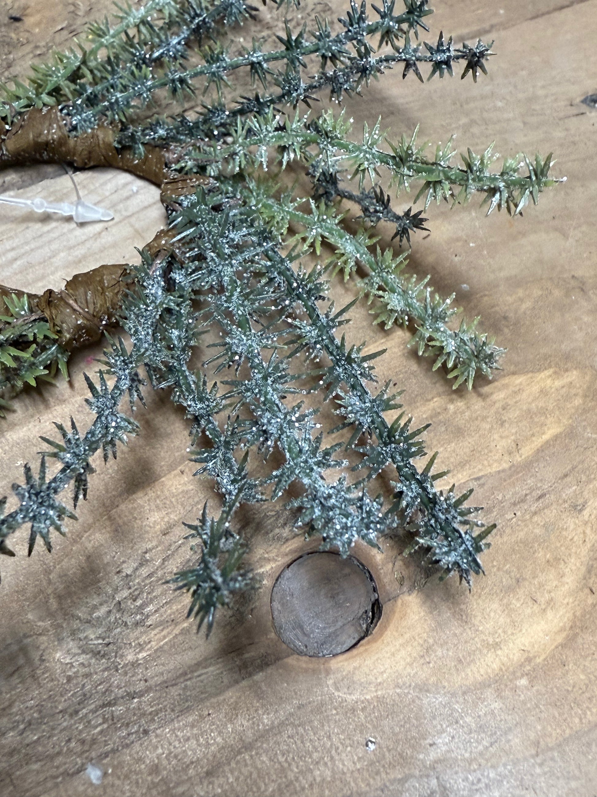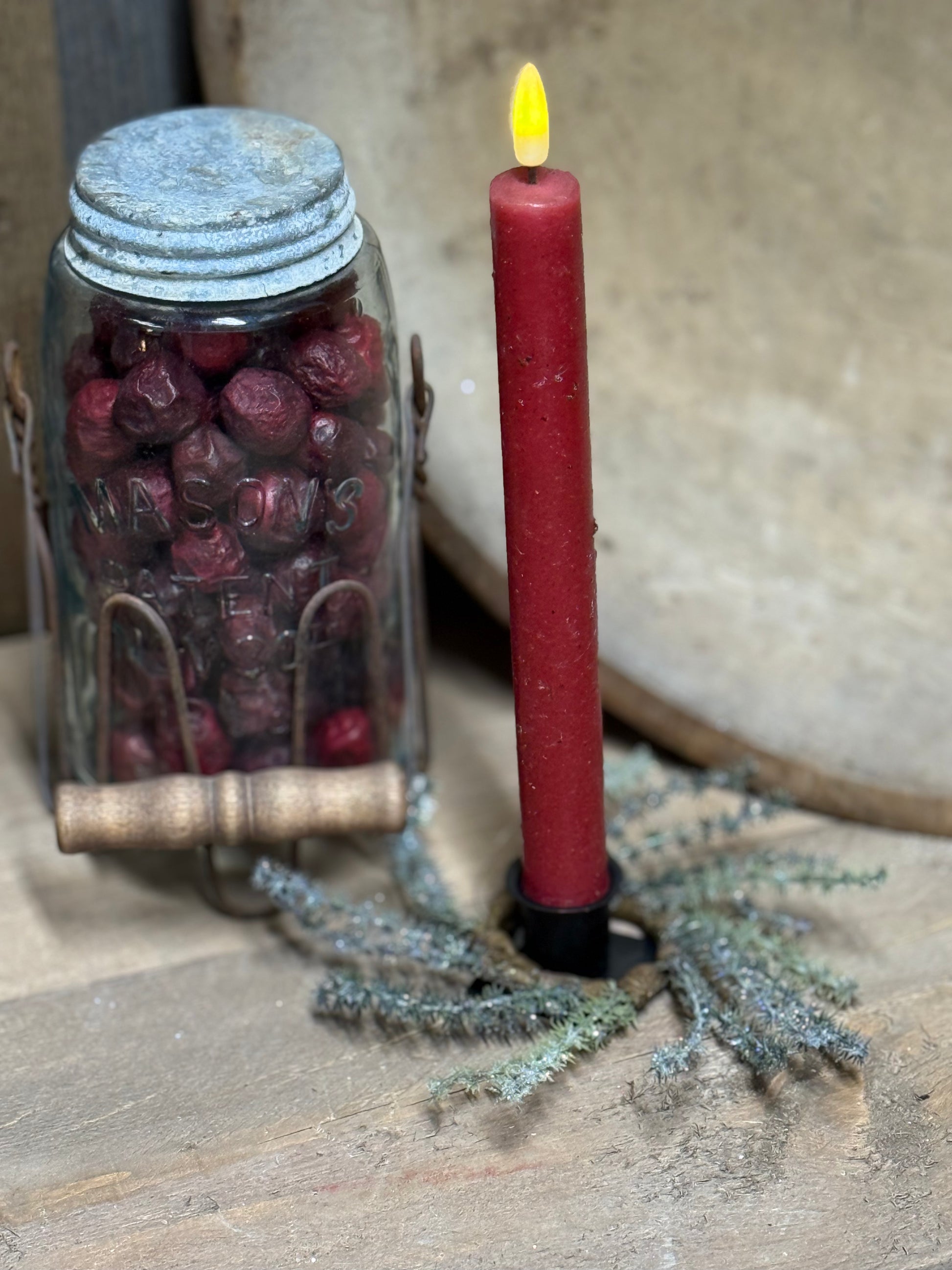 We love the texture and muted tones of the Russian Thistle. Dusted with glitter it has a lovely "first frost" look. Varying shades of greens almost give it a neutral gray look. The Mini Candle Ring is perfect for chandeliers and Taper Candles. Perfect all winter long. This Candle Ring has a 1.5" inner ring and about 6" overall. Also shown is the Wreath, Mini Ring and Pick, sold separately.