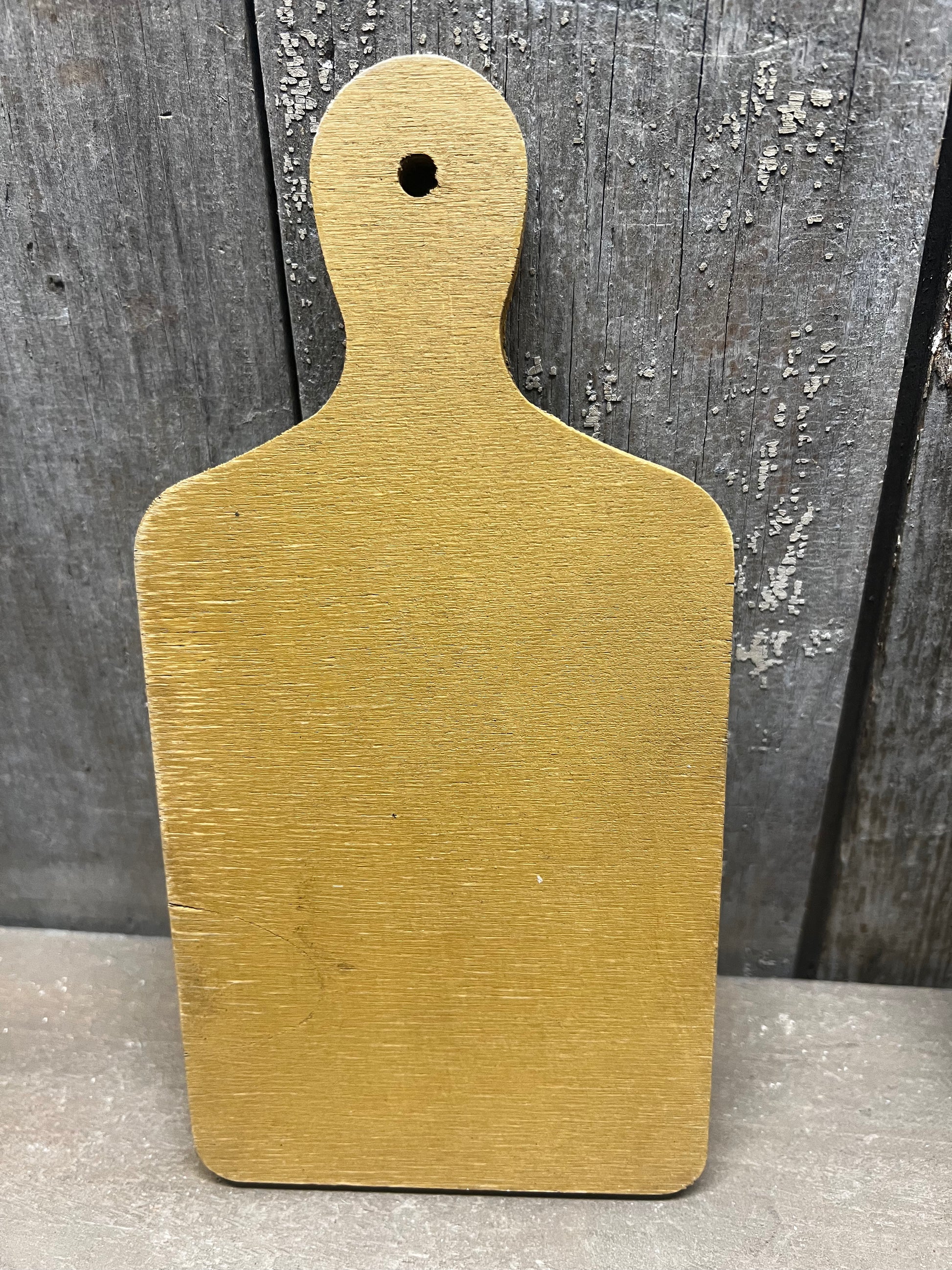 Textured and perfectly primitive! Our mini cutting boards look great as cabinet tucks, hanging from pegs on jute or on the wall with a small nail. Buy one or both. Each and every one is made by hand so expect slight variations. Mustard over Black. Measures 8"x 4".