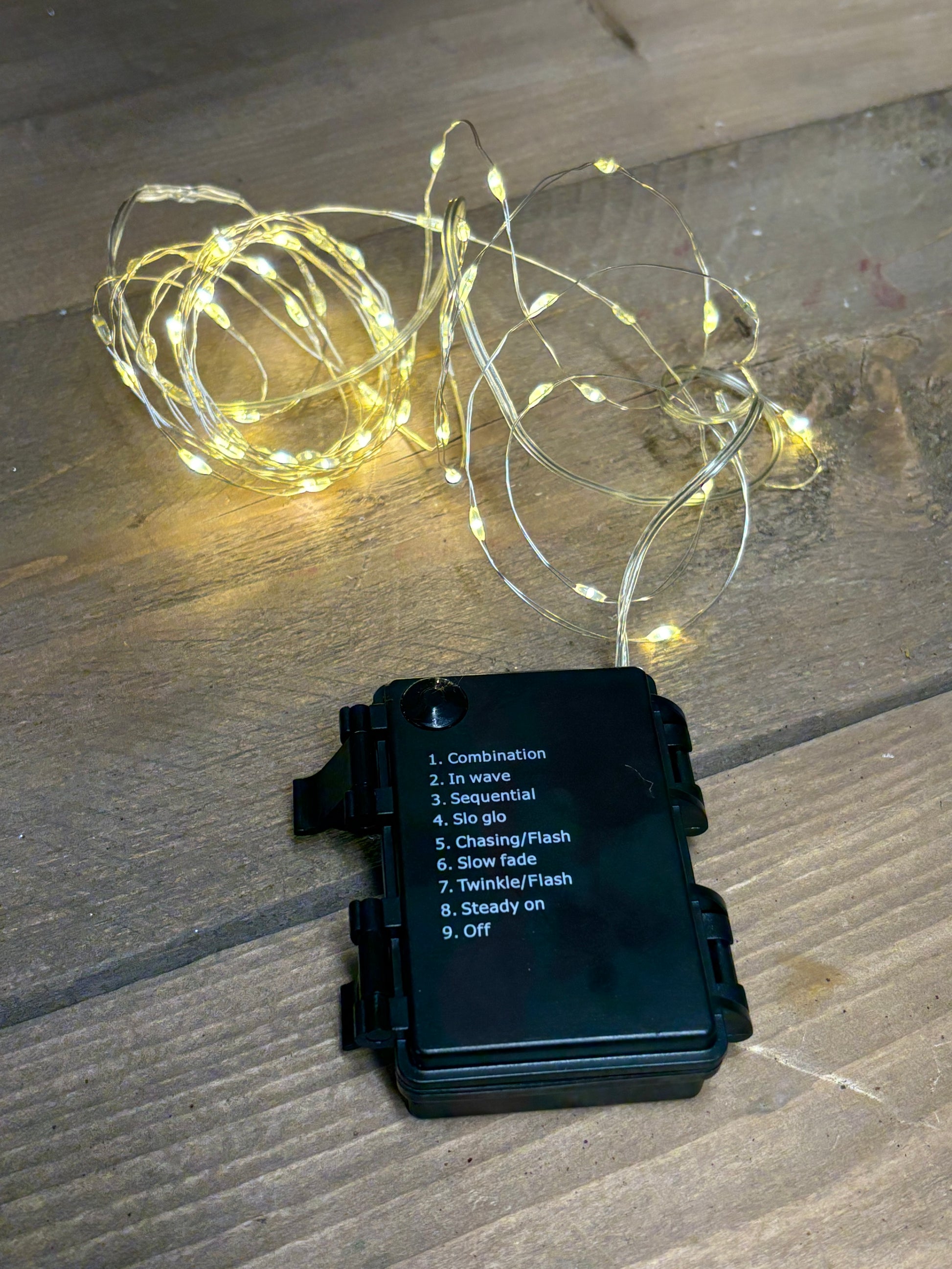 Battery Operated and TIMER, Multi Function, 11.5' thin flexible wire with tiny LED Bulbs. Perfect for small trees and wreaths. Takes 3 AA batteries, not included. Functions include Steady Burn, Slow Fade, Flashing, Dancing, 3 Twinkling speeds. Timer 6 hours on and 18 hours off.