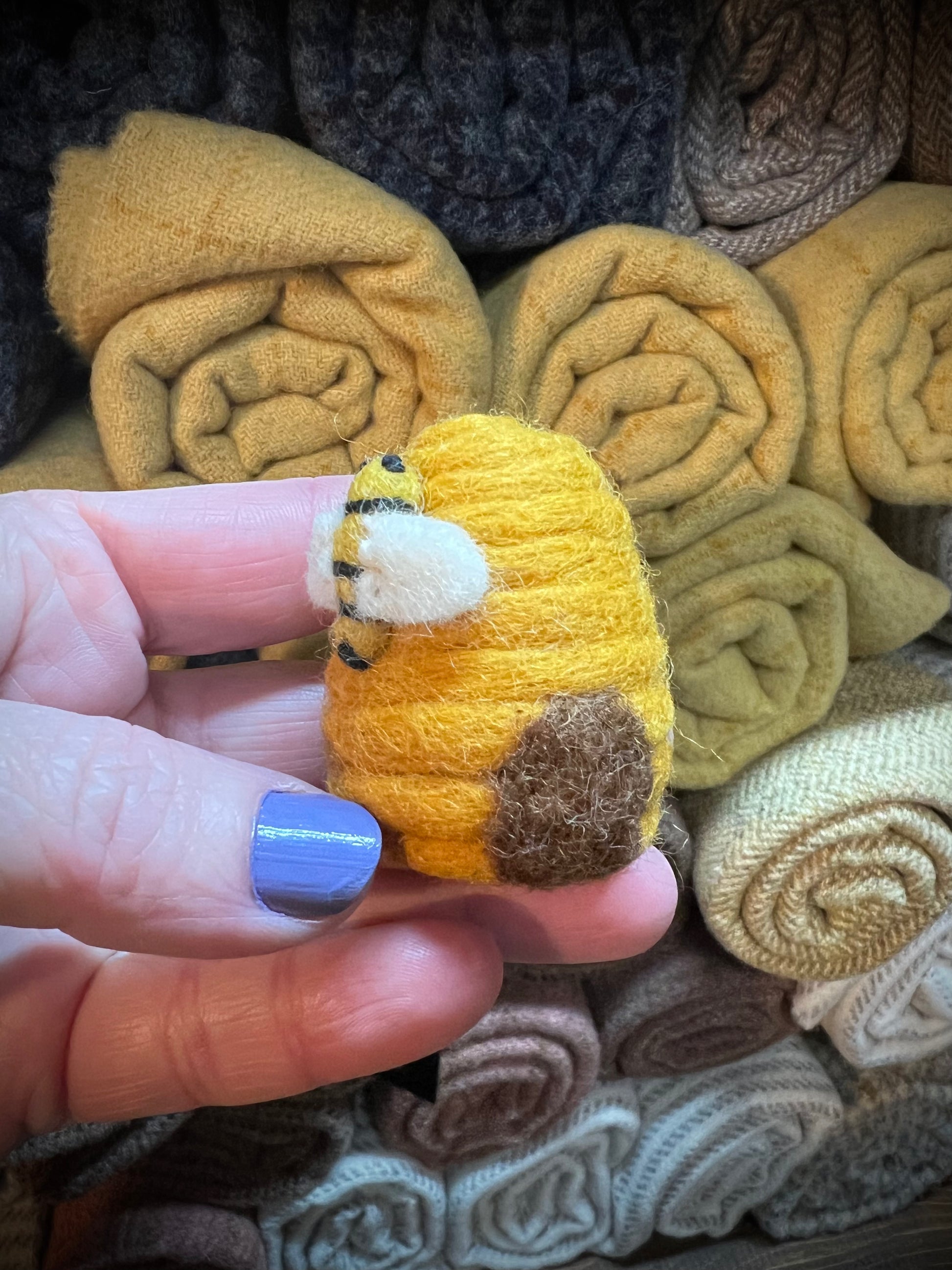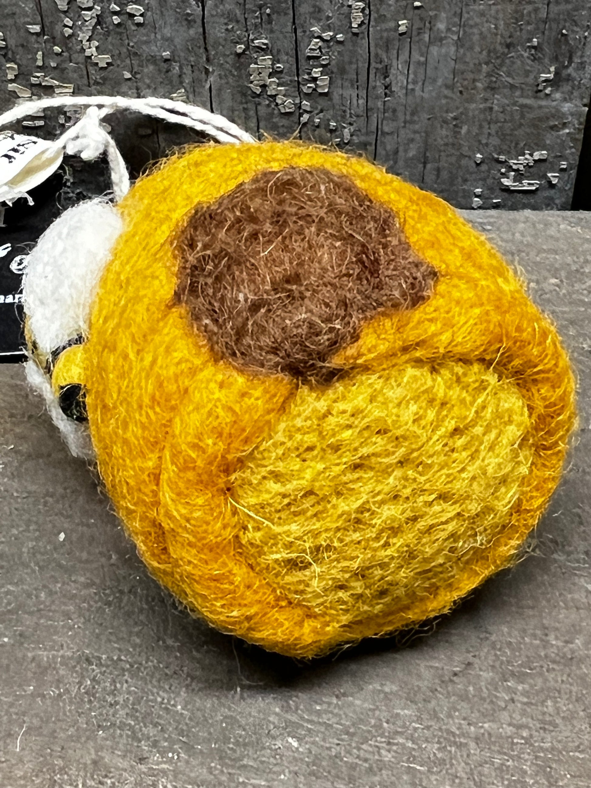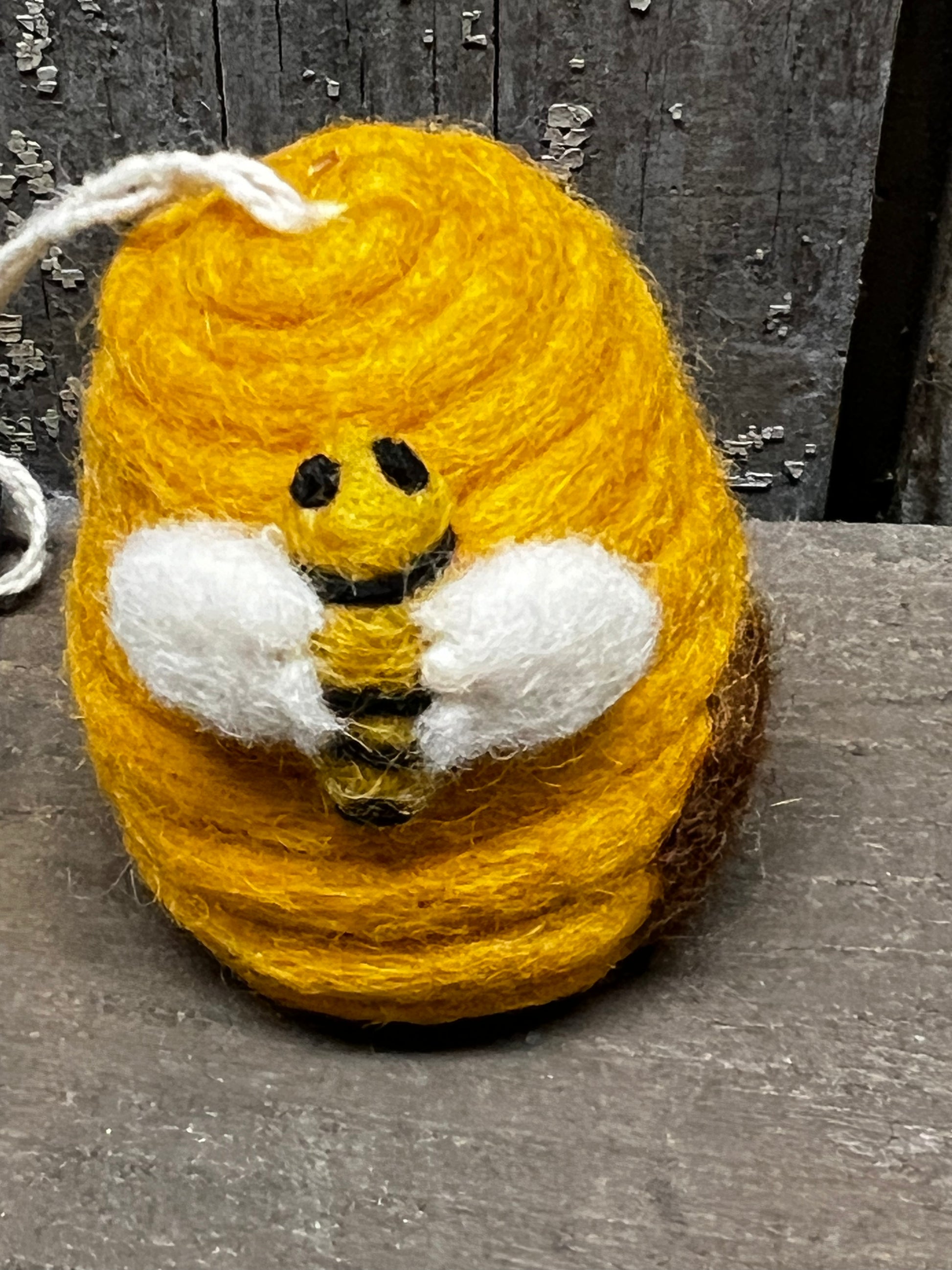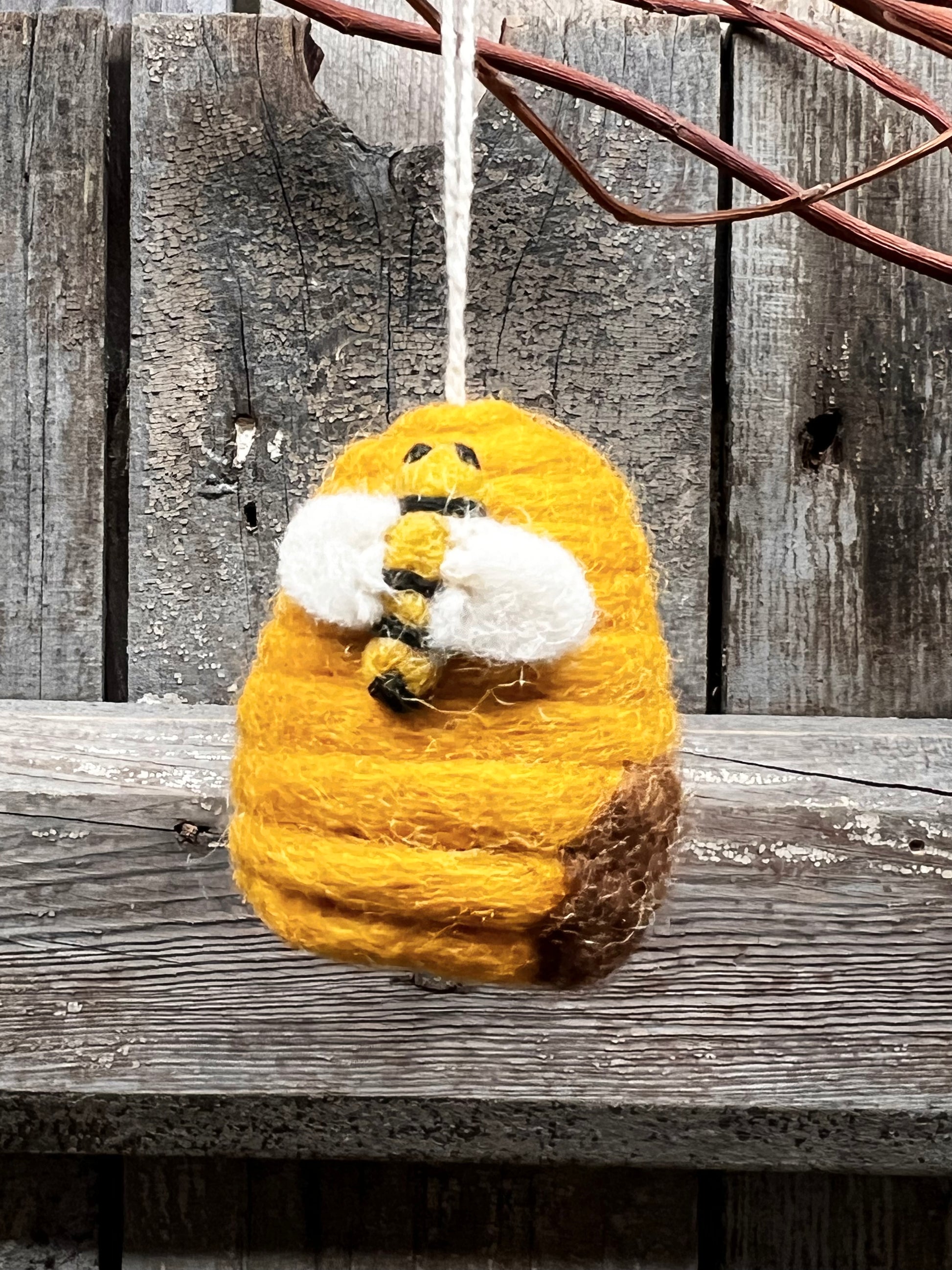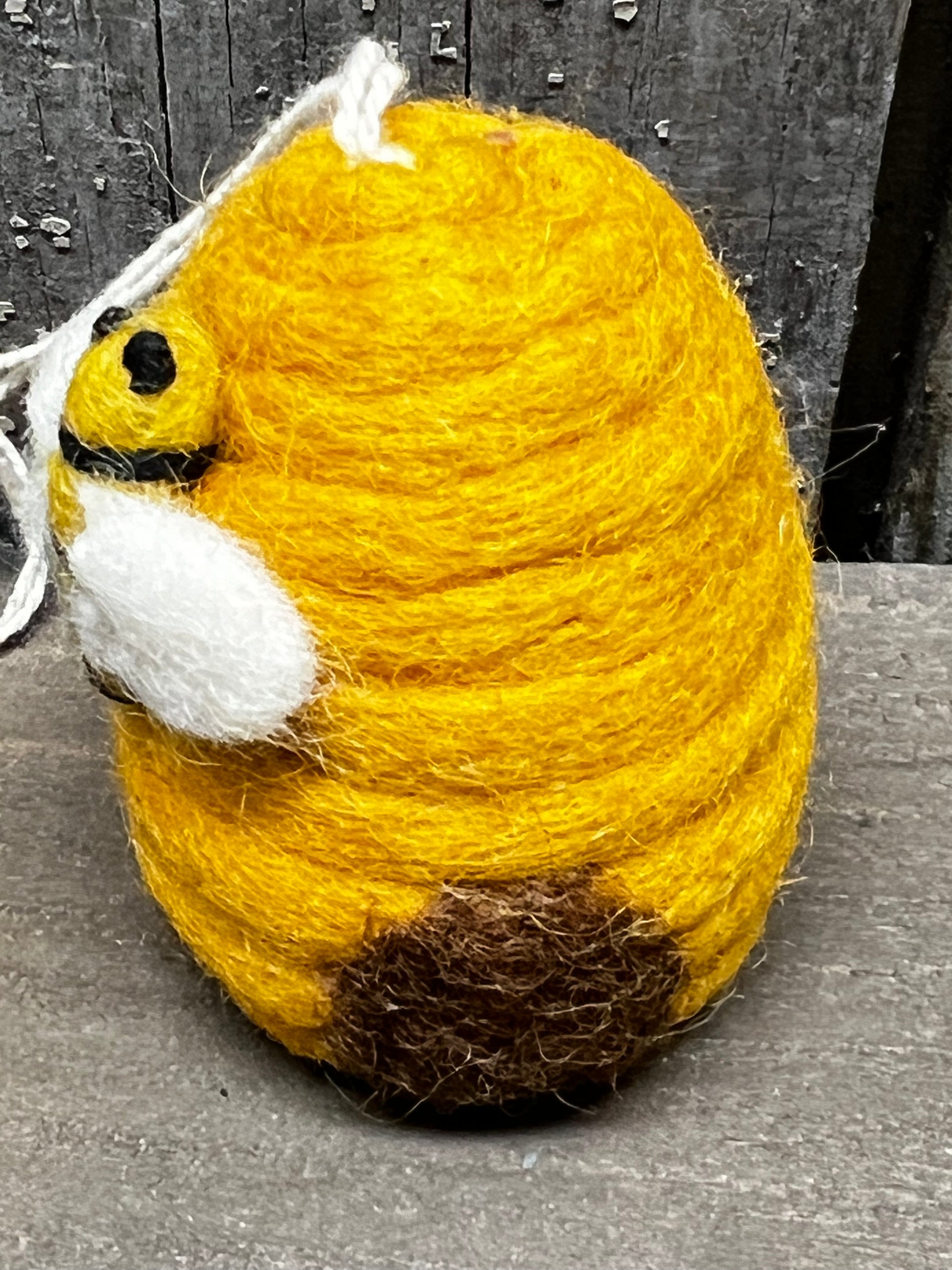 Oh how cute! A sweet little Bee house and a bee felted from pure natural wool from New Zealand. Uniquely hand crafted in Nepal. Measures about 2"x 1.5" and can sit on its own or hang as an ornament.