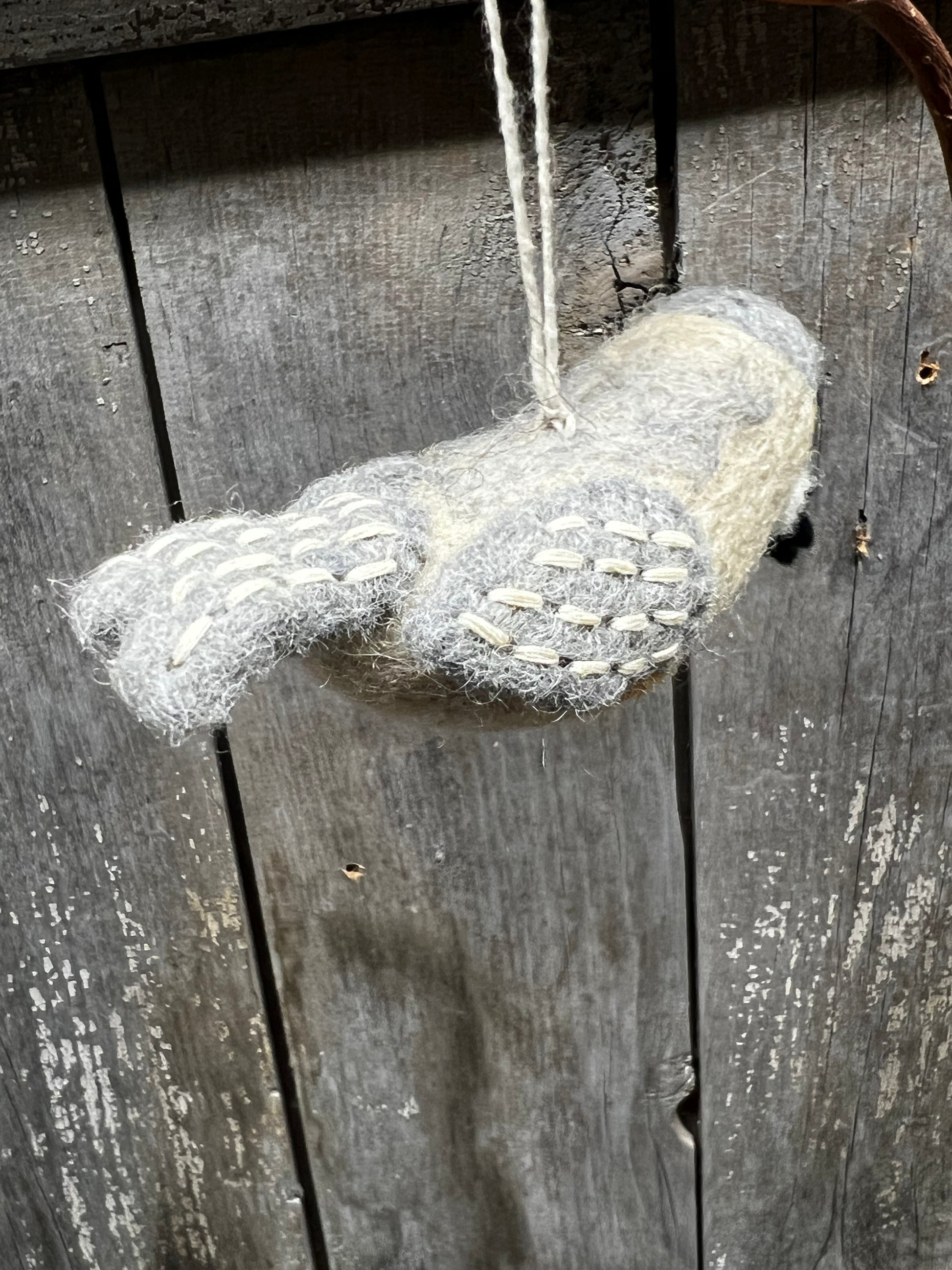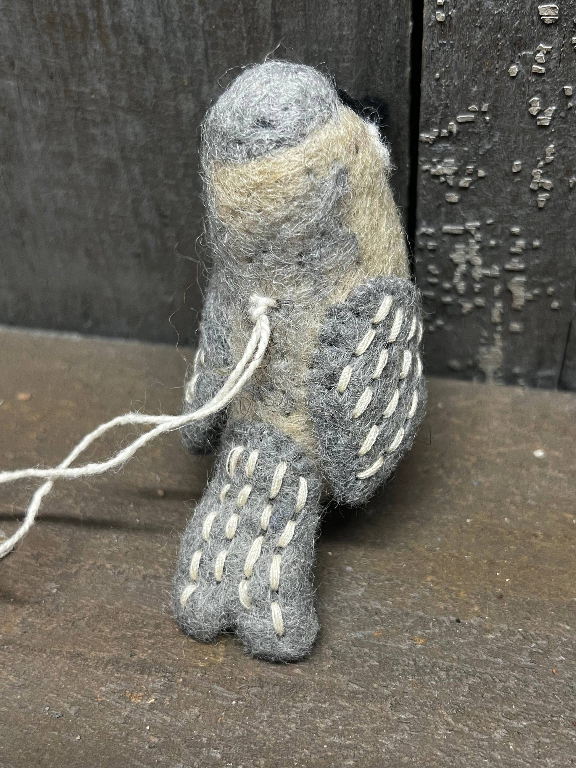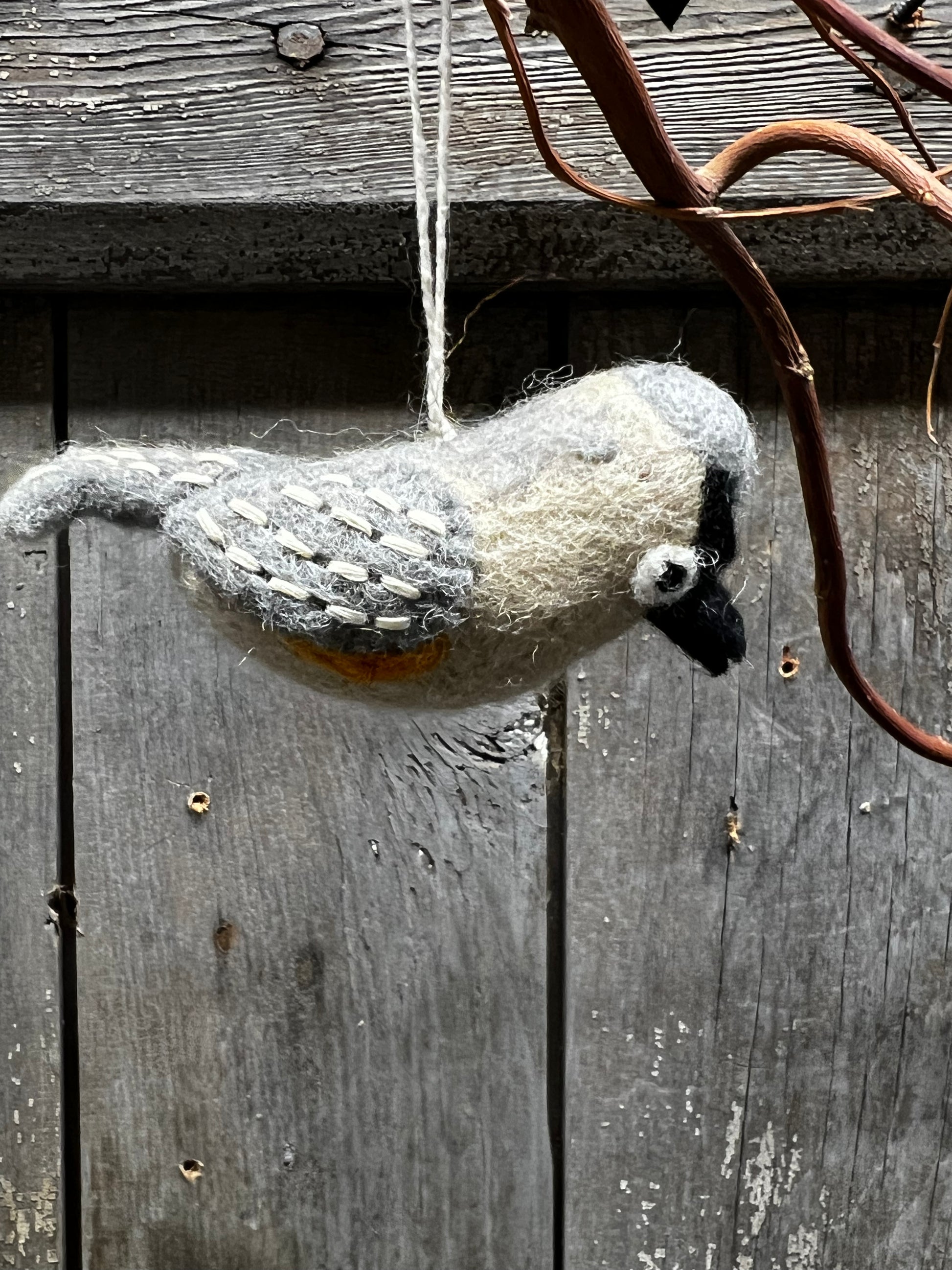 Sweet Tufted Titmouse in beautiful grey, orange, cream and black felted from pure natural wool from New Zealand. Uniquely hand crafted in Nepal. Measures about 2"x 3” hang as an ornament add a stick and use as a flower "poke" or a bowl filler when hang tag is removed.