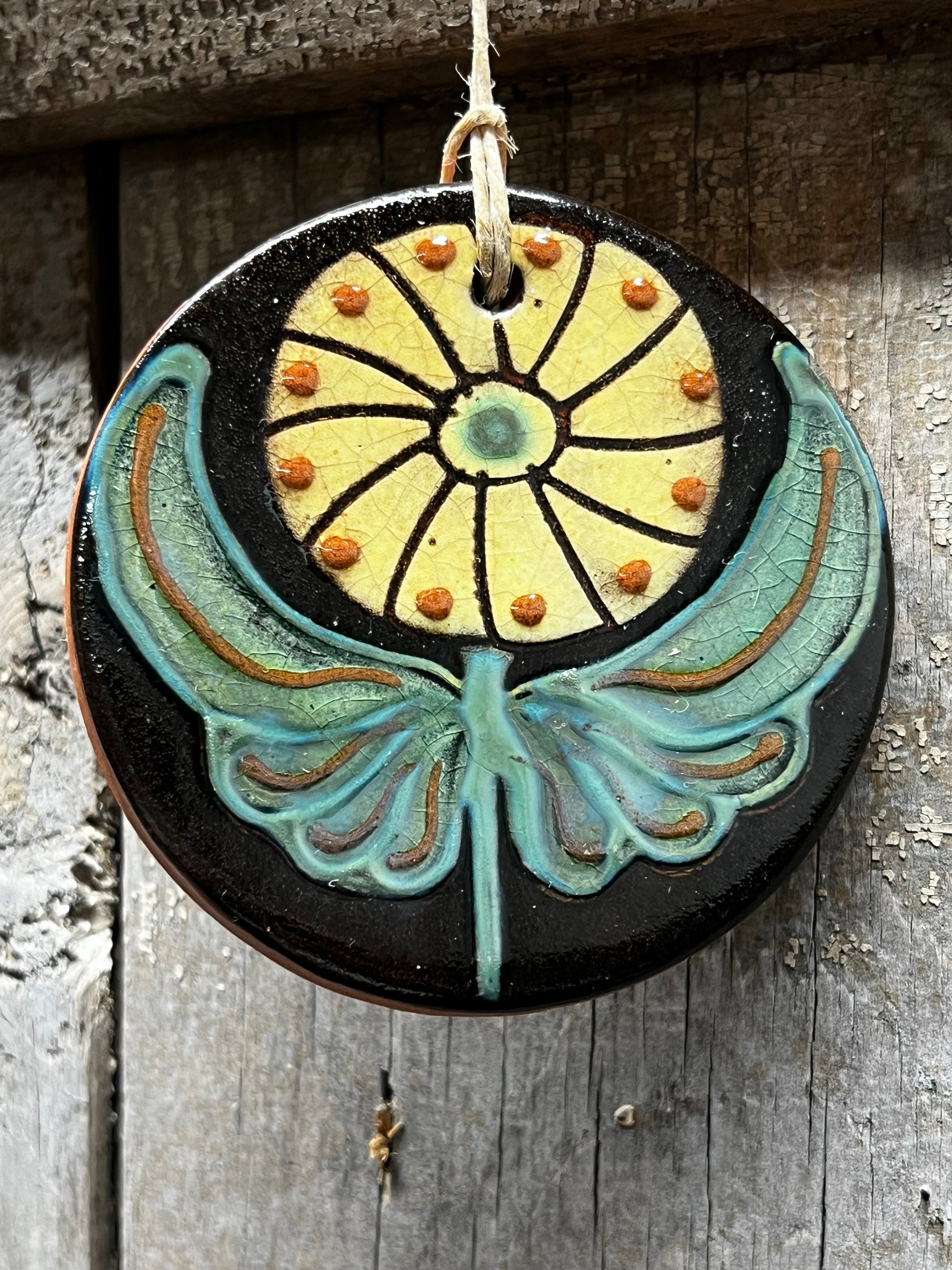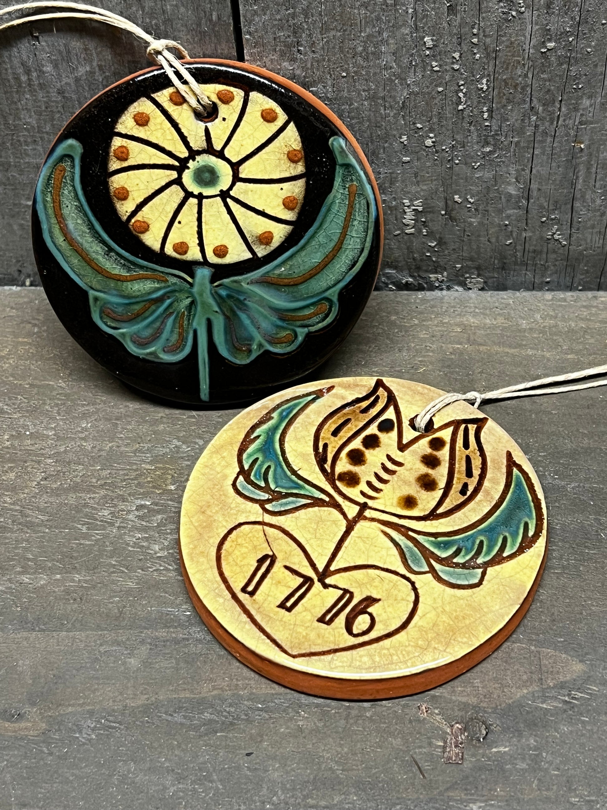 Made in Ohio, Smith Redware does a fantastic job at decorating. Crackle finishes and rich colors are sure to please. Hand on a tree, a peg, tie on a basket or display in a bowl, our scalloped edge heart ornaments are perfect. Each and everyone is rolled and decorated by hand so expect slight variations. Measures 3.25" round and come with a string tie.