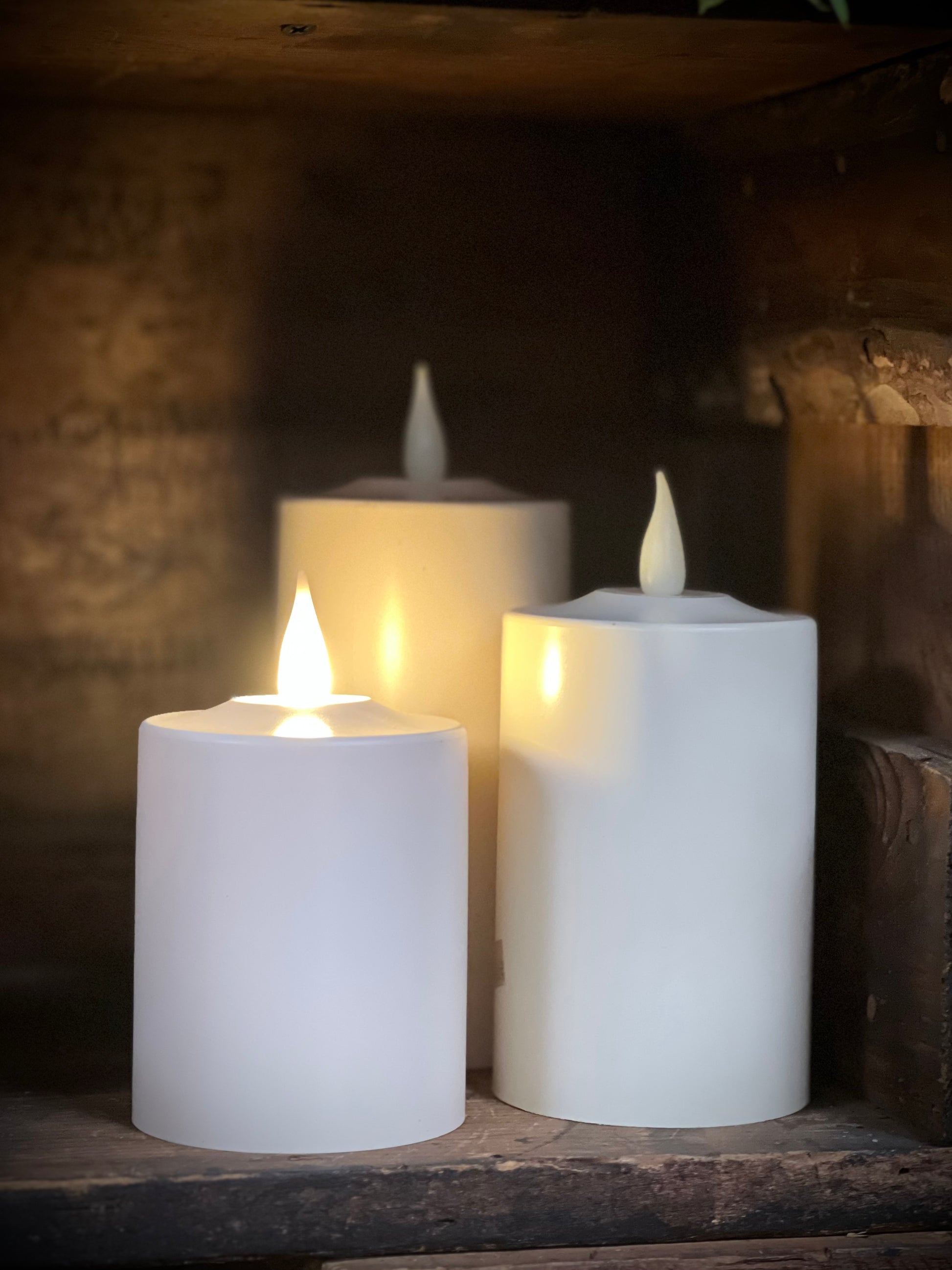There are so many features about this candle that I love. From the Ivory color in weatherproof plastic to the long lasting battery life, you will want more than one. Most of our customers do. 4" is to the top of the candle, not the flame. Also available in 5" and 6".