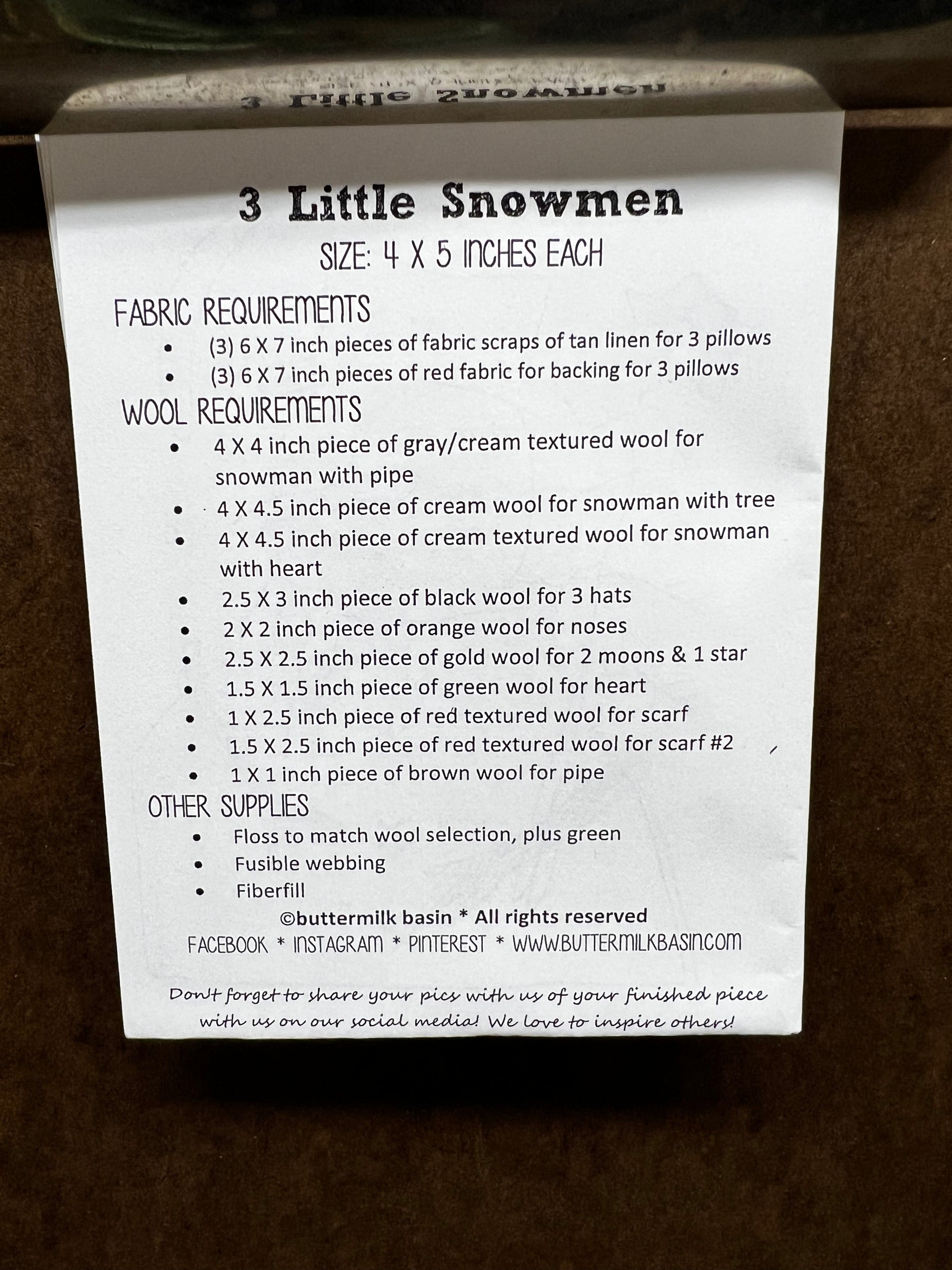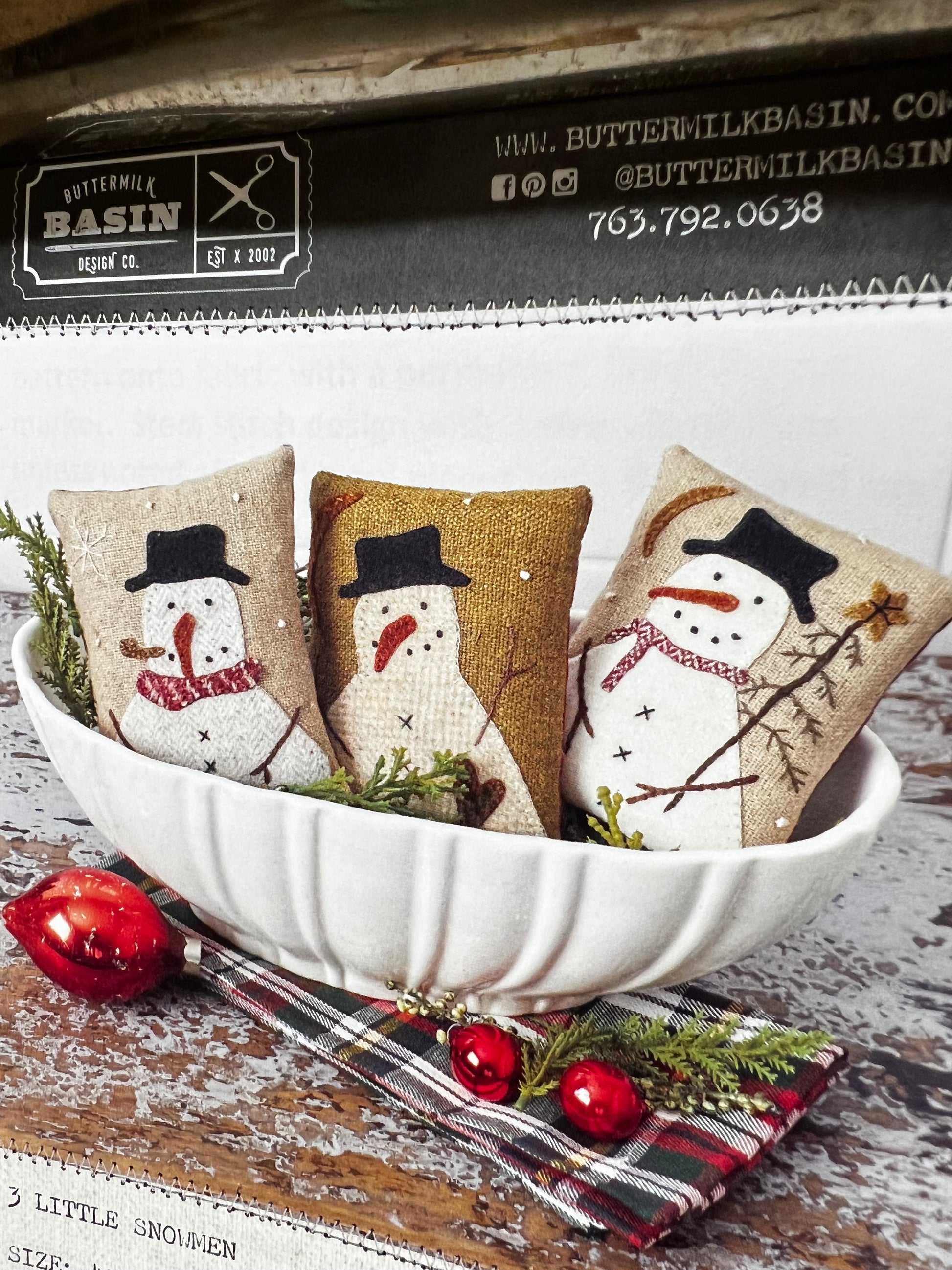 This cute trio of snowmen on pillows look great displayed in a bowl, on a shelf, or attach them to a string and hang from a tree! The wool applique pillows measure 4" x 5" each.