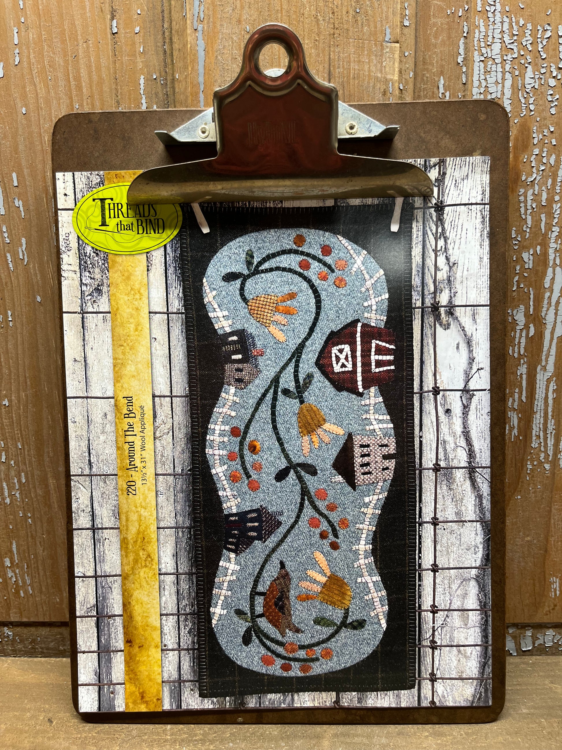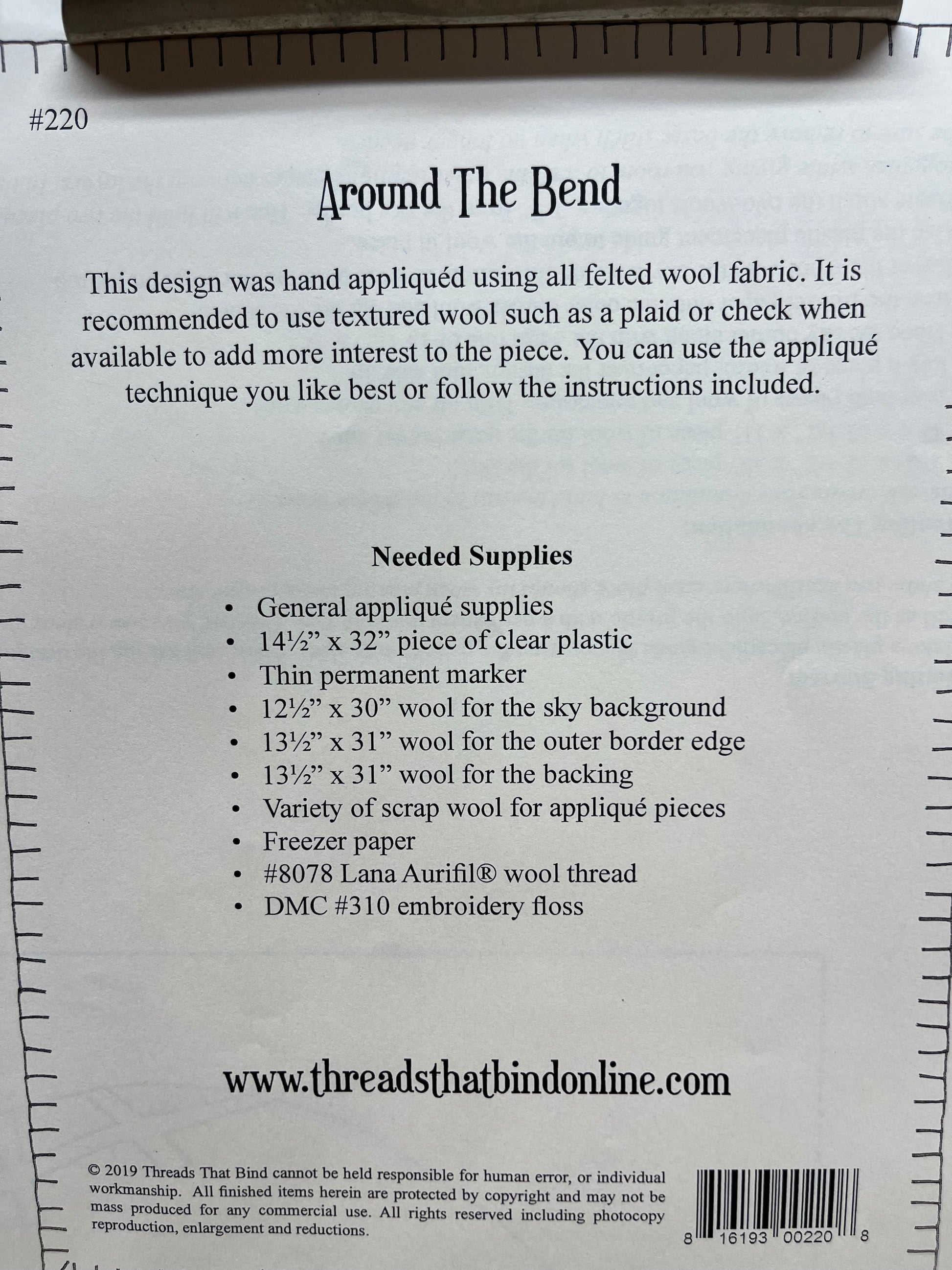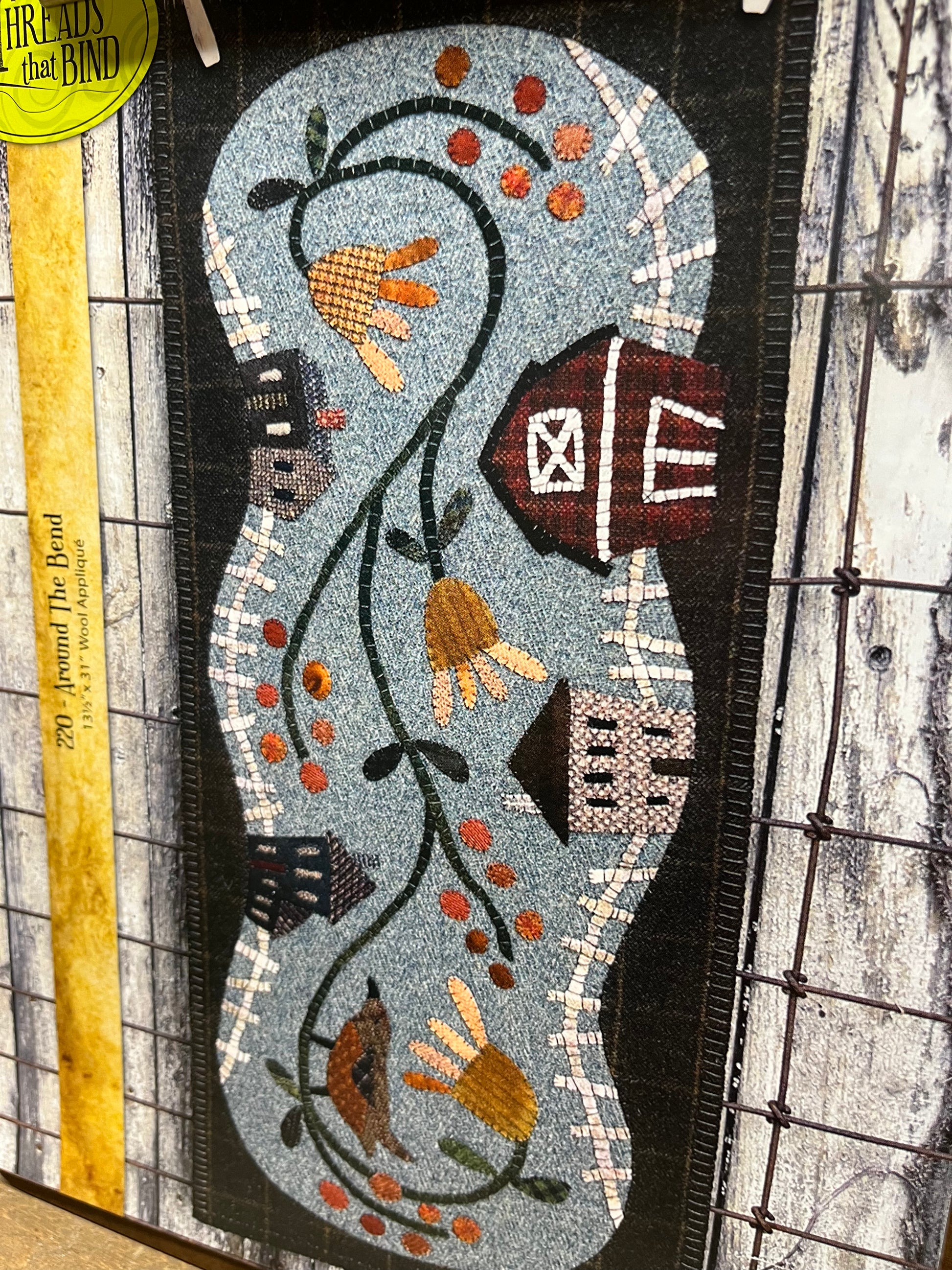 13 1/2" x 31" wool applique. This design was hand appliquéd using all felted wool fabric. It is recommended to use textured wool such as a plaid or check when available to add more interest to the piece. You can use the appliqué technique you like best or follow the instructions included.
