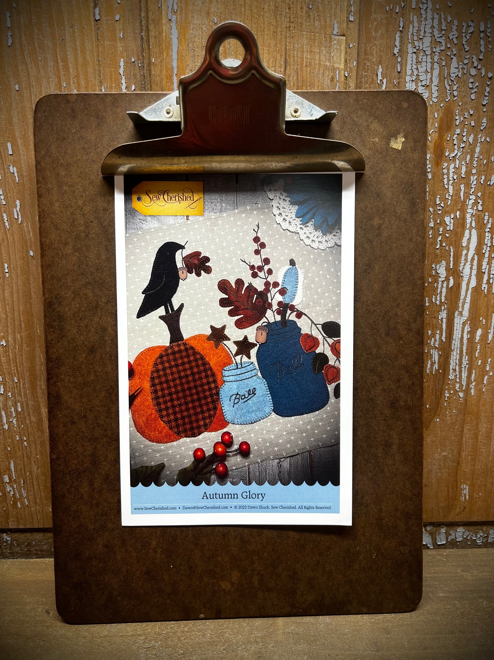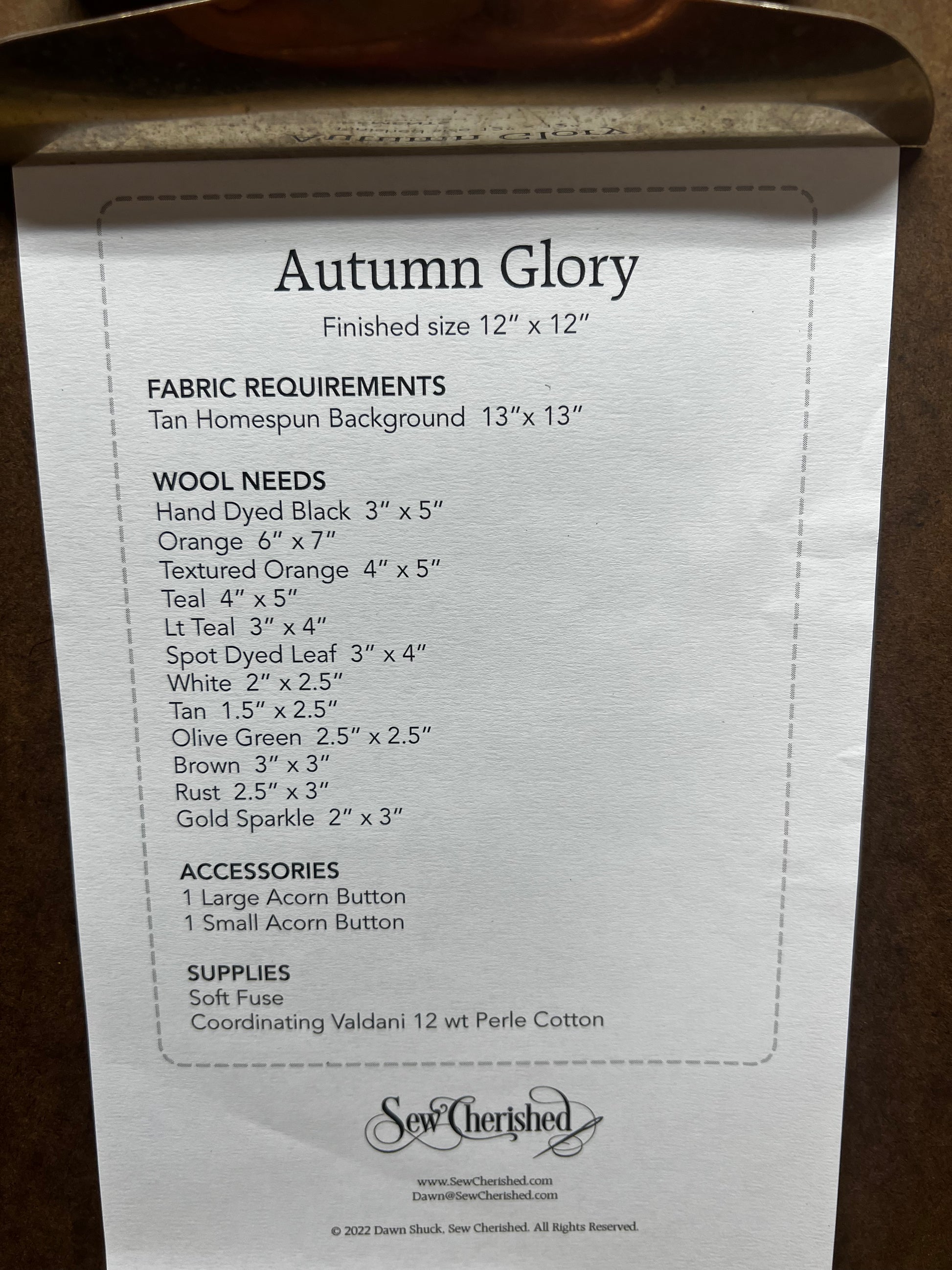 Autumn Glory has a homespun background with wool applique. The country blues with the fall colors are absolutely stunning while the fun pumpkin filled pennies make the perfect border. Finished pillow size is 18" x 18".