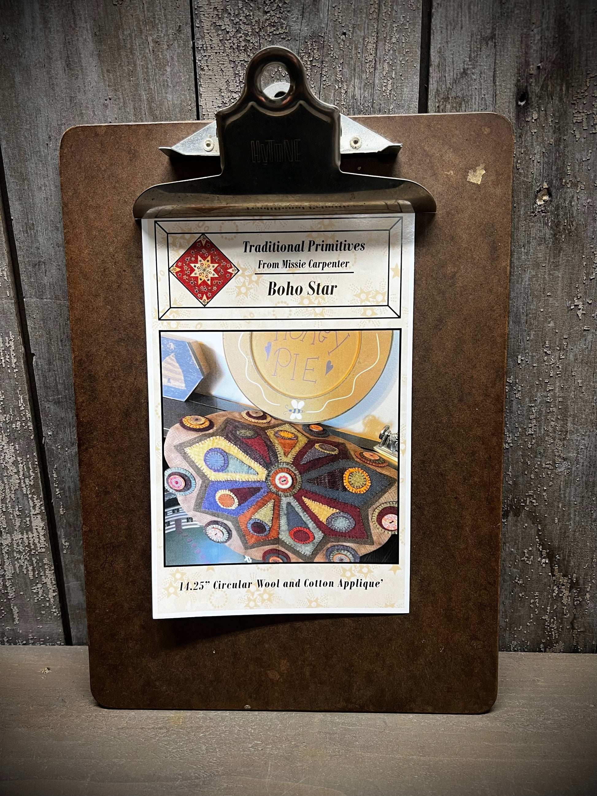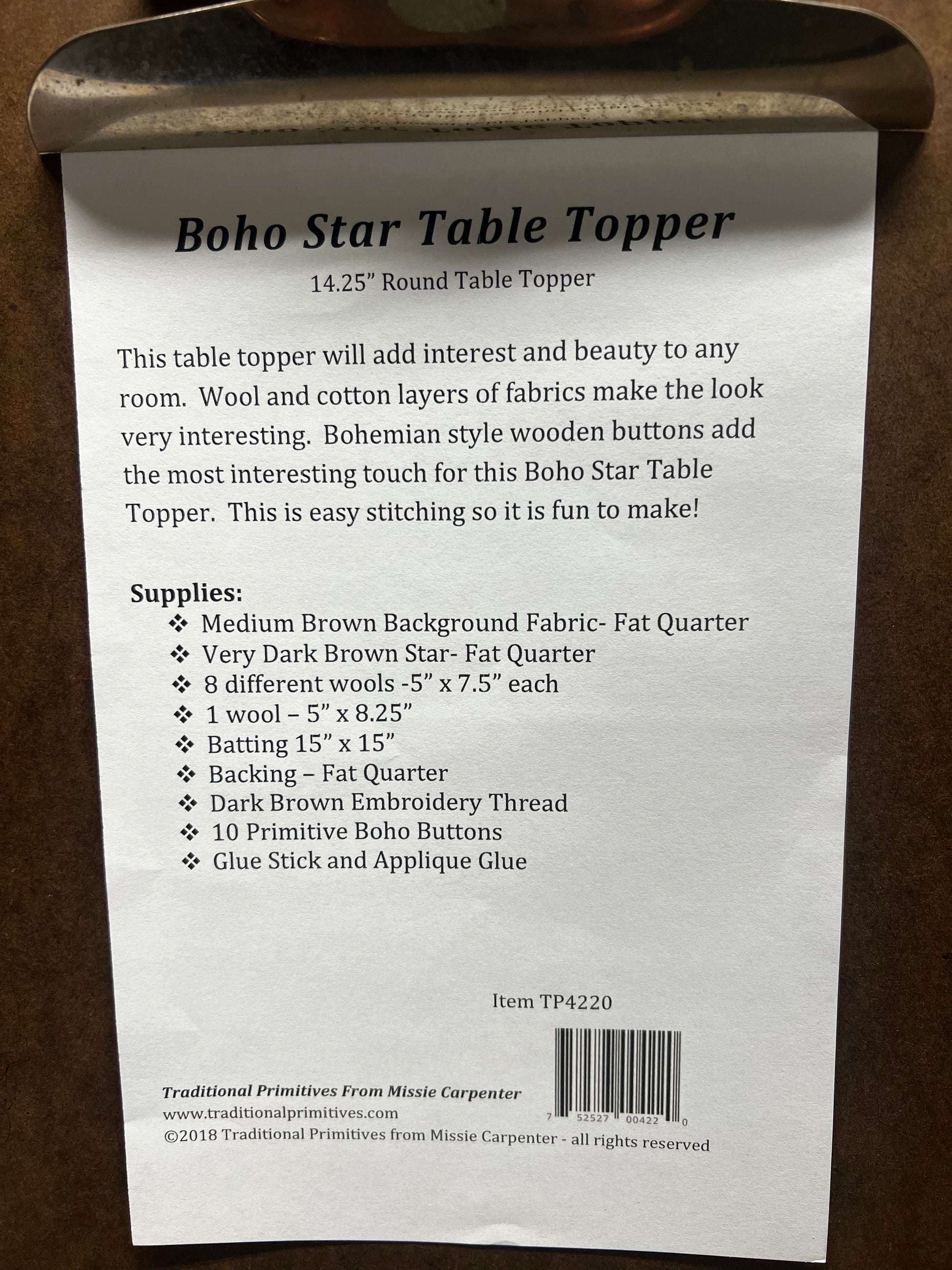 This beautiful design is so fun and a great way to use up your scraps of wool! Measuring 14.25" round, it is a great table mat; or attach it to old barn boards and hang on the wall. The pattern cover shows the project made with both wool and cotton fabrics, but you could use all wool. The pattern is pre printed on freezer paper. Wool and cotton fabric sold separately.