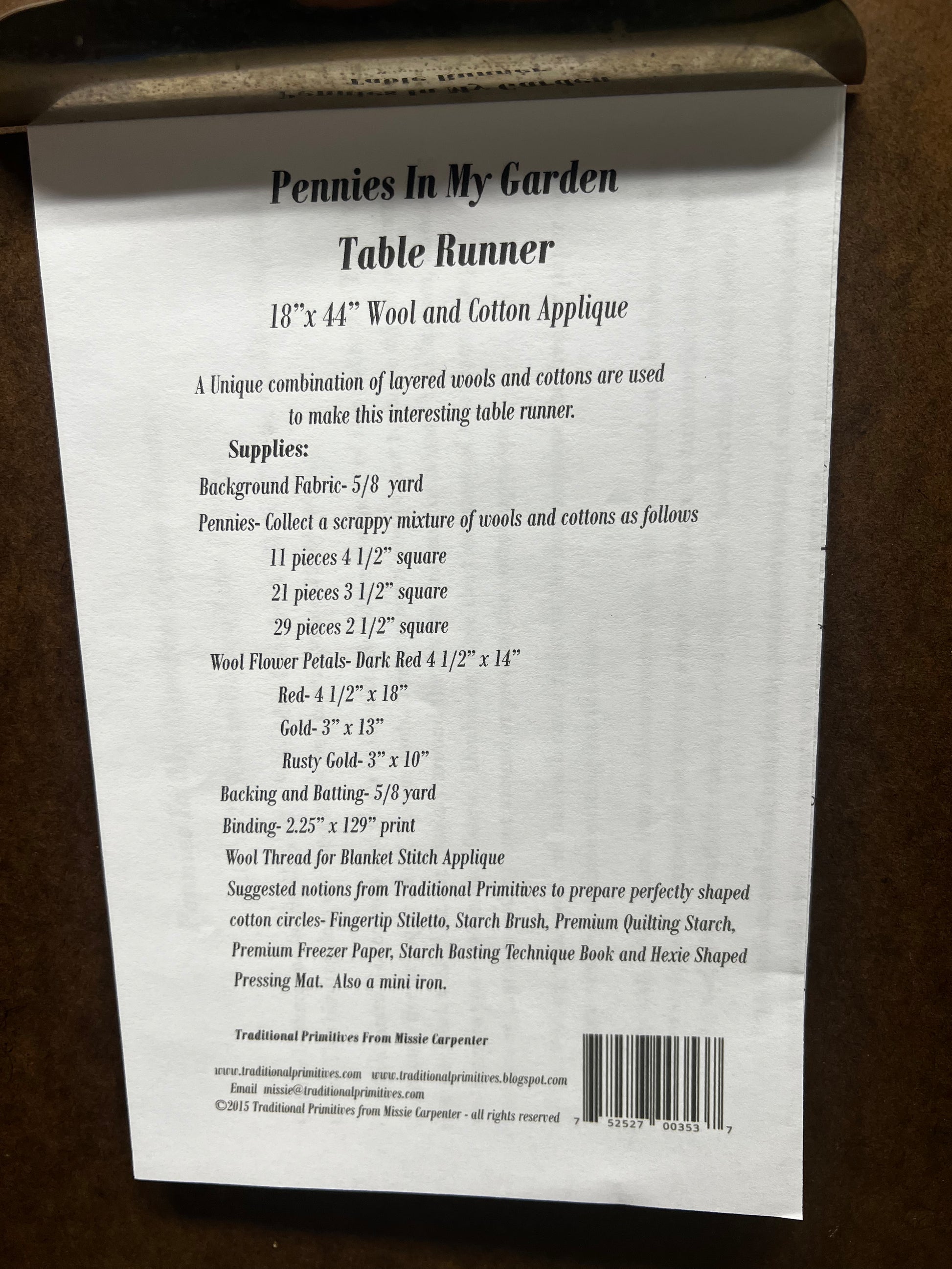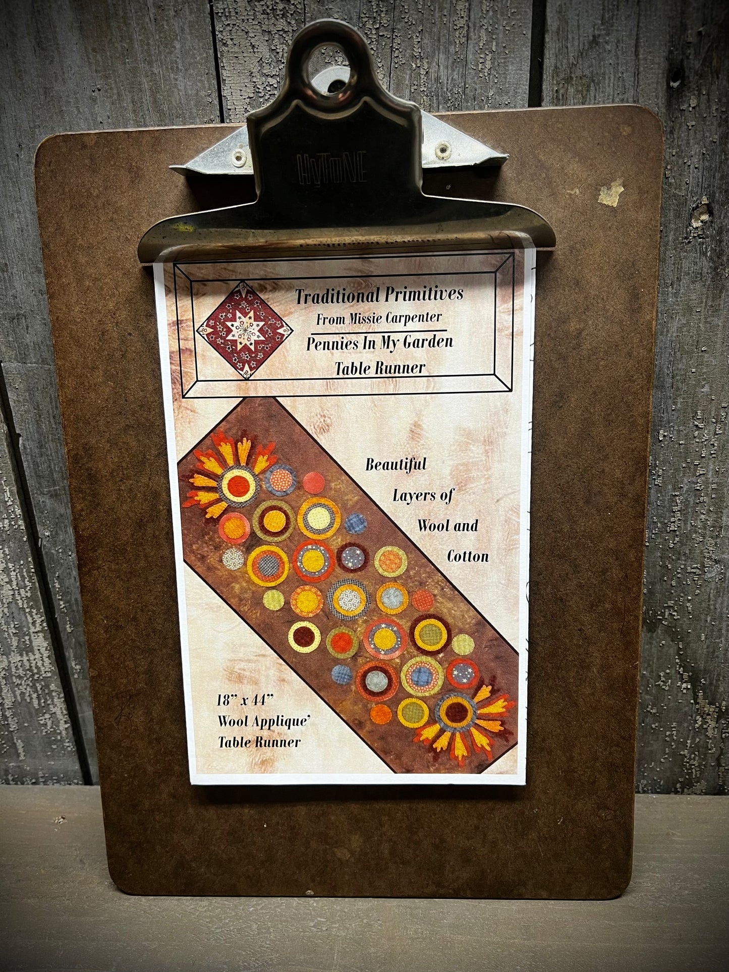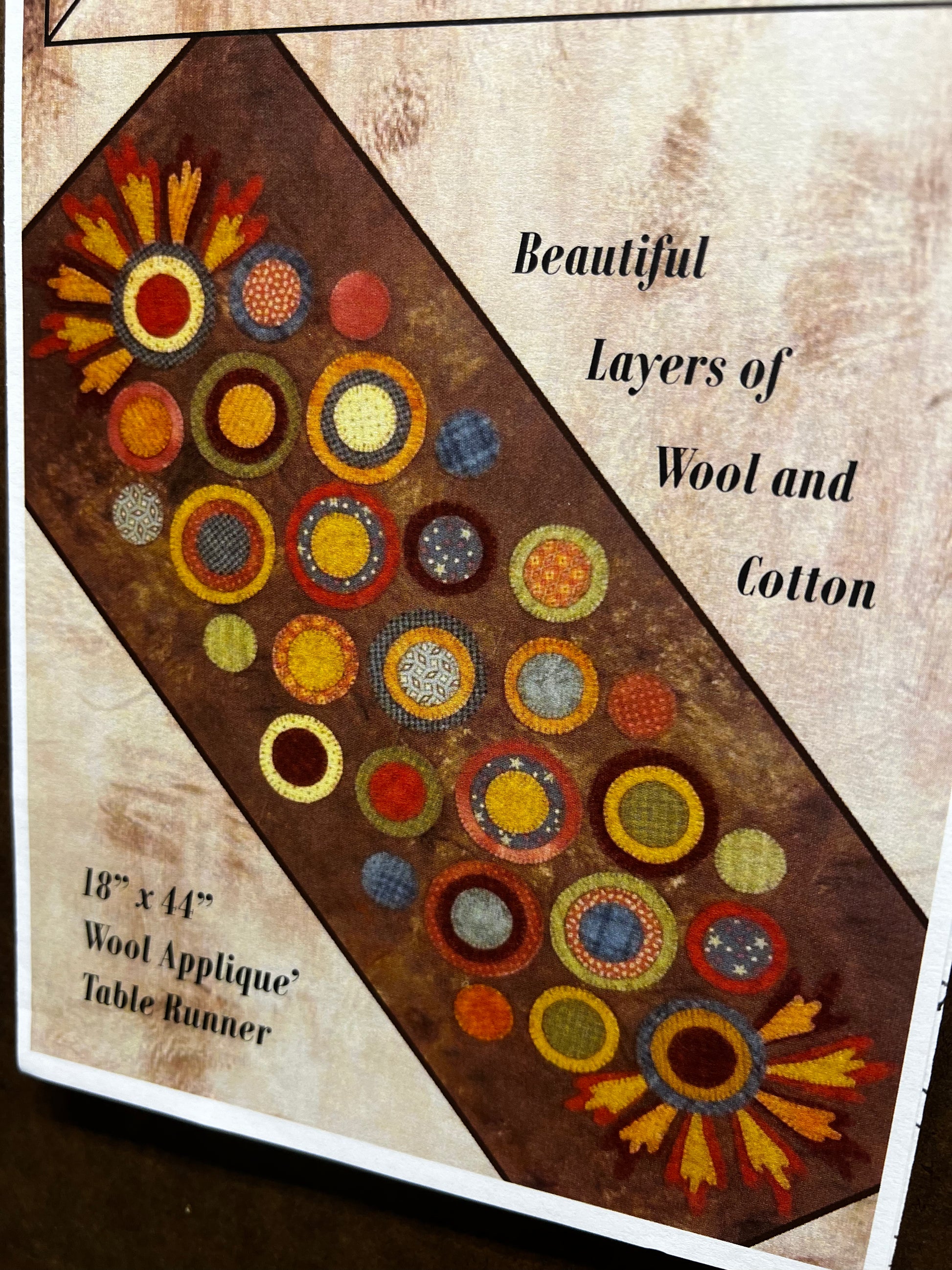 What a fun way to use both wool and cotton fabric; make it as primitive as you would like. Our Aged Muslin would be a beautiful choice for your background. You can also just make it with all wool. Use up your scraps of wool and get stitching. Measuring 18" x 44", the combination of textures make an interesting design. Pattern is preprinted on freezer paper.