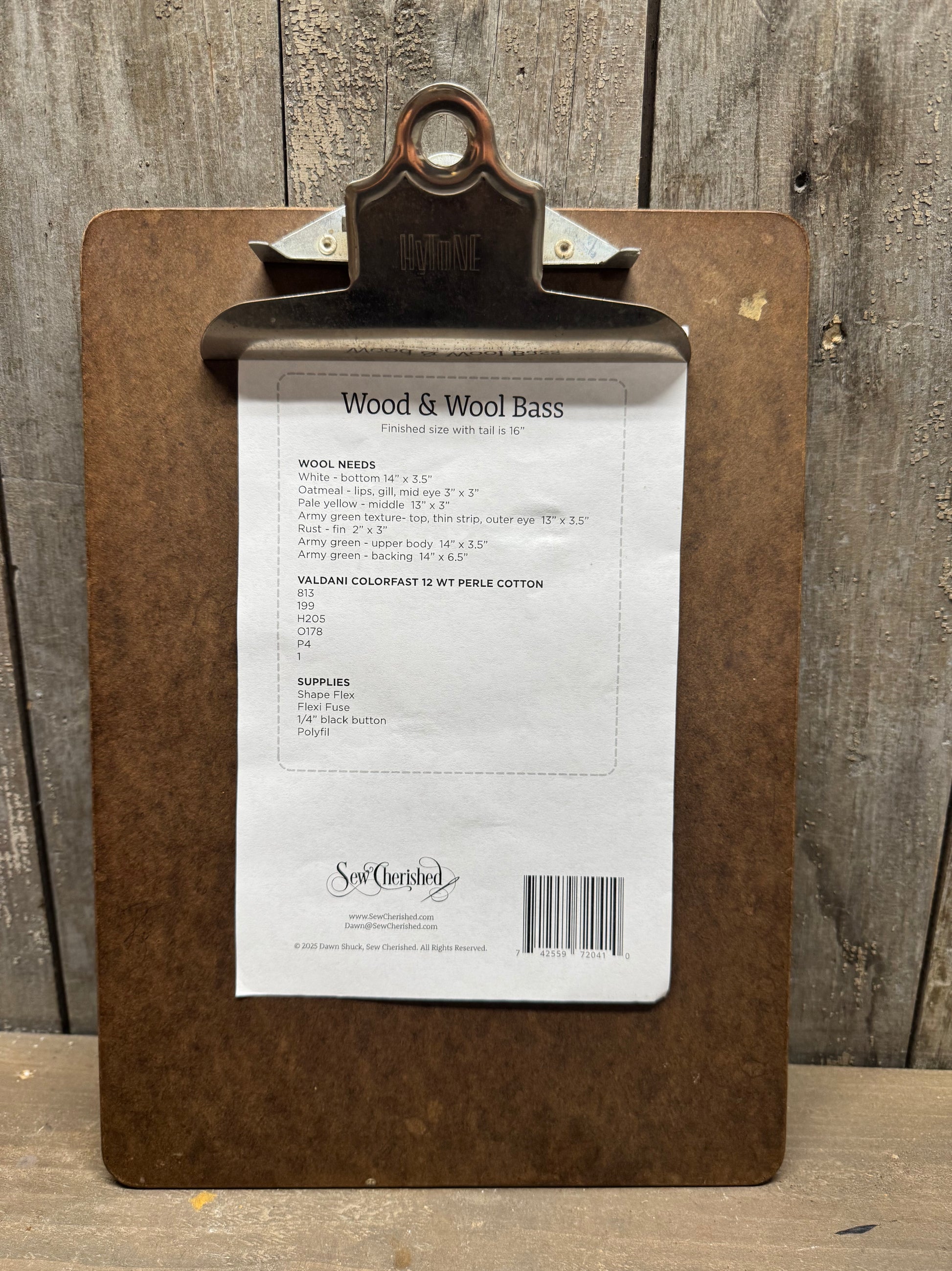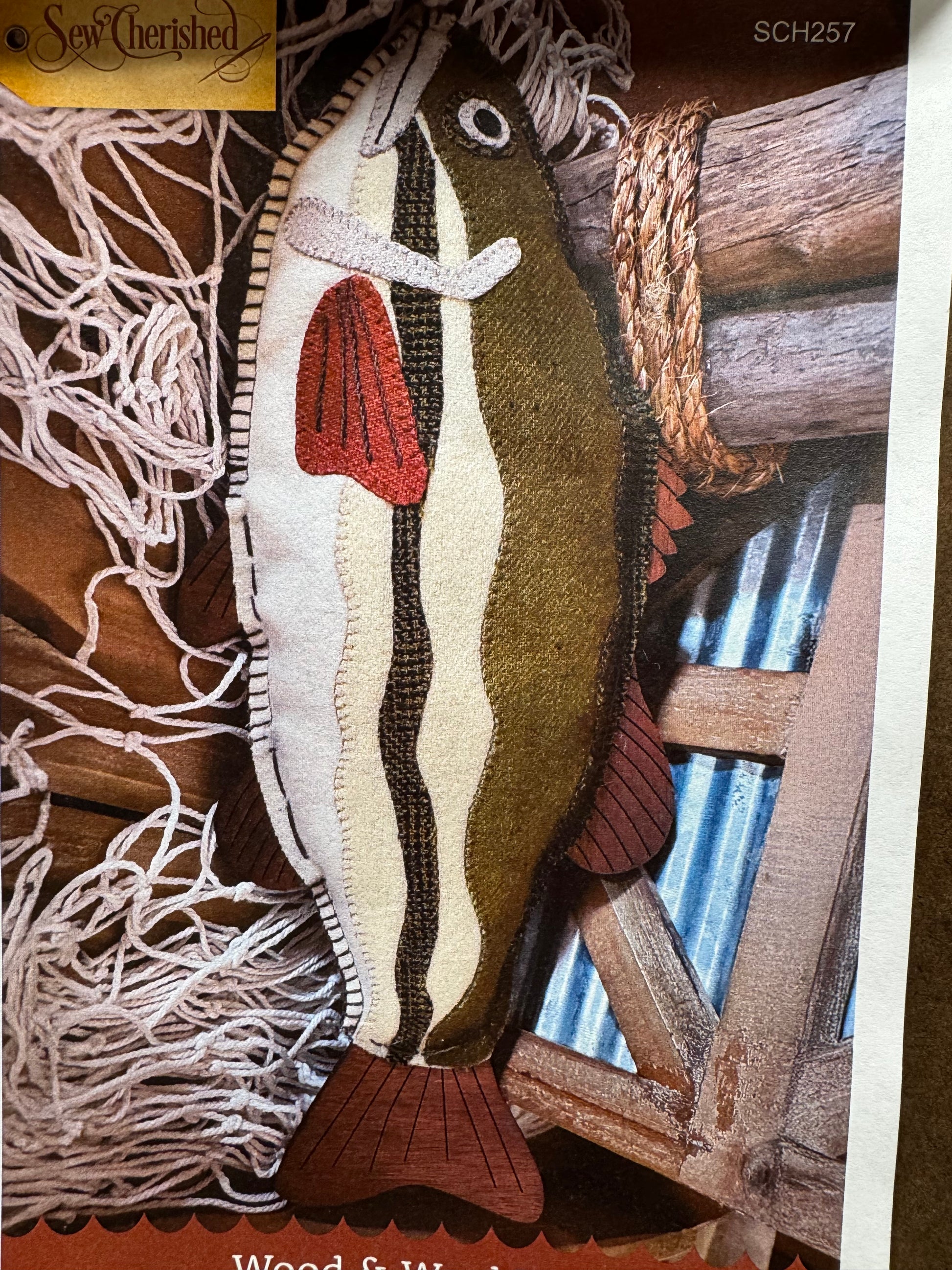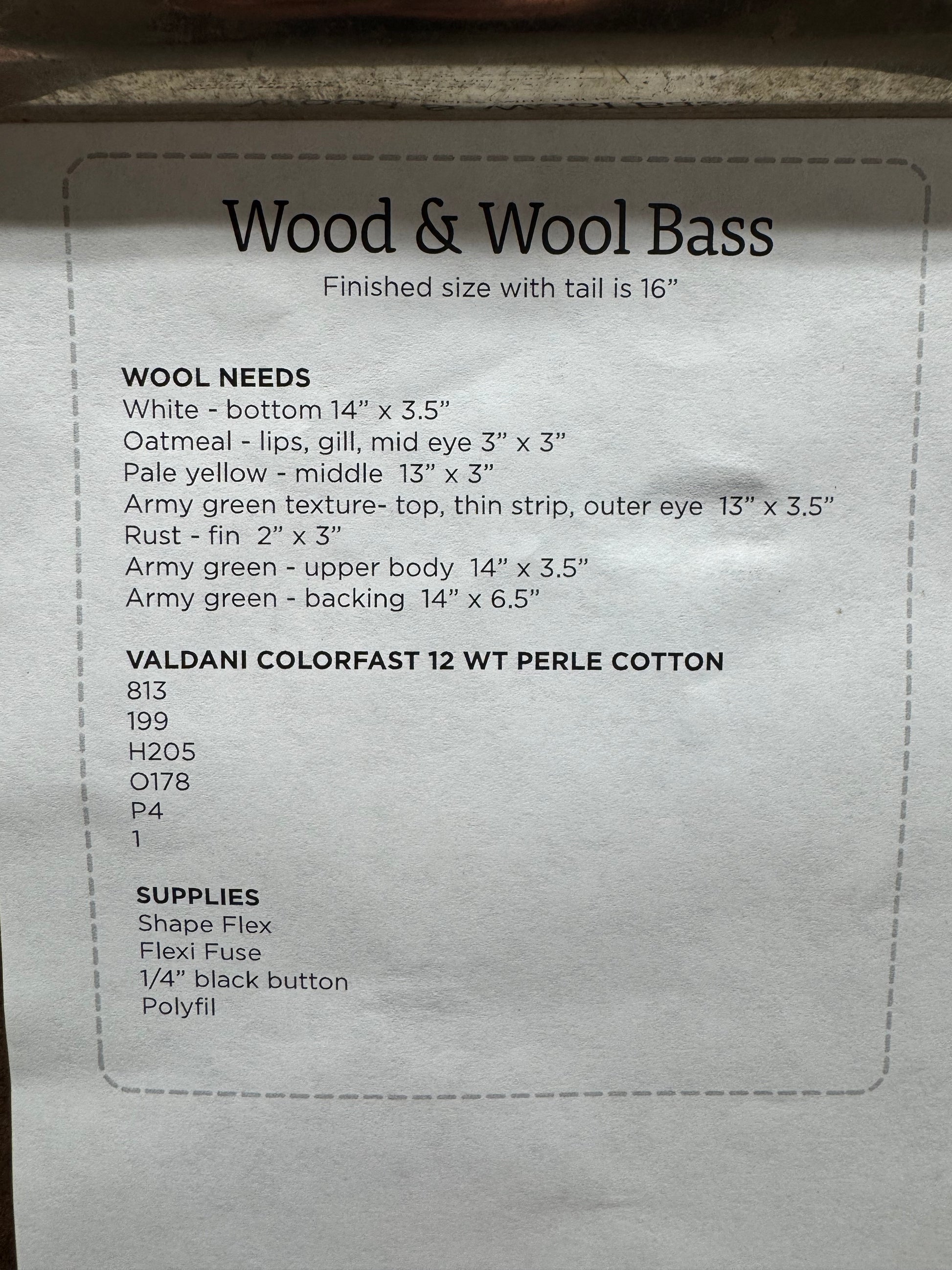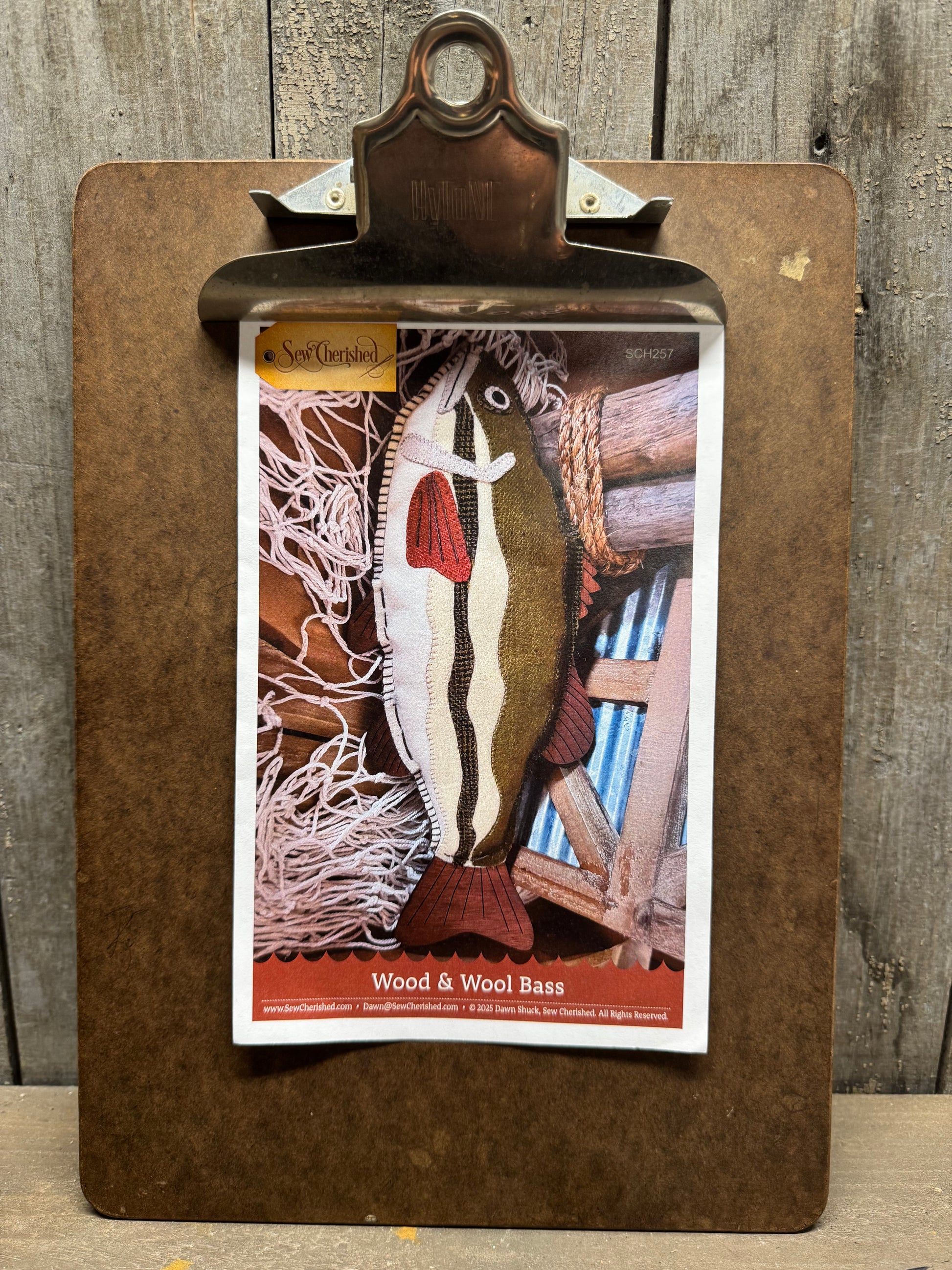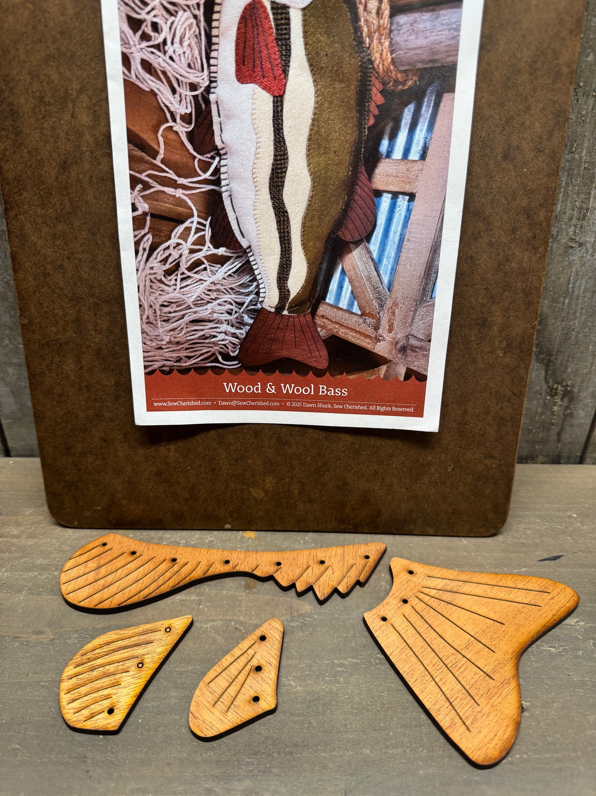 "Wood & Wool Bass” is an 11” x 17” Wool Appliqué pattern printed on paper. It includes an original and a reverse pattern. You will need to cut your wool pieces to match the pattern. Kit also includes Wooden Fins & Tails.