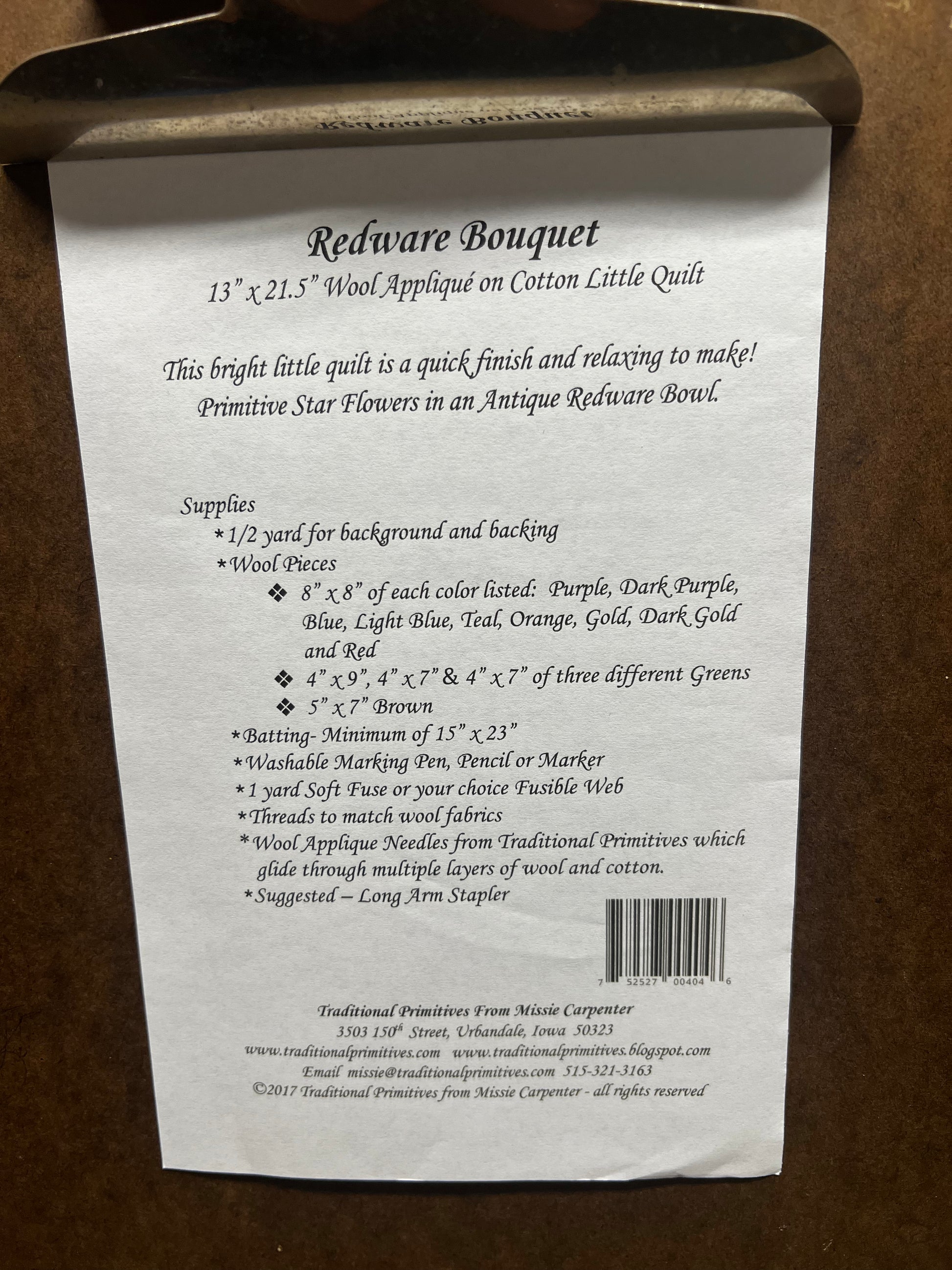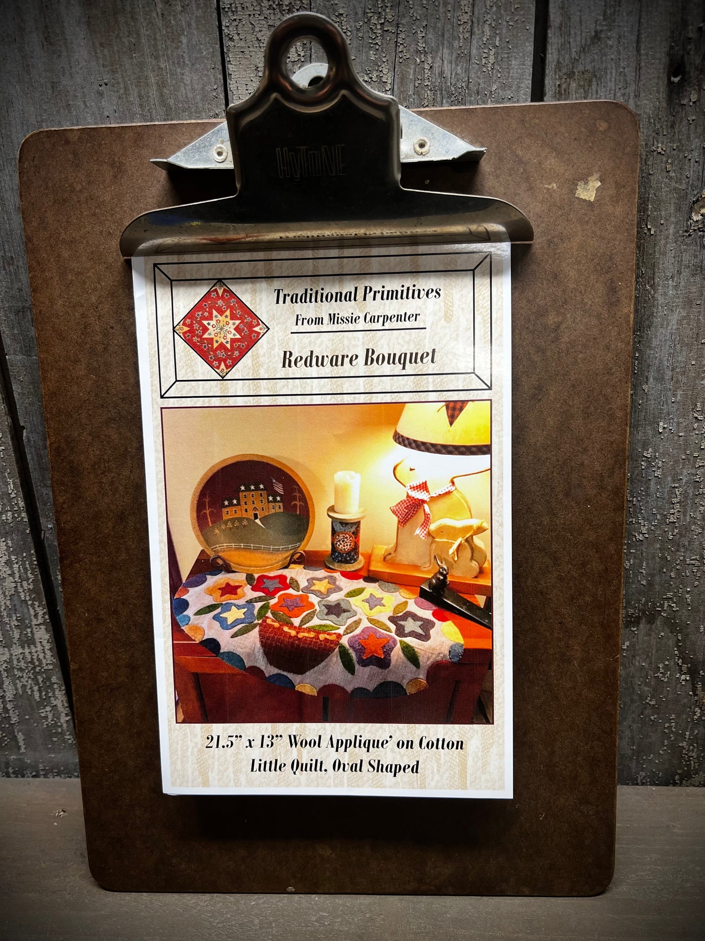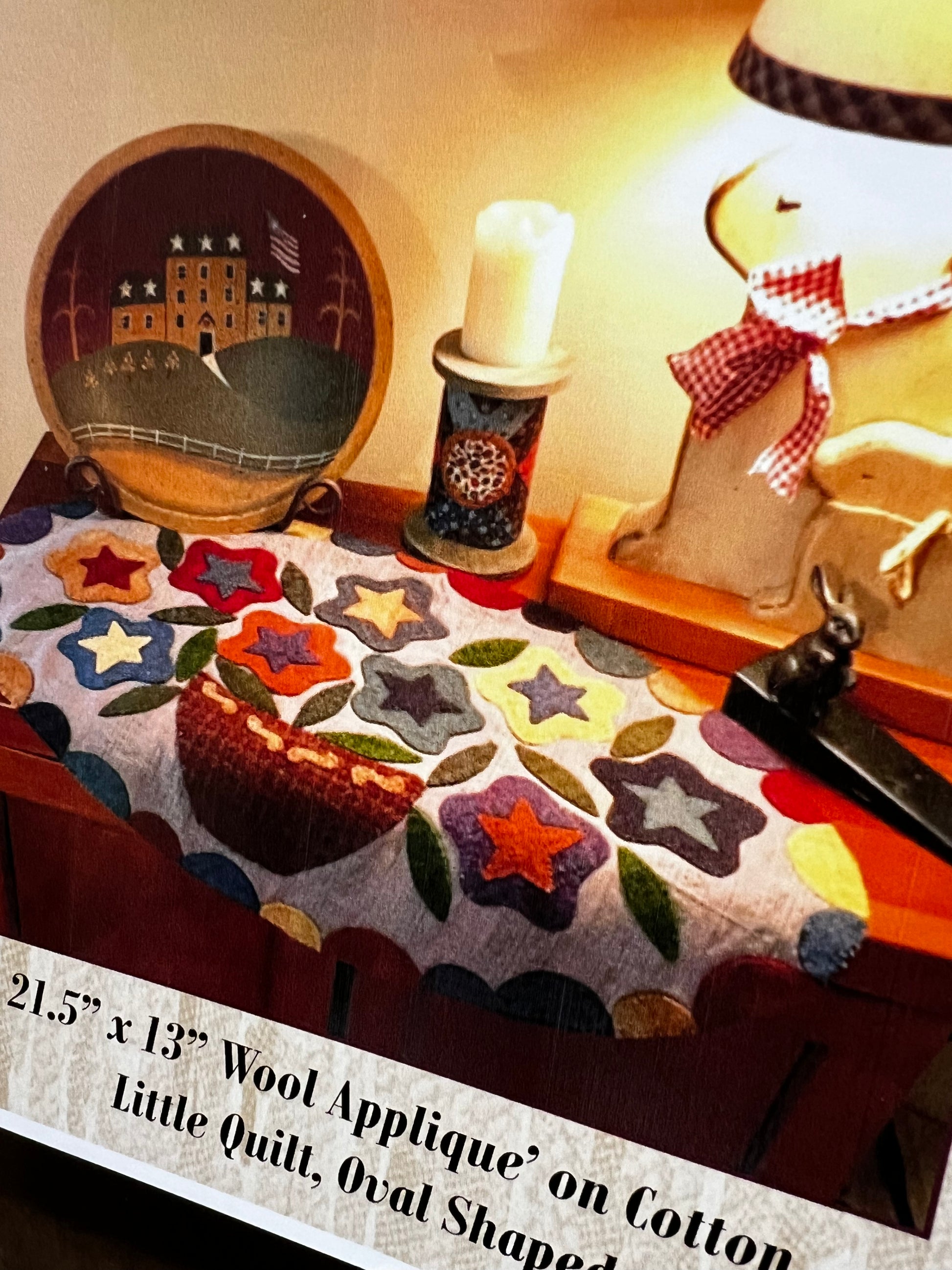 Redware bowls and primitive star flowers make for a lovely project! Measuring 13"x 21.5" this oval design is full of lovely colors and a great way to use up scraps of wool. Shown on a muslin/cotton background, you can make this all wool if you desire.