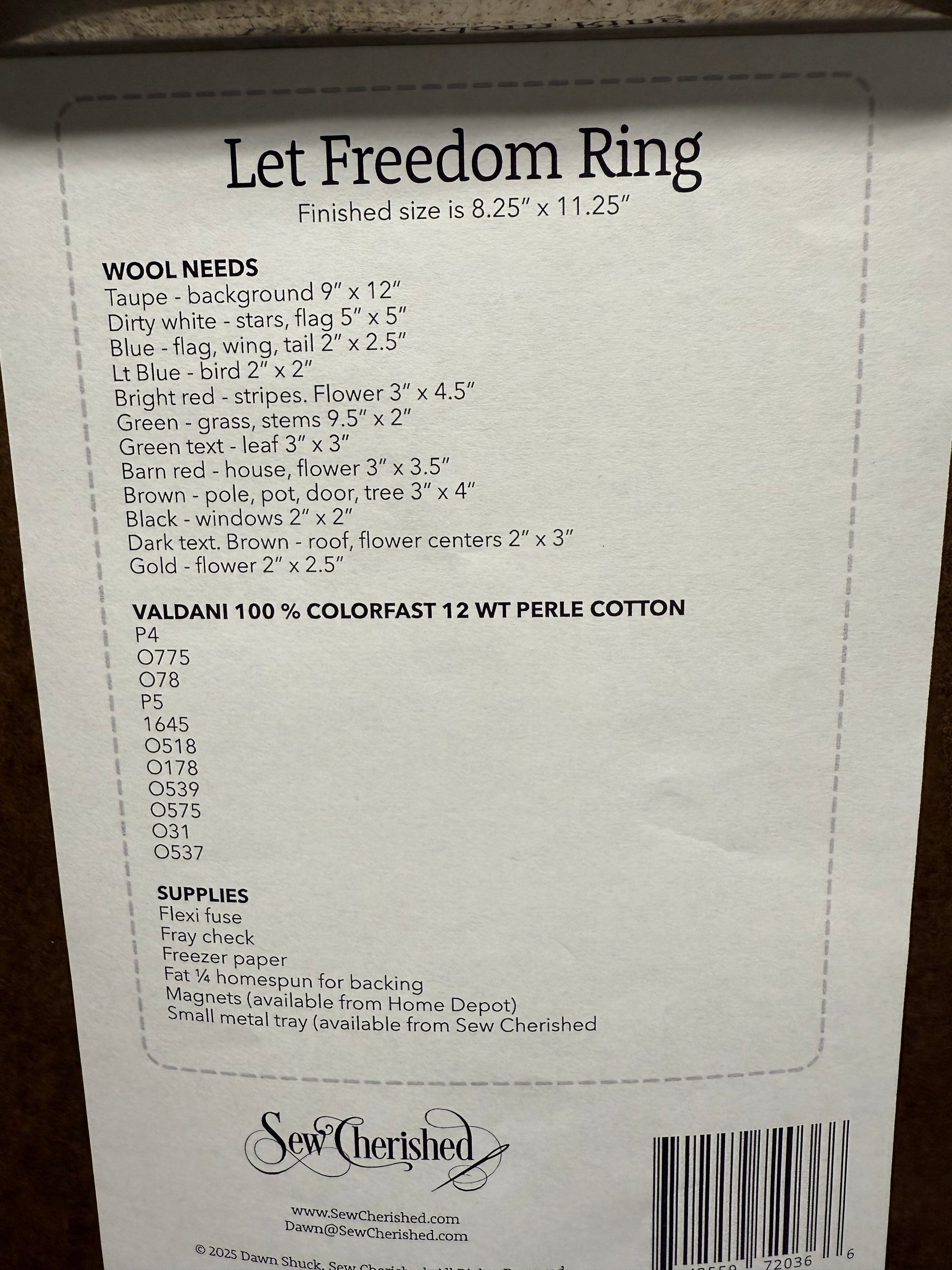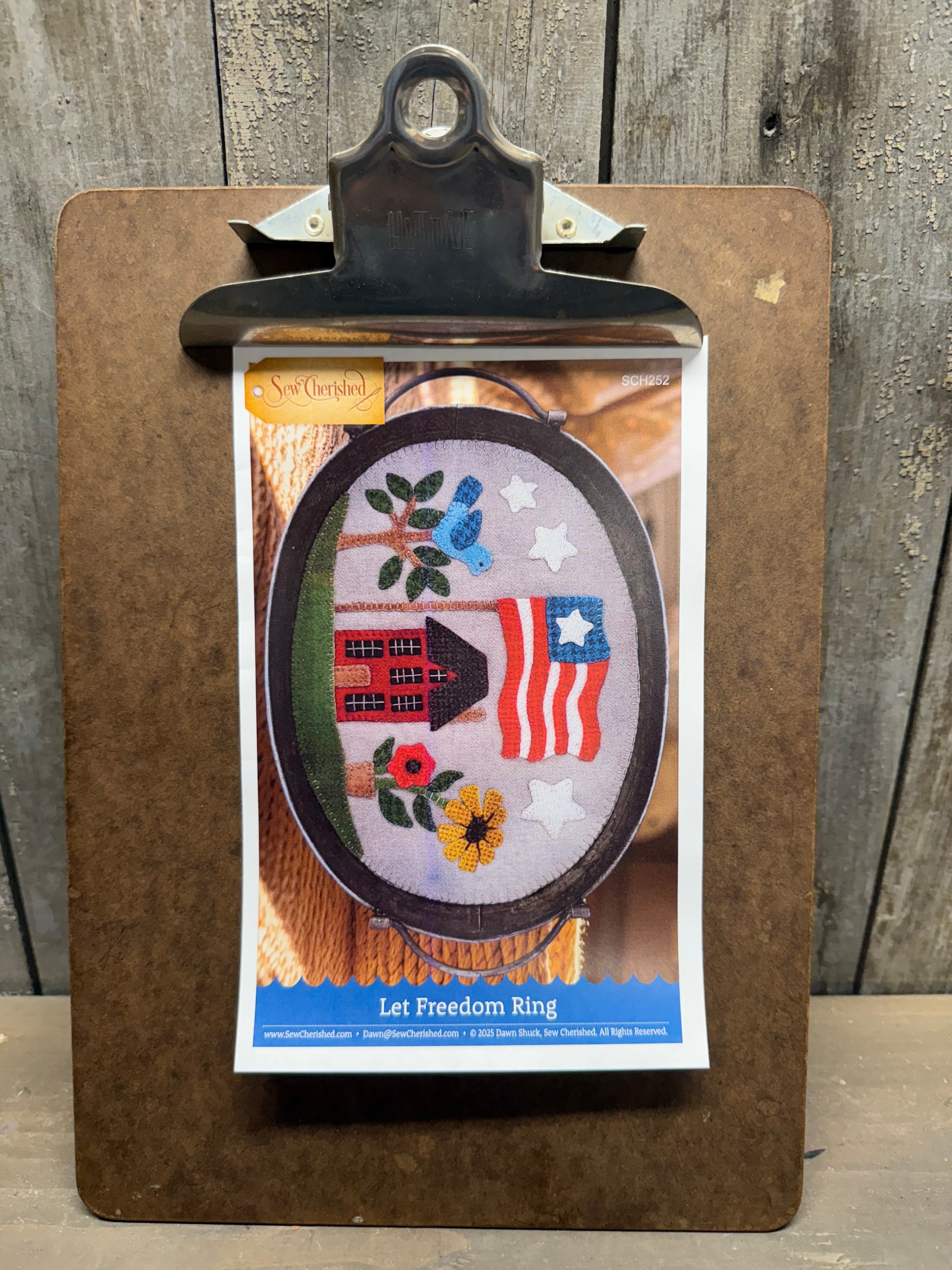 "Let Freedom Ring” is a 11.25” x 8.25” oval wool appliqué paper pattern. You will need to cut the design.