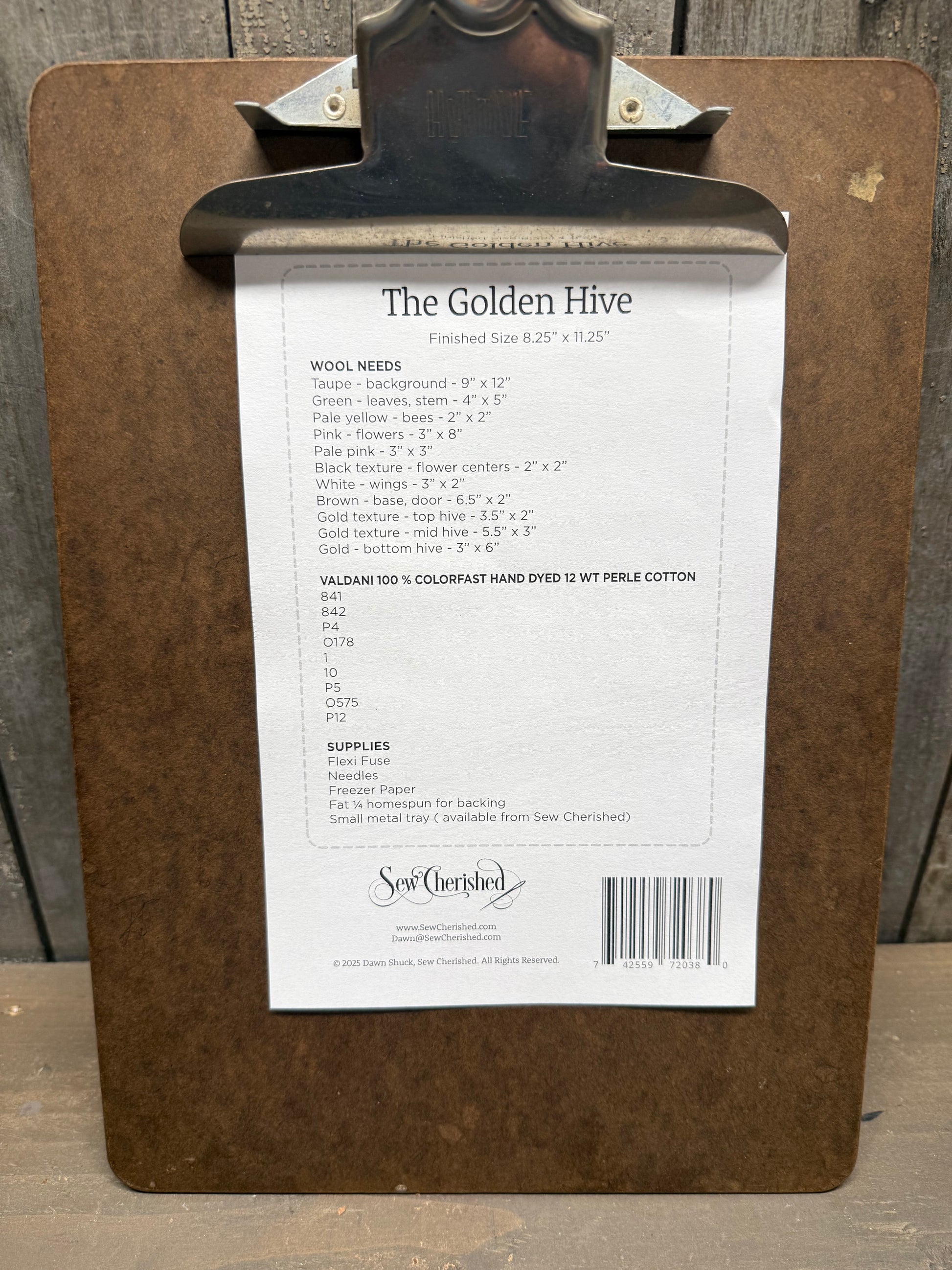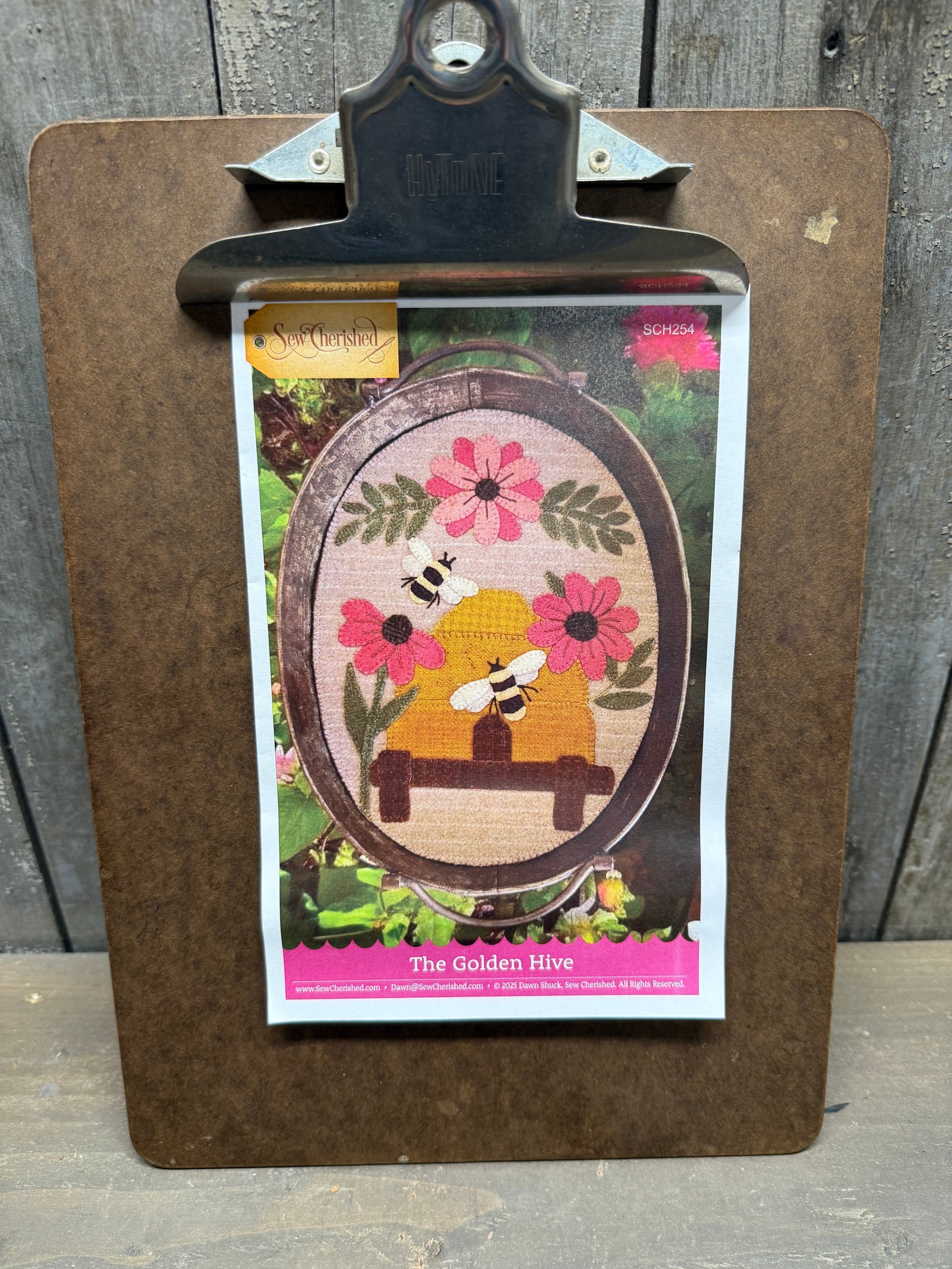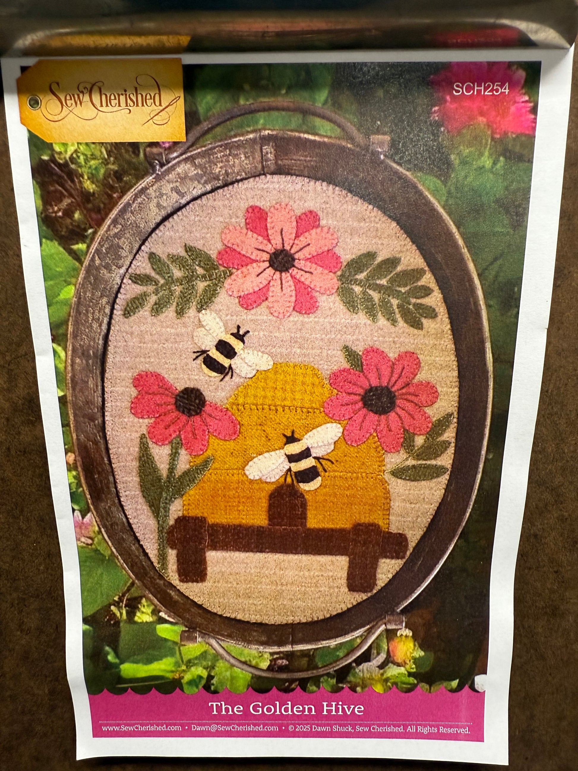 "The Golden Hive” is a 11.25” x 8.25” oval wool appliqué paper pattern. You will need to cut the design.