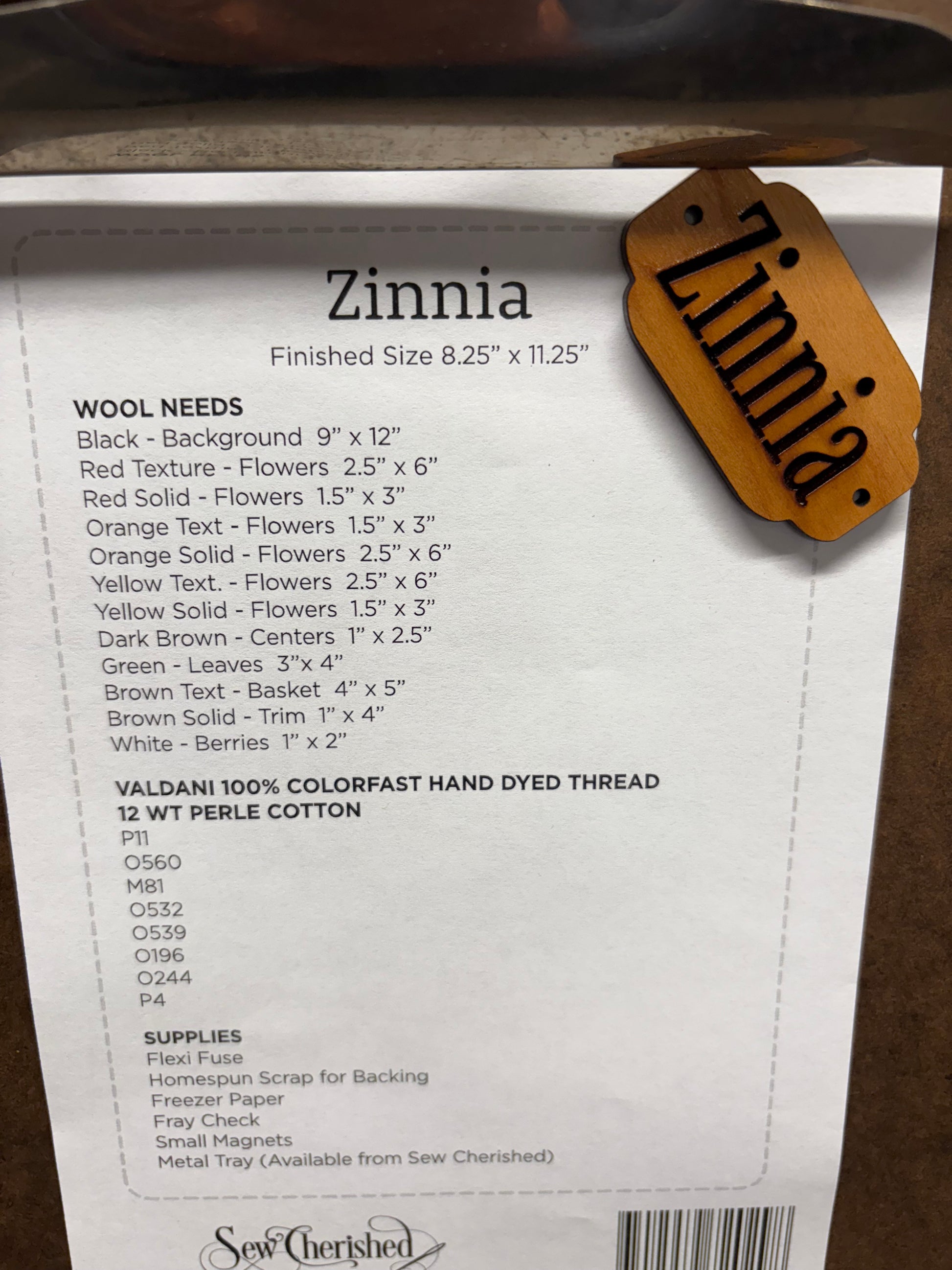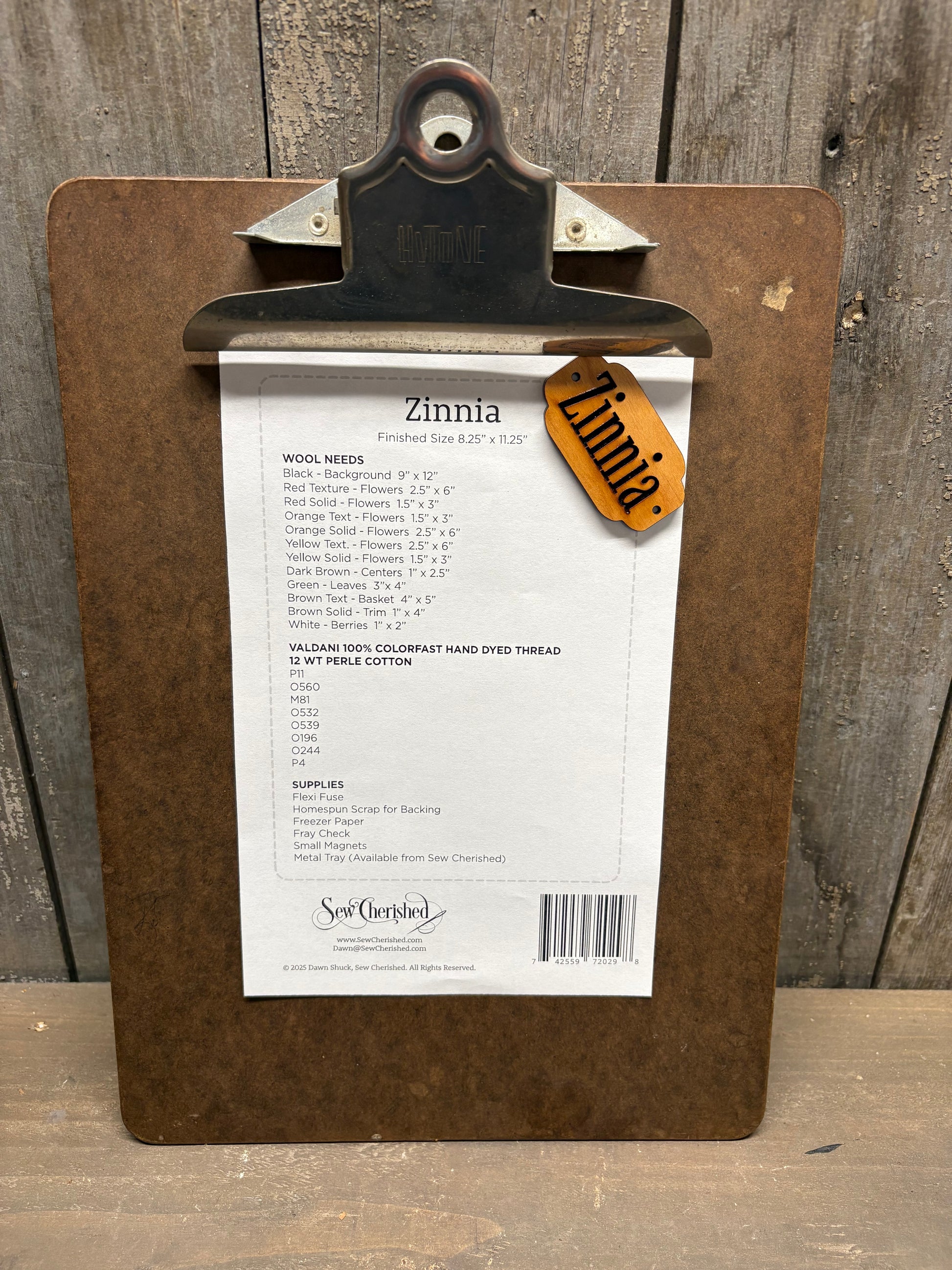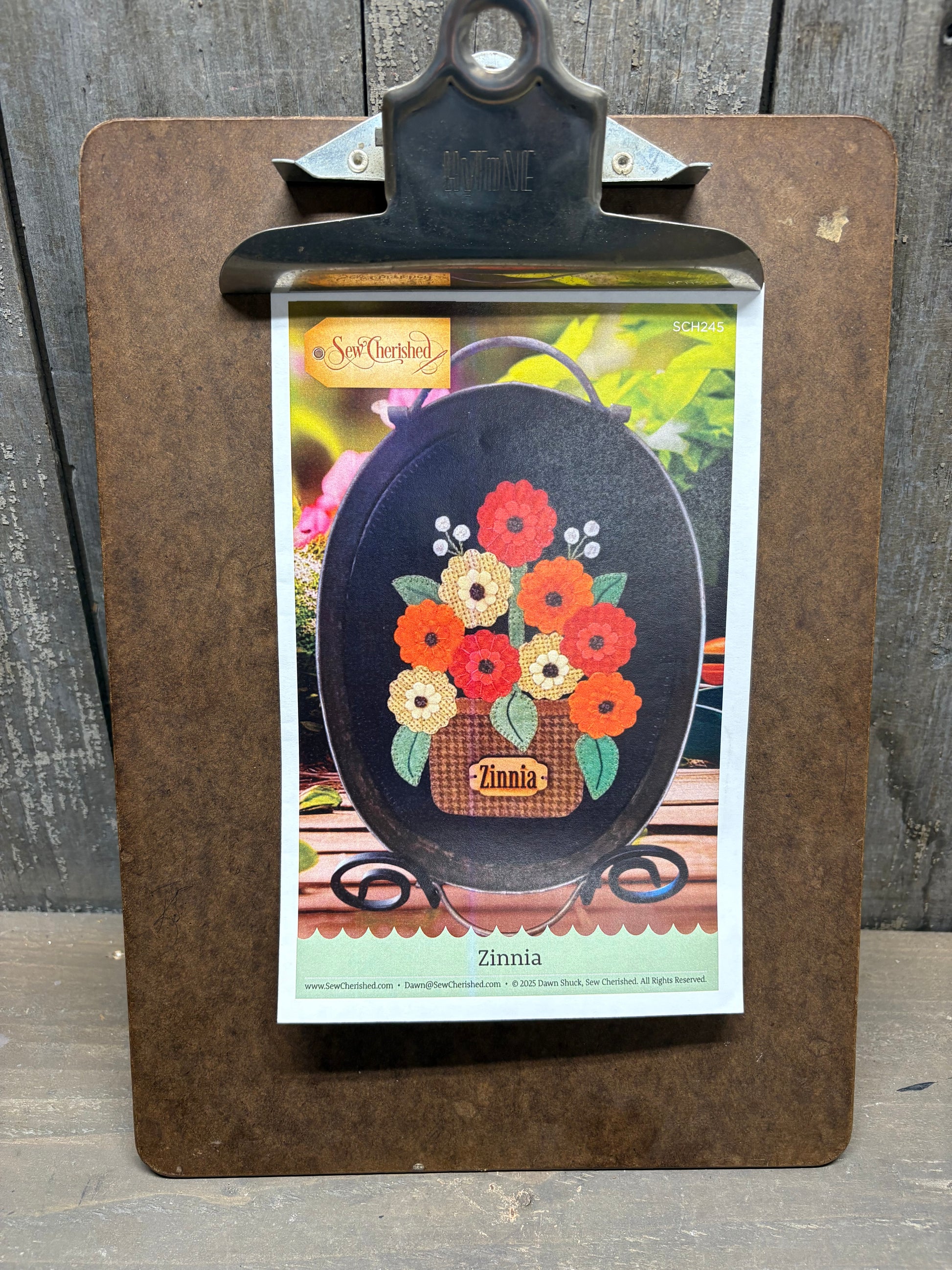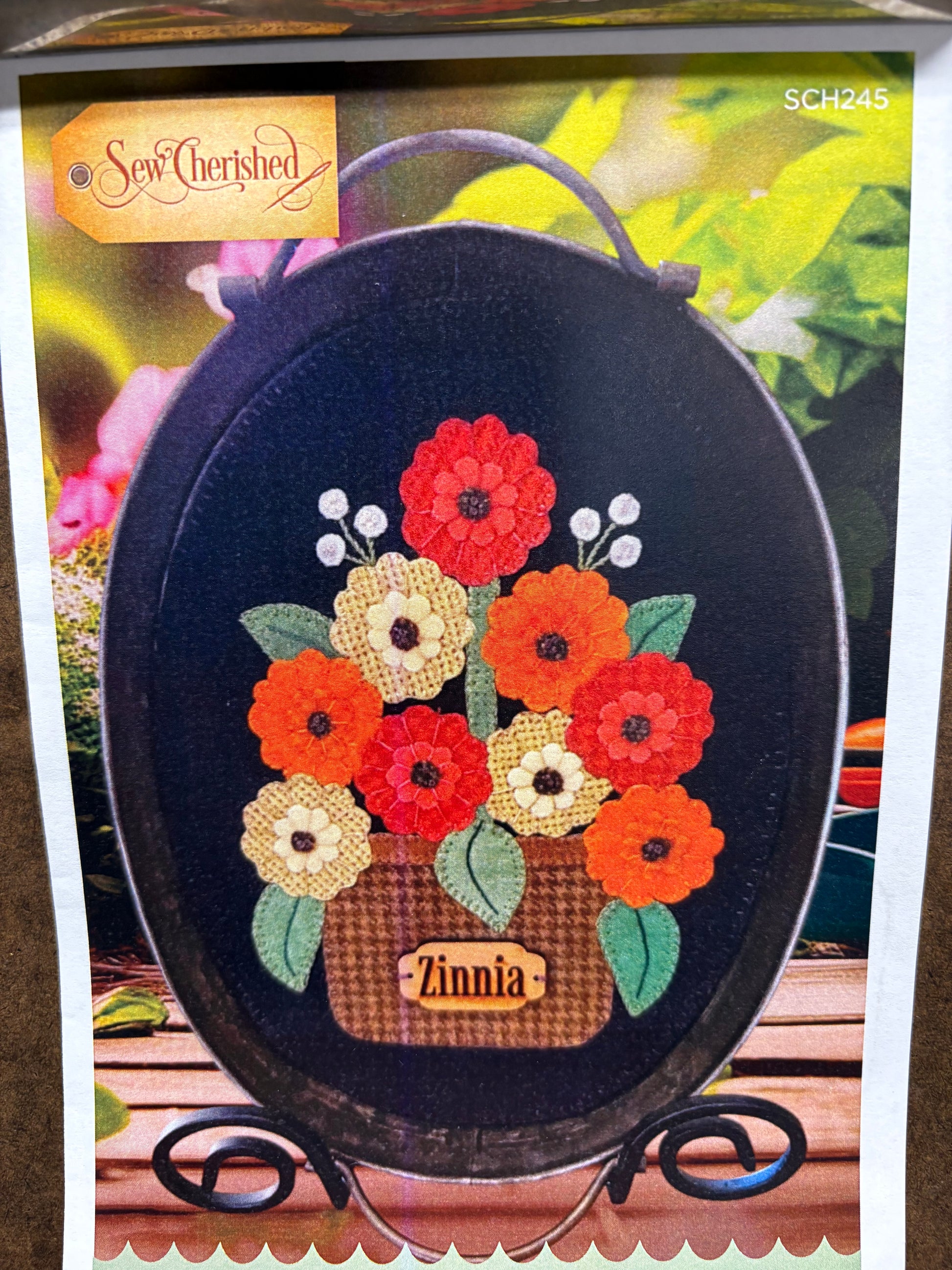 "Zinnia” is a 11.25” x 8.25” oval wool appliqué paper pattern. You will need to cut the design. Also included is a wooden tag to be attached to the finished mat.