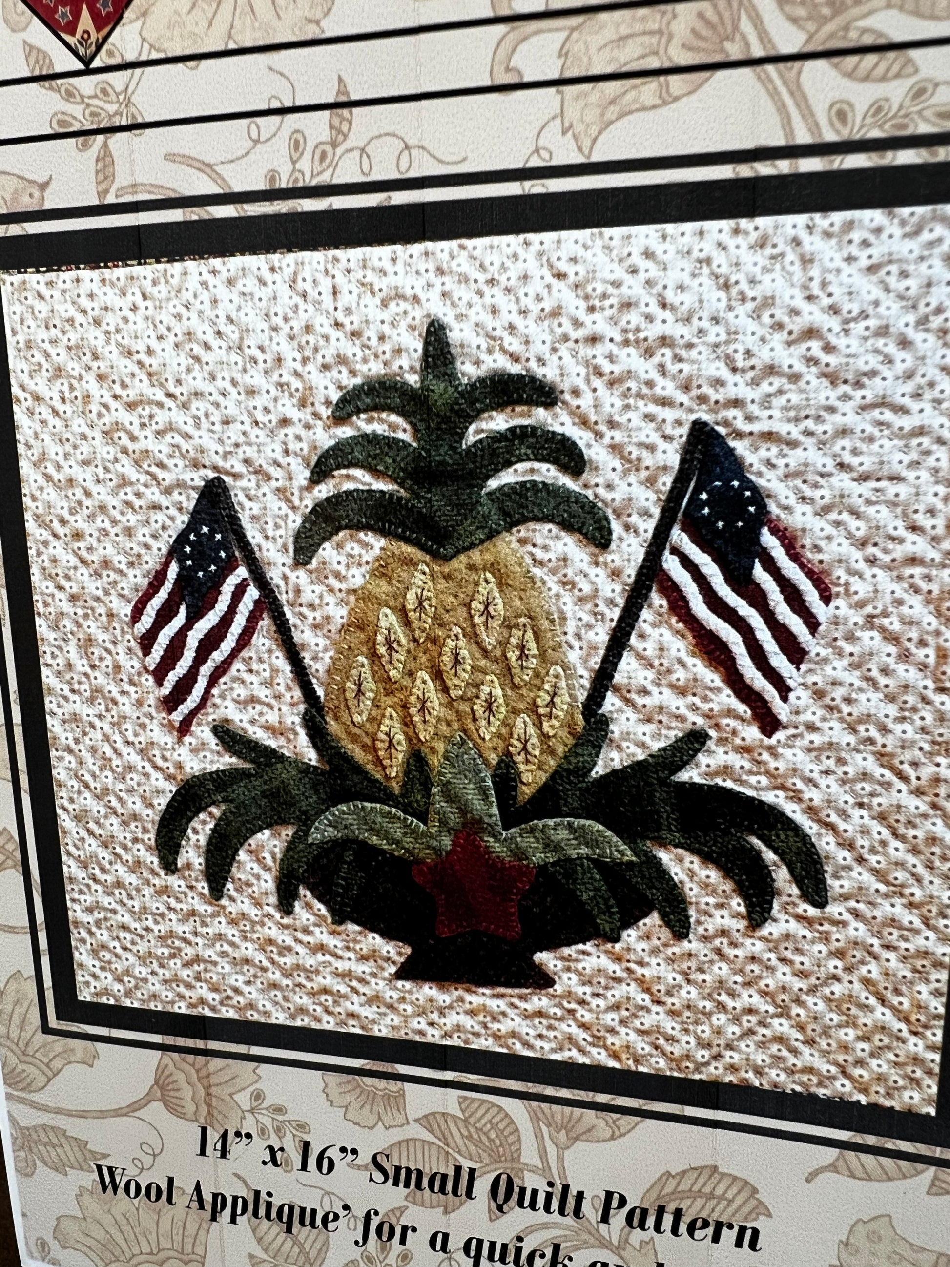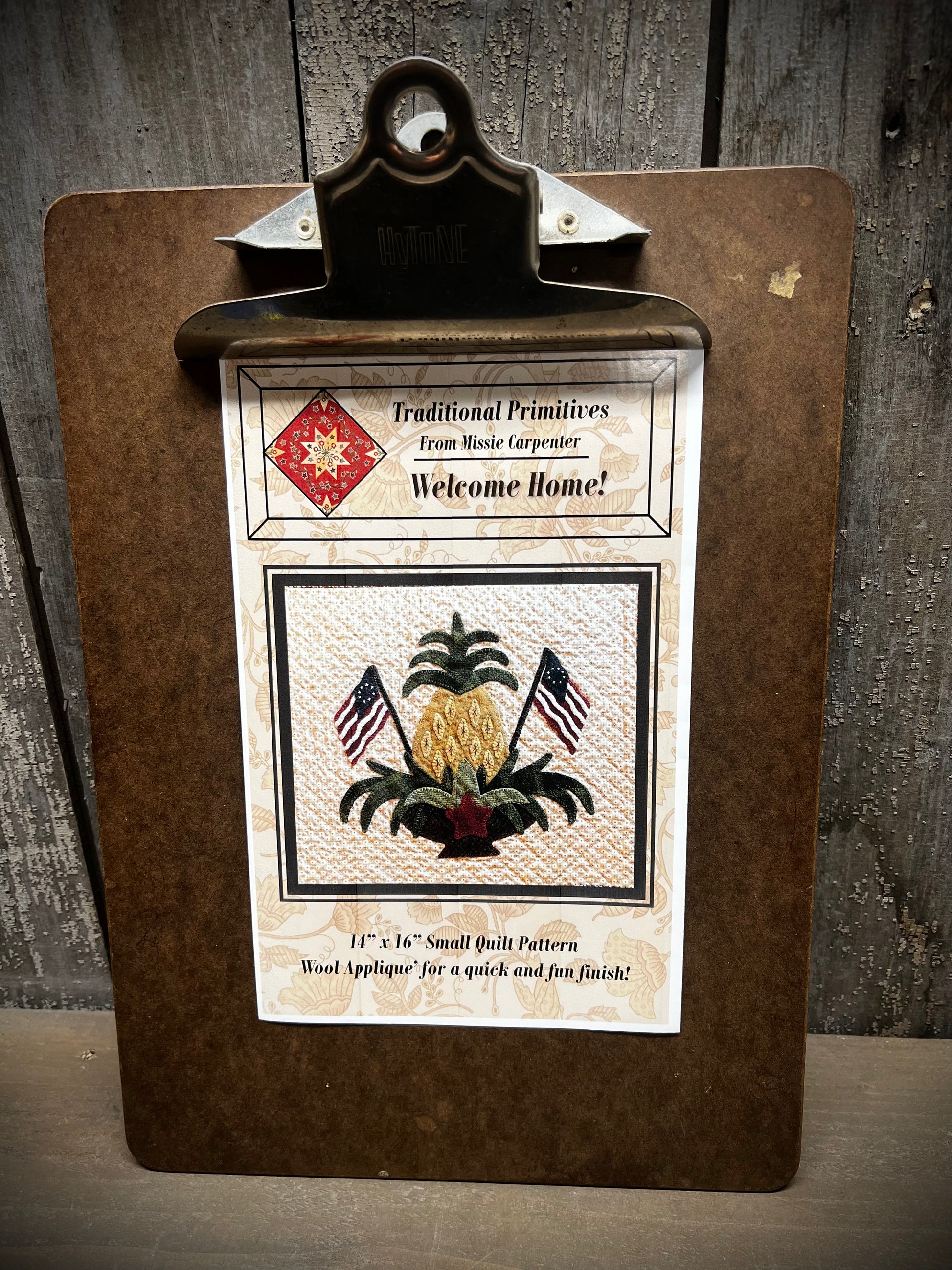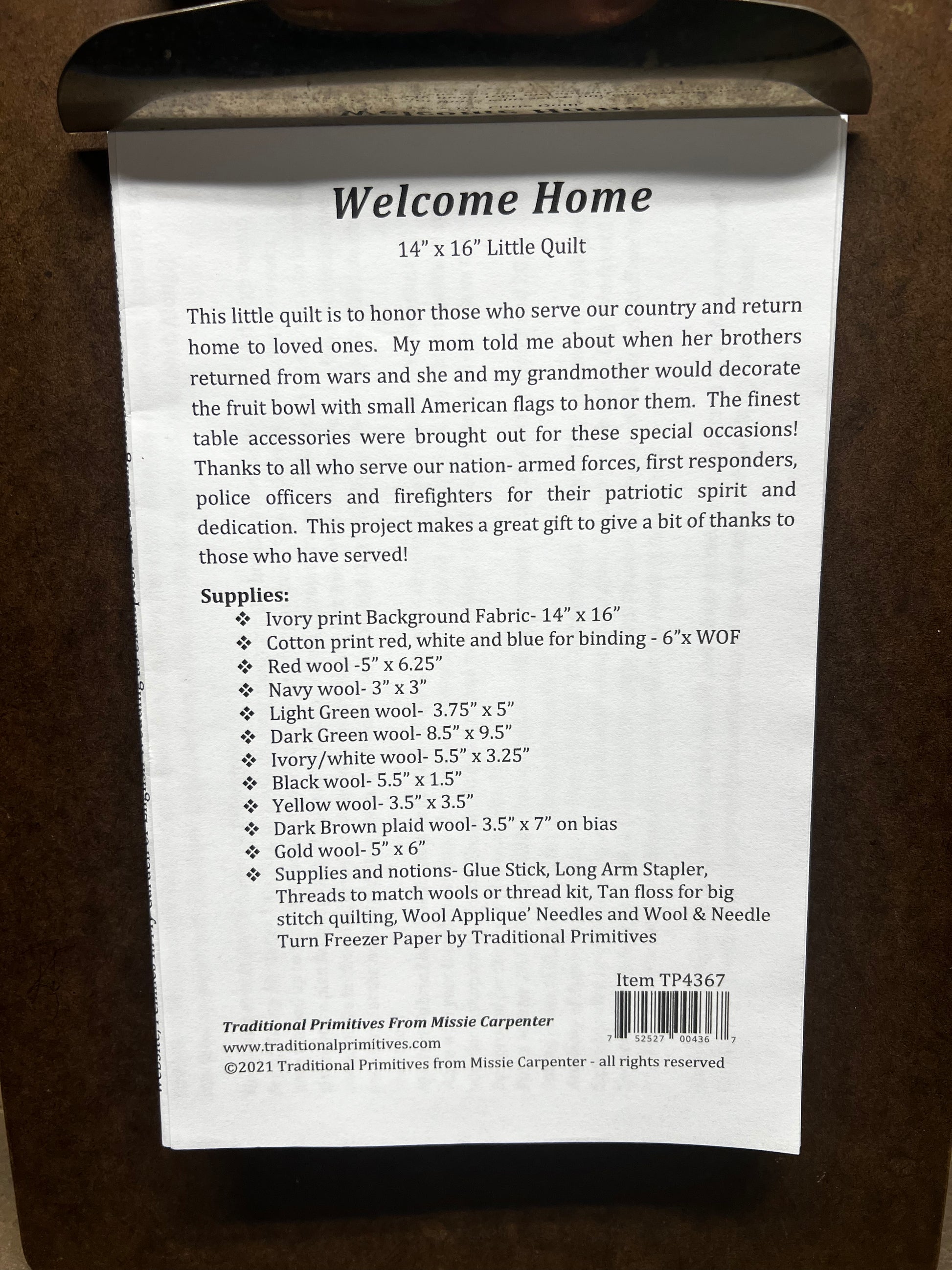 Welcome Home is a patriotic themed project. This little quilt measures 14" x 16" and is made with wool applique on quilted cotton; or just use all wool. The artist was inspired by "the joy felt when loved ones come home from their dedicated work for our country."