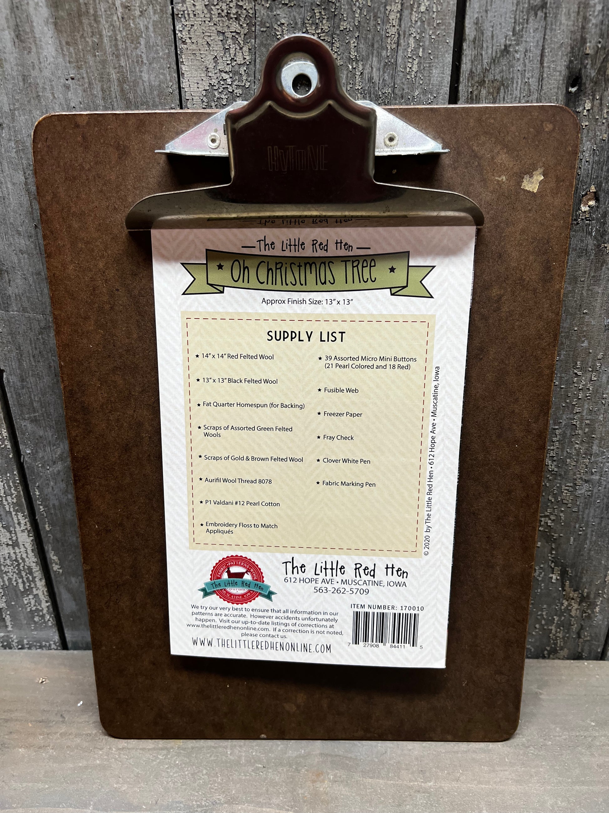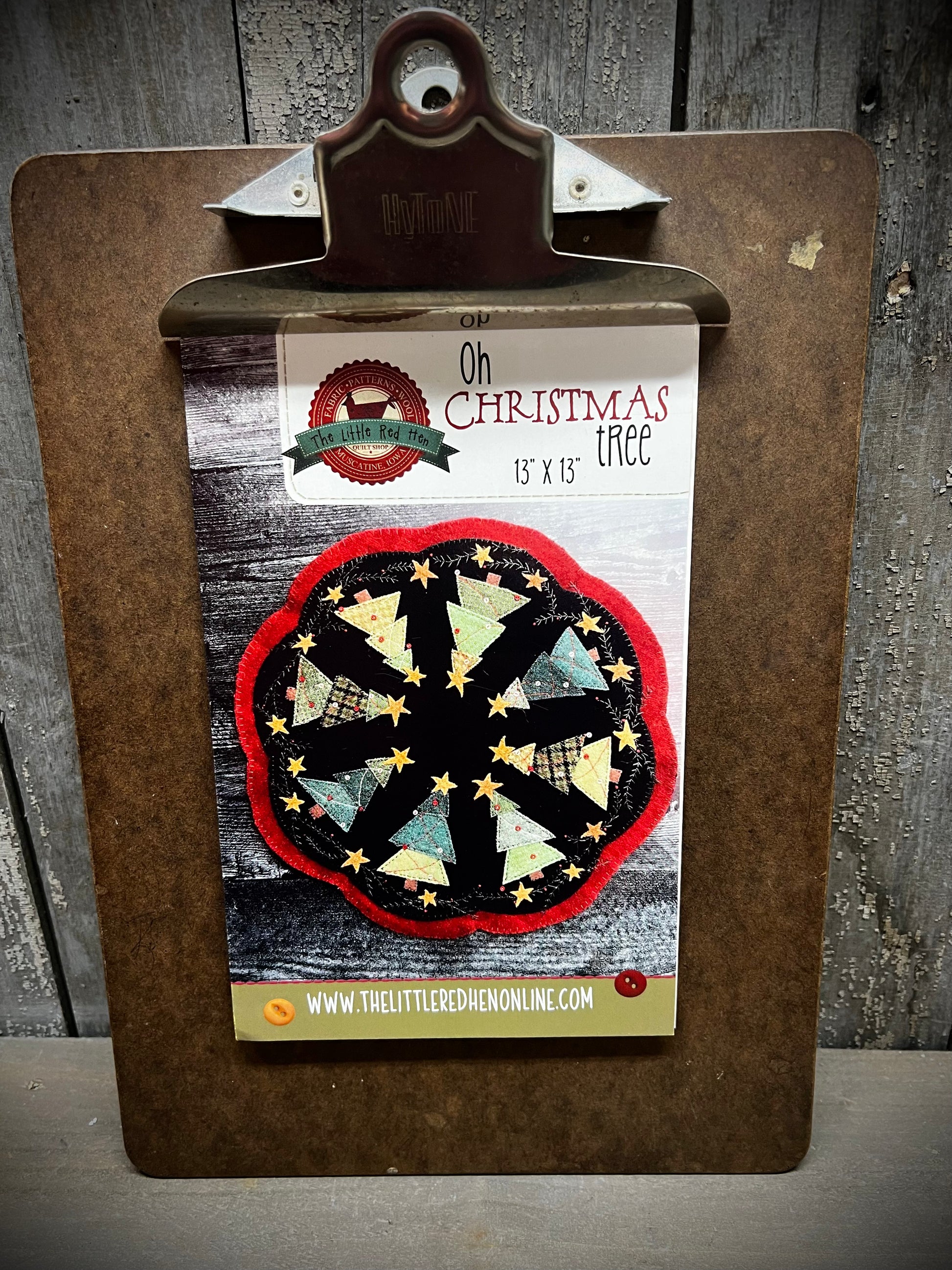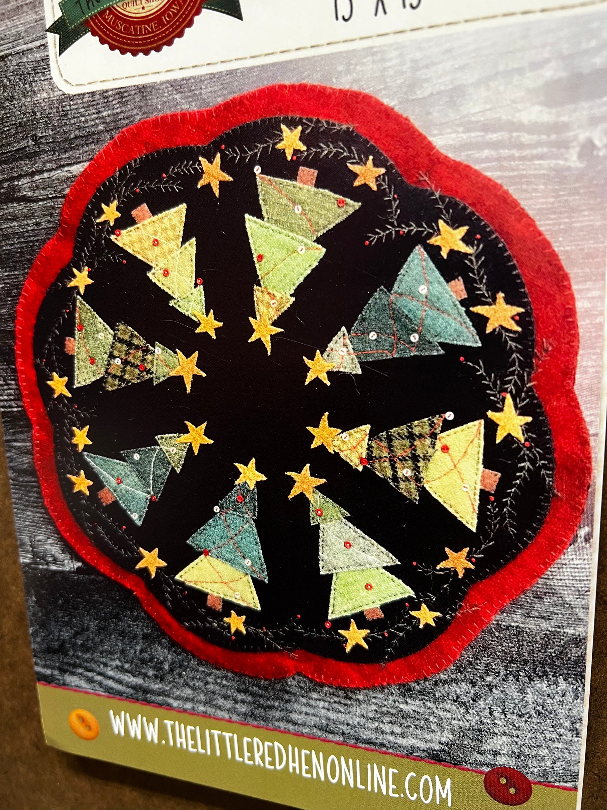 This project is perfect for the holiday season. It's a 13 round wool applique Christmas mat with red scallop edges. There is eight appliqued wool trees embellished with stars, mini buttons, and stitched garland. The stitched evergreen and appliqued stars decorate the edges of this beautiful Christmas project pattern.