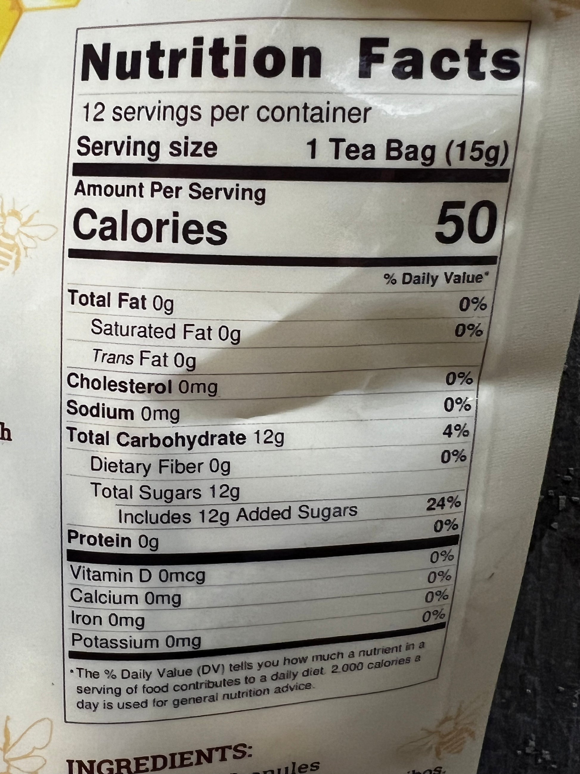 Package of 12 - 0.49 ounce bags, honey granules are in the tea bag