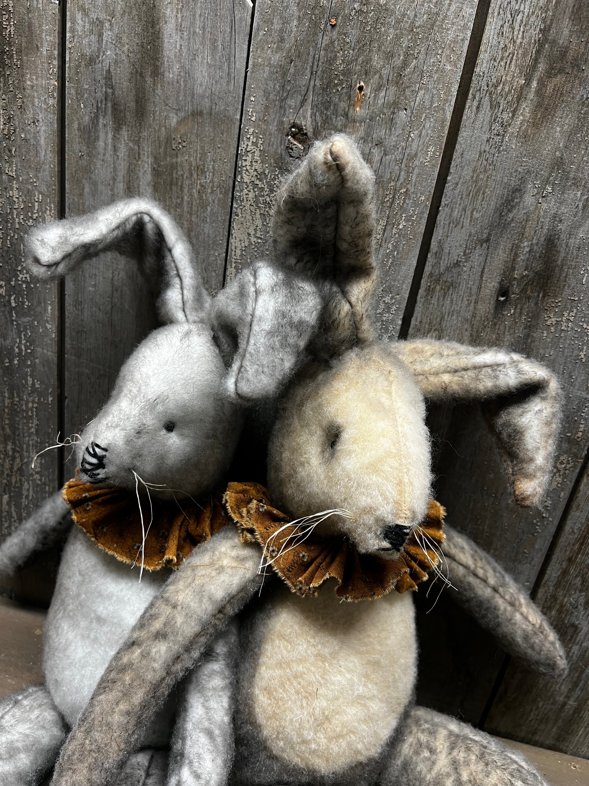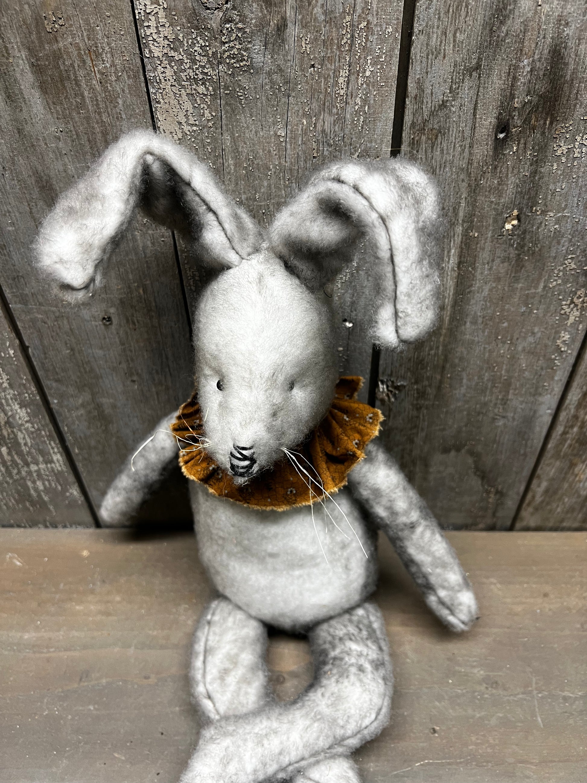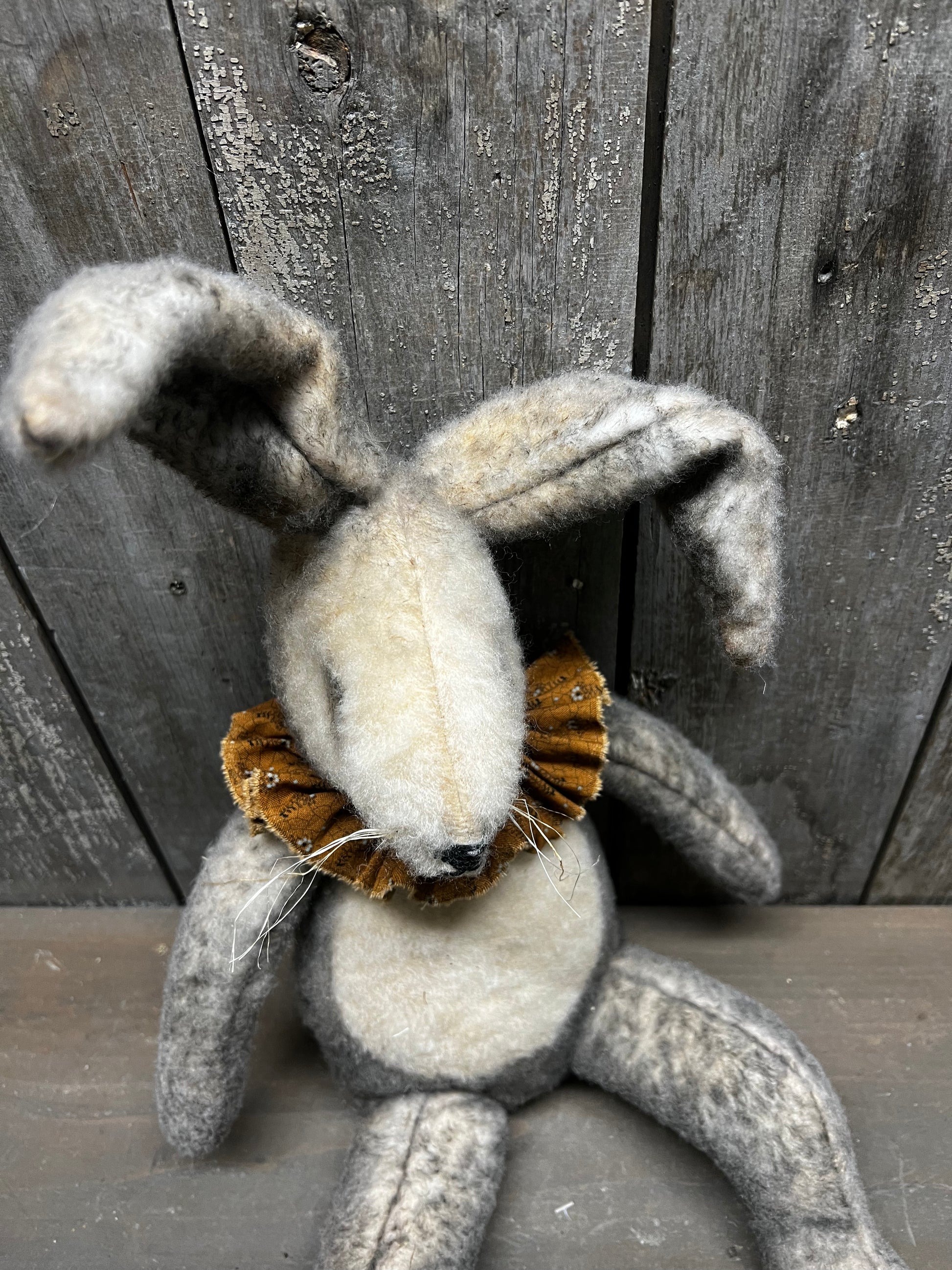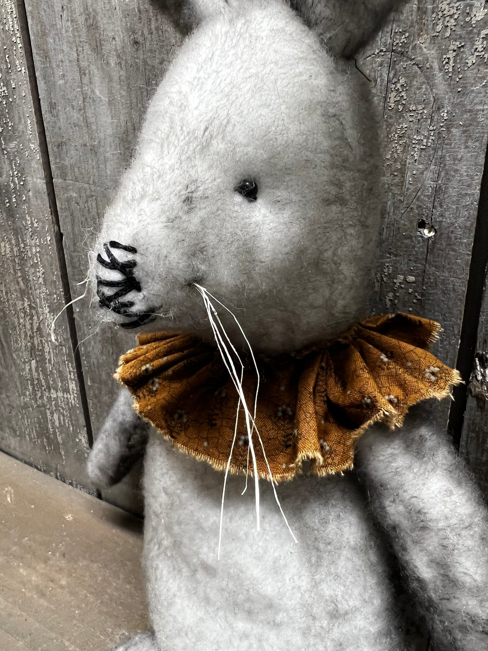 Handmade and oh so sweet! His fur is a lovely mix of either black and tan or black and white. Hand sewn so each one will be unique. Stuffed with poly fil and has a weighted bottom. About 18" tall. Homespun collar around his neck.