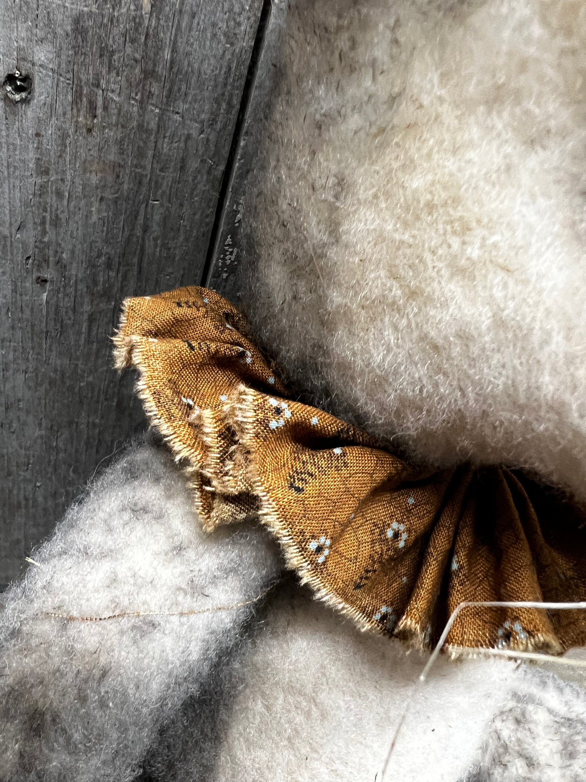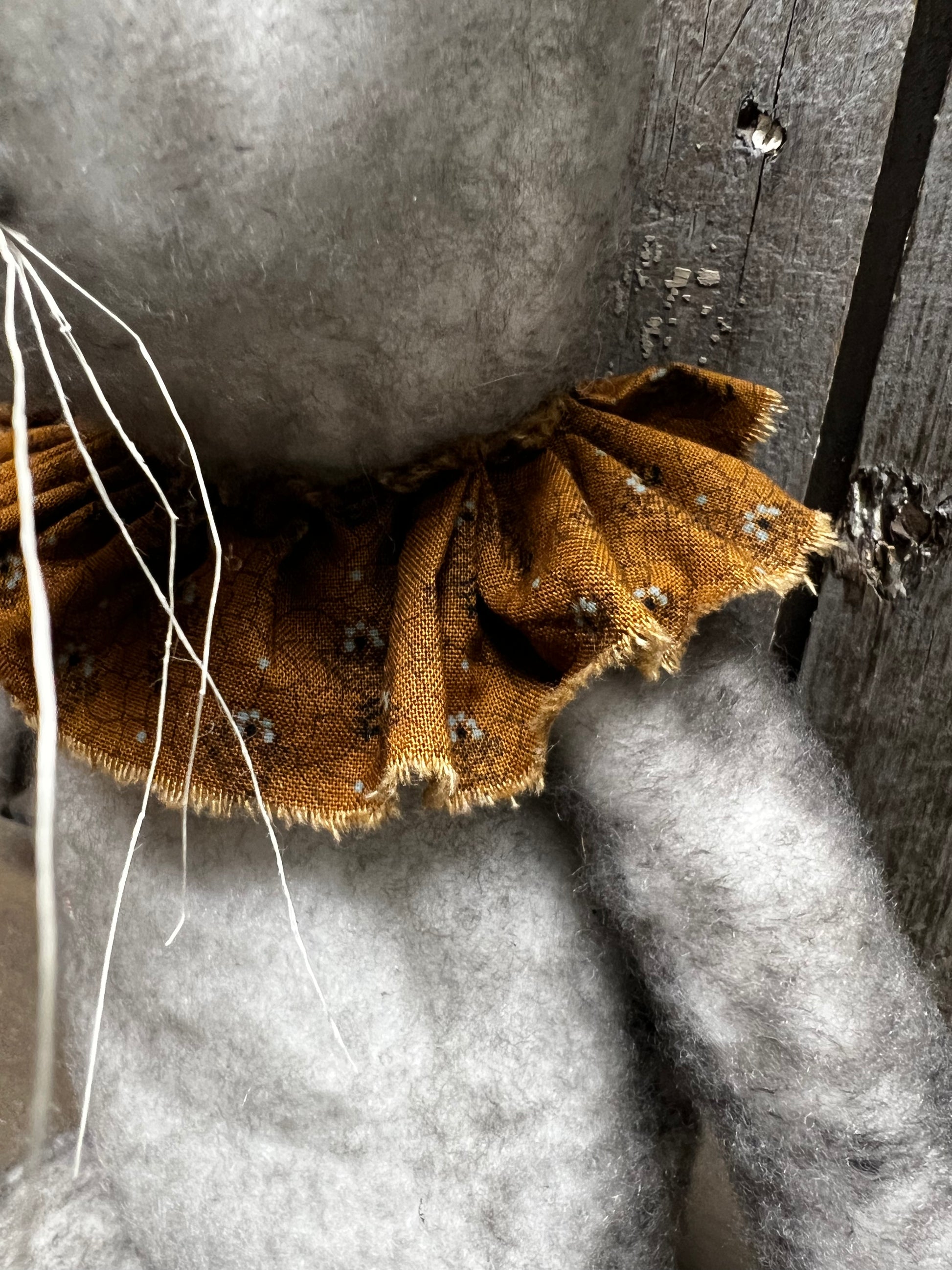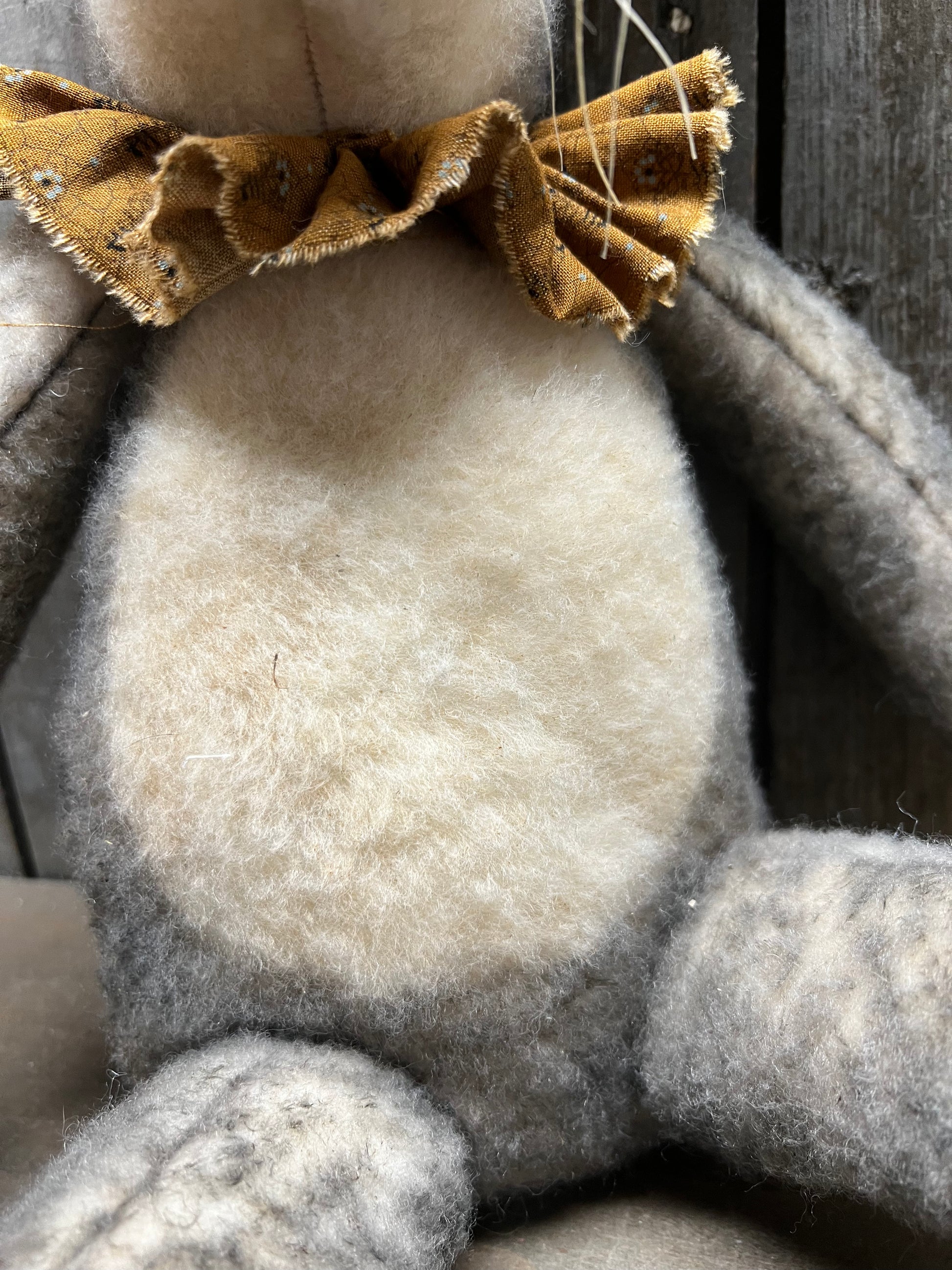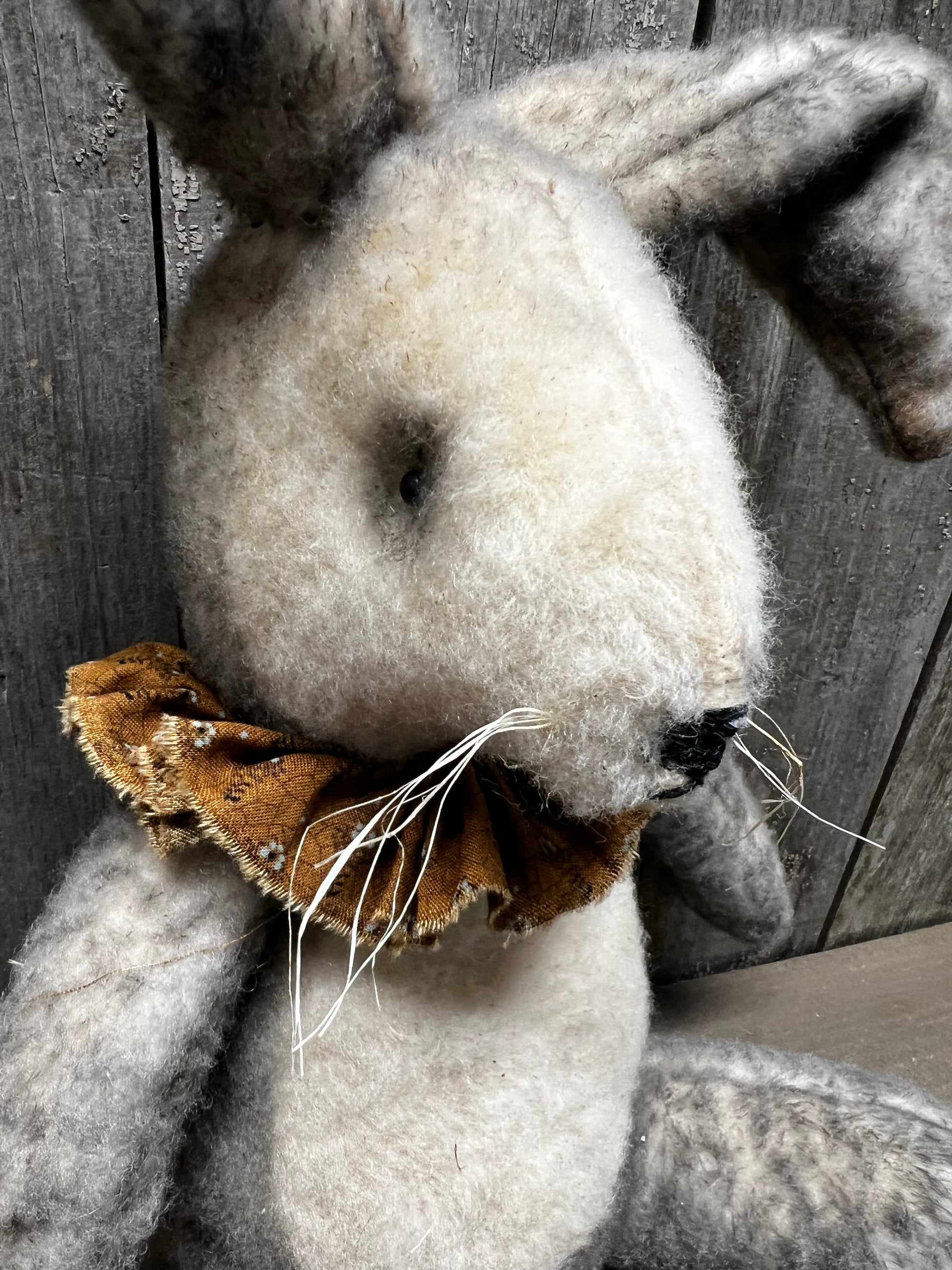 Handmade and oh so sweet! His fur is a lovely mix of either black and tan or black and white. Hand sewn so each one will be unique. Stuffed with poly fil and has a weighted bottom. About 18" tall. Homespun collar around his neck.