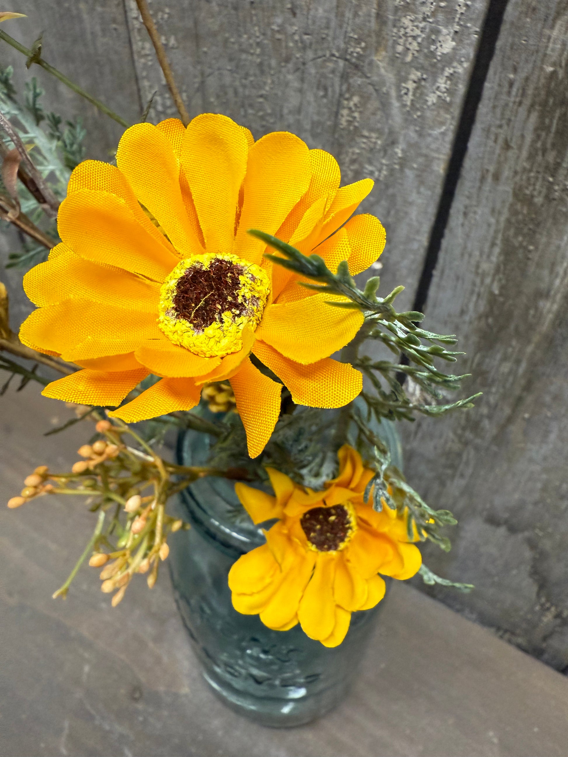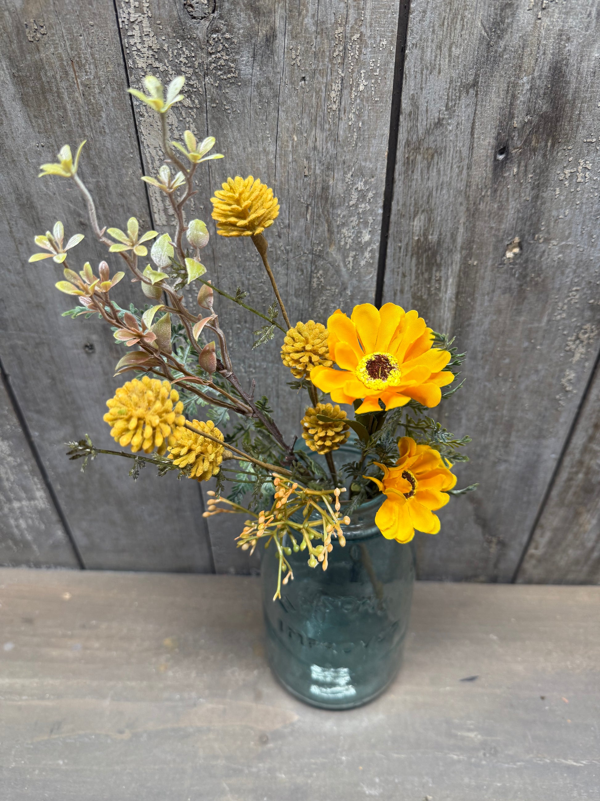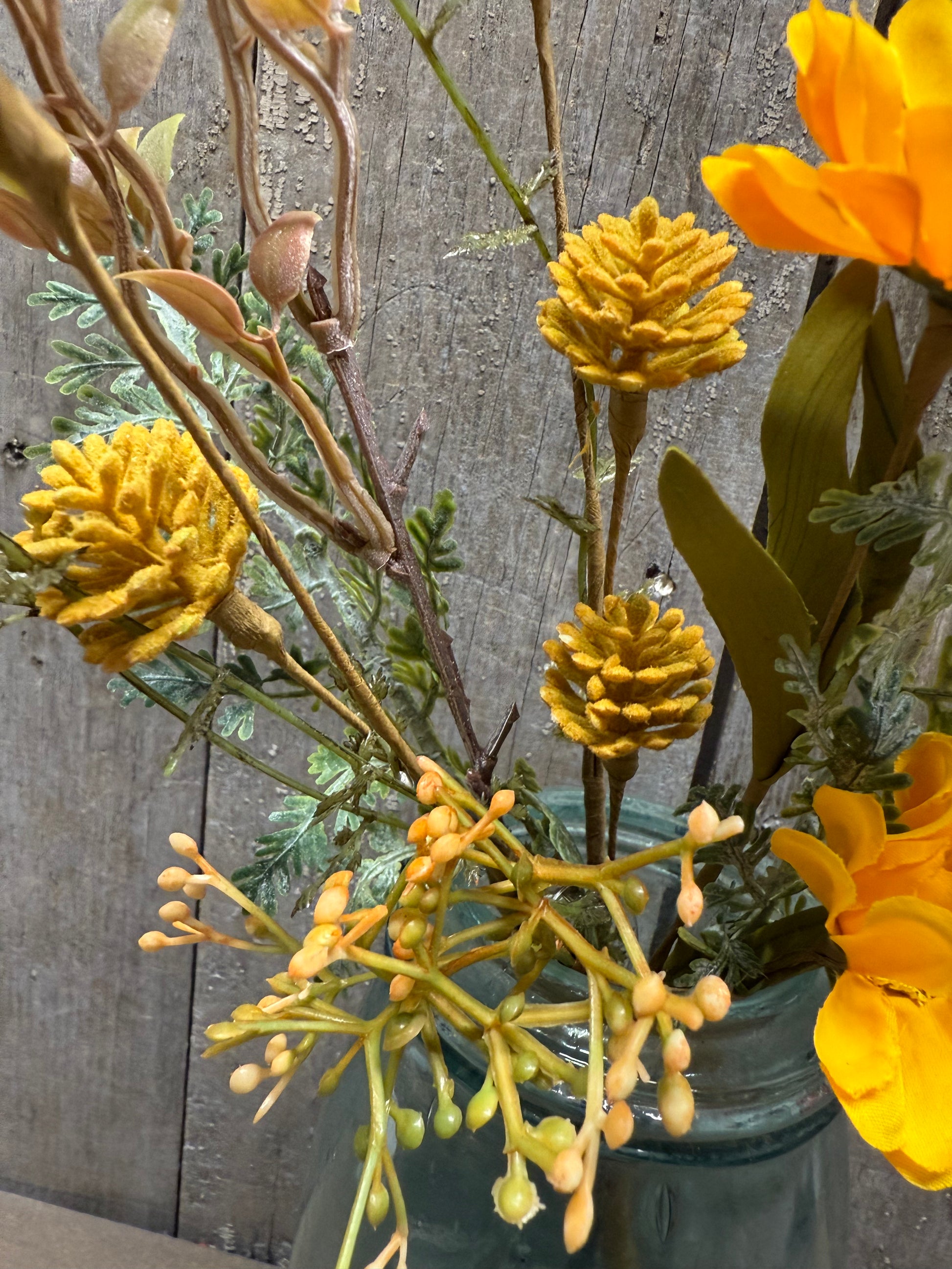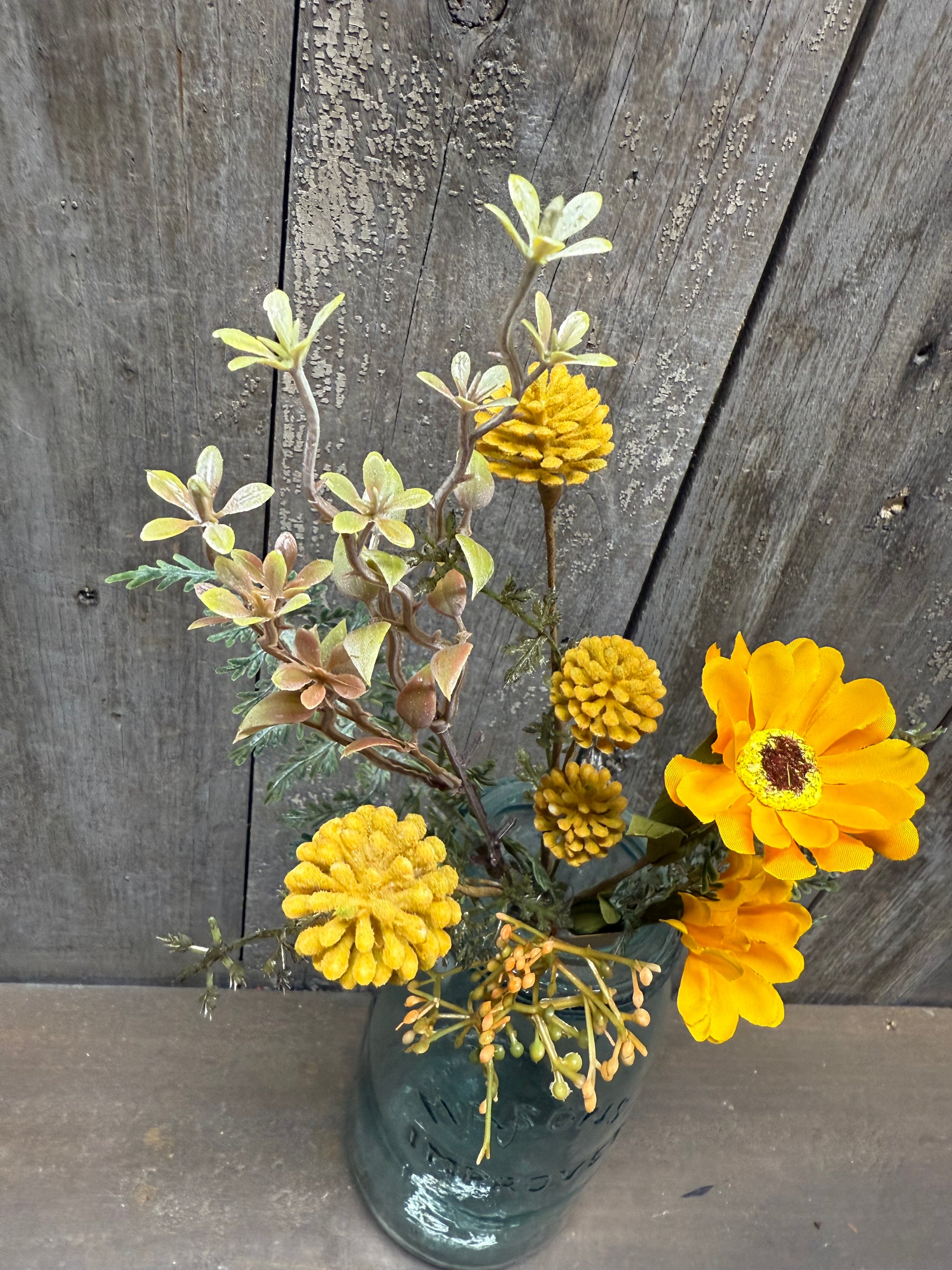 Yellow daisy share the show with this mixed floral pick. A bit of everything. Greens, berries, daisies and pods combine to be a must have. Perfect for small crocks, bowls, baskets and wreaths.