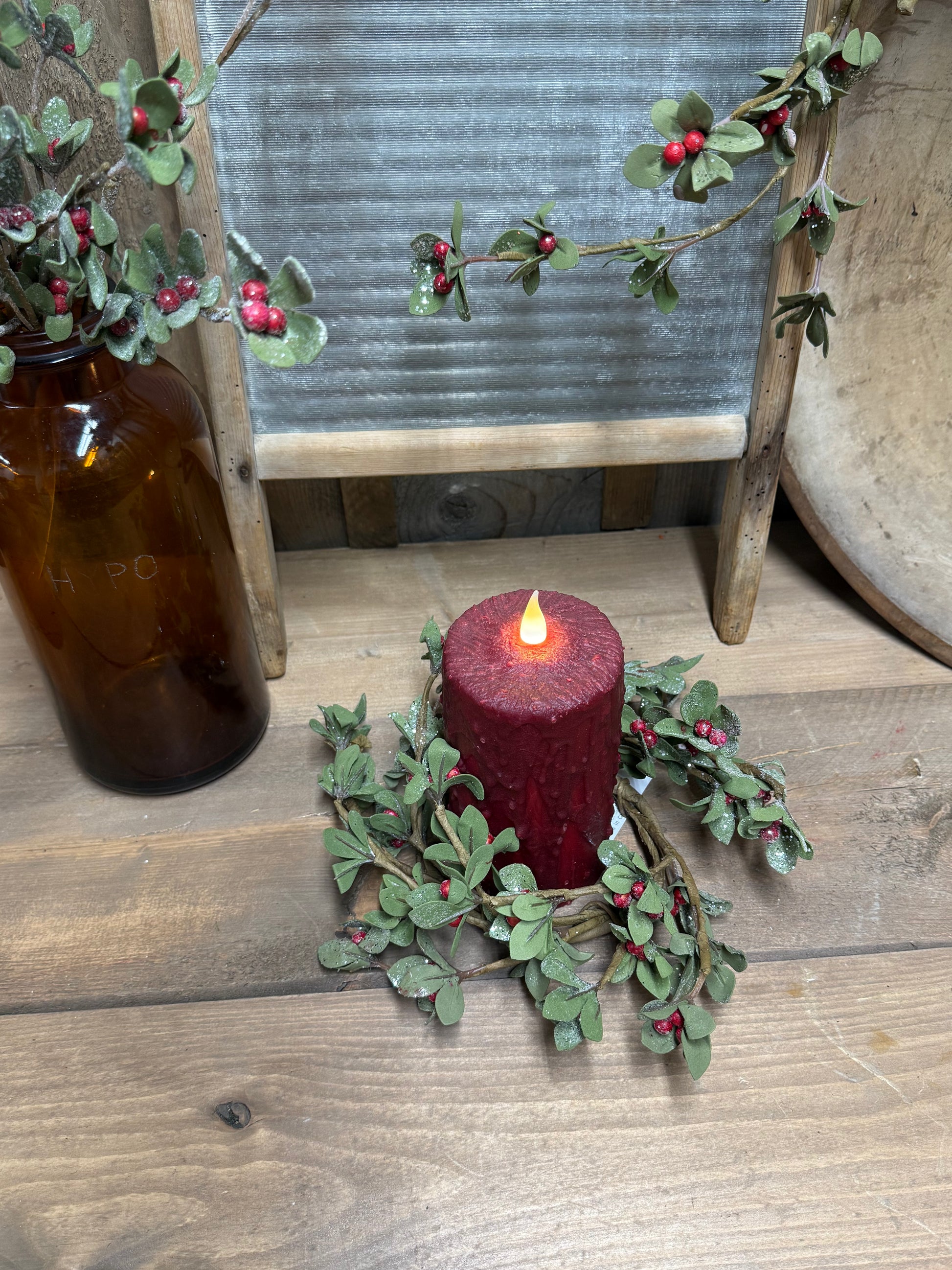 Sage green and matte red berries are sprinkled with glitter to add a new fallen snow look to this lovely collection. The 48" Garland is wired and has multiple stems of leaves and berries. Also show with the Pick and the Candle Ring. One shown.