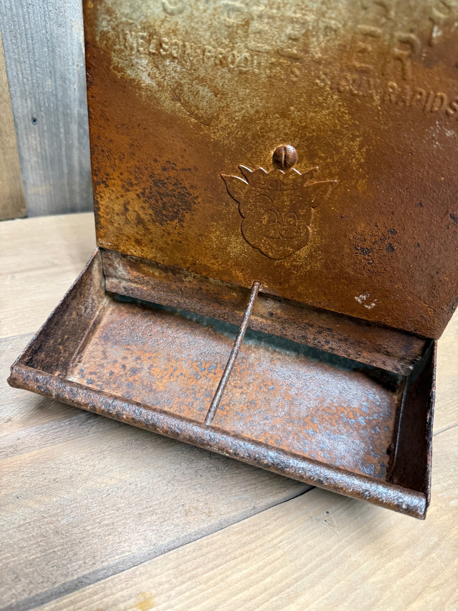 This vintage pig feeder is from Nelson Products in Sioux City IA. It is a No. 88 Sanitary Pig Feeder. This piece is rusty, worn and has a great patina. It would look great with flowers (real or fake) in the base. Measures 12.5" high and 8" wide. It is 4 1/2 inches deep at the top and 8 inches deep at the base. Overall very good condition.