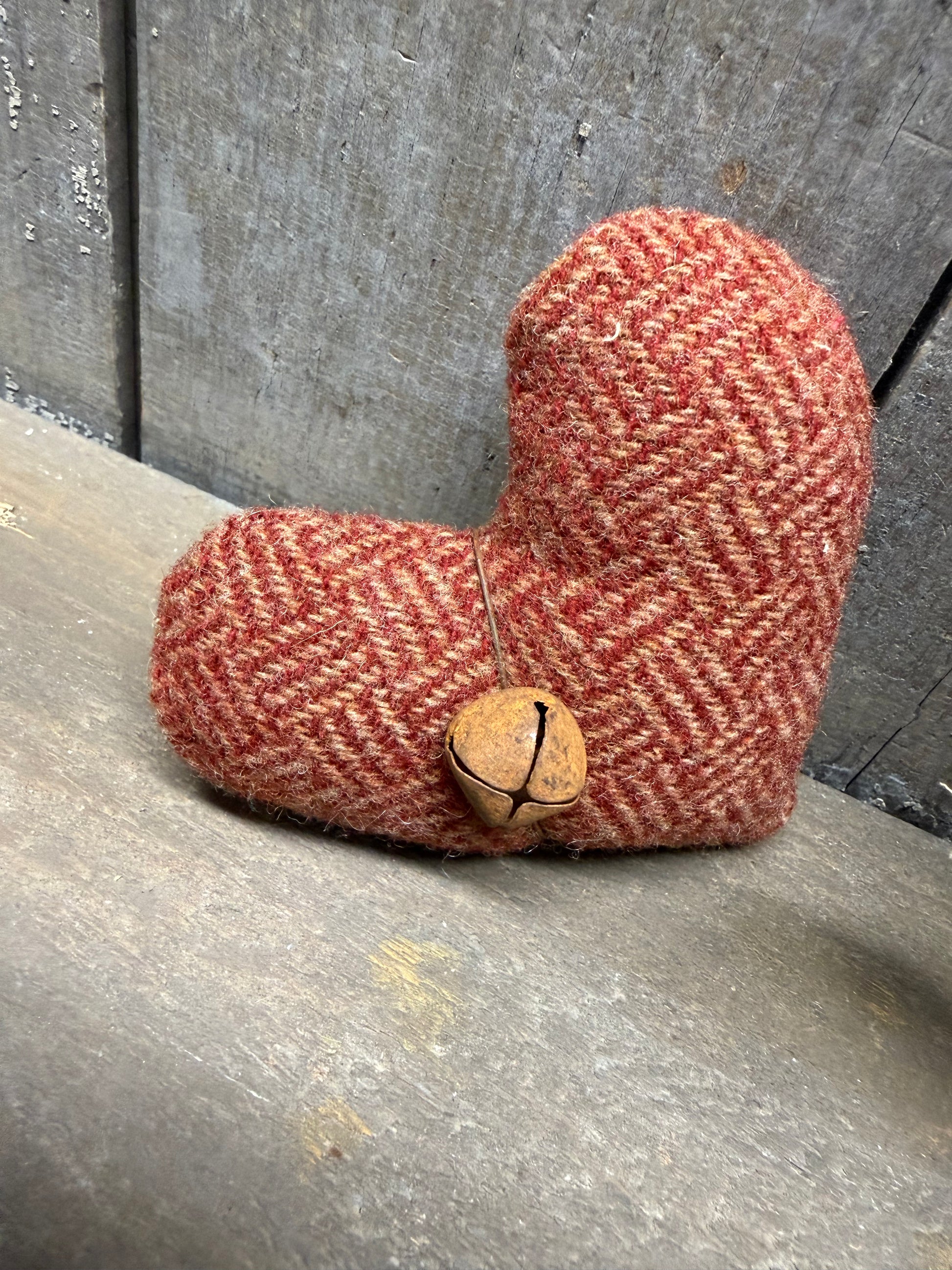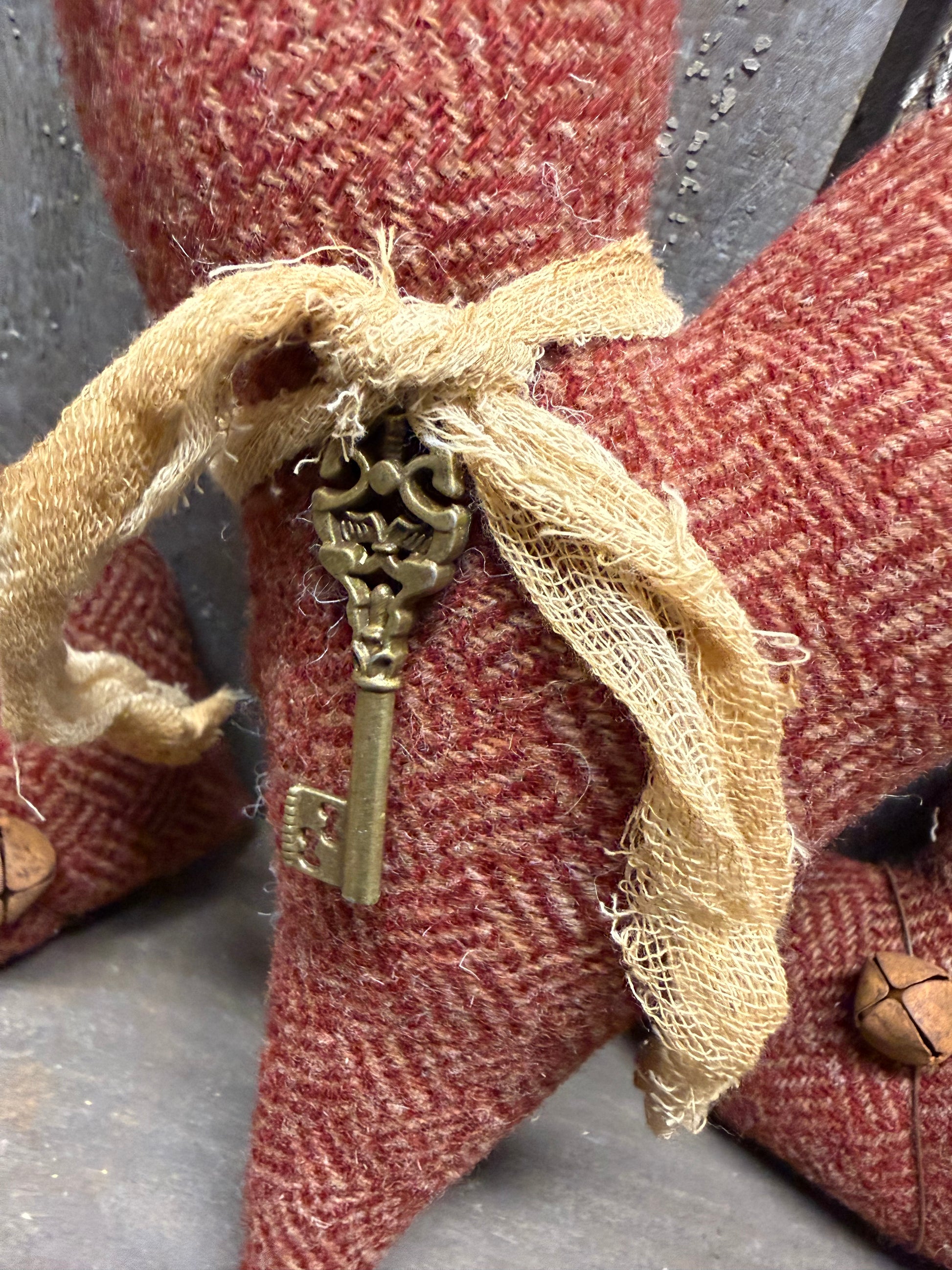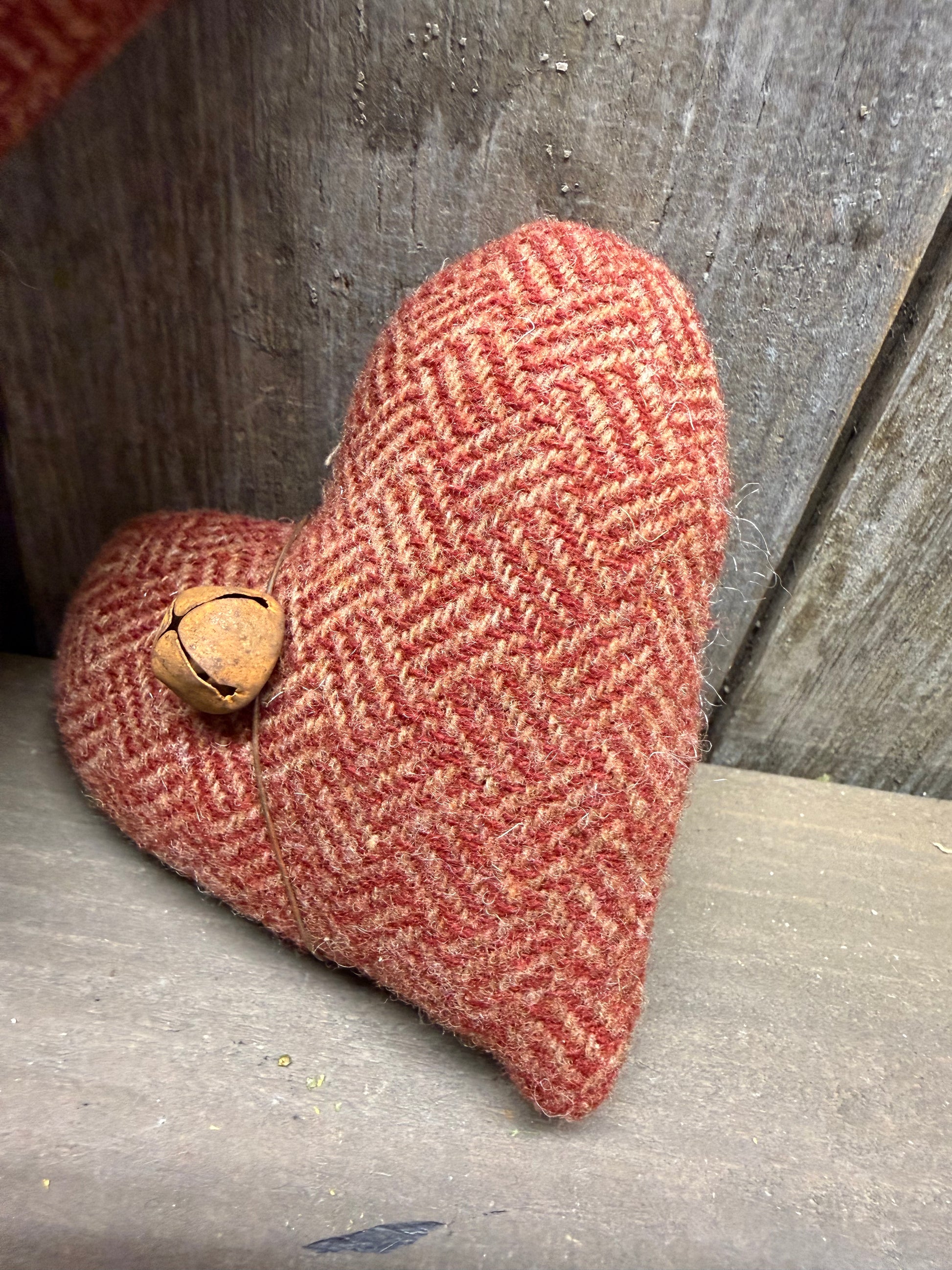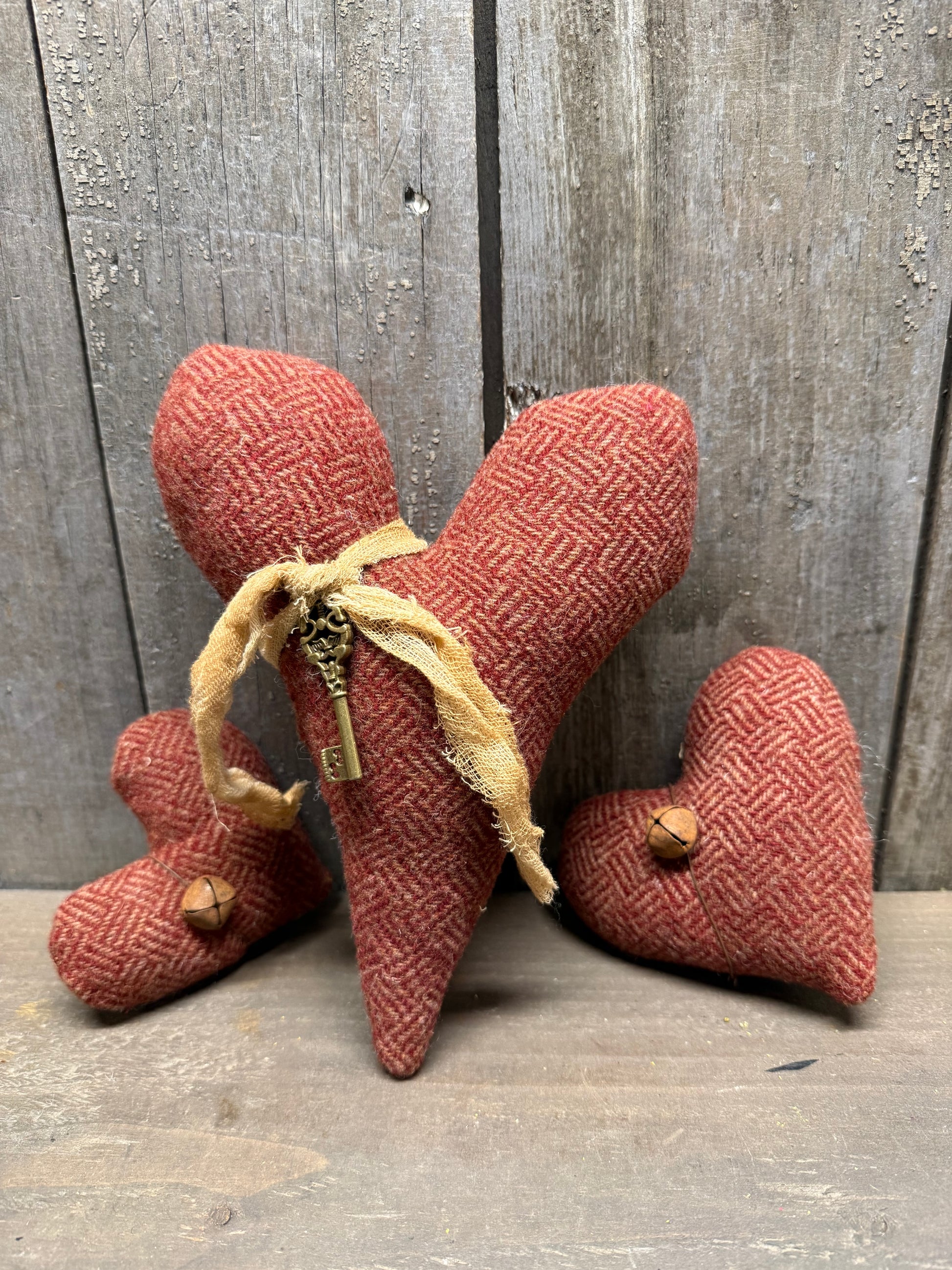 Locally made and full of love. You will receive a set of 3 hearts. The largest is 8" long and the other 2 hearts are smaller. Perfect bowl fillers or can be hung on a tree by adding a hook; not included. Made from wool, cheesecloth and rusty wire and bells.