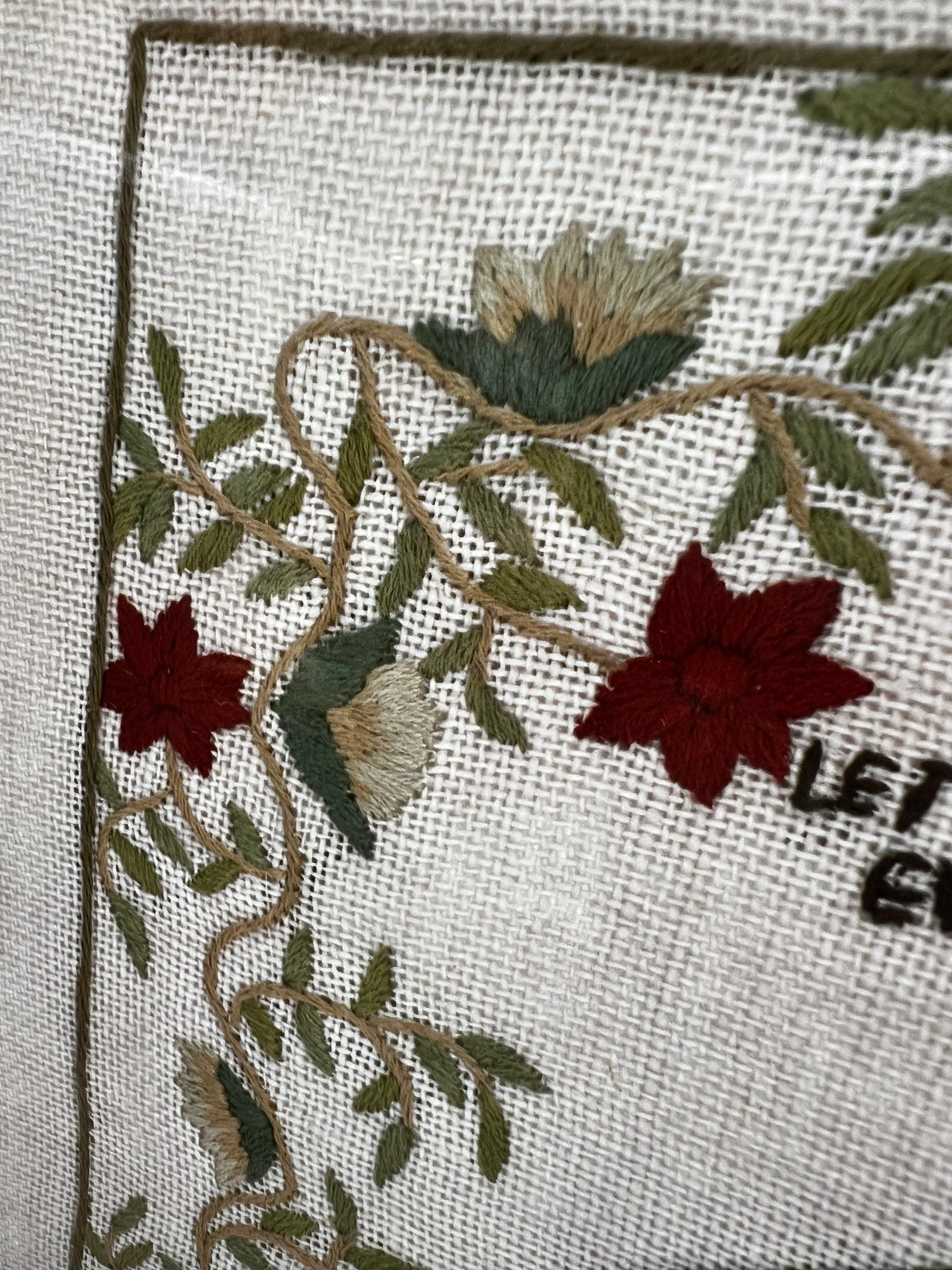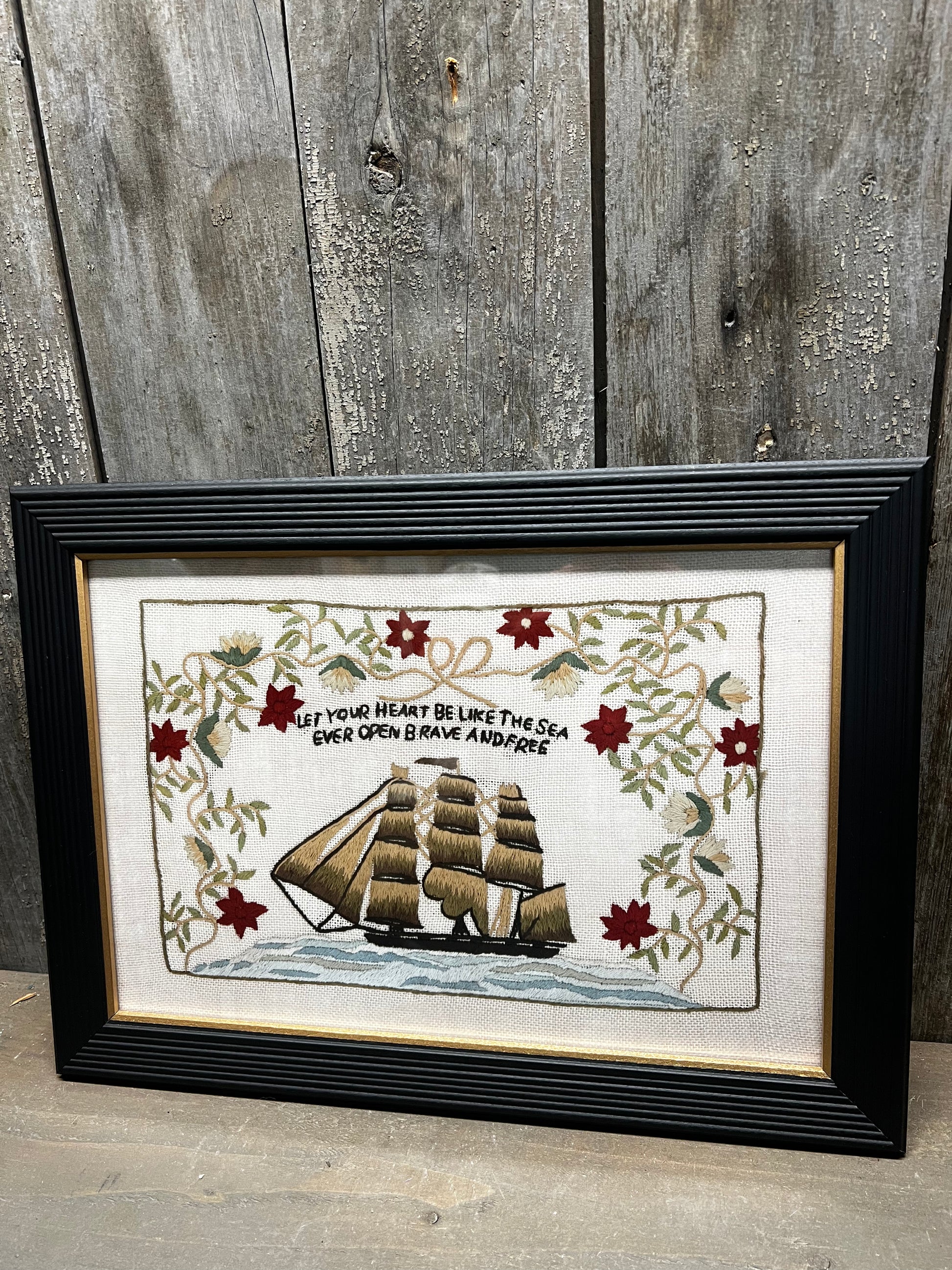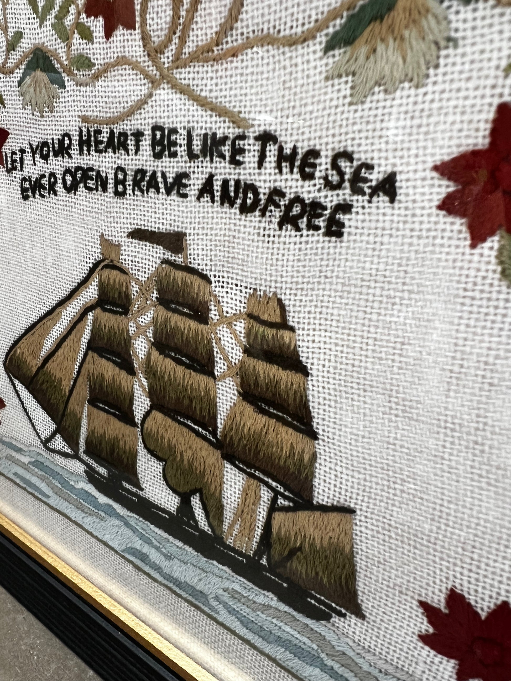 A brilliantly reproduced print of an embroidered ship with a vine border with red flowers on off white linen fabric. It reads, "Let Your Heart Be Like The Sea Ever Open Brave and Free". Hard to tell this is actually a PRINTED sampler and not the real thing.