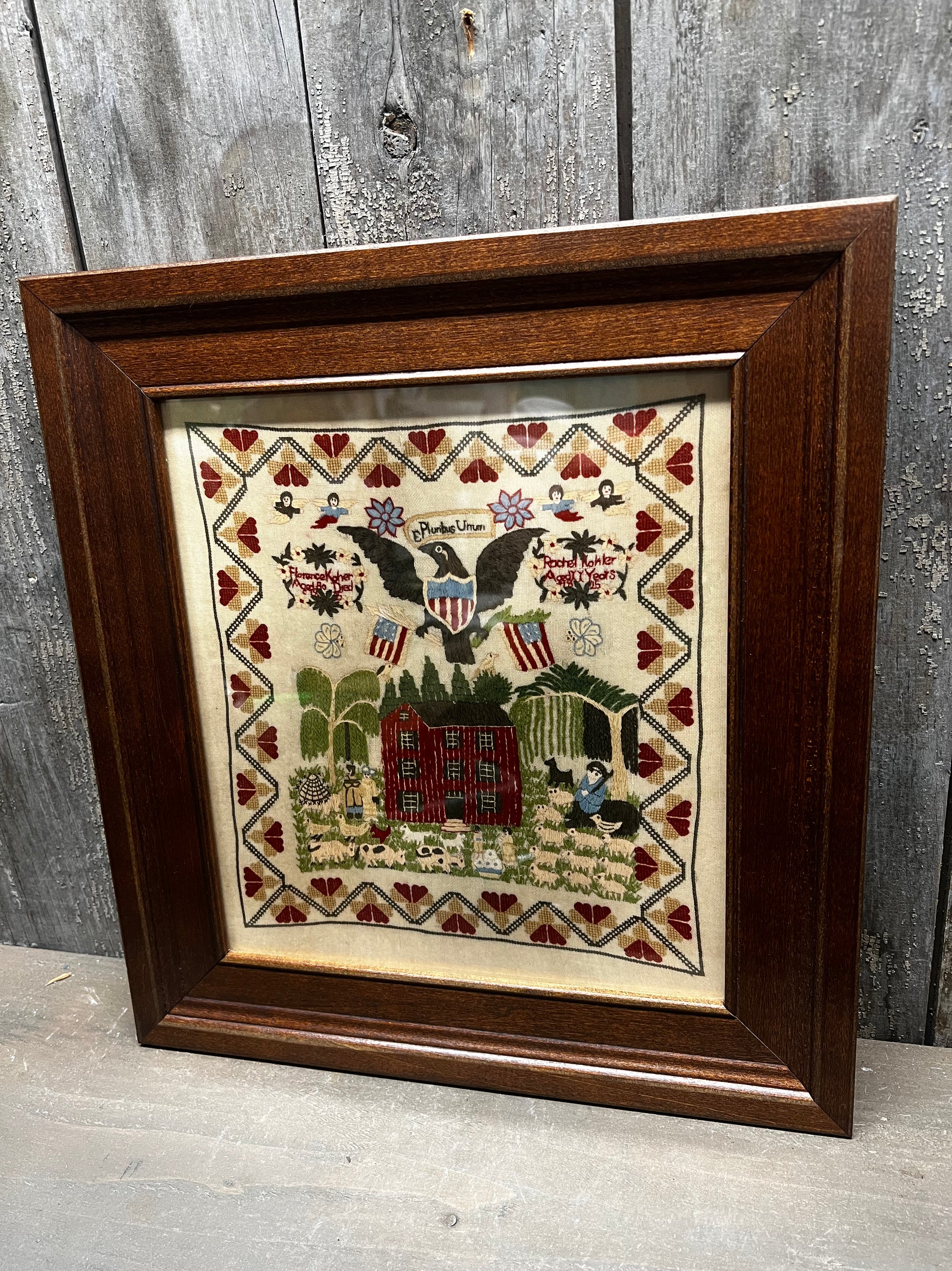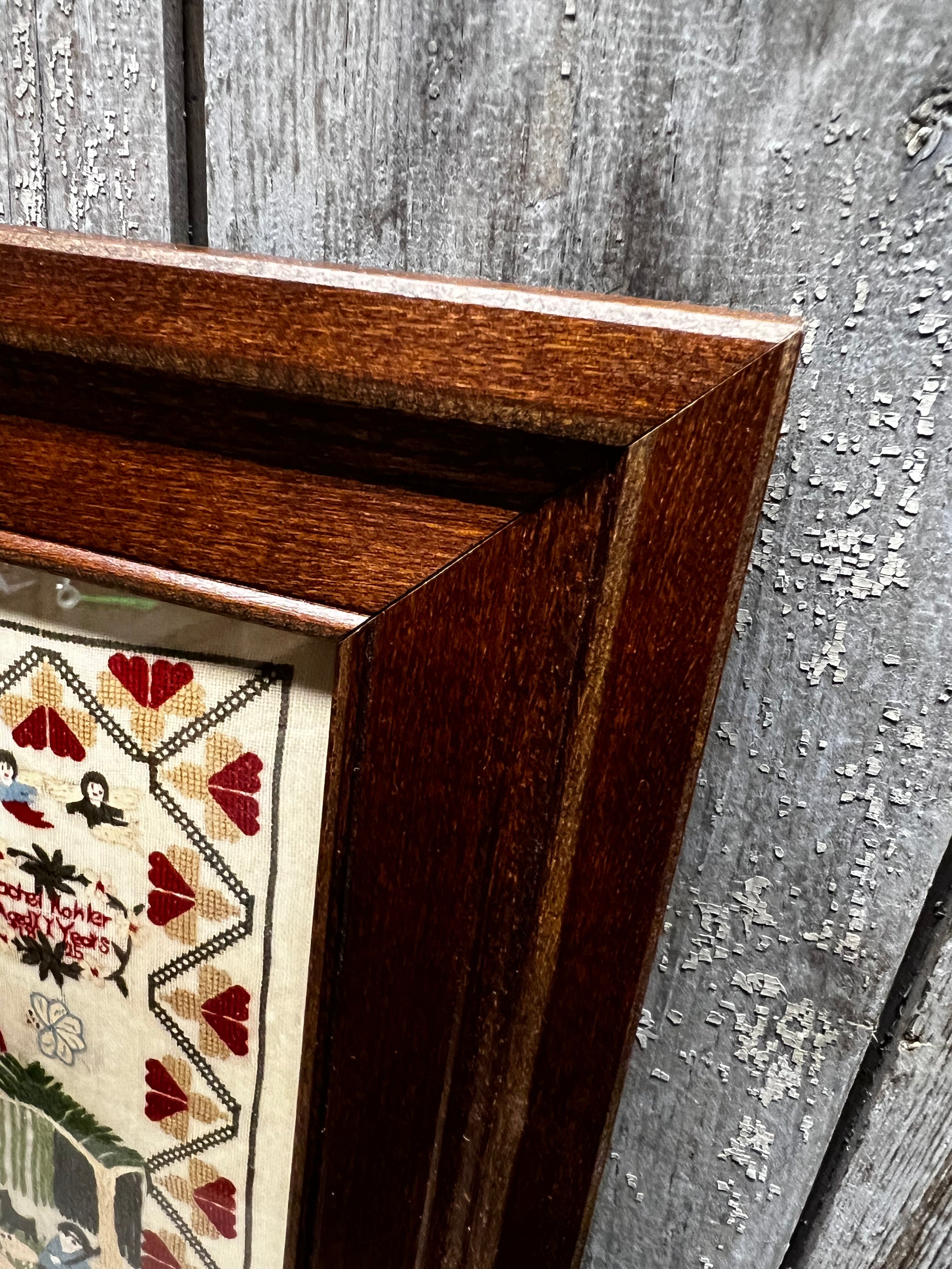 Our Rachael Kohler PRINTED sampler looks so GENUINE that it is difficult to tell it is actually printed and not the real thing. The quaint needlepoint includes misspelled words and backward letters, as is appropriate for a young girl just learning to sew and read. A lovely addition to your historic or primitive home, and perfect Americana decor.