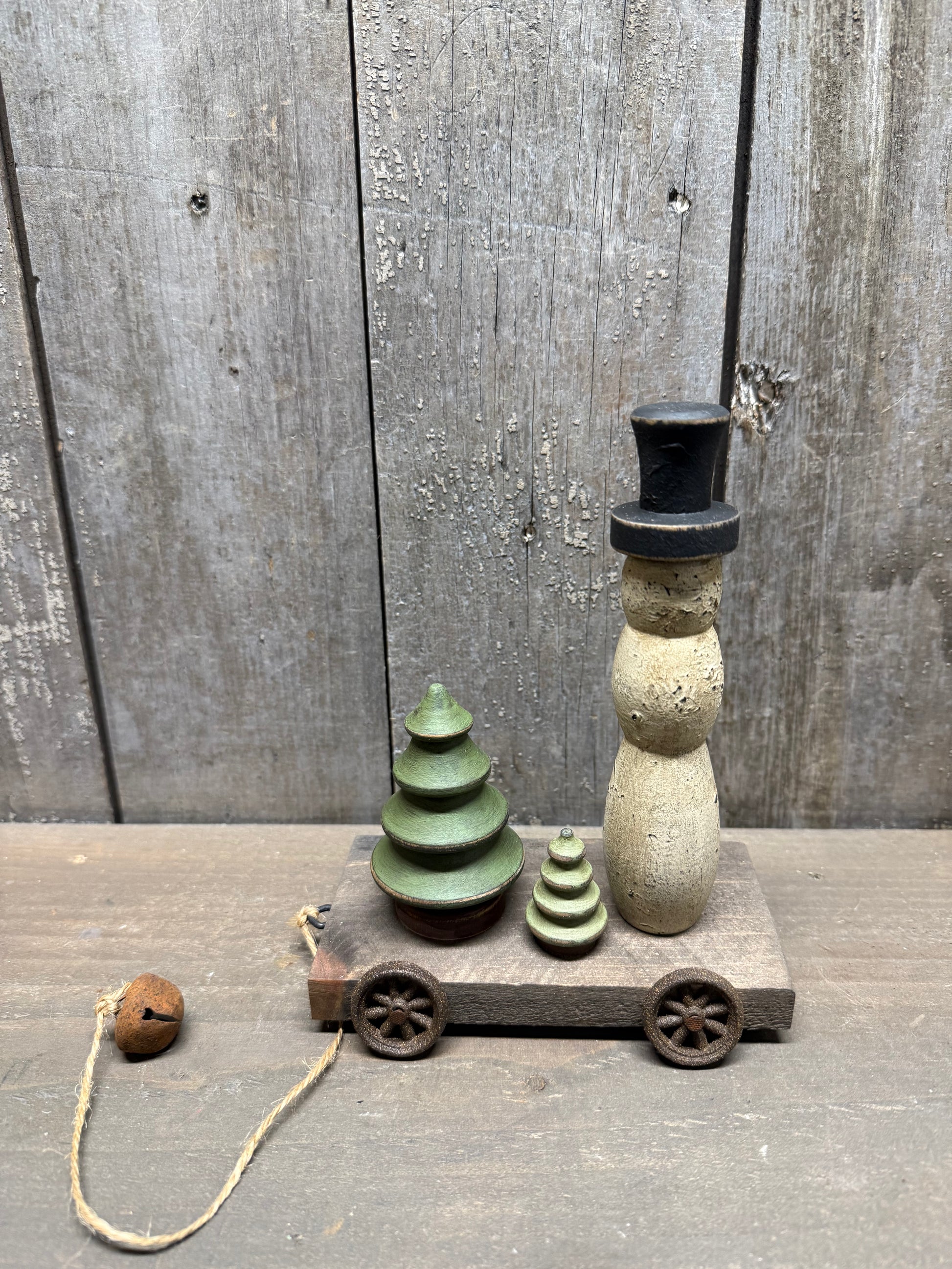Handmade by your friends at LVP, we used wood turnings crafted in Maine to make this sweet vintage inspired "pull carts." Notice we didn't call them TOYS because although the wheels turn, they are not meant to be played with by children. We turned bits and pieces of old wood into the carts and gave the wheels, also made in Maine a dirty textured look. Each figurine has a textured base coat, a top coat, is sanded and stained. The cabins are painted freehand so each one is a bit different. Remember we use wood that may have "dings and dents, cracks and holes" in it. That is part of the character. Each cart will be slightly different. Keep in mind we use a high grade wood glue but we cannot guarantee if it is bumped or dropped that you may need to reattach a piece.
