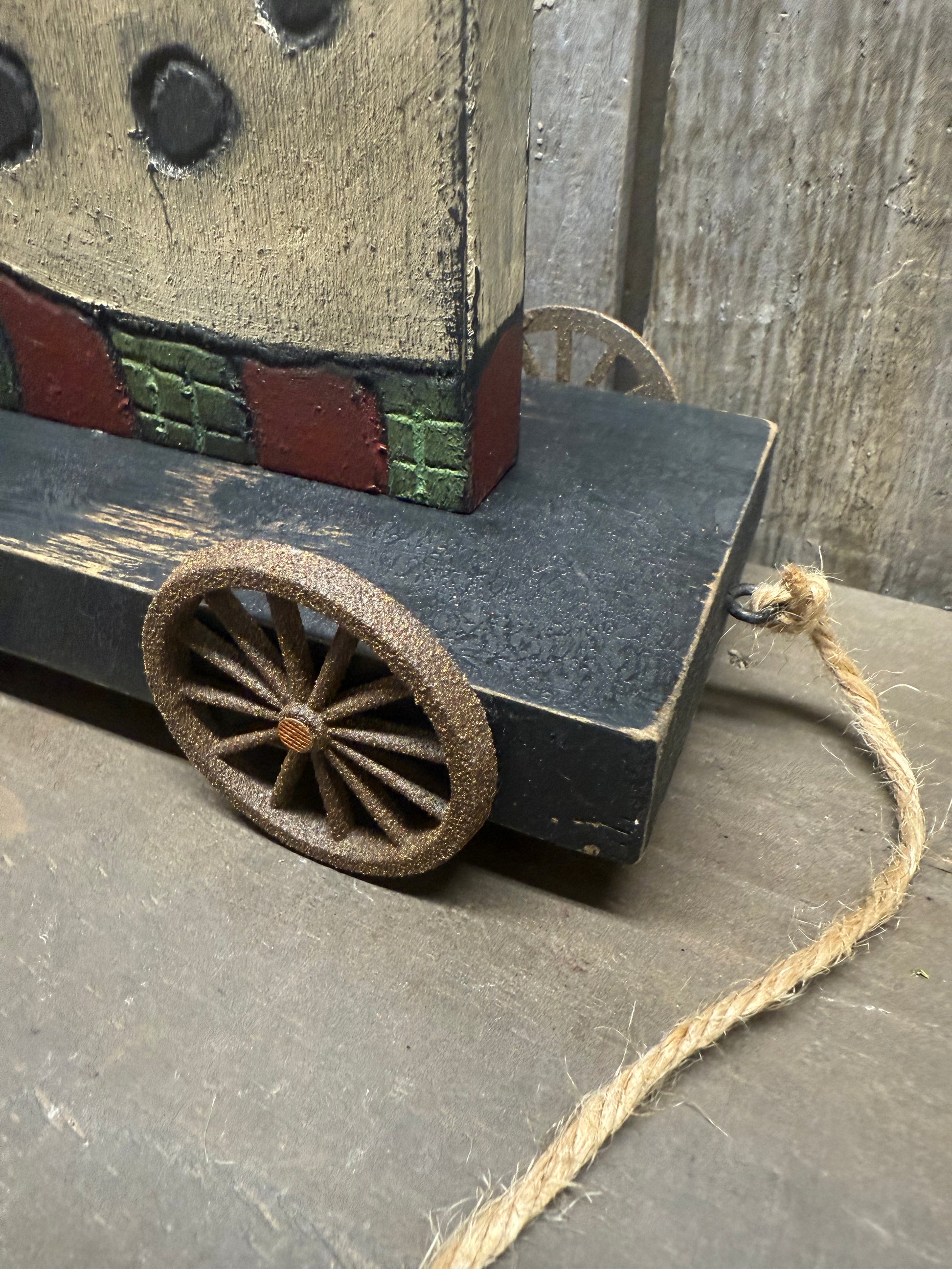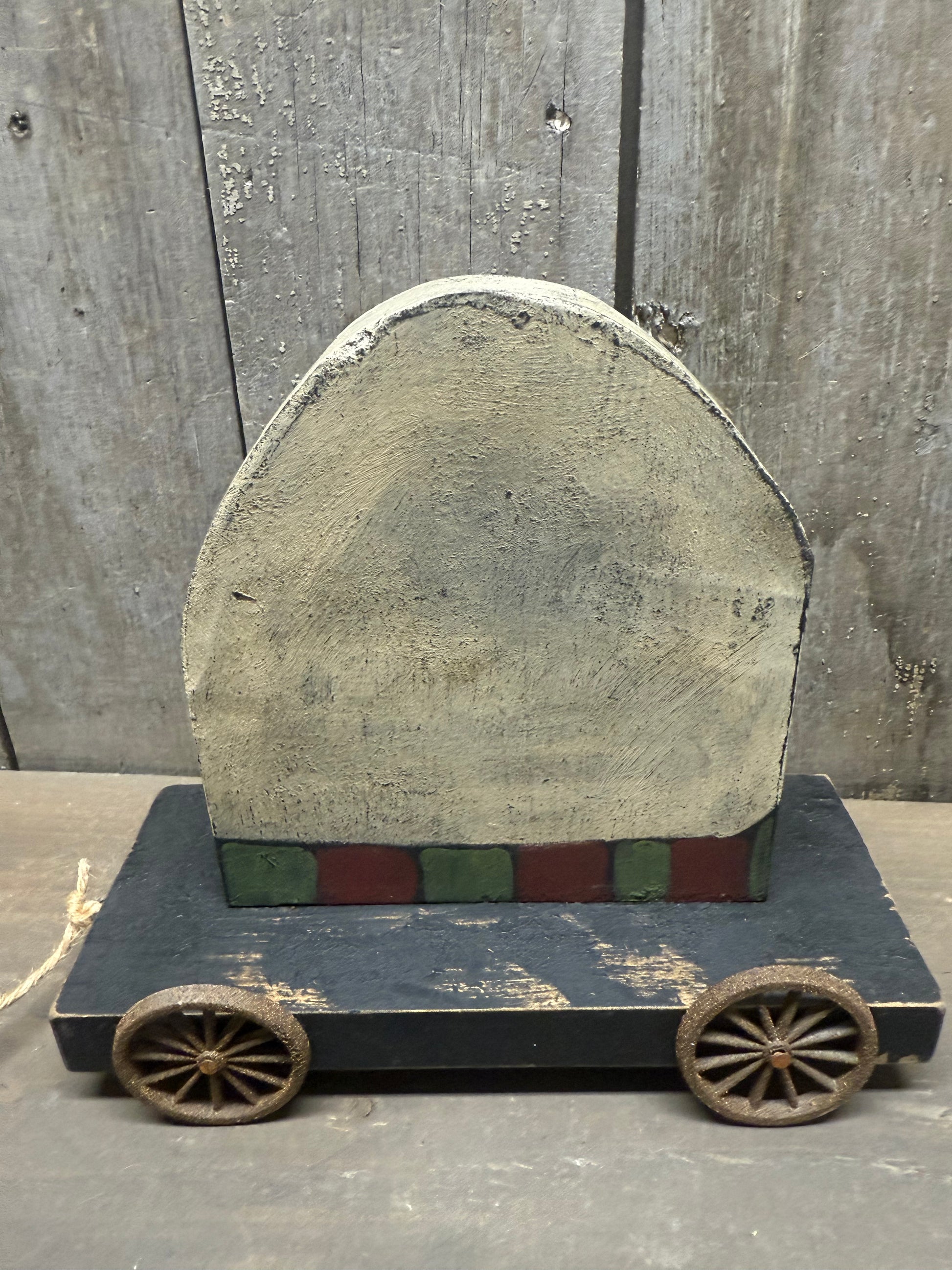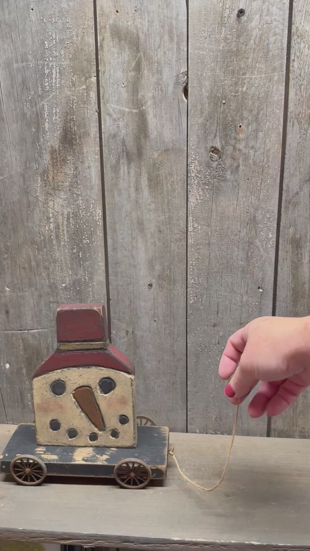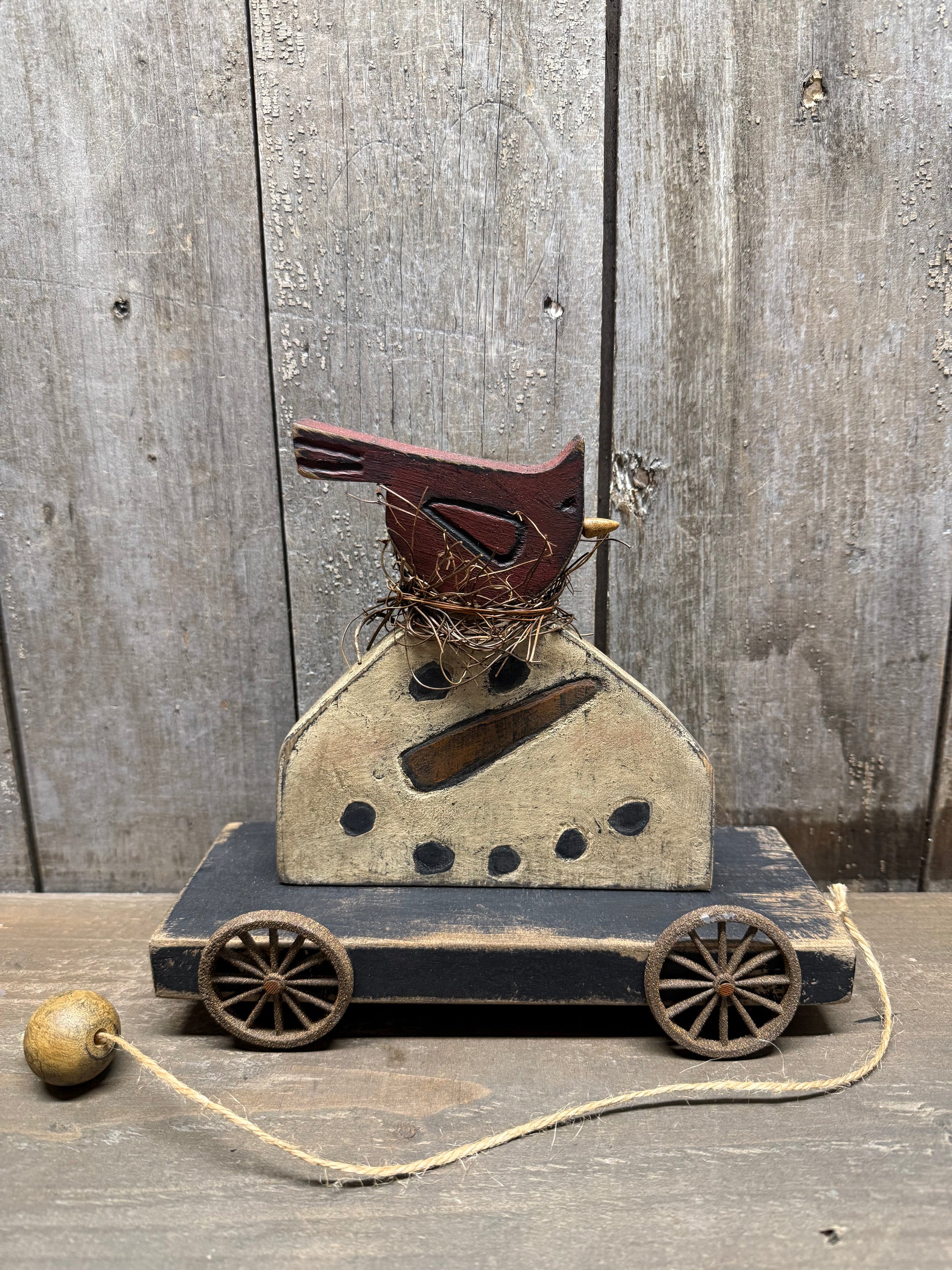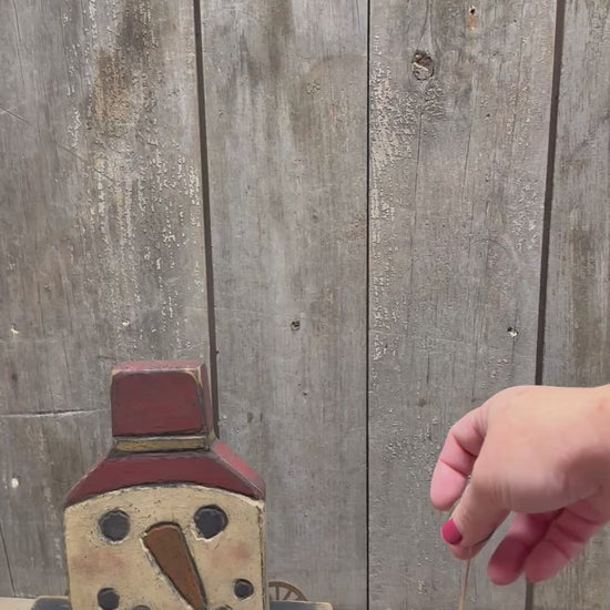 A LVP Original. Our hand crafted Pull Carts are designed for our love of old toys and folk art. Our 3.25"x 8" carts are made from pine we textured and distressed to give it a worn "well loved" look. Our snowmen are each unique and made from pine "drops" we carved and then painted. We reuse and reclaim what we can. The wheel are distressed with rusty paint and hand crafted in Maine as is the ball on the end of the "pull." The front side of the snowmen are carved but the back sides are painted. Signed by the LVP artists. Decorative use only...NOT A TOY!