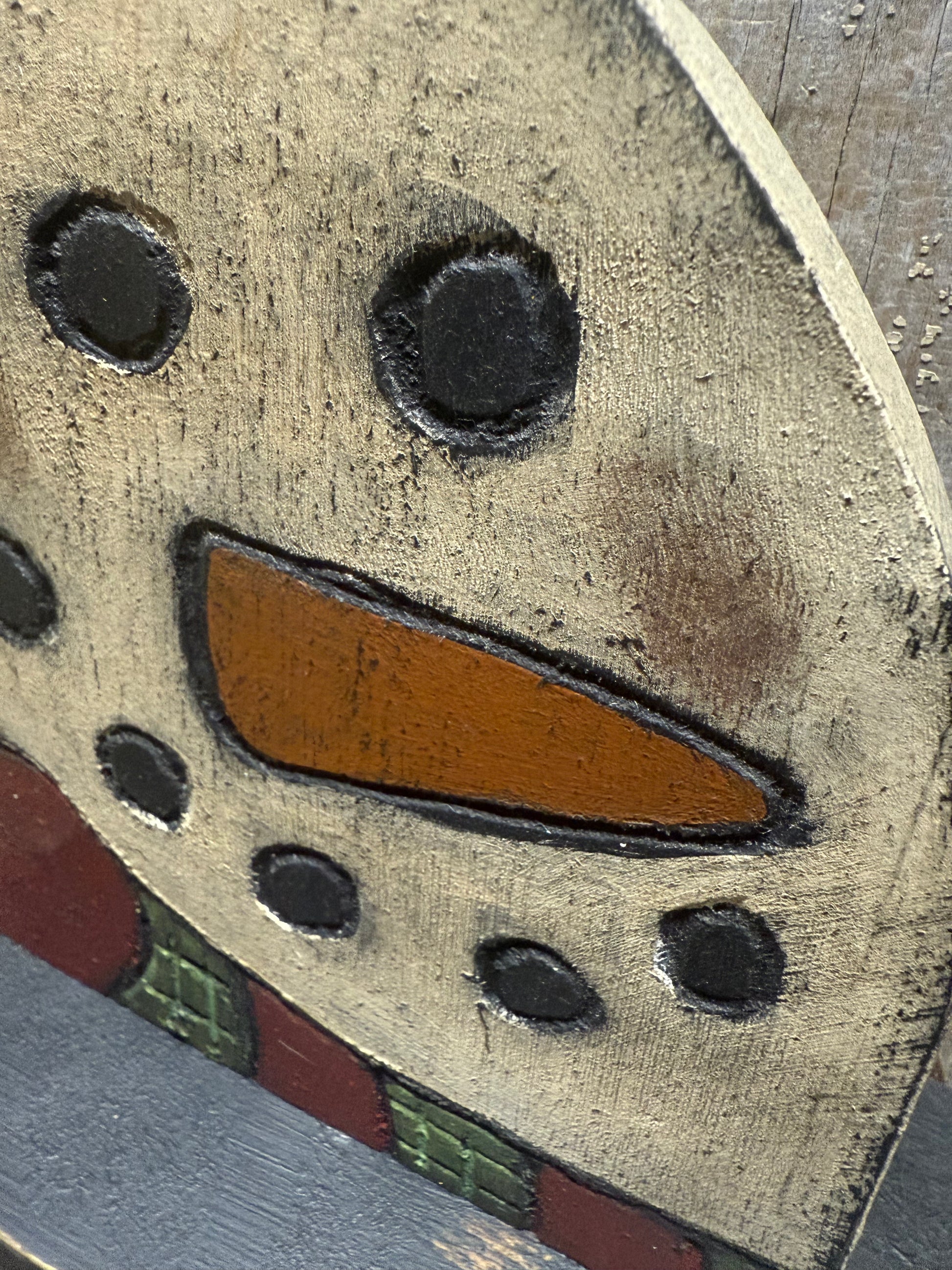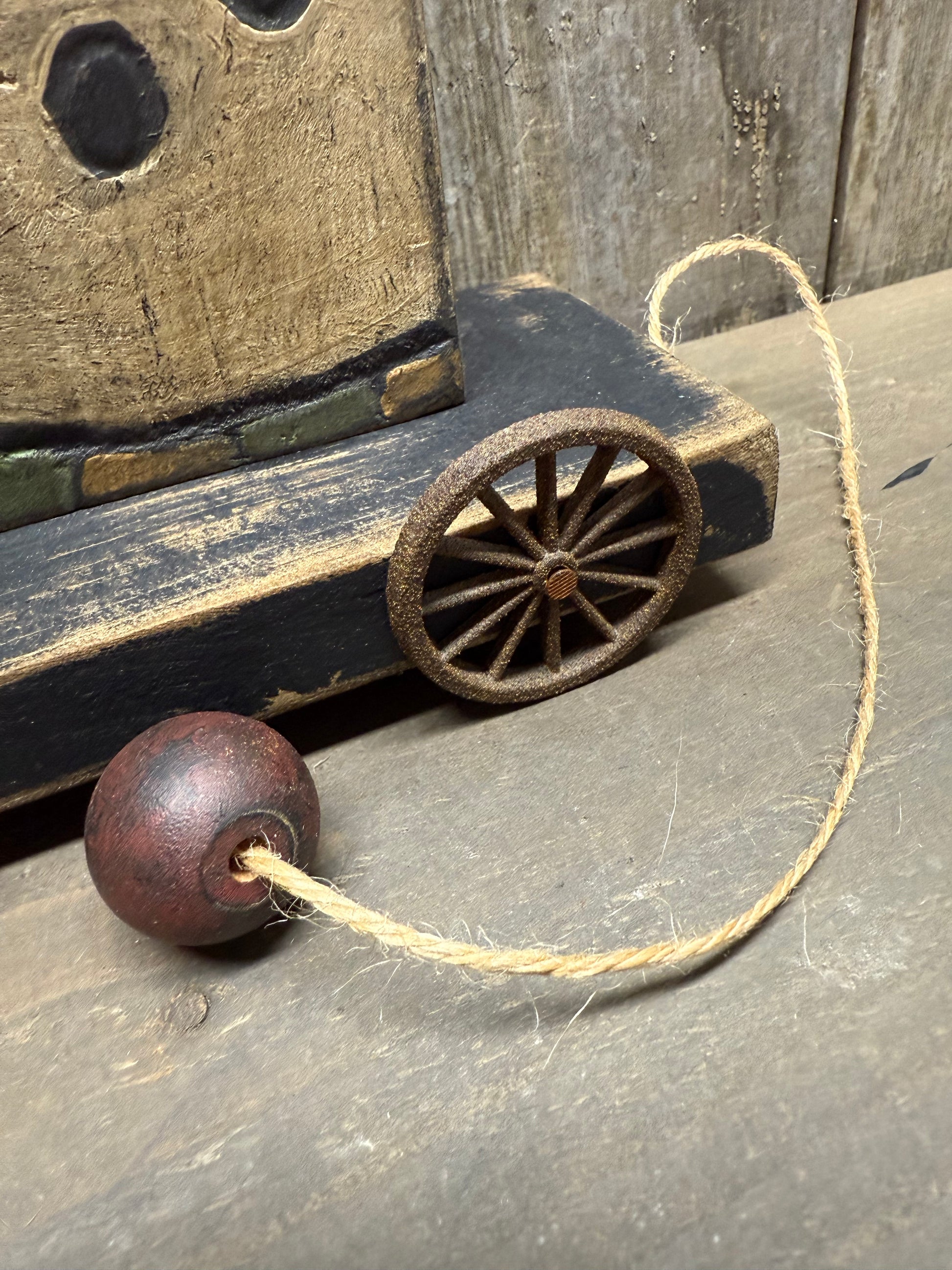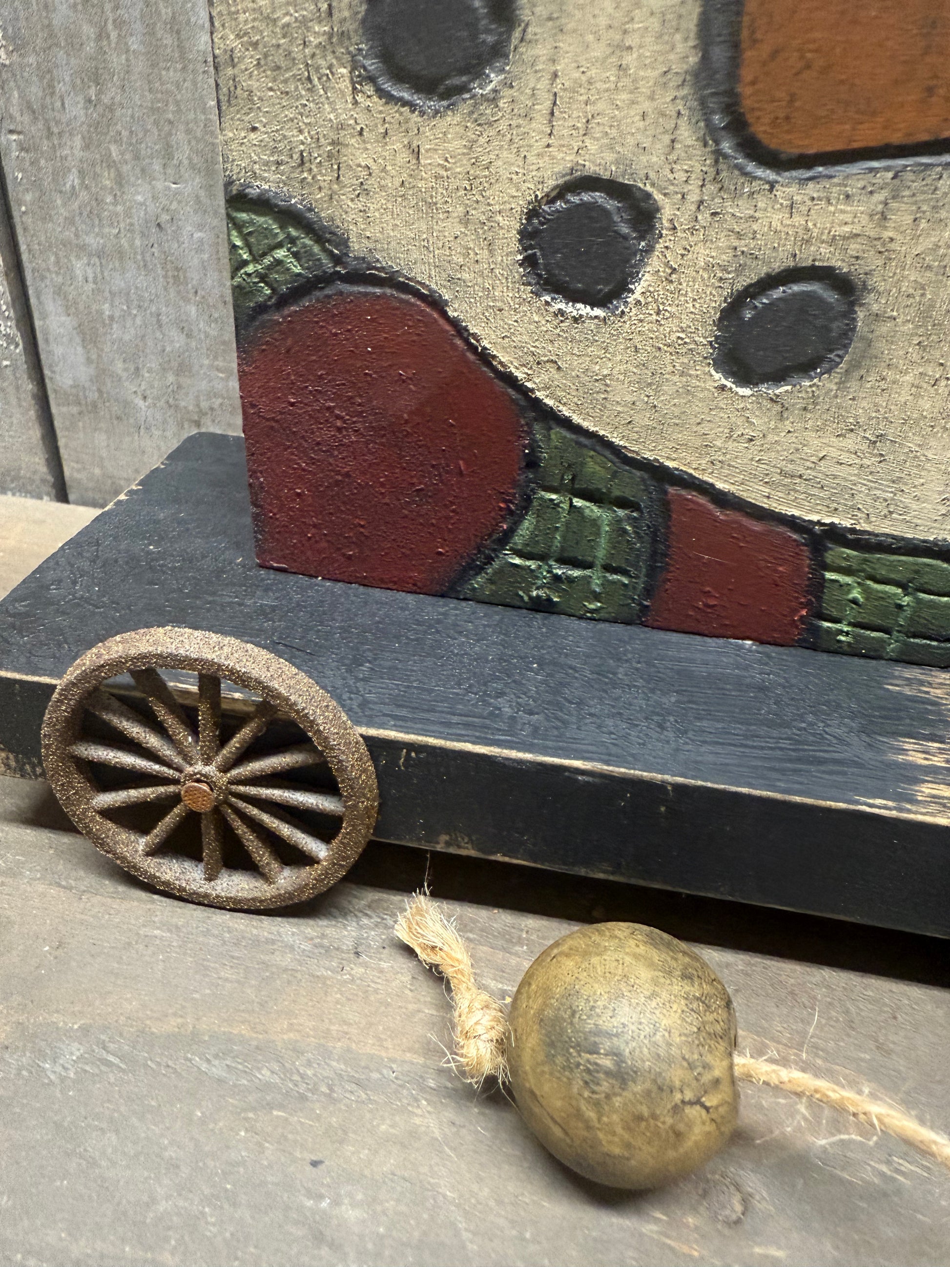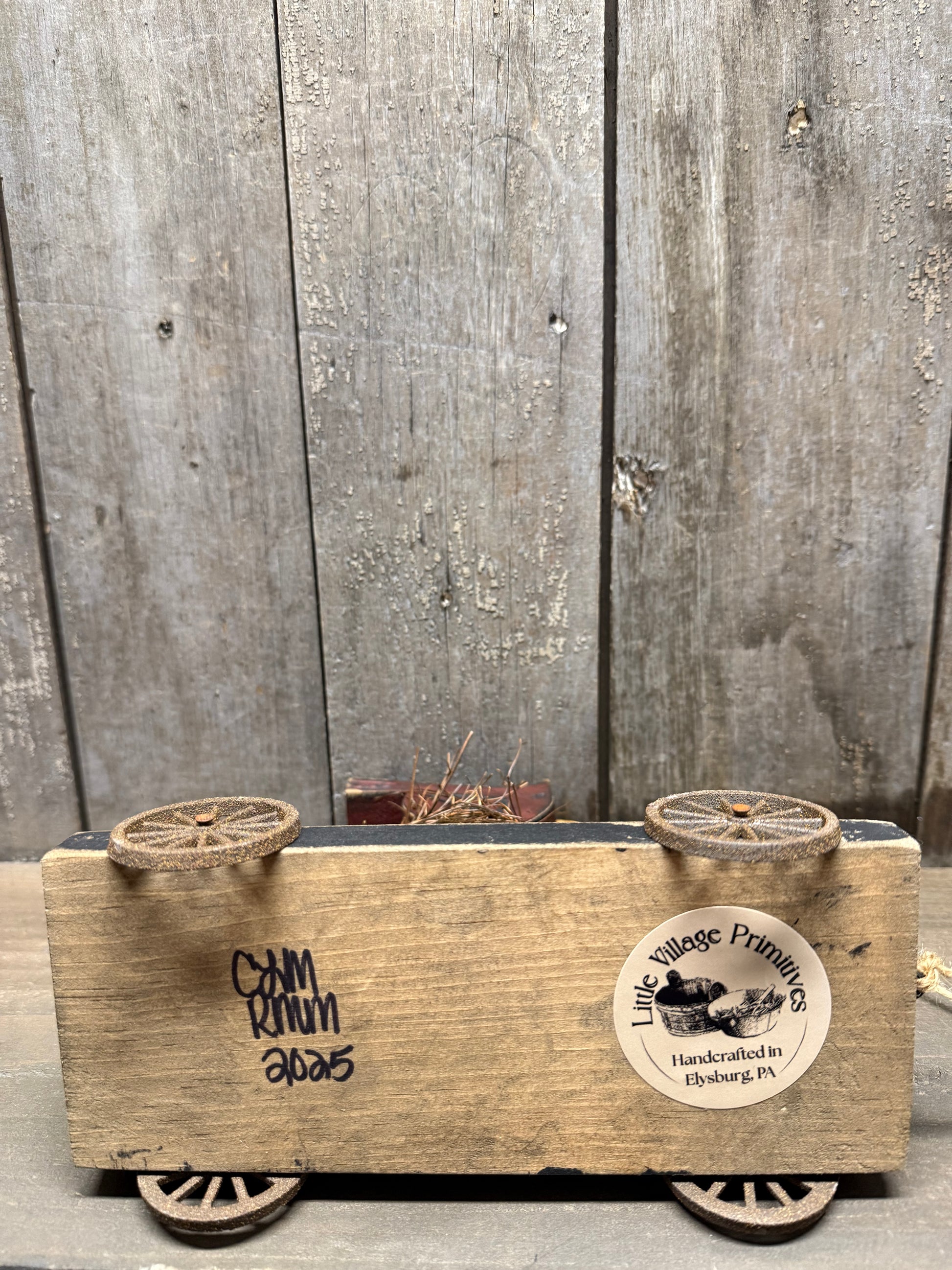 A LVP Original. Our hand crafted Pull Carts are designed for our love of old toys and folk art. Our 3.25"x 8" carts are made from pine we textured and distressed to give it a worn "well loved" look. Our snowmen are each unique and made from pine "drops" we carved and then painted. We reuse and reclaim what we can. The wheel are distressed with rusty paint and hand crafted in Maine as is the ball on the end of the "pull." The front side of the snowmen are carved but the back sides are painted. Signed by the LVP artists. Decorative use only...NOT A TOY!
