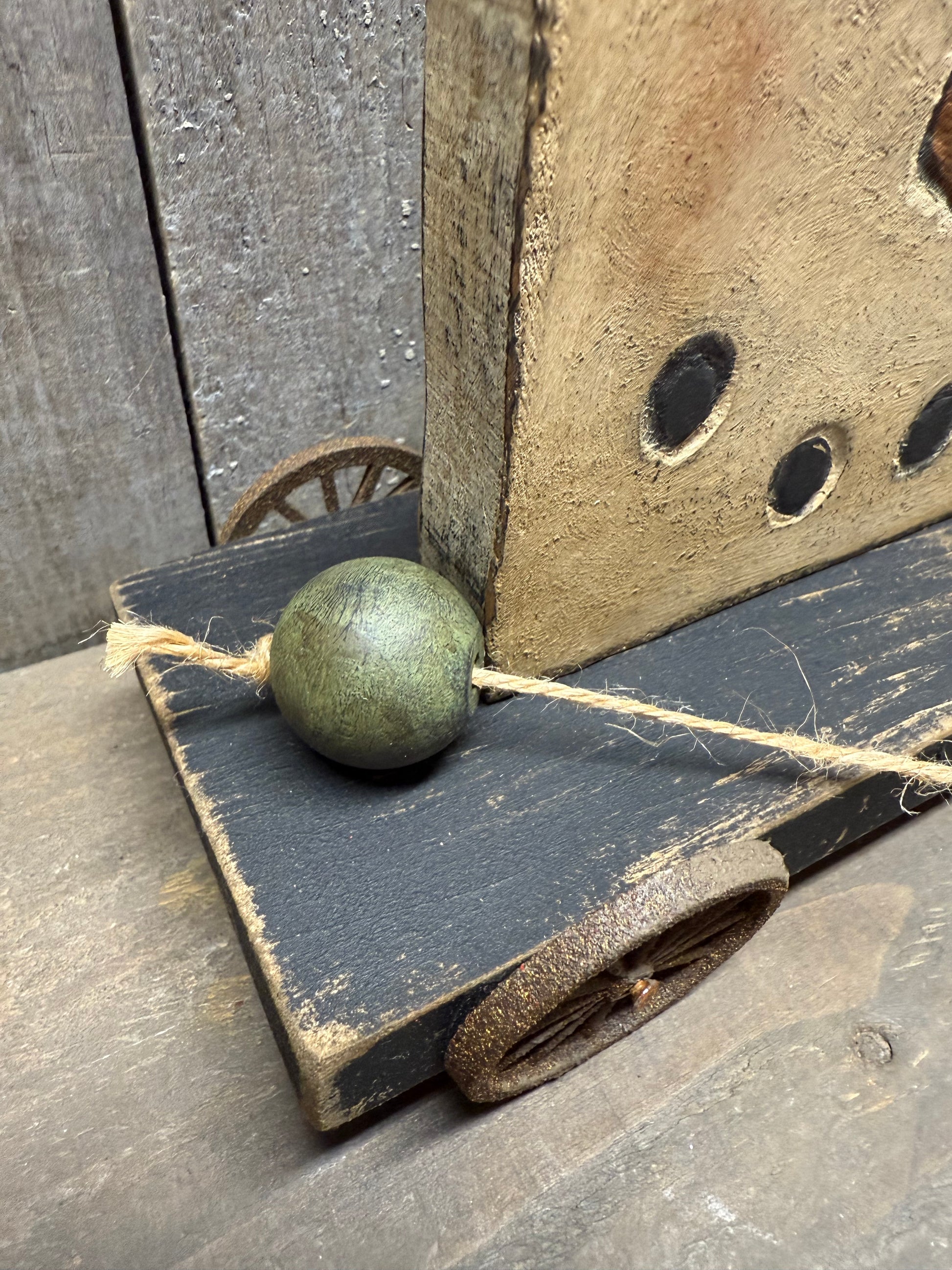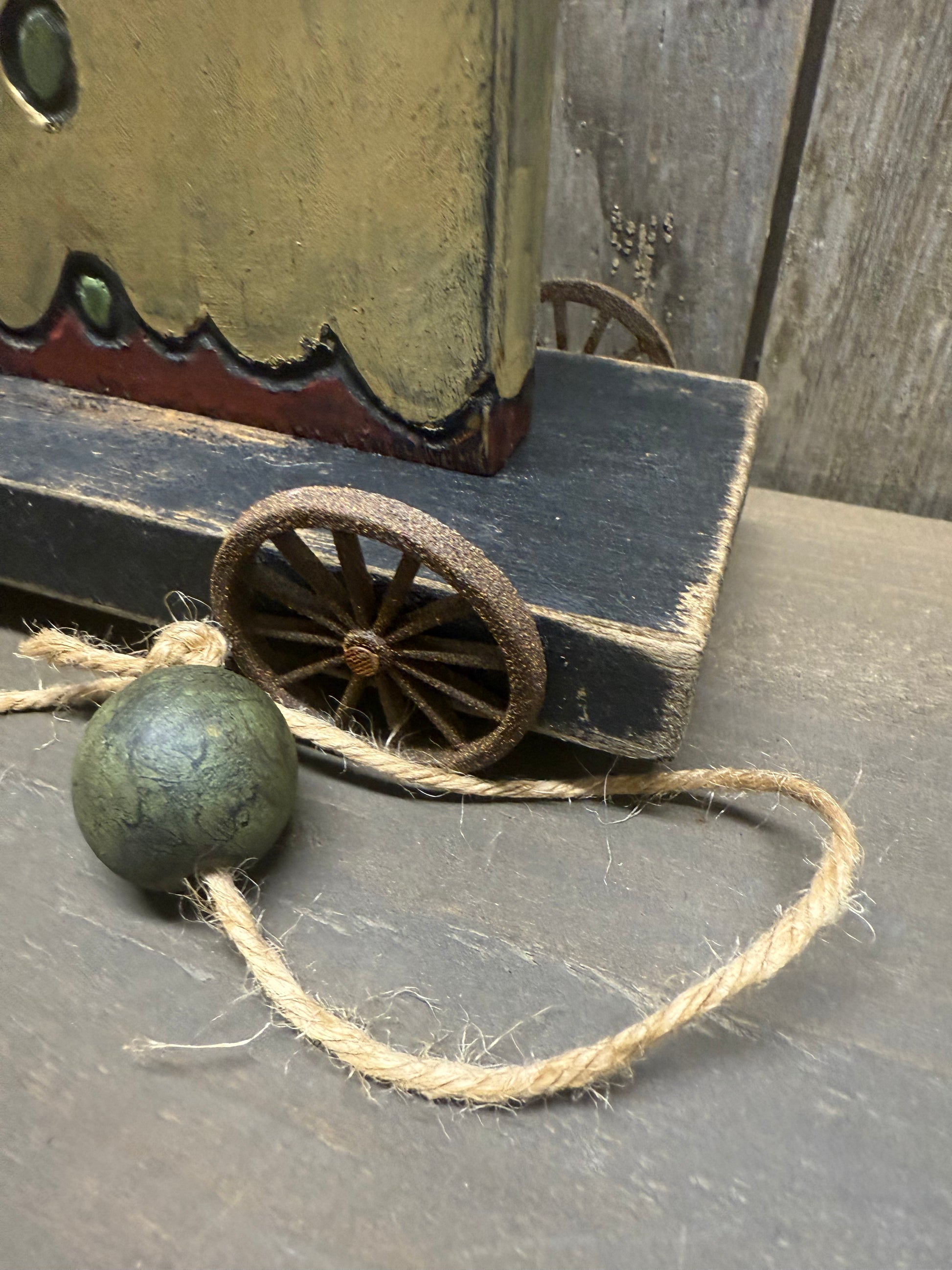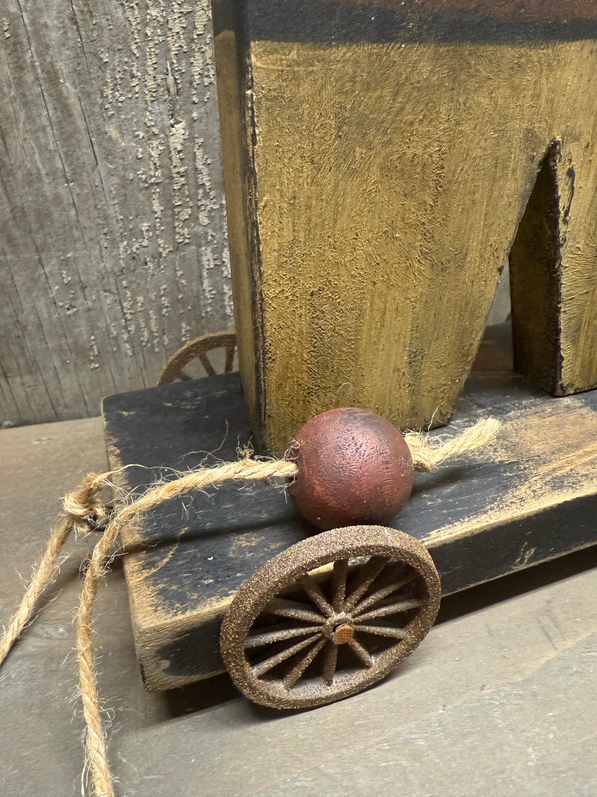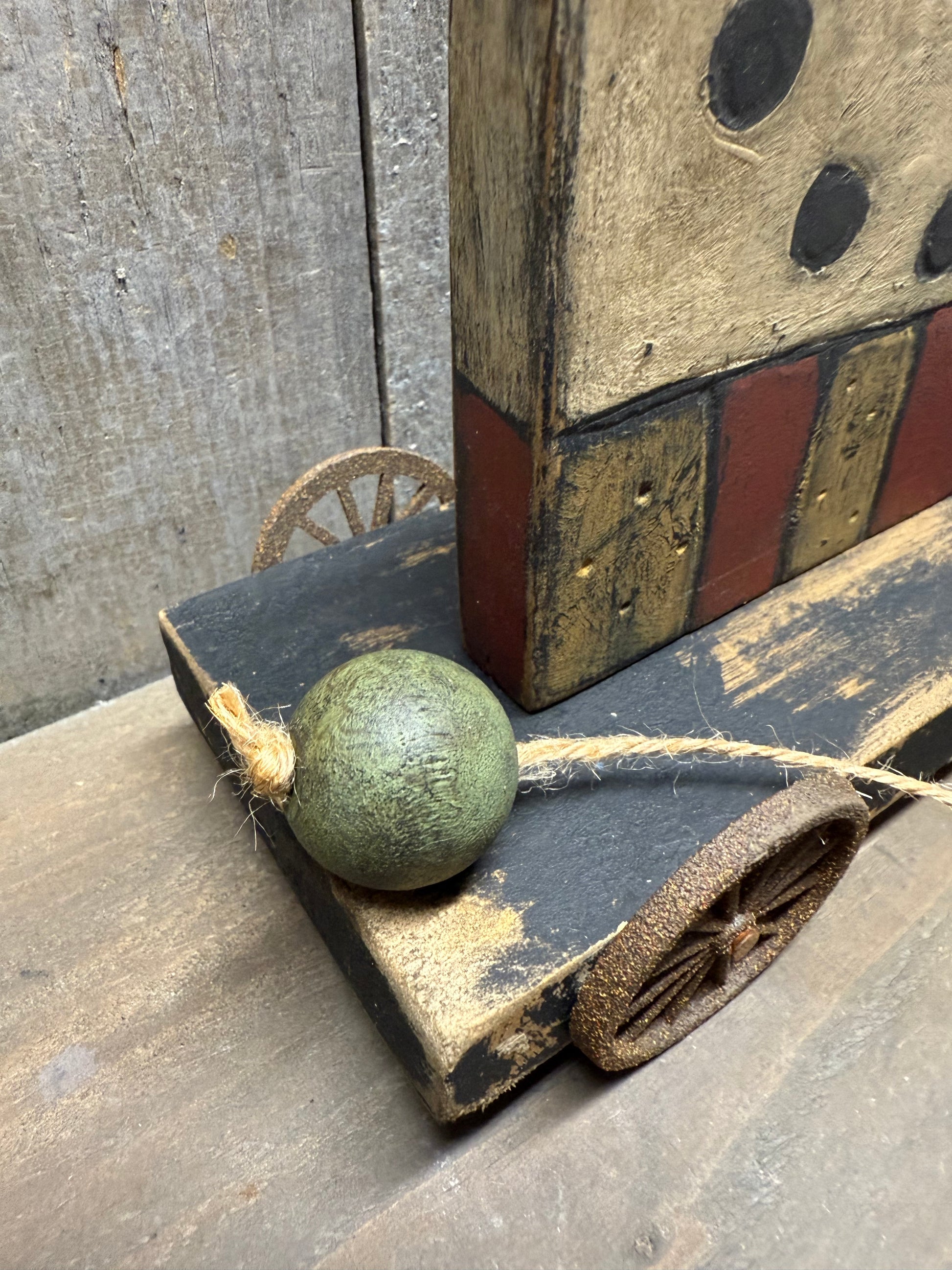 A LVP Original. Our hand crafted Pull Carts are designed for our love of old toys and folk art. Our 3.25"x 8" carts are made from pine we textured and distressed to give it a worn "well loved" look. Our snowmen are each unique and made from pine "drops" we carved and then painted. We reuse and reclaim what we can. The wheel are distressed with rusty paint and hand crafted in Maine as is the ball on the end of the "pull." The front side of the snowmen are carved but the back sides are painted. Signed by the LVP artists. Decorative use only...NOT A TOY!