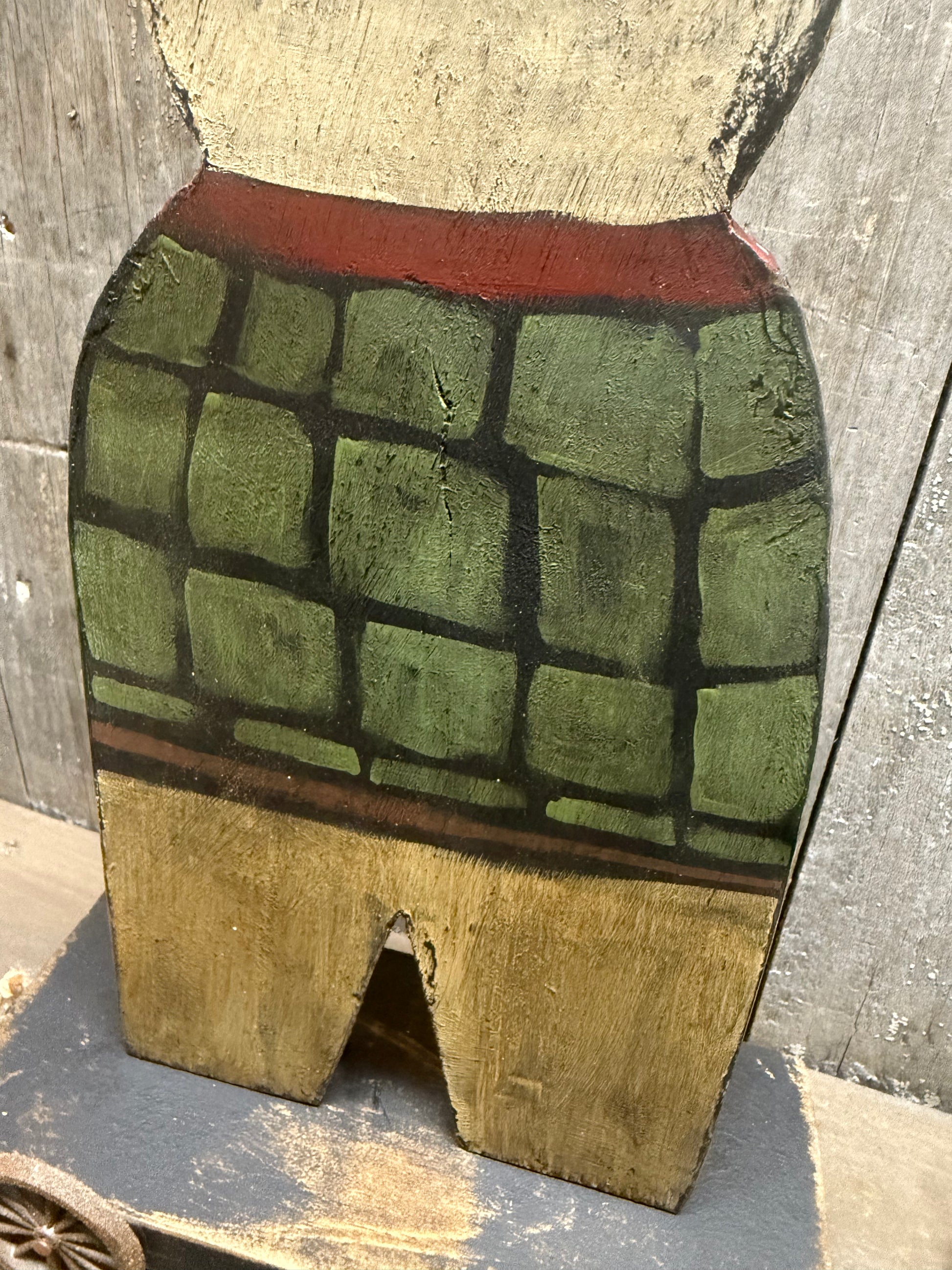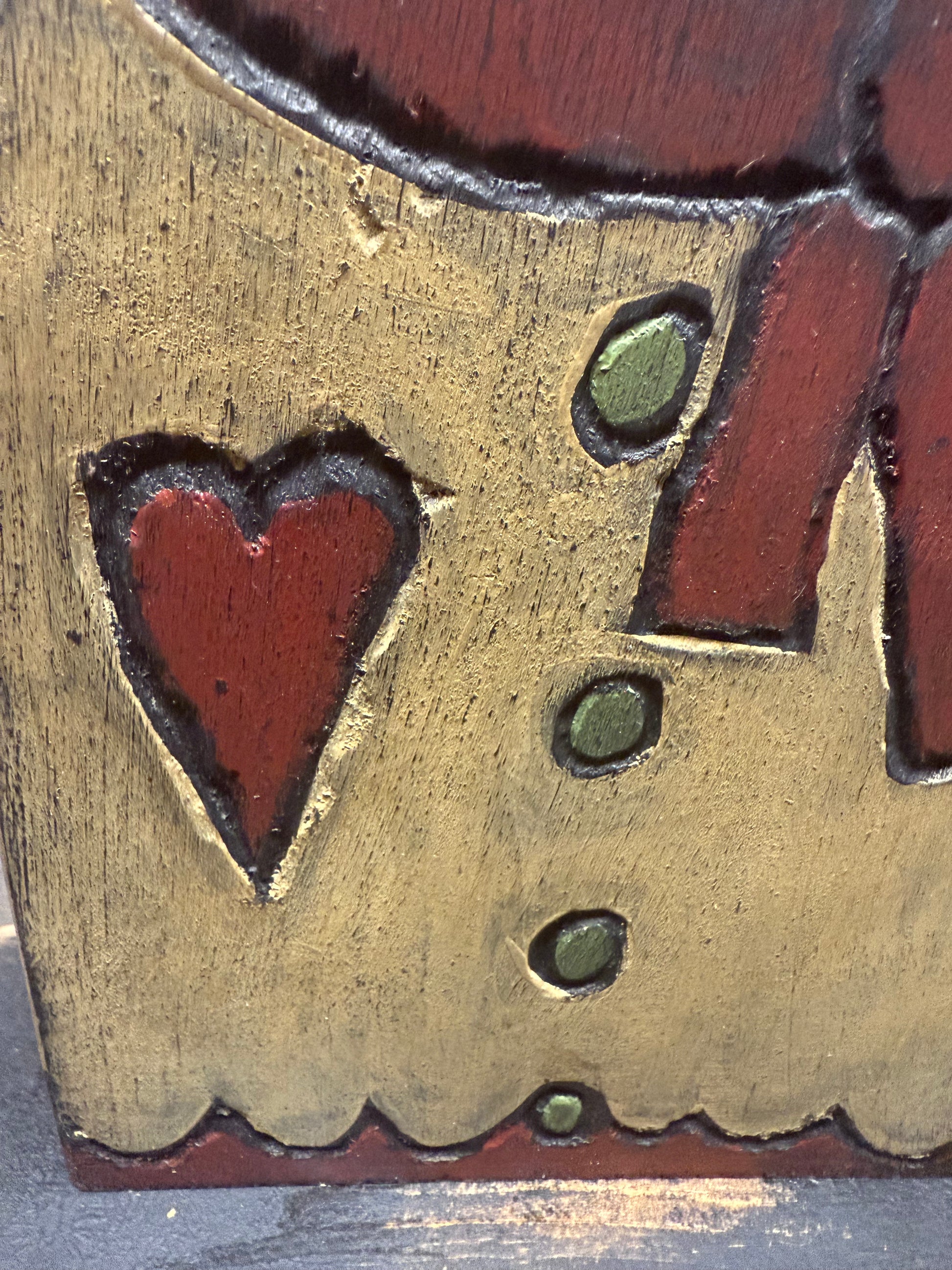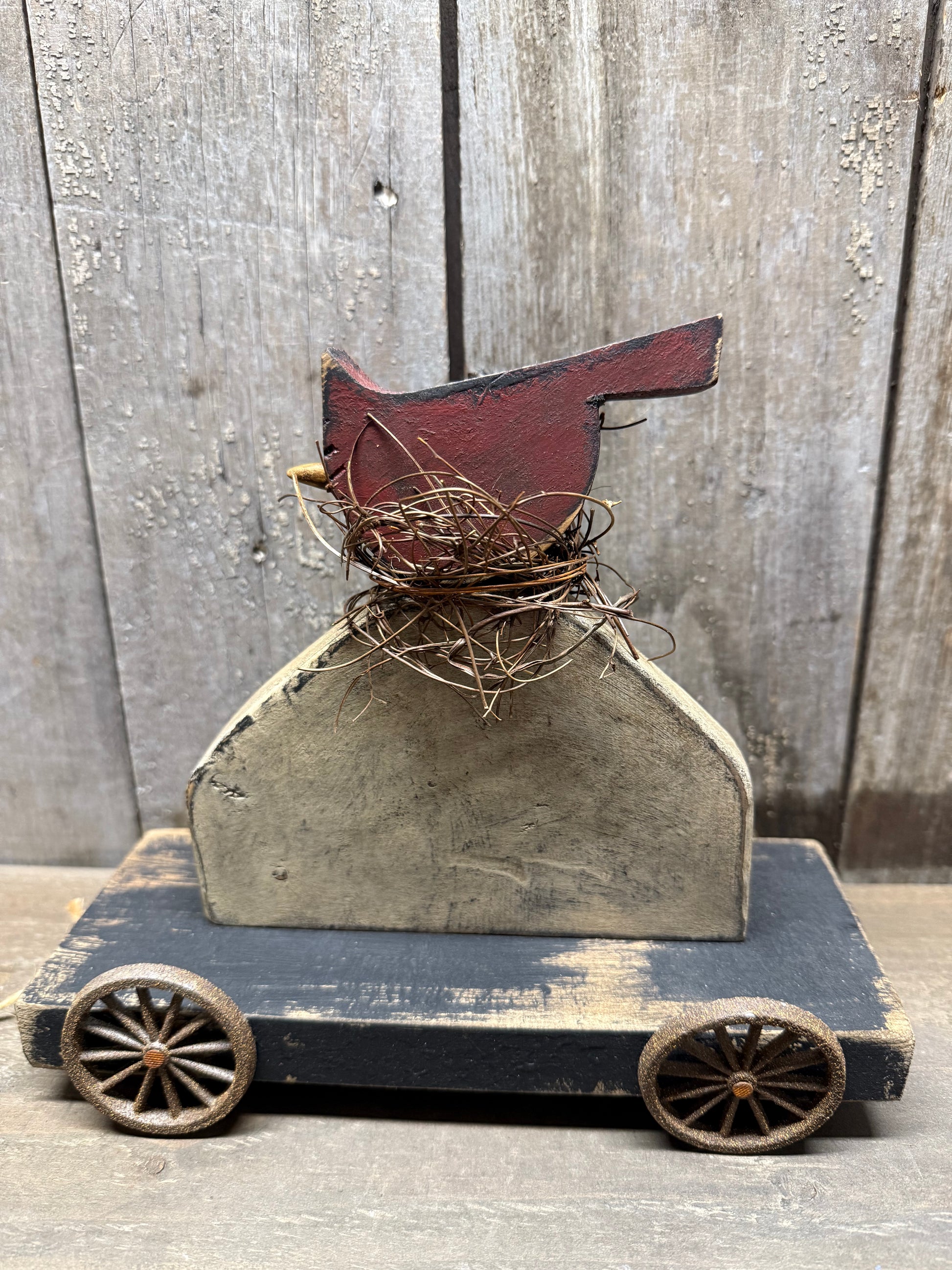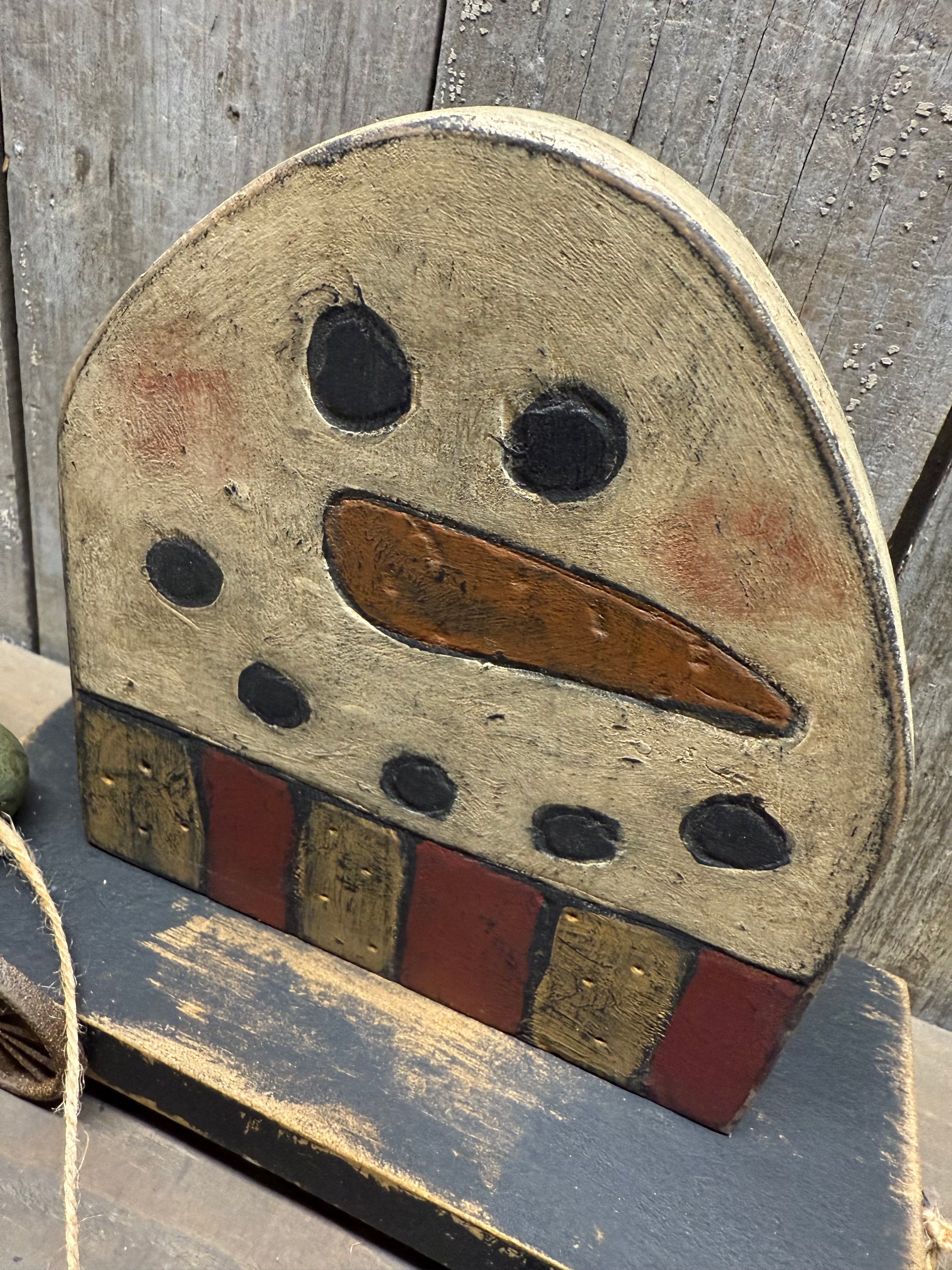 A LVP Original. Our hand crafted Pull Carts are designed for our love of old toys and folk art. Our 3.25"x 8" carts are made from pine we textured and distressed to give it a worn "well loved" look. Our snowmen are each unique and made from pine "drops" we carved and then painted. We reuse and reclaim what we can. The wheel are distressed with rusty paint and hand crafted in Maine as is the ball on the end of the "pull." The front side of the snowmen are carved but the back sides are painted. Signed by the LVP artists. Decorative use only...NOT A TOY!