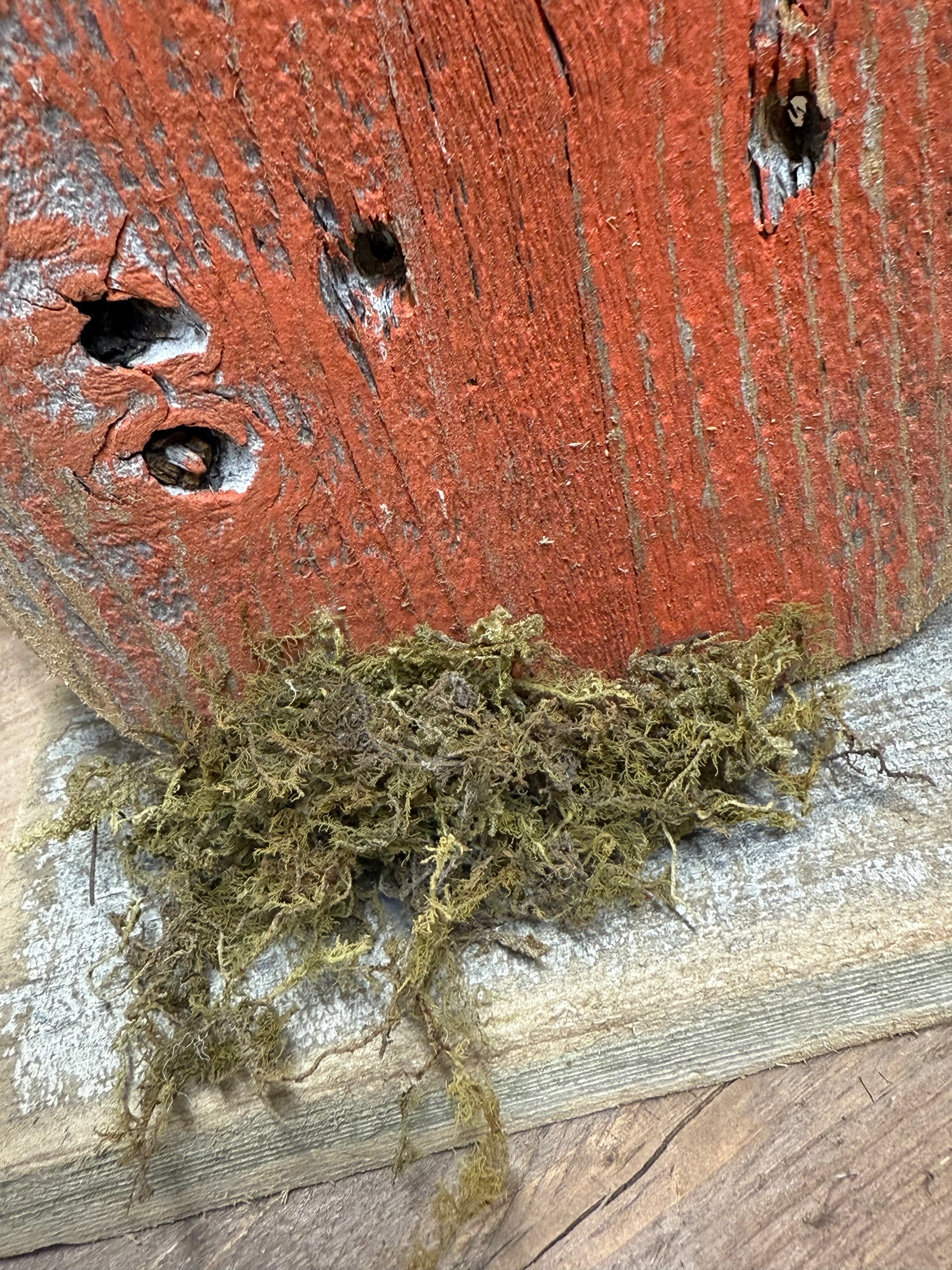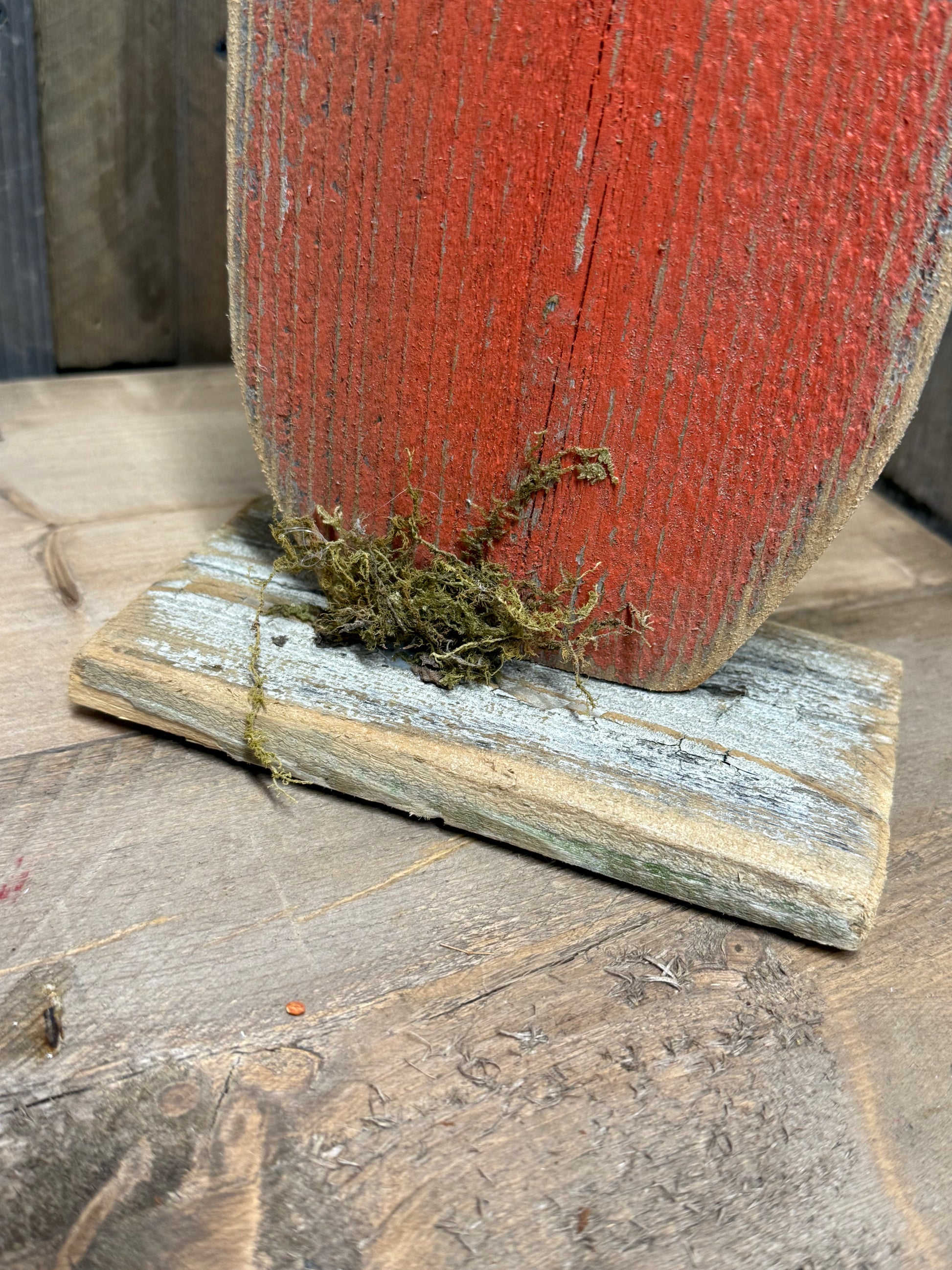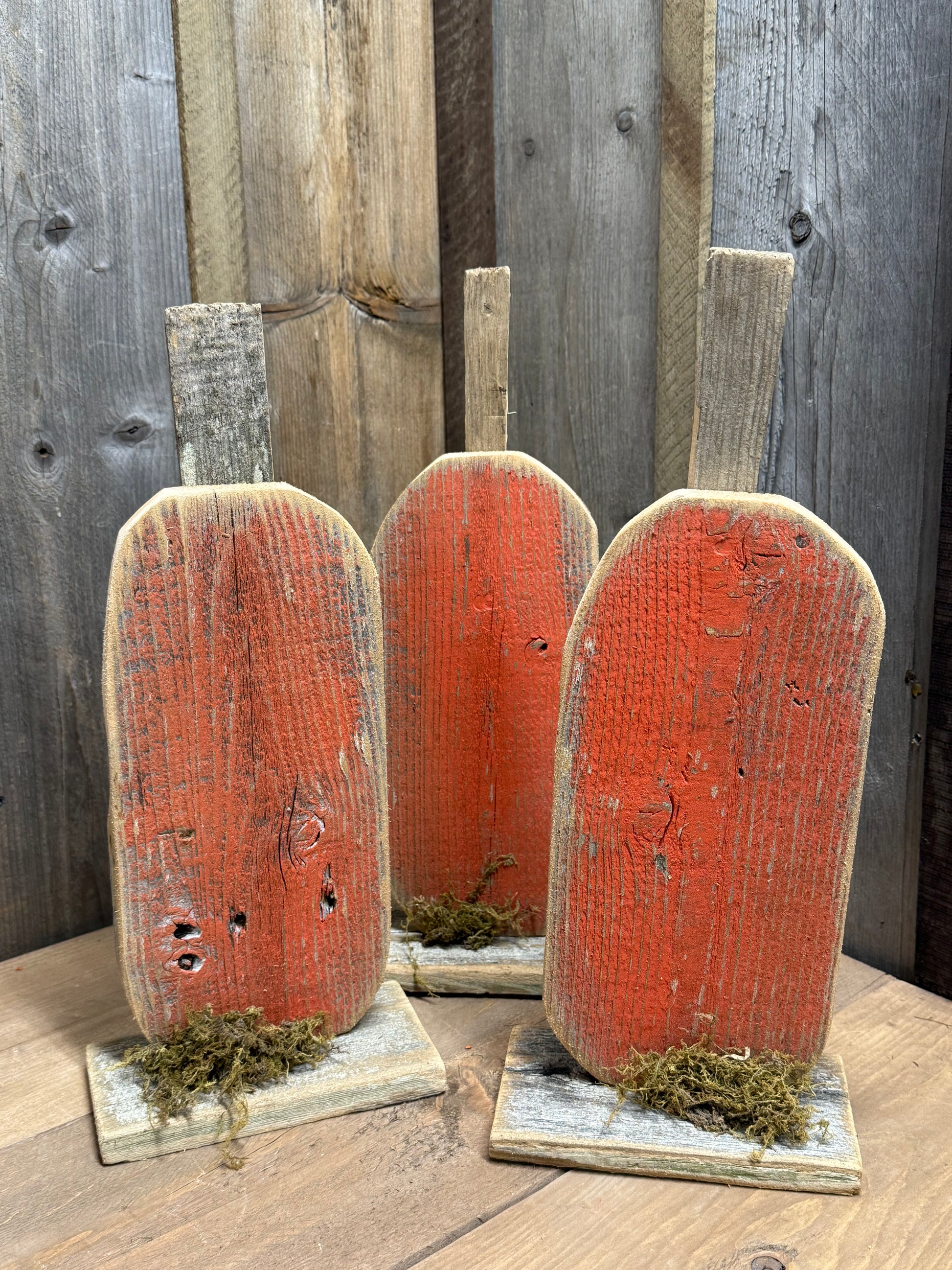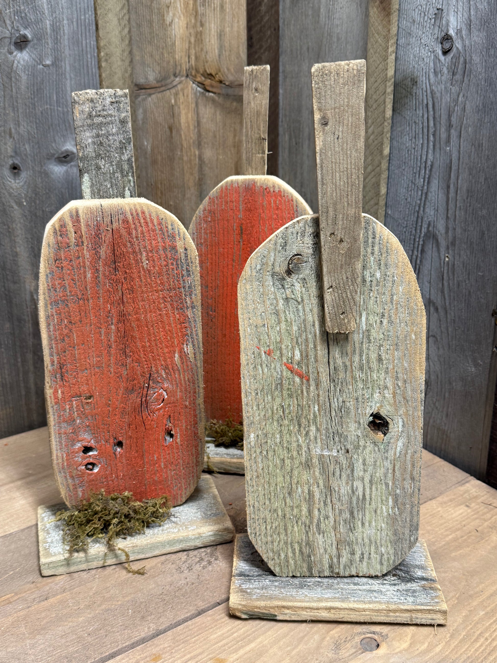 Made from reclaimed wood, our Pumpkin Sitters have such a rustic primitive look. Each one is different so expect slight variations in size and the natural holes and "dings" of reused wood. A bit of moss decorates the base. You will receive ONE Pumpkin Sitter.