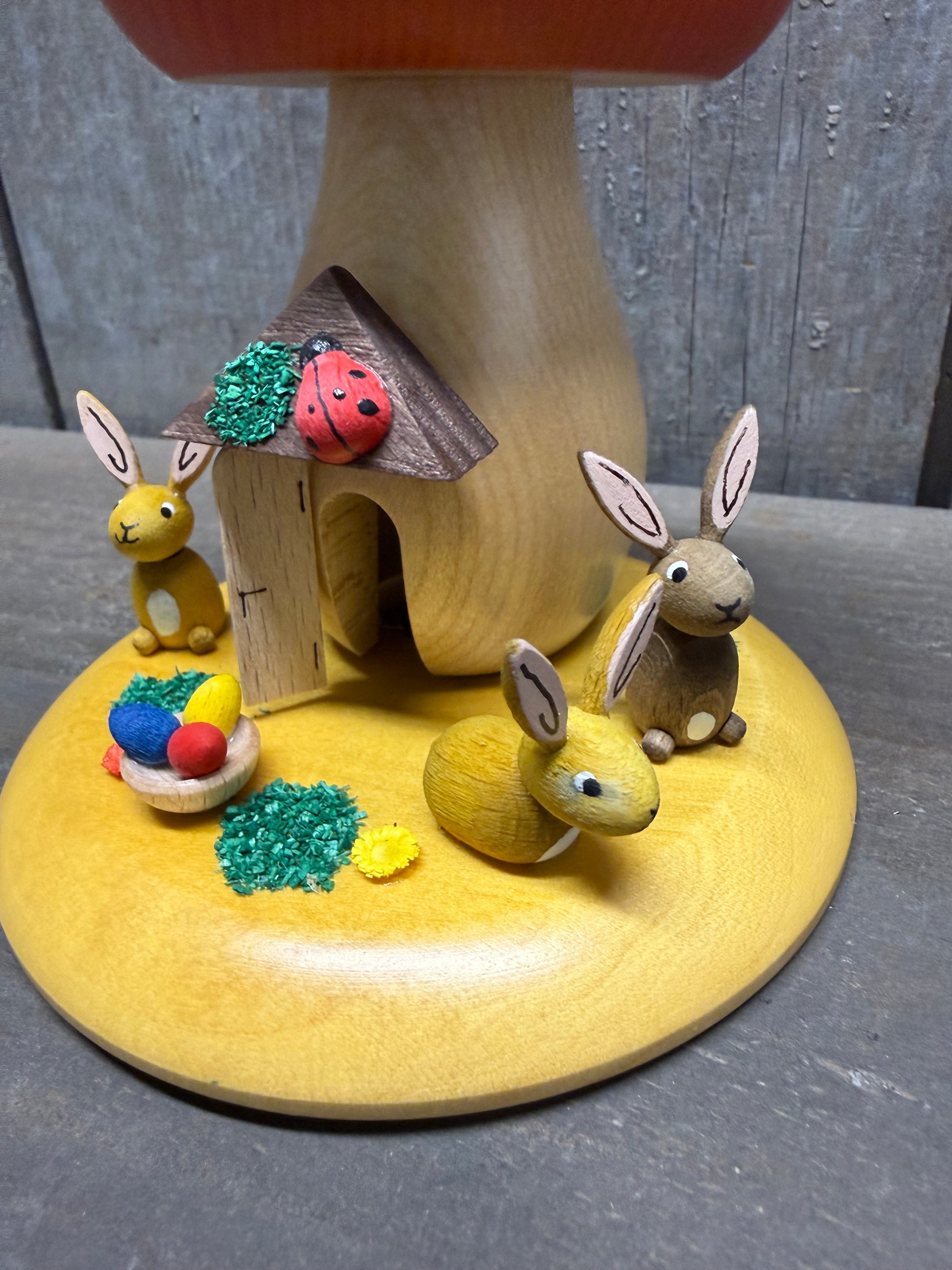 Handcrafted in Germany, the perfect addition to your collection of Folk Art or Spring decor. "Smokers" are meant to have a feature that lifts off and allows an incense cone to be lit. Once it begins "smoking" you place the top piece back on and the smoke comes out a hole, in this piece, the top of the mushroom's roof. Incense not included. Features a Mushroom Smoker, a family of bunnies and a basket of eggs. Measures 5"x 4"x 4". Handcrafted in Seiffen, Germany.