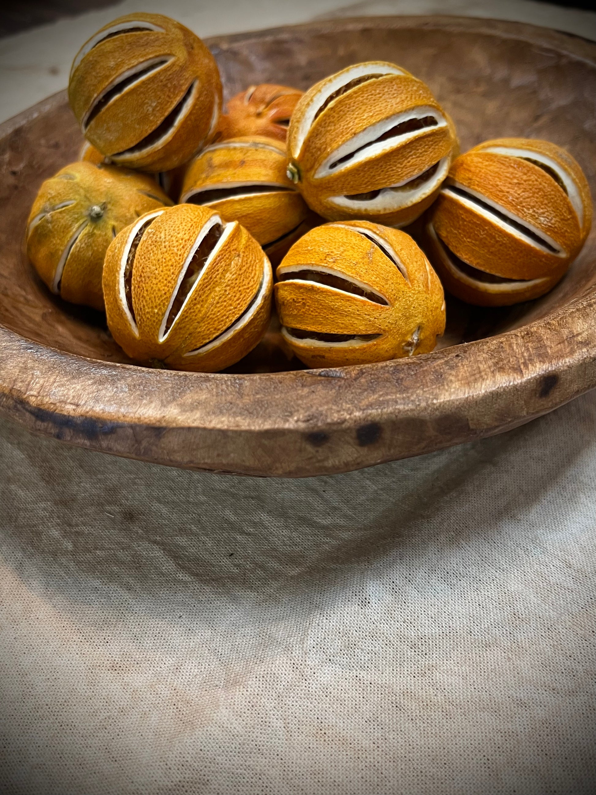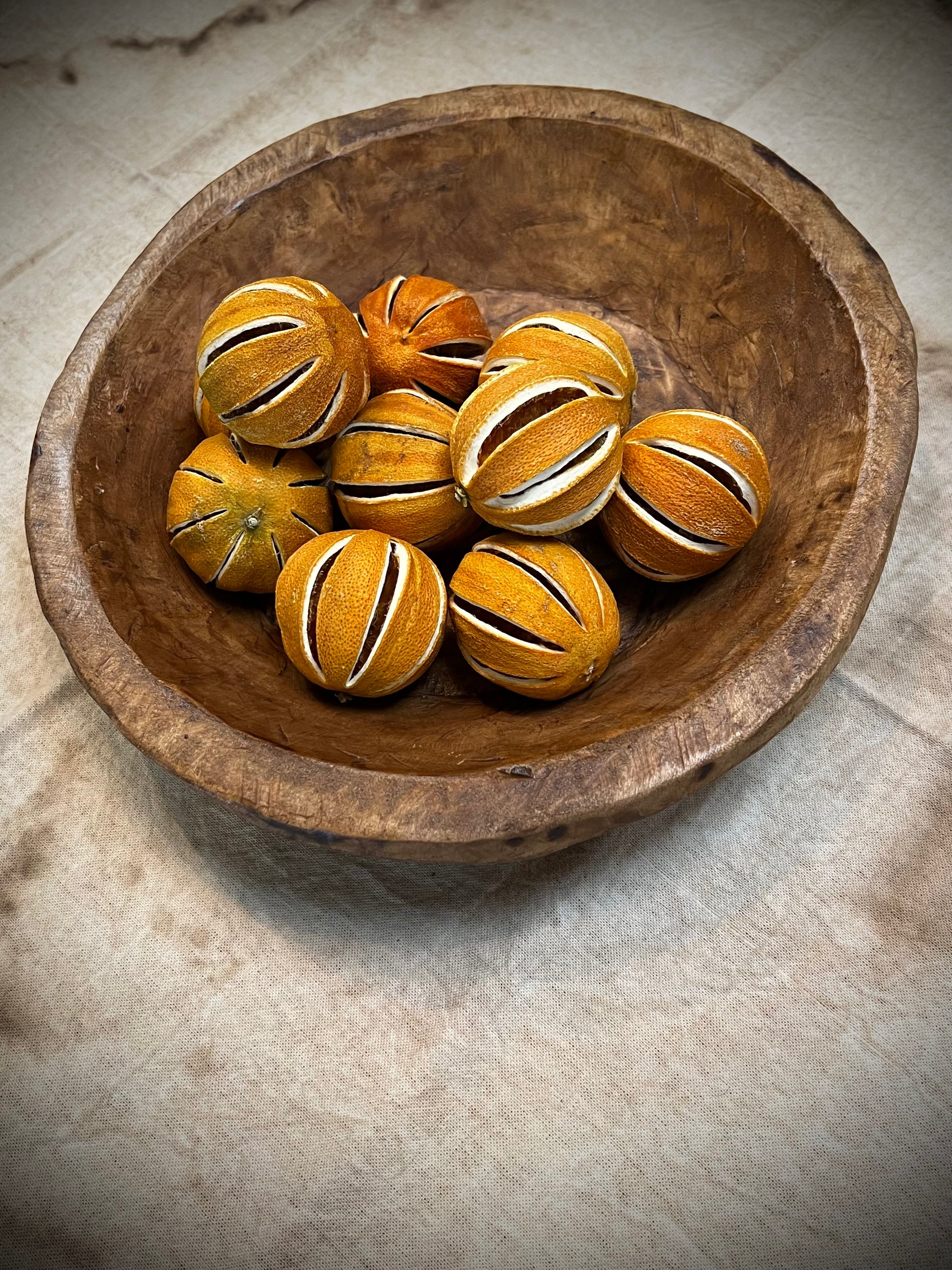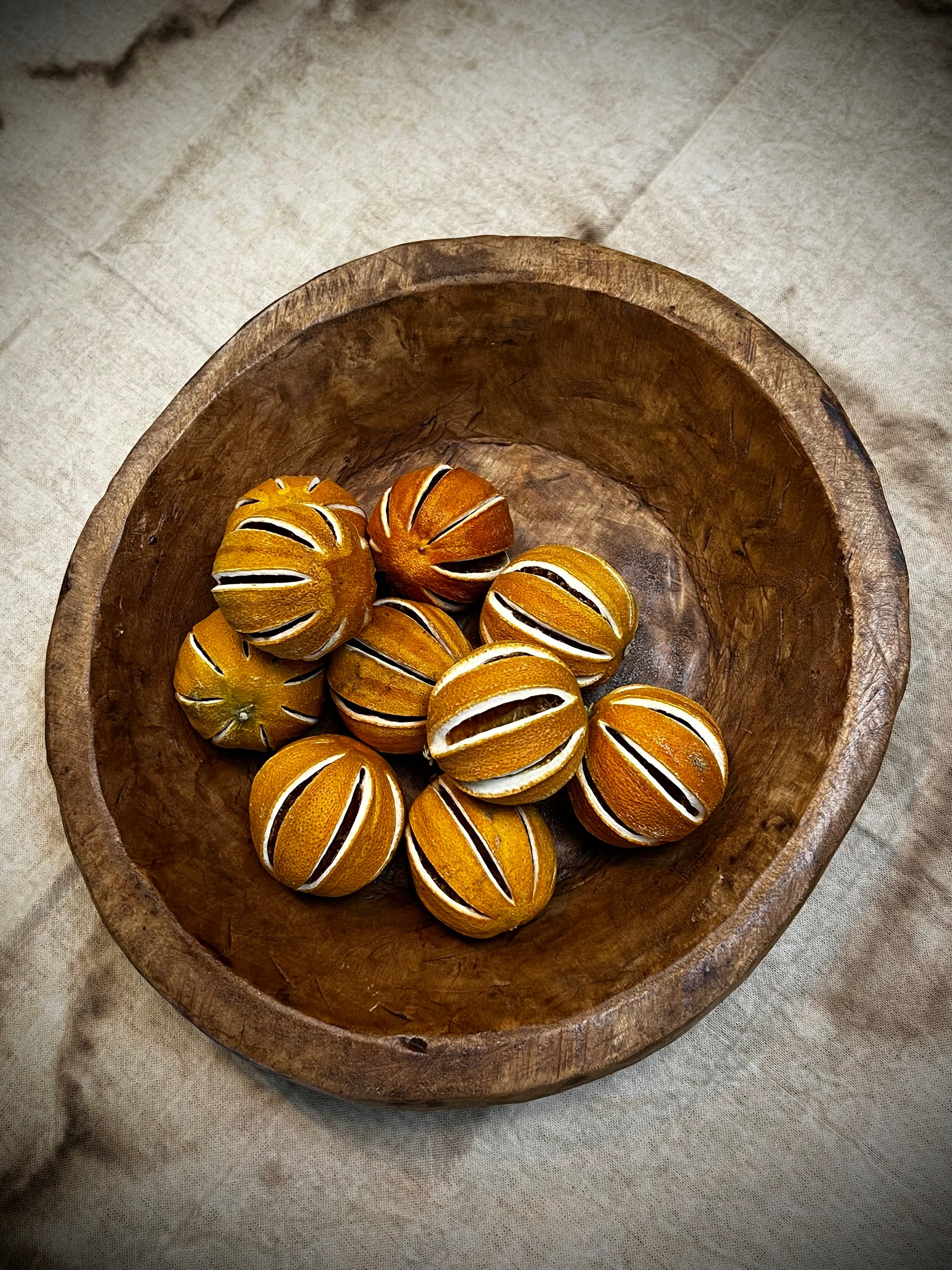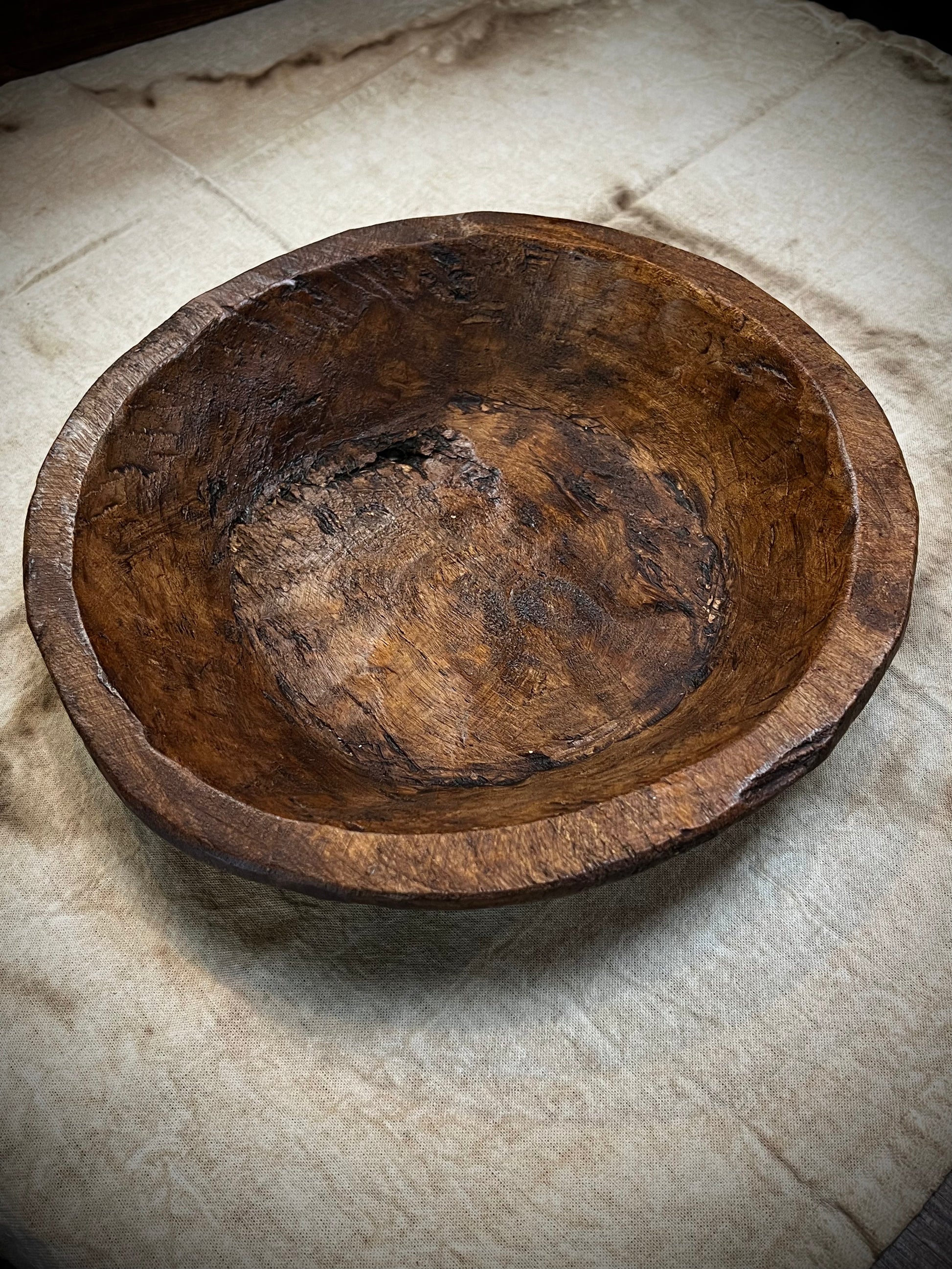 Hand-crafted from Spanish oak , our round/out of round bowl has natural variations such as knot holes, scratches, and minor cracks. This bowl adds a rustic touch to any home on its own or filled with gourds, dried oranges or greens. Measures 11.5" x 12". The size is approximate, please expect slight variations.