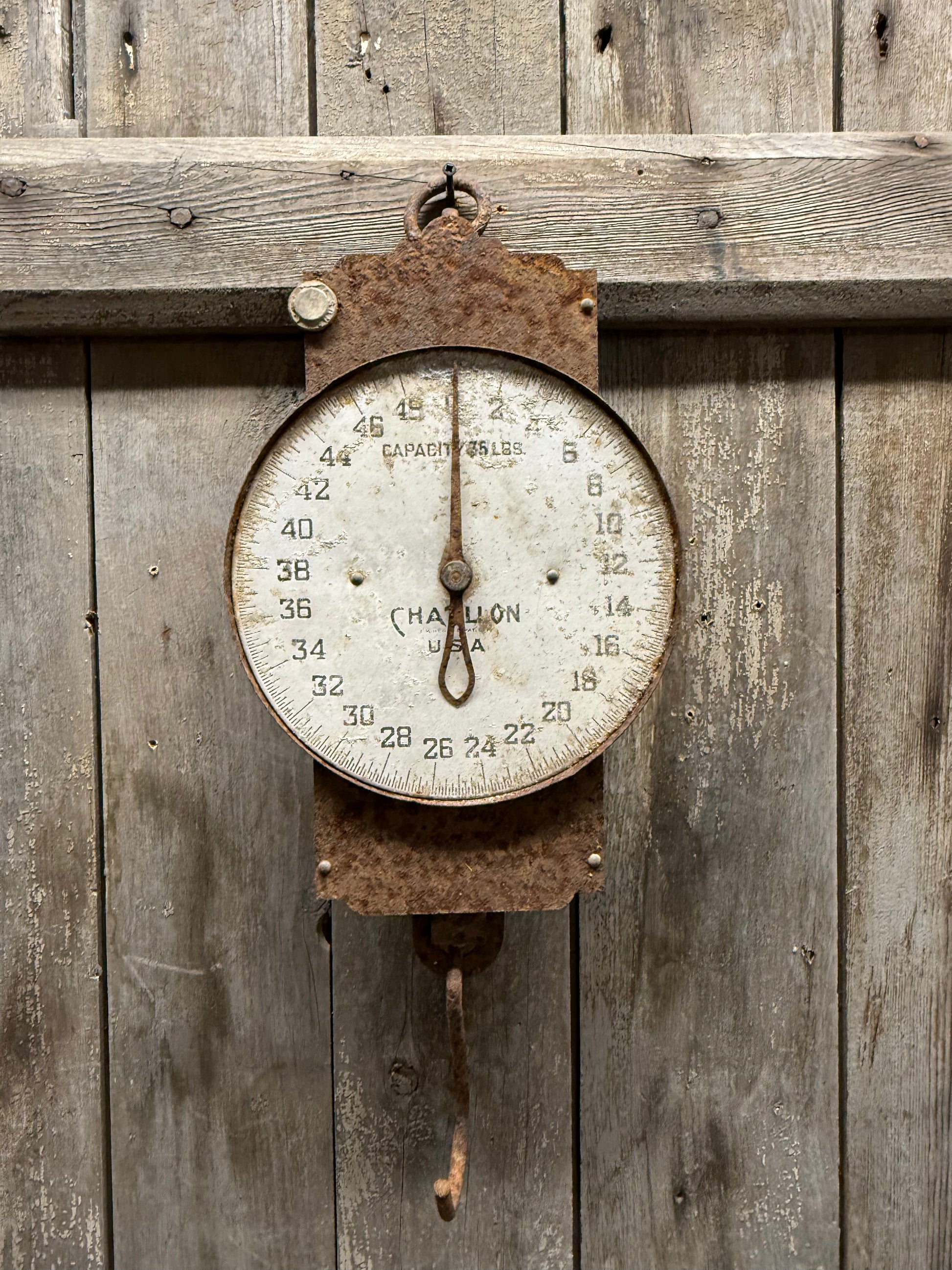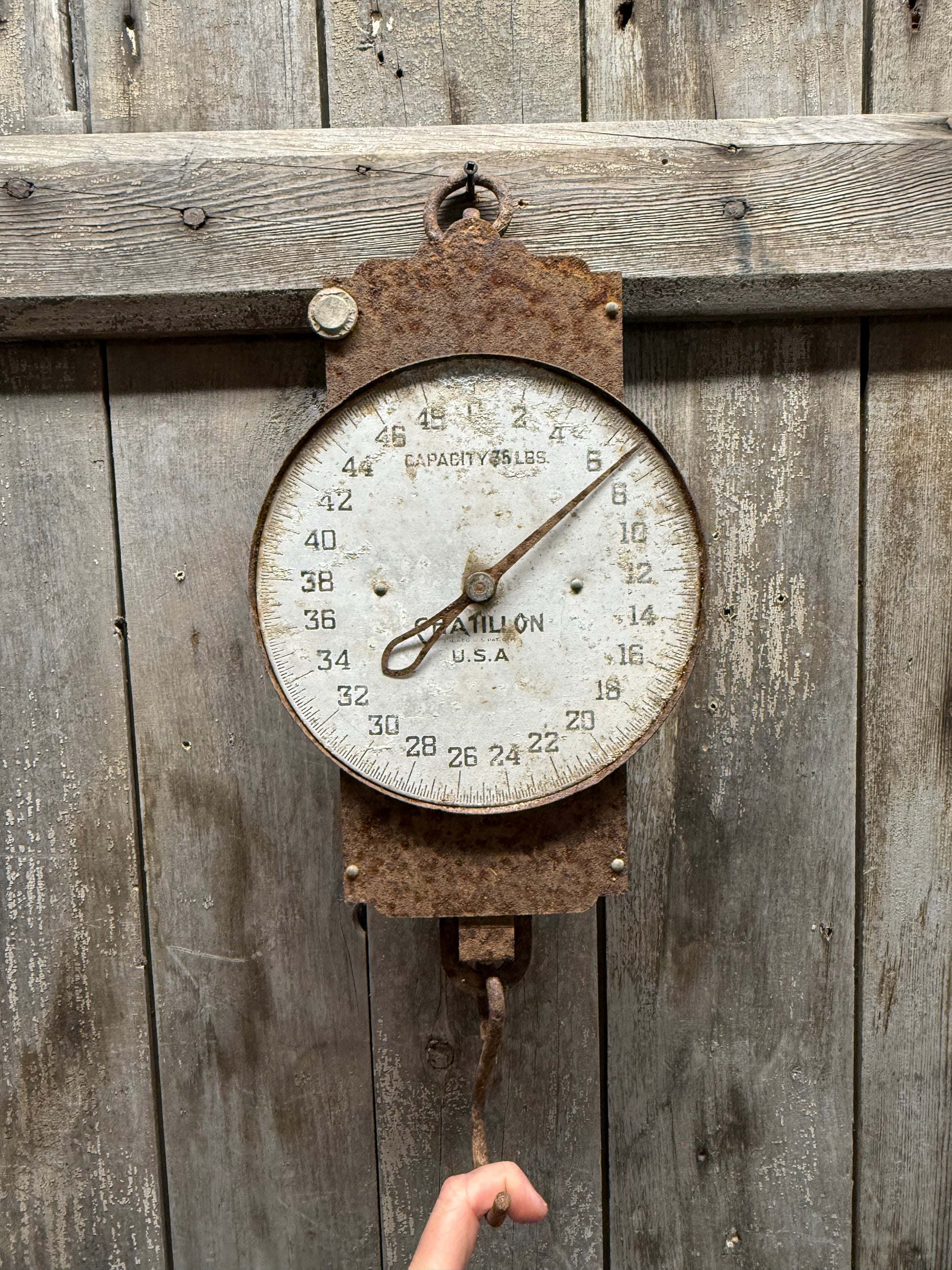 Oh this may be my favorite scale! Perfectly rusted with "make do" repairs. Hang on the porch with potted flowers, from a peg board with baskets and wreaths or anywhere you please. The rust is the best!