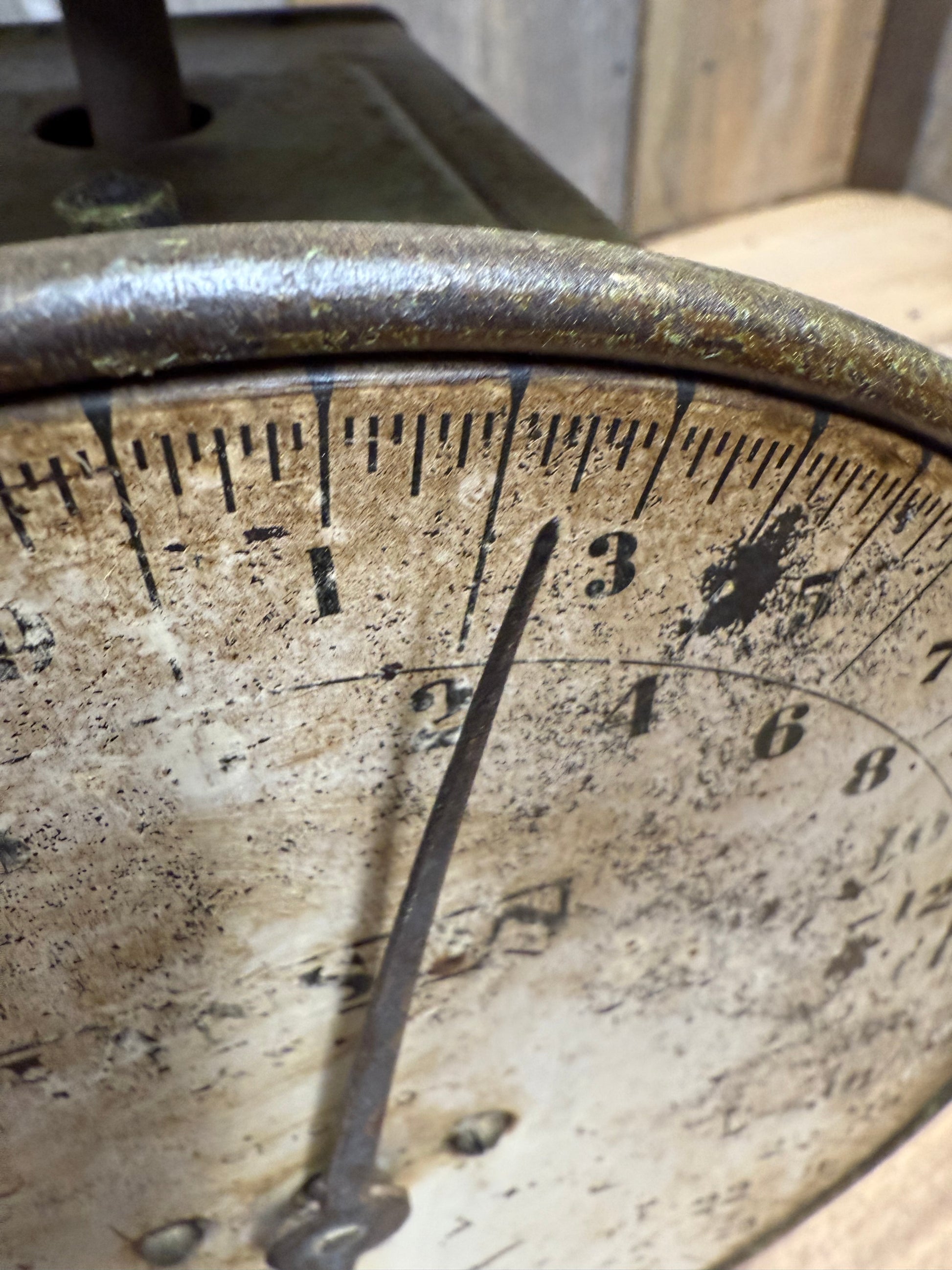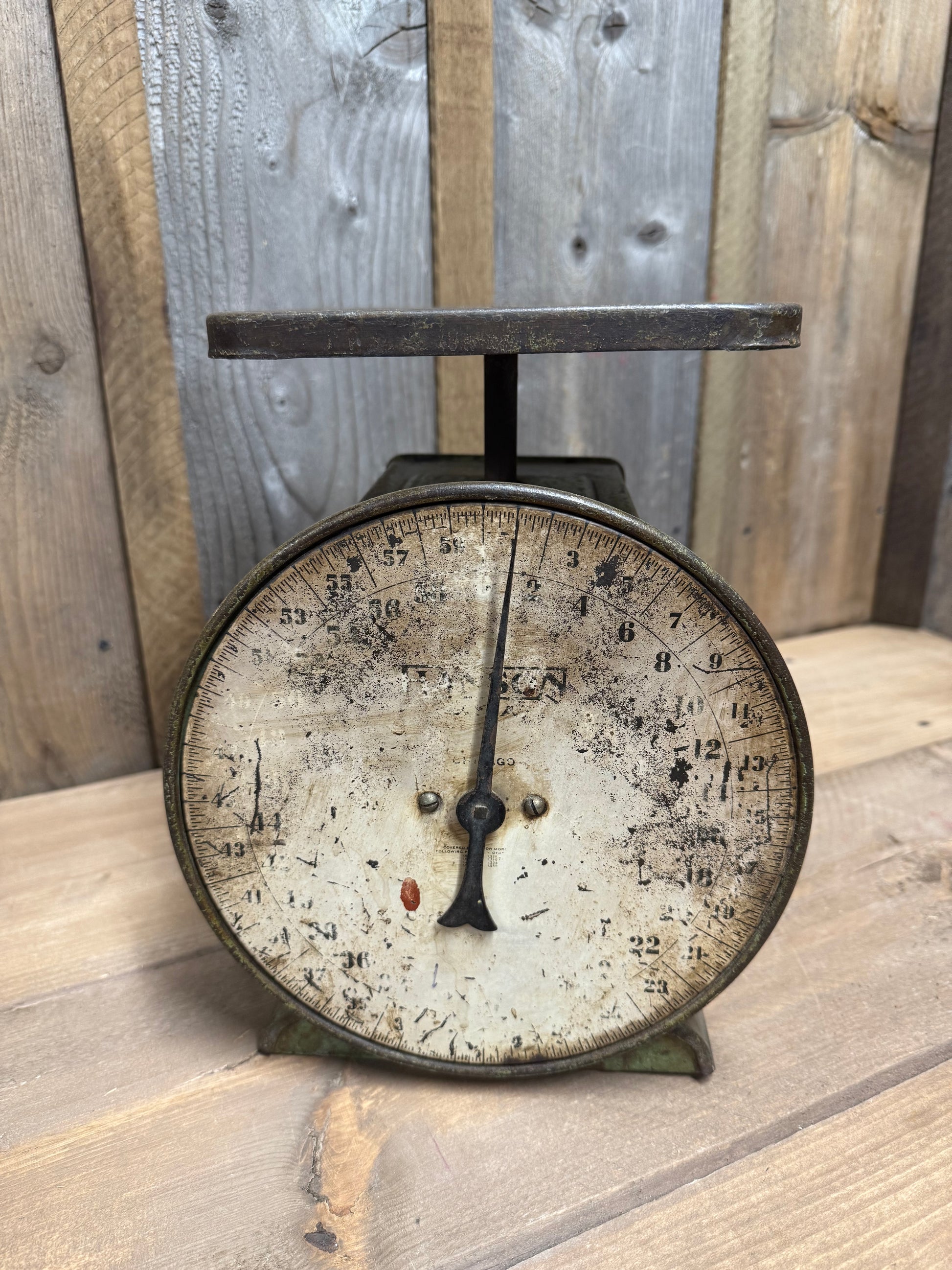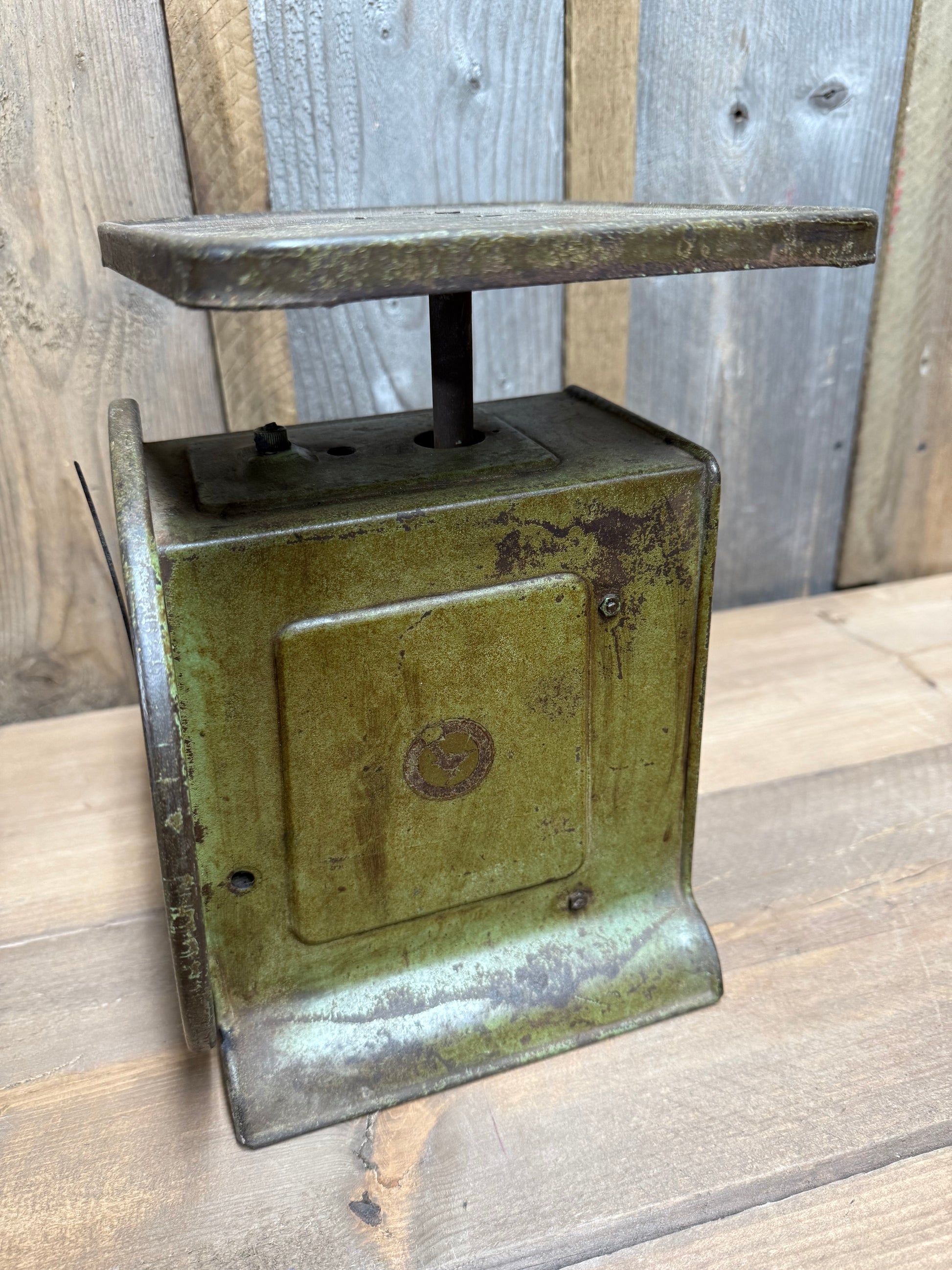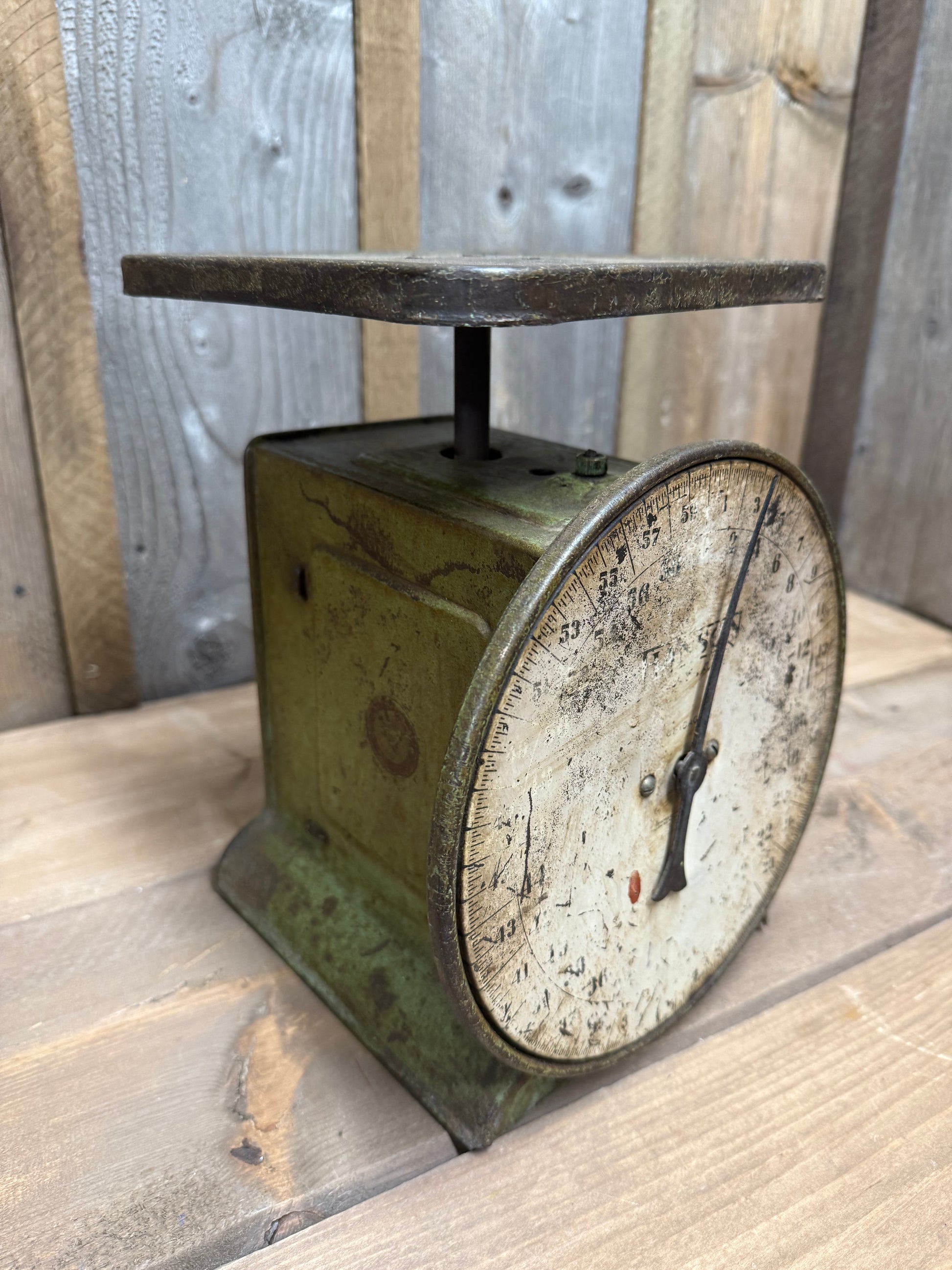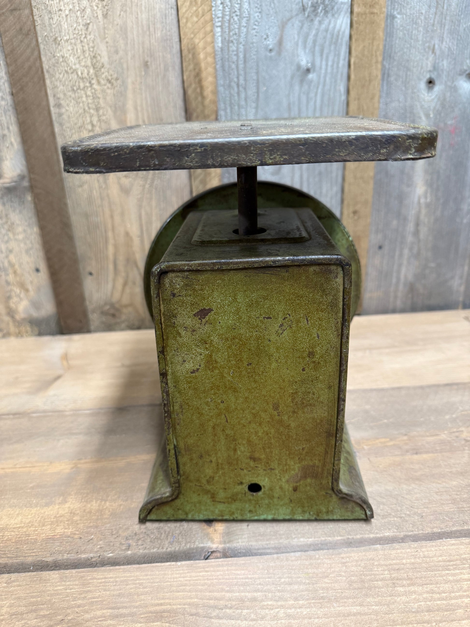 Old metal Scale with the best green paint! Shows lots of wear and tear and has been well used and loved. Look at the pictures carefully as they are part of the description.