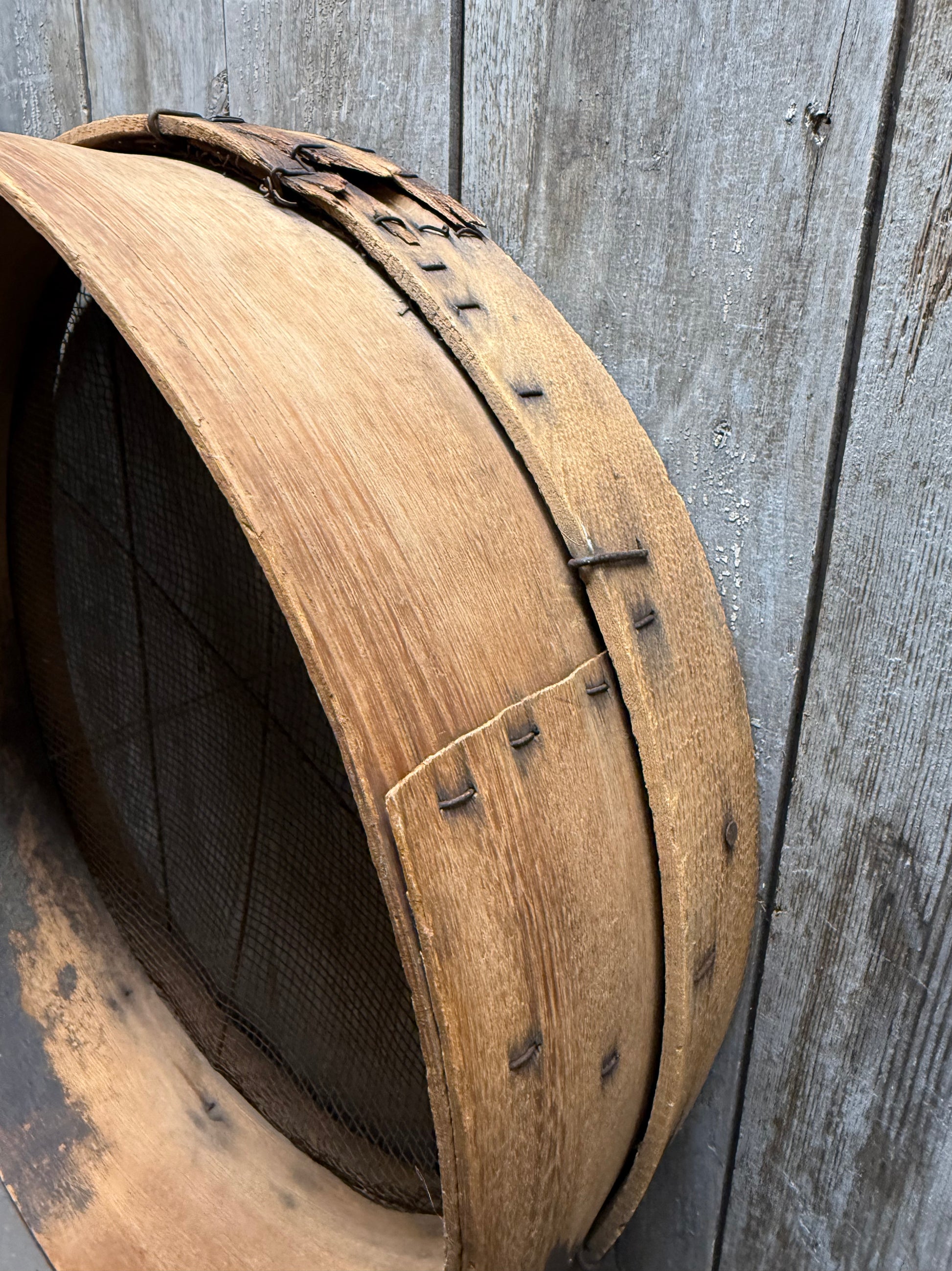 If you like rust and dull finish, you'll love this! Authentic; no reproduction. This old Sieve was used to sift seeds or grain. The bentwood frame, wire and brad nails/staples show signs of repair. It does hold together well but the wire mesh has a hole and the mesh is not as tight as it could be. It is still sturdy just has a few condition problems. This piece has been used and you can expect age appropriate wear and tear. Measures 17" round and 5" deep. This screen would have been used to finely sort seeds and grains.