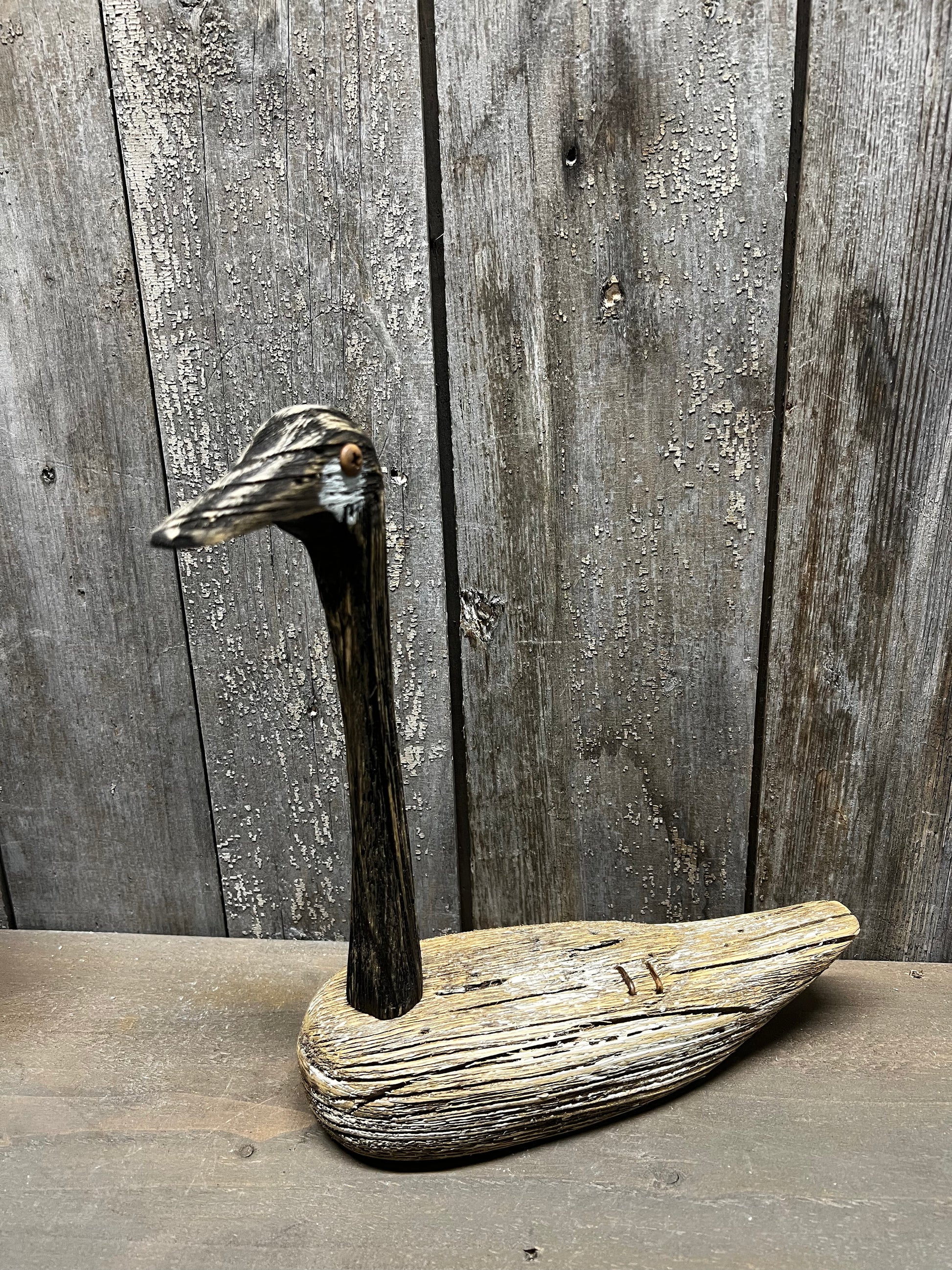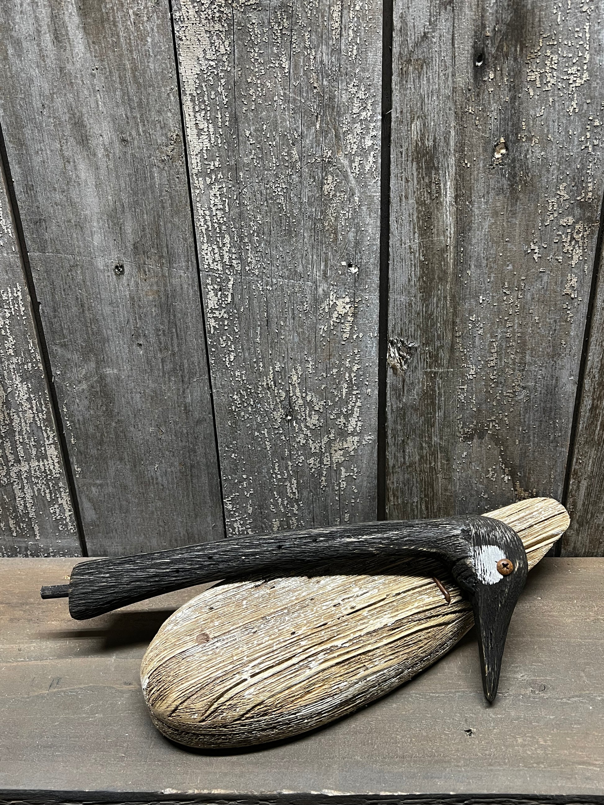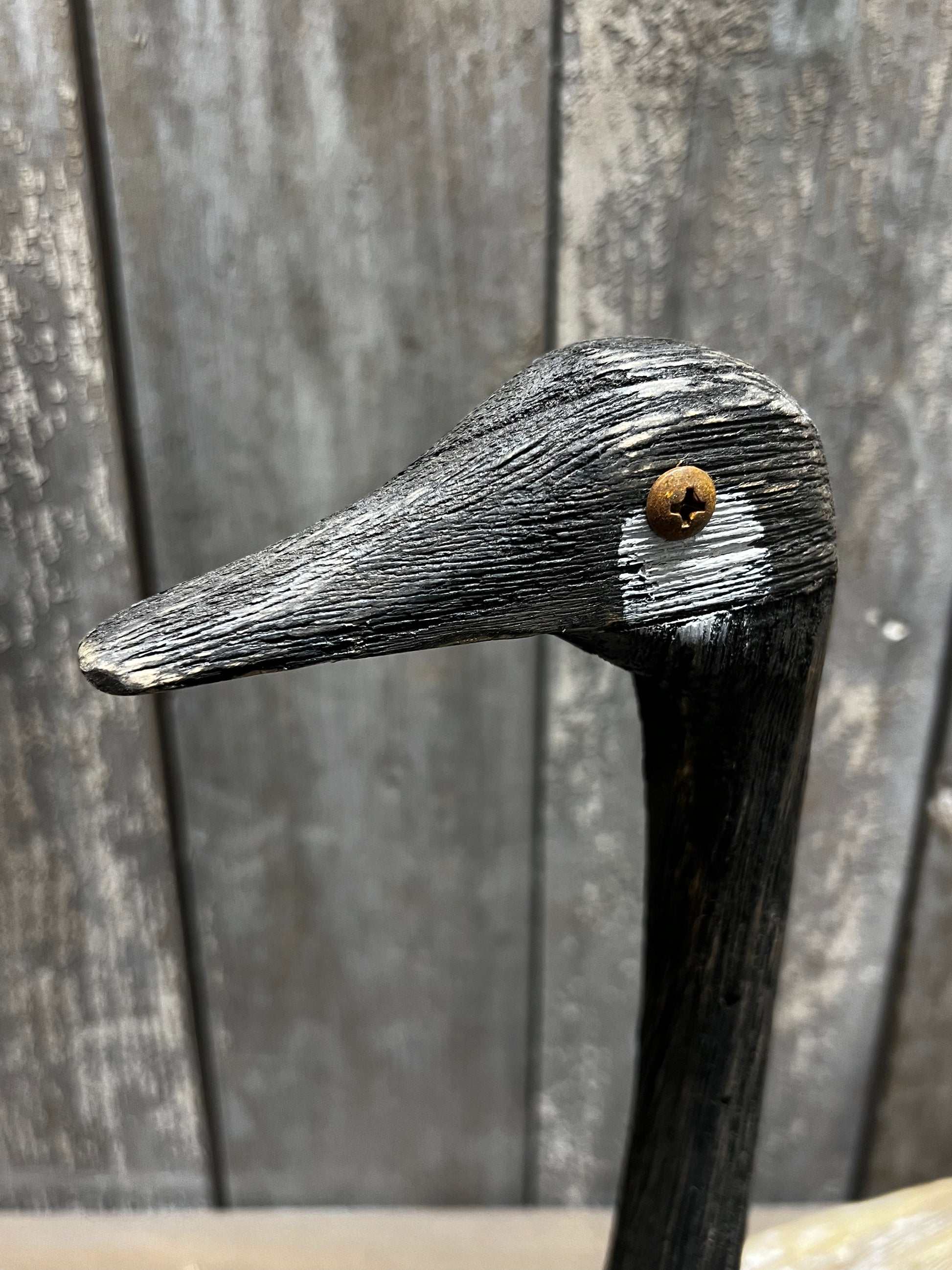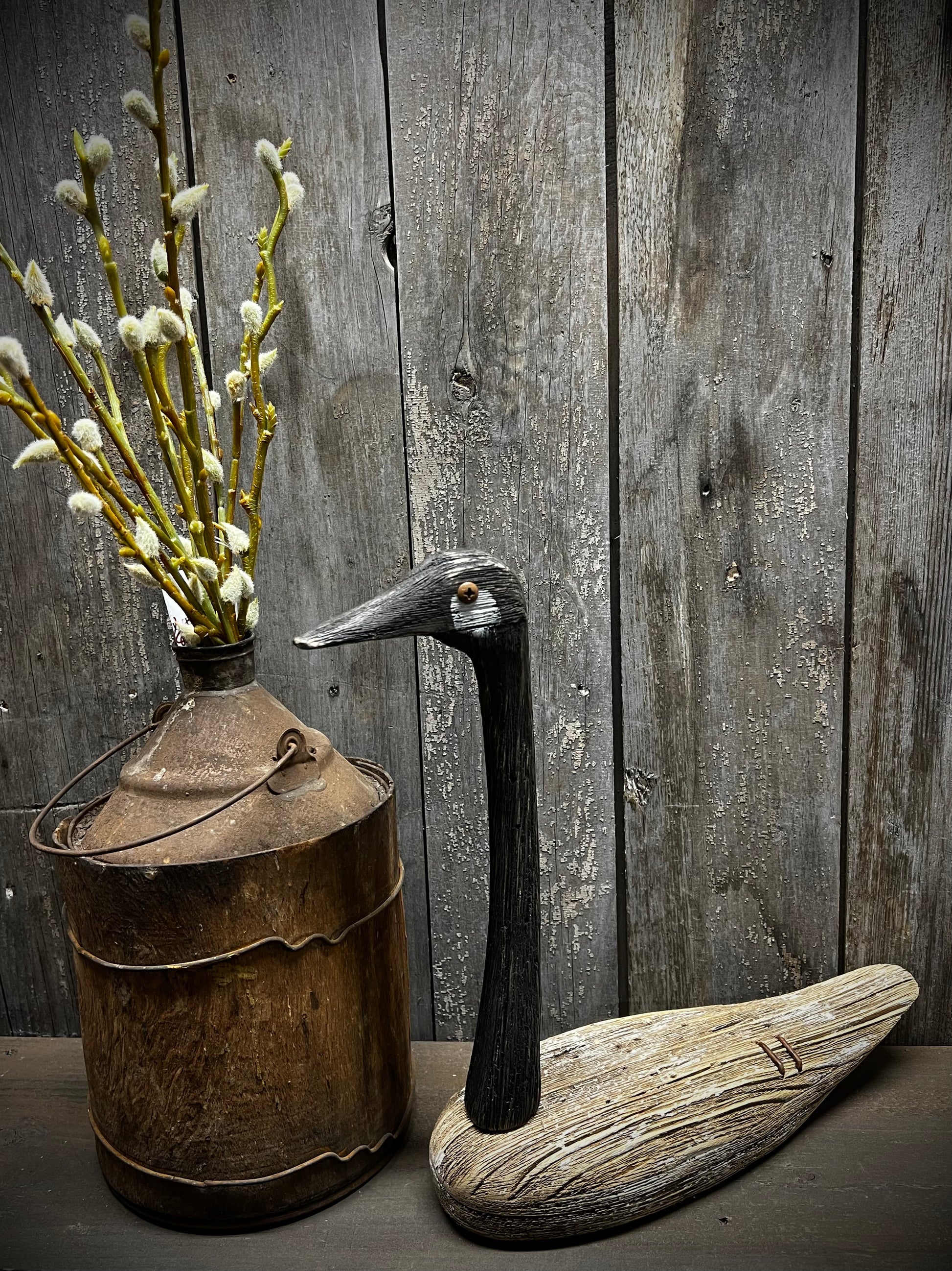 This reproduction wooden Goose has a lovely "old and early" look including the distressing and make-do wire repairs. Available in 2 sizes, the Large measures 12" long and 12.5" tall and the Small 10"x 10". These 2 piece shelf sitters are perfect for small spaces and centerpieces. Use them alone or grouped together. From the worn paint to the rusty screw eyes, they are a treasure. Imported