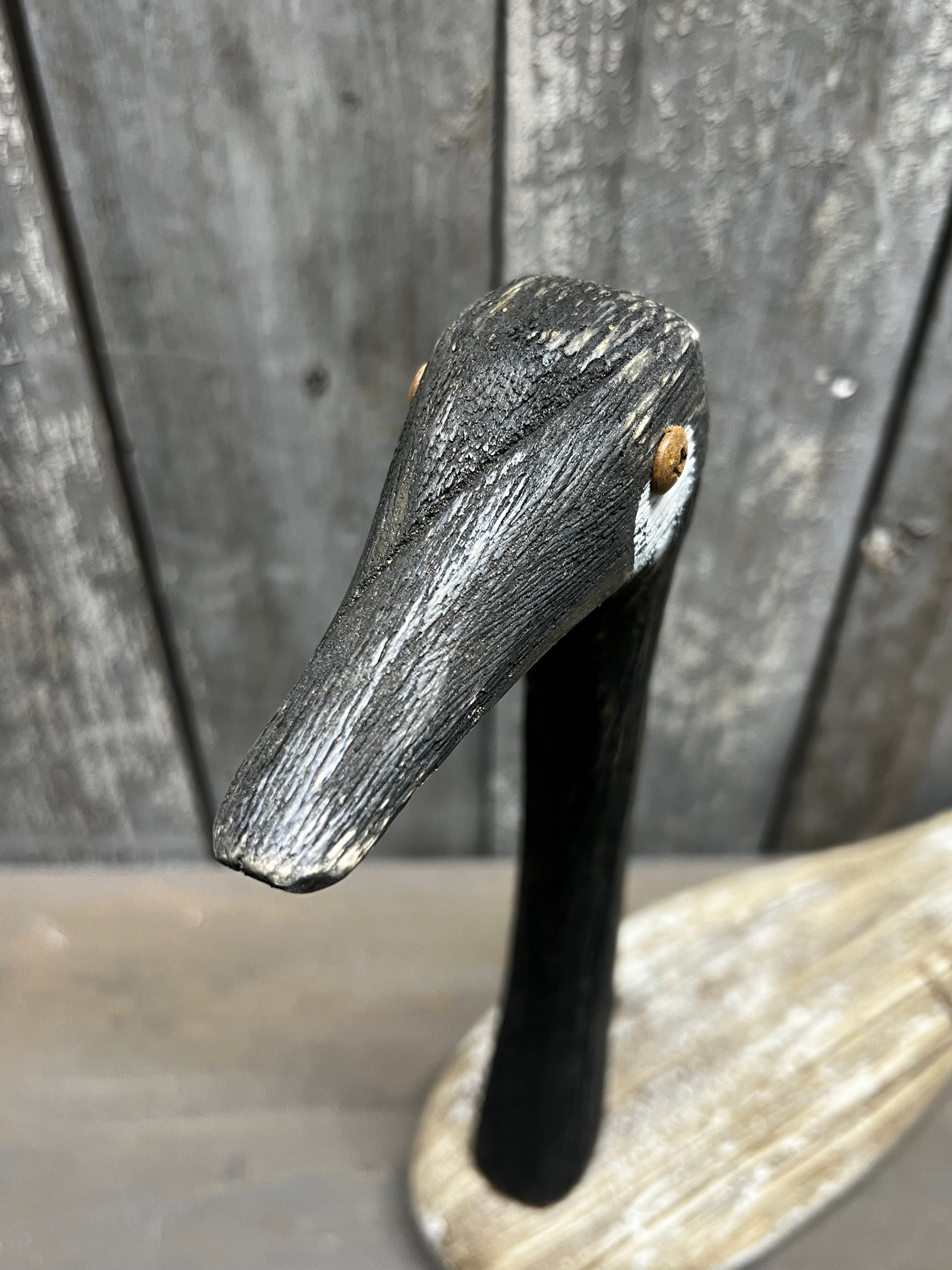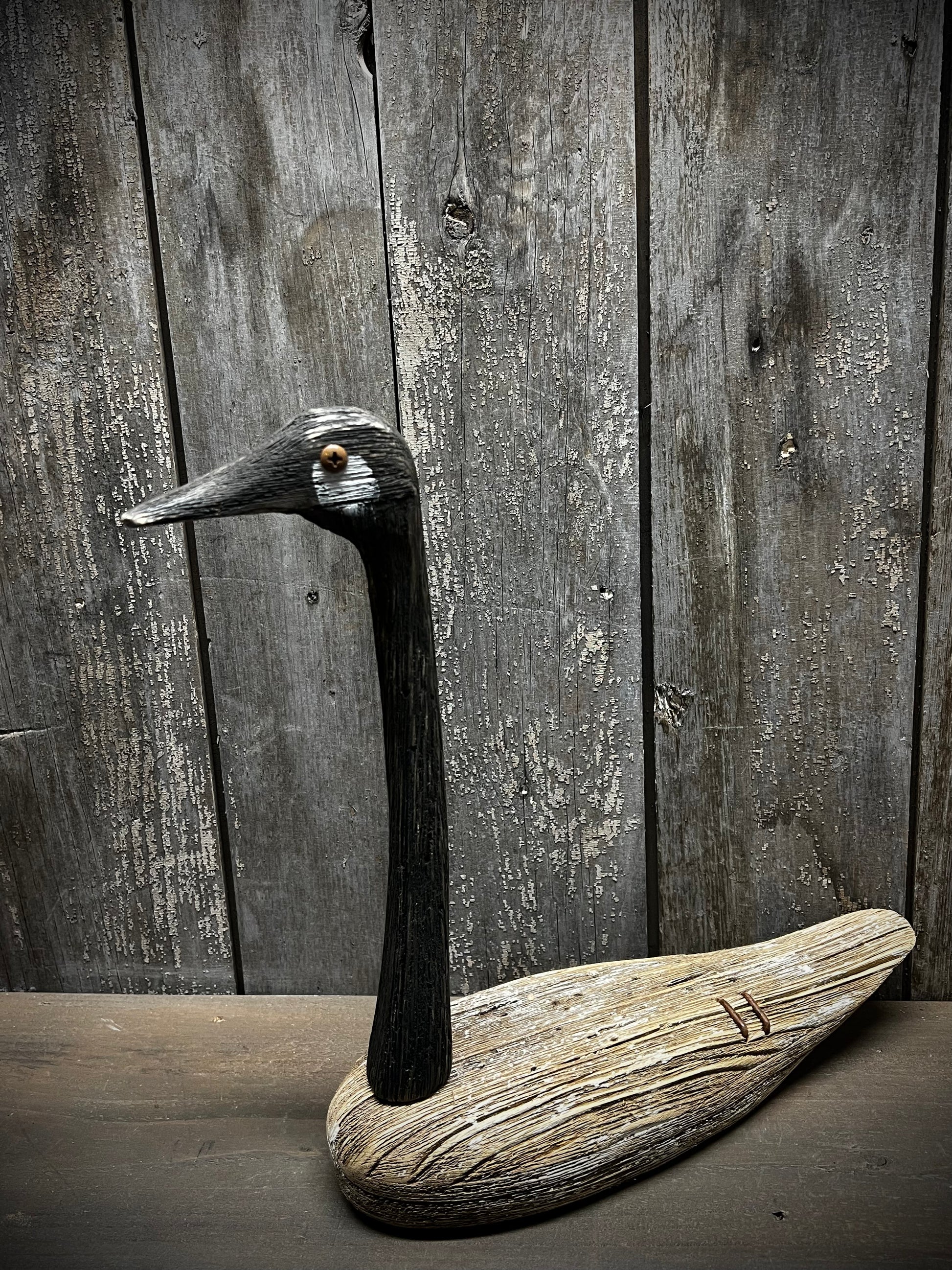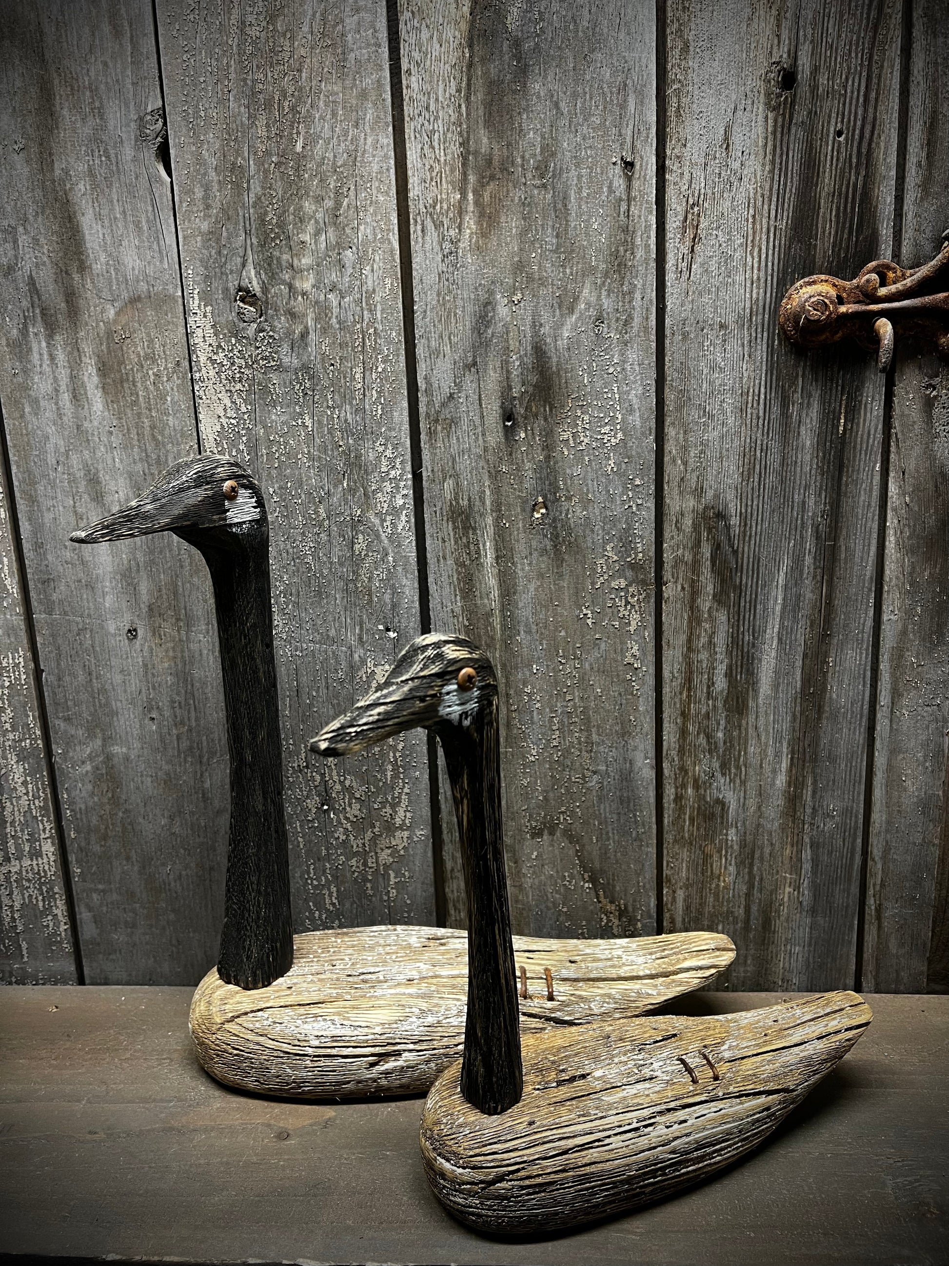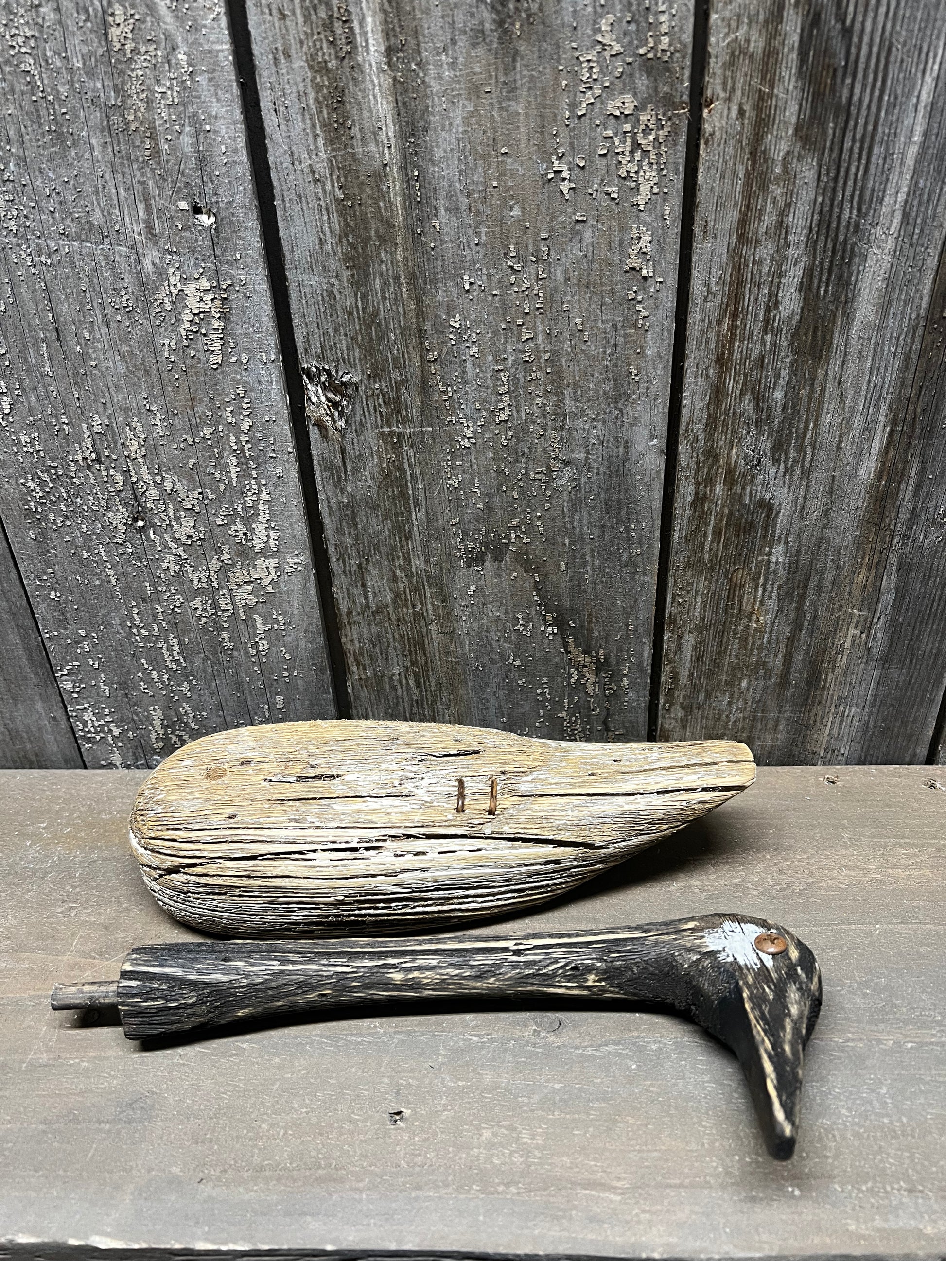 This reproduction wooden Goose has a lovely "old and early" look including the distressing and make-do wire repairs. Available in 2 sizes, the Large measures 12" long and 12.5" tall and the Small 10"x 10". These 2 piece shelf sitters are perfect for small spaces and centerpieces. Use them alone or grouped together. From the worn paint to the rusty screw eyes, they are a treasure. Imported