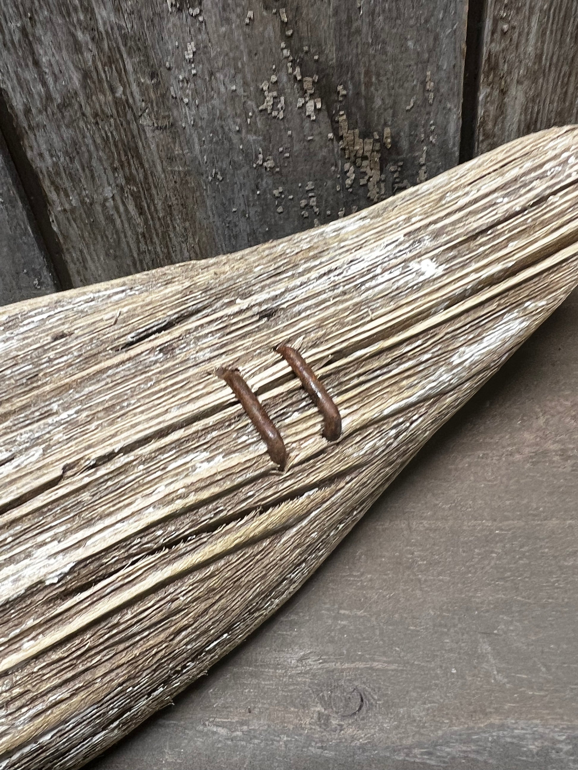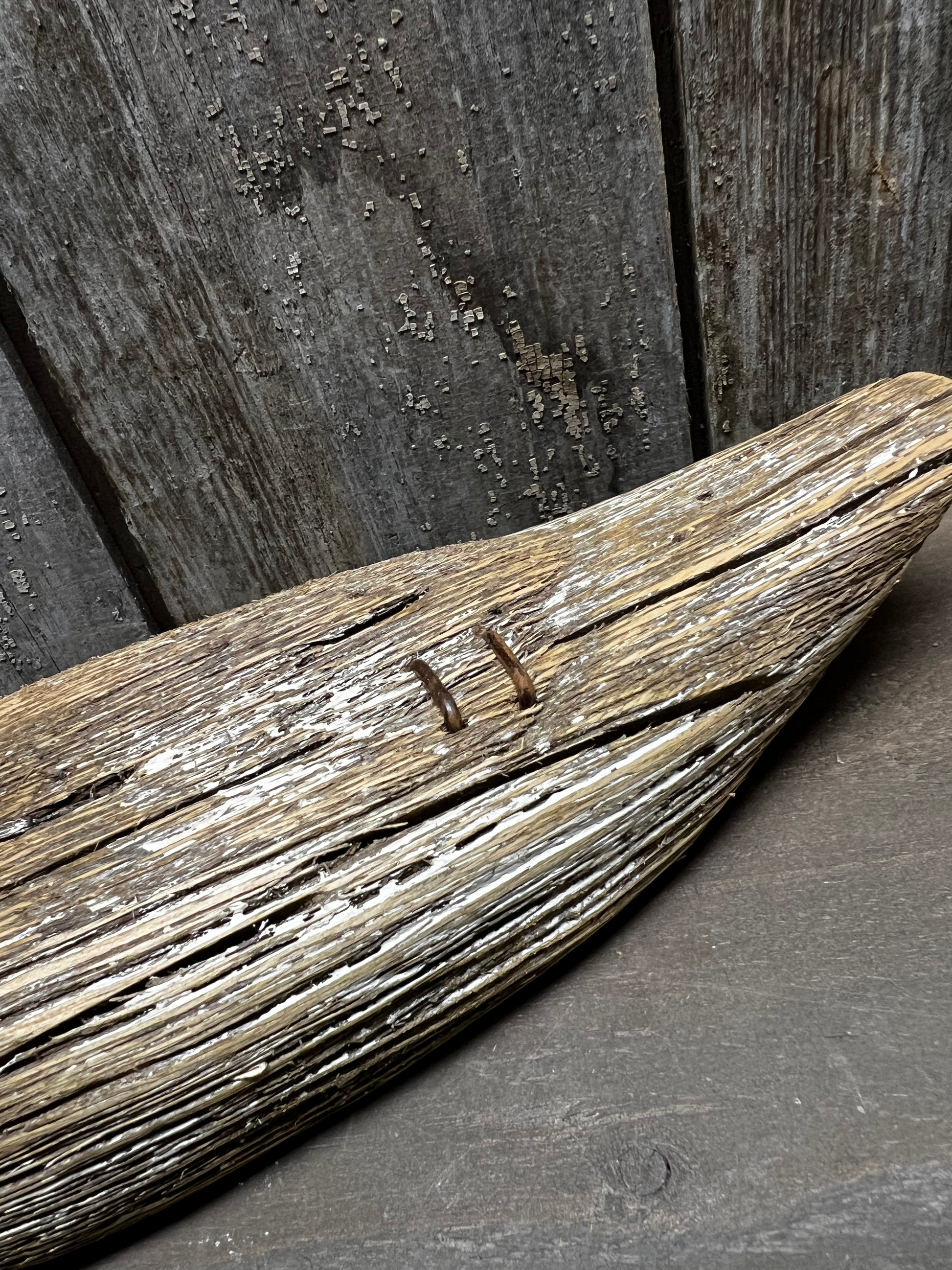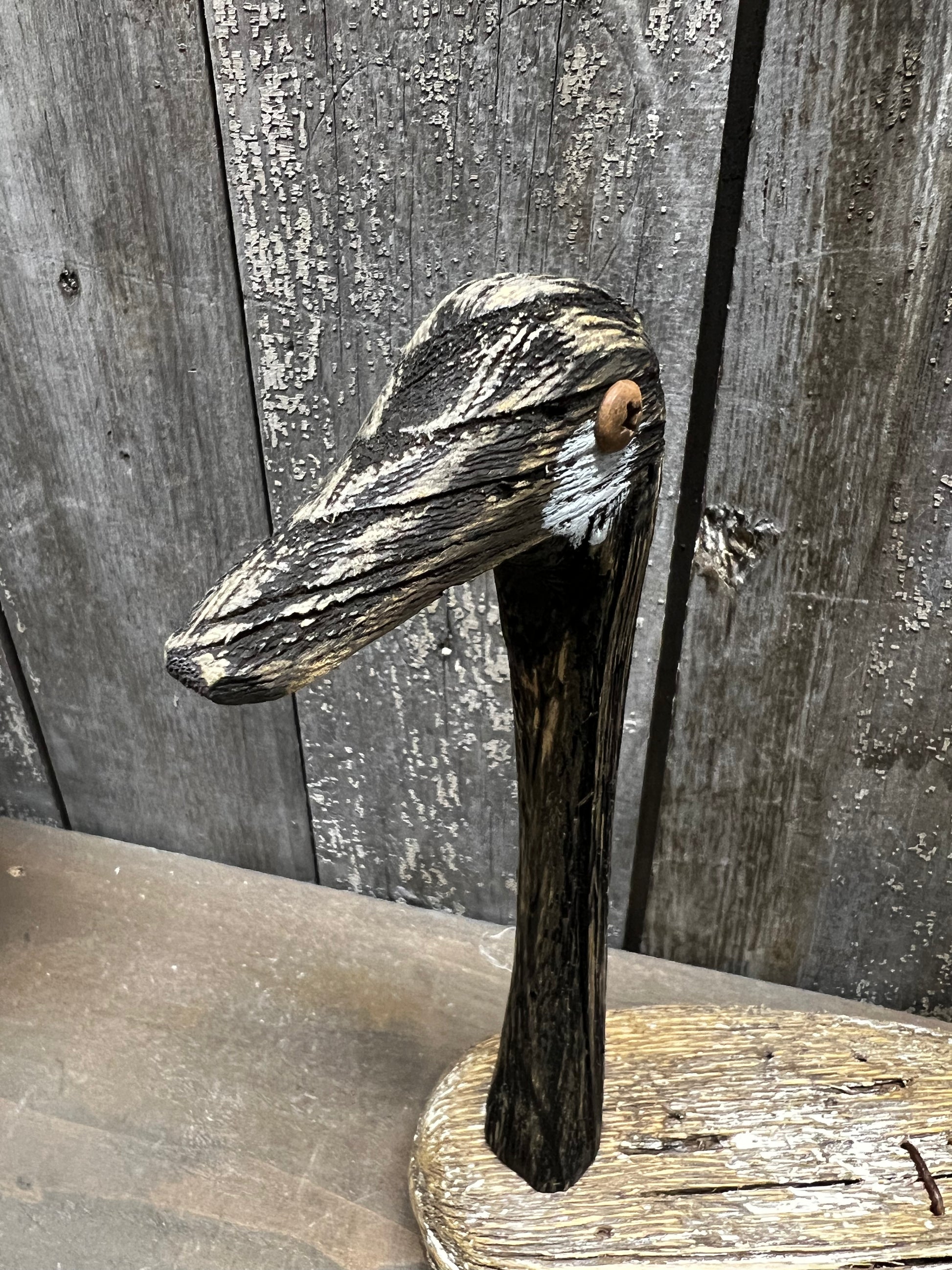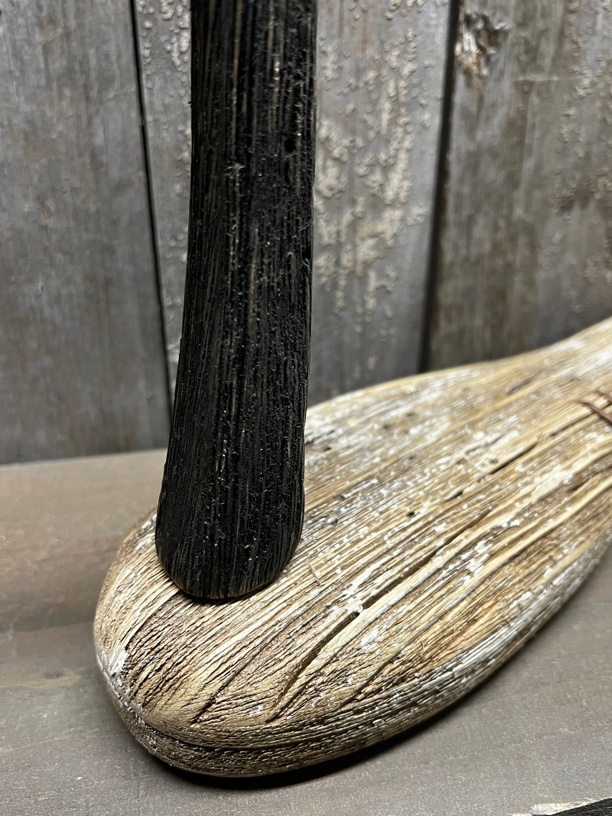 This reproduction wooden Goose has a lovely "old and early" look including the distressing and make-do wire repairs. Available in 2 sizes, the Large measures 12" long and 12.5" tall and the Small 10"x 10". These 2 piece shelf sitters are perfect for small spaces and centerpieces. Use them alone or grouped together. From the worn paint to the rusty screw eyes, they are a treasure. Imported