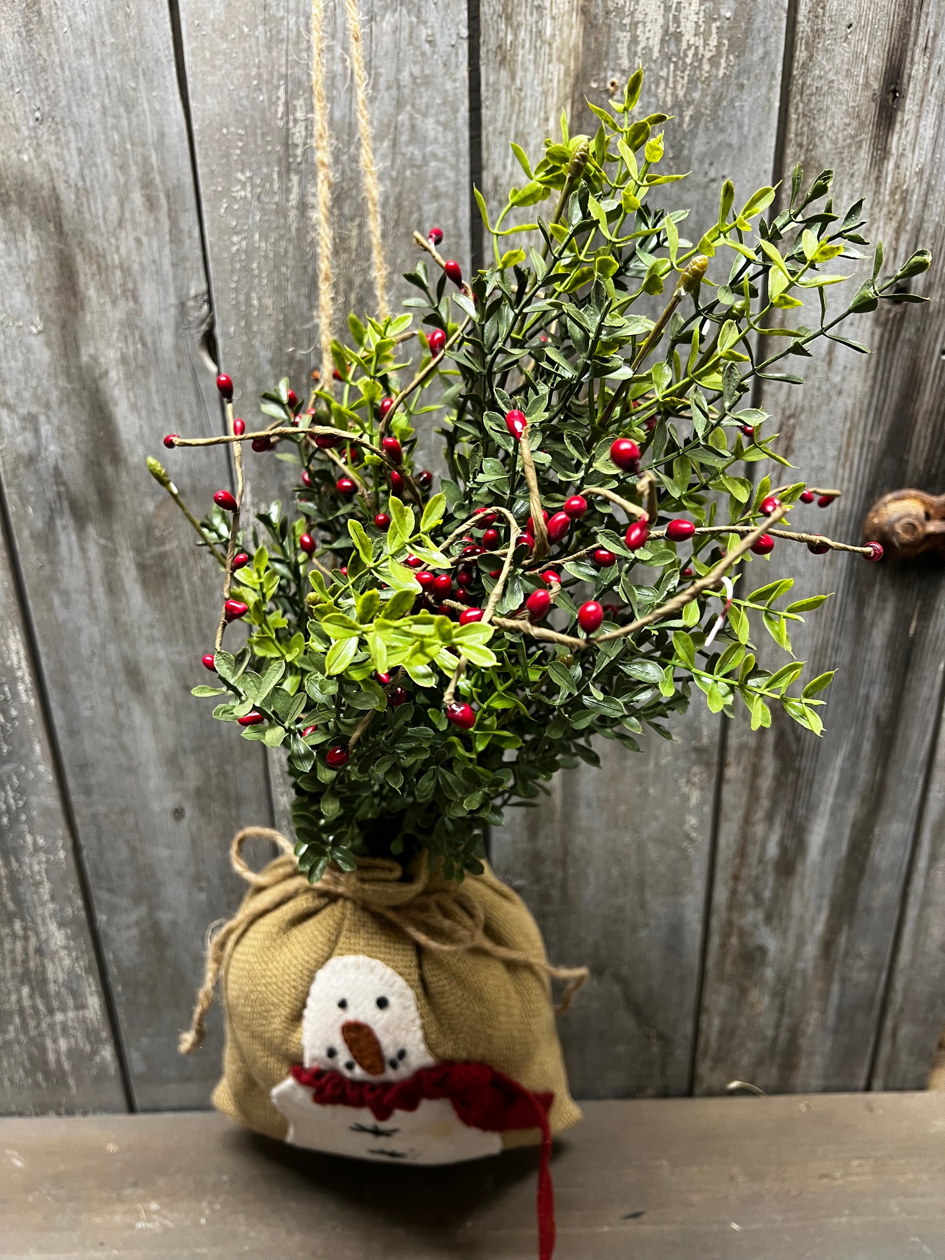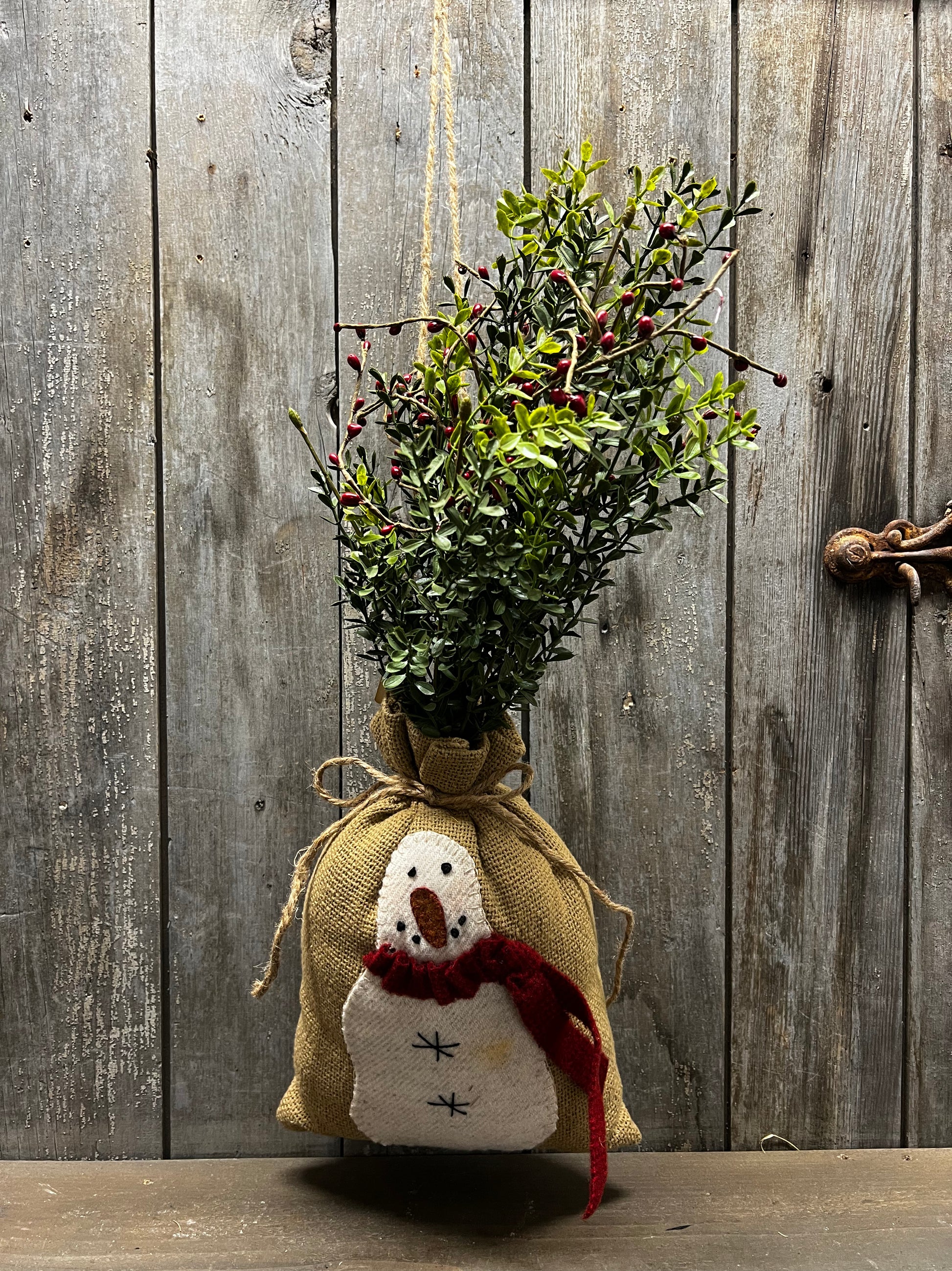 Hand applique snowman on a "burlap" sack filled with greens and berries and dusted with cinnamon.