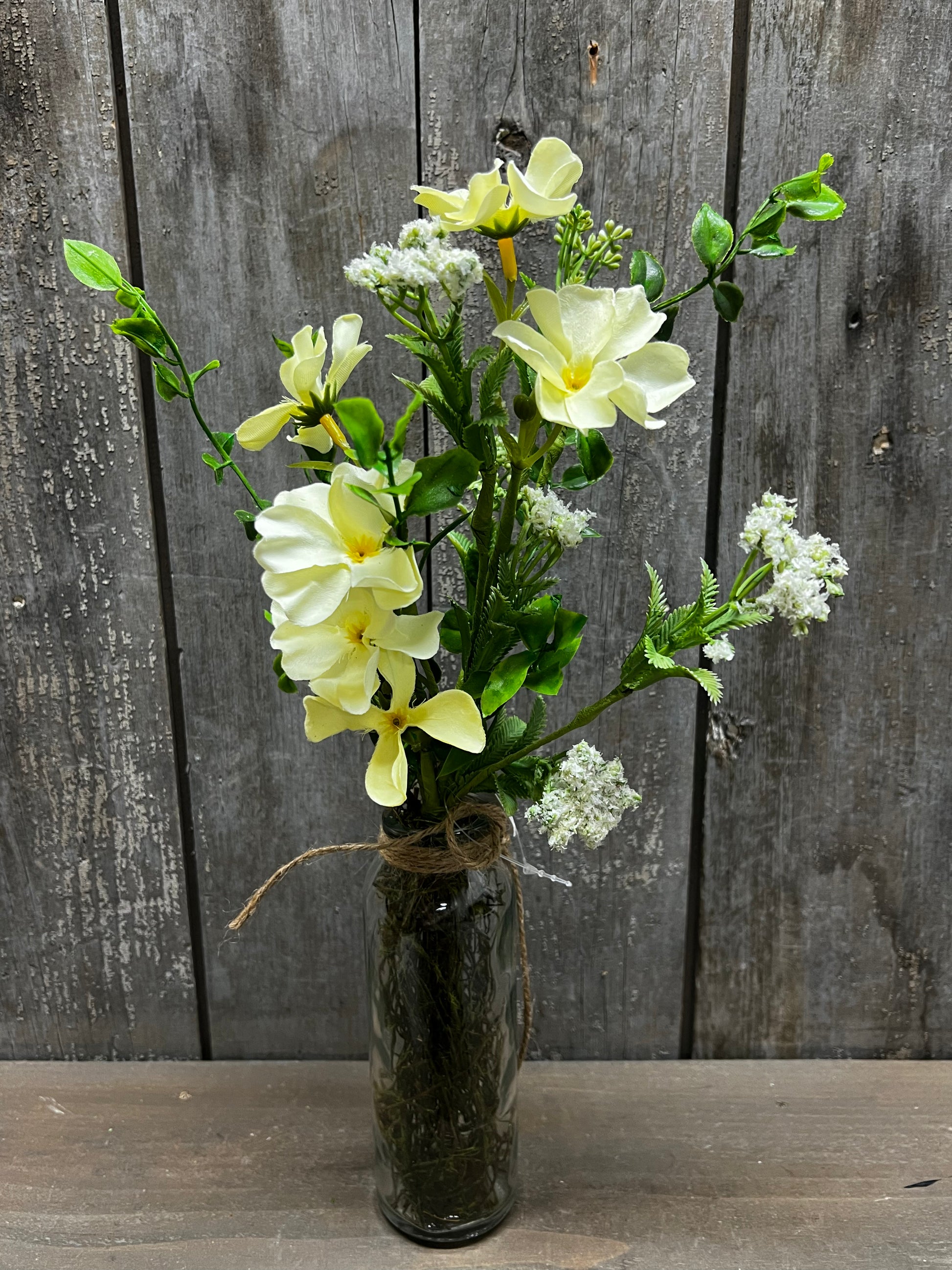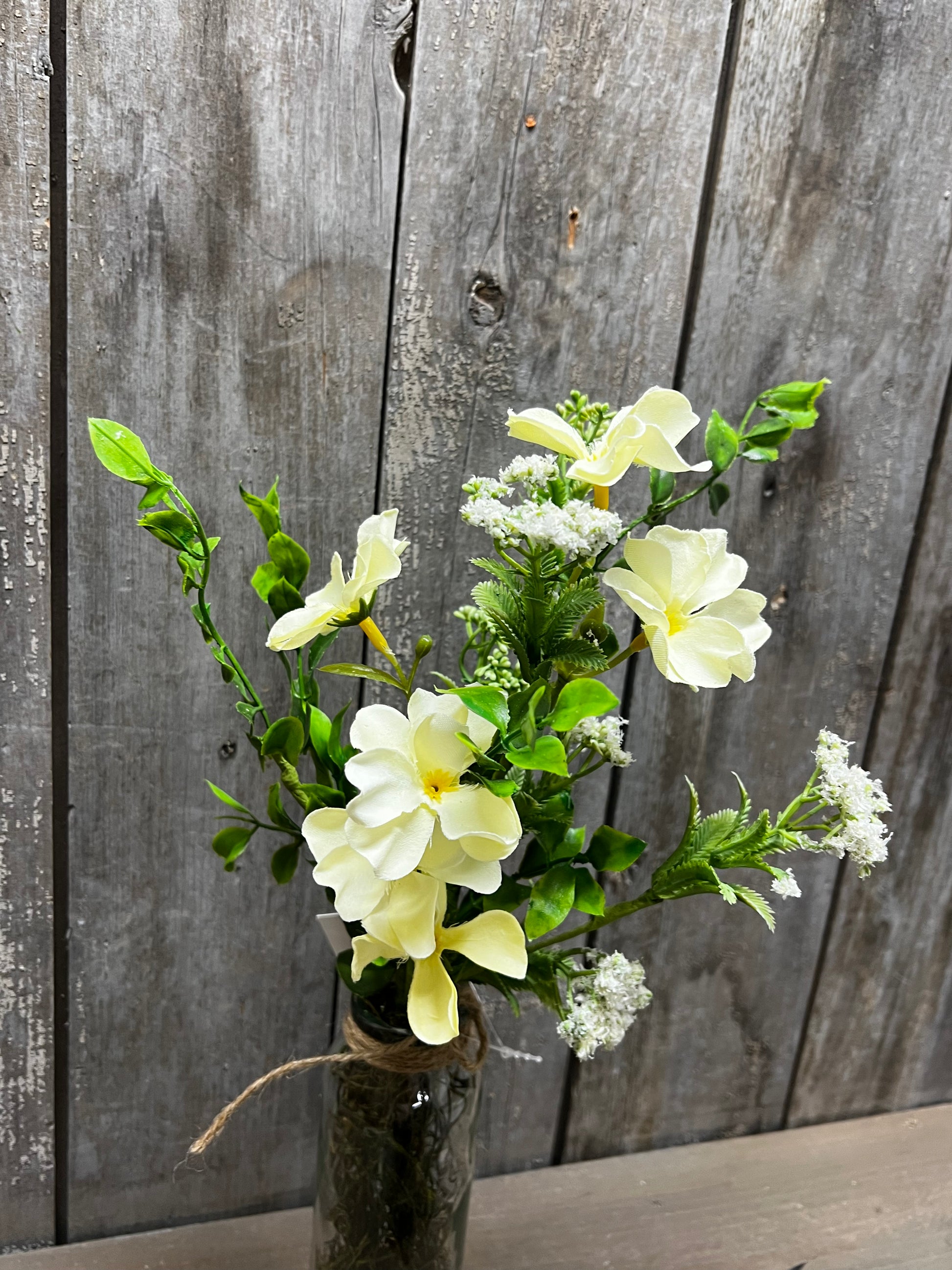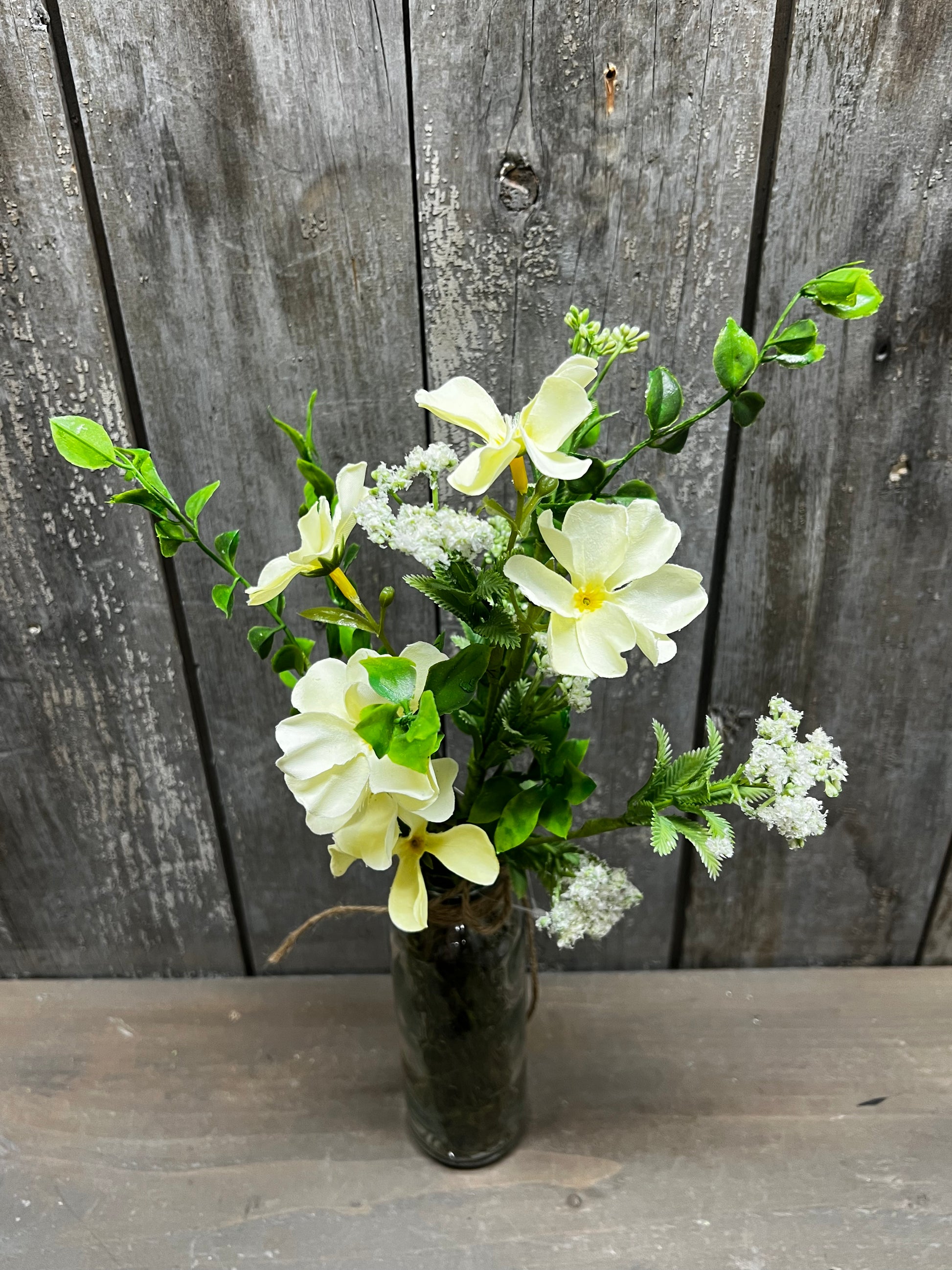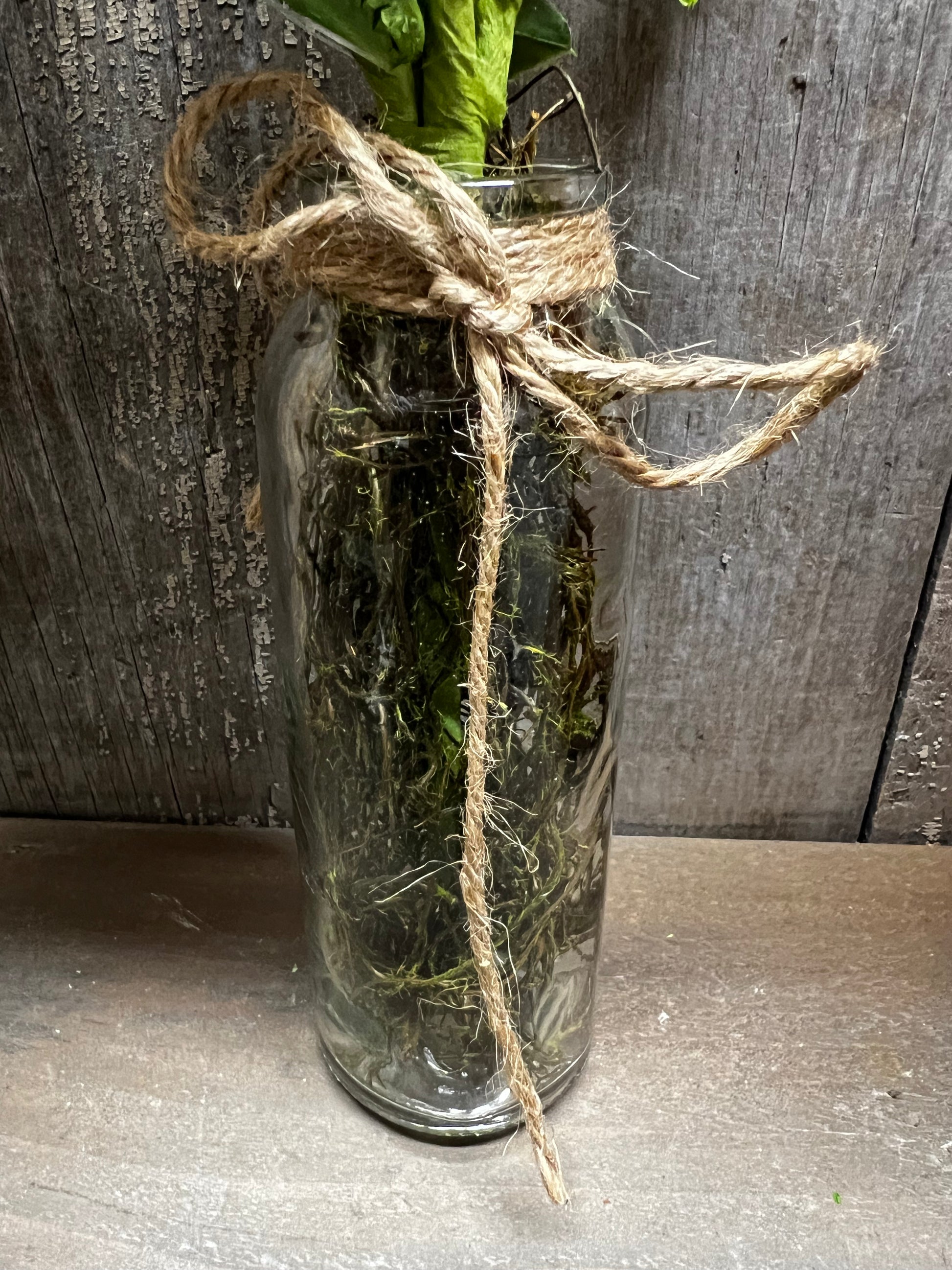 Lovely shades of cream and green mixed together to add a fresh and clean look. This small pick is nestled ina glass vase with grass and a jute bow. Measures 15" tall.