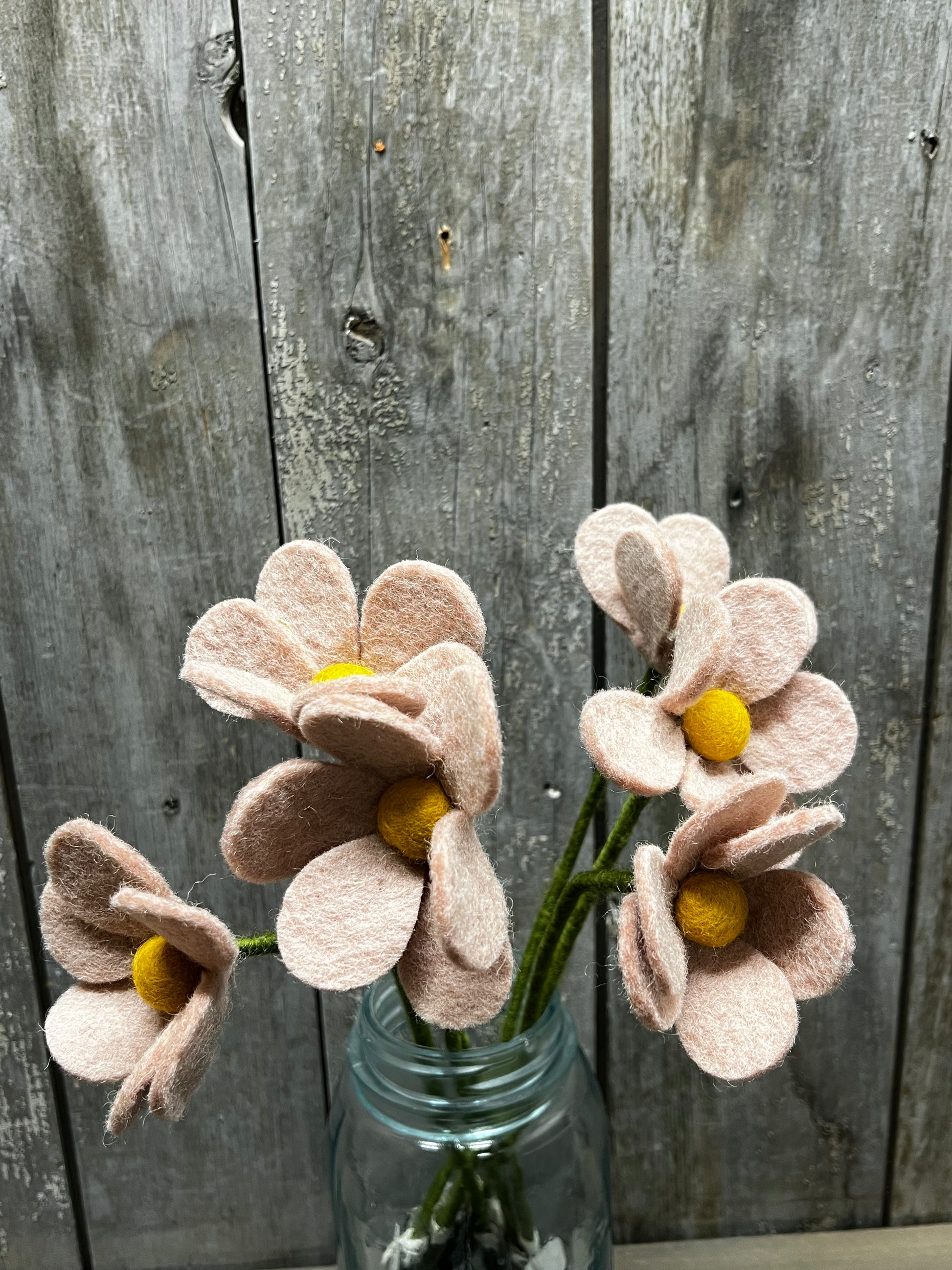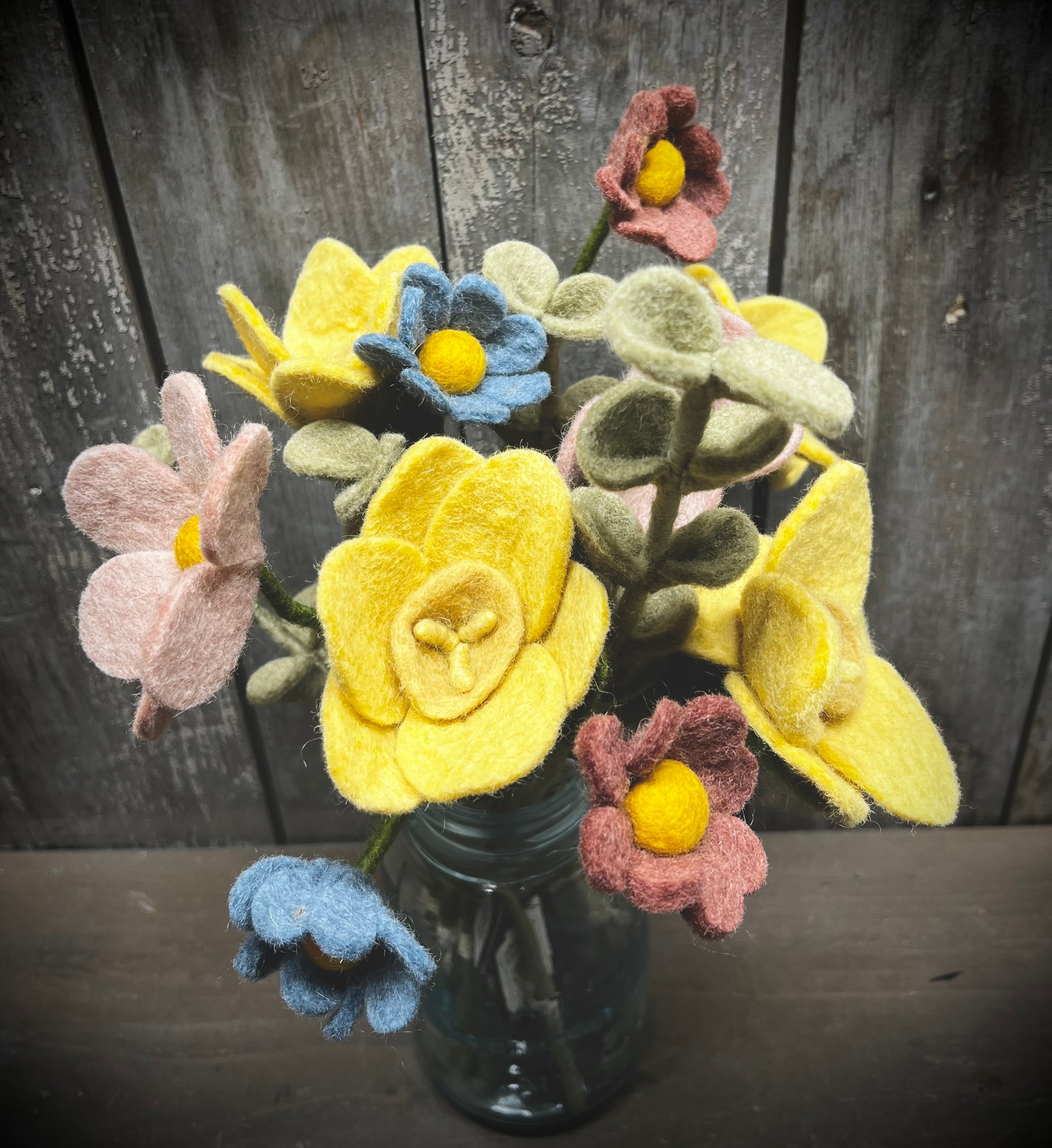 Perfect for vase and baskets, made from felted wool. Measures 13" long and stem is bendable. Photo may show brighter than the actual color. Price is per stem. Also shown with other flowers for inspiration.