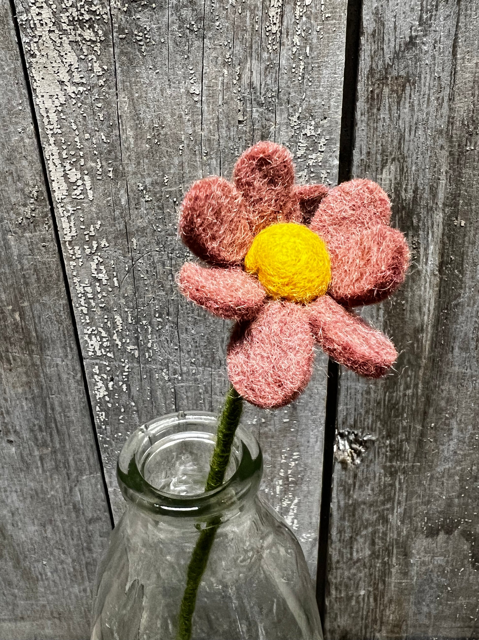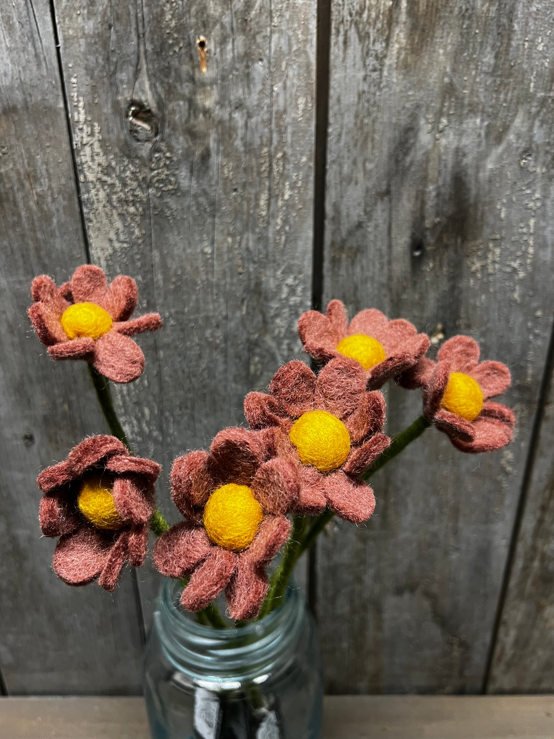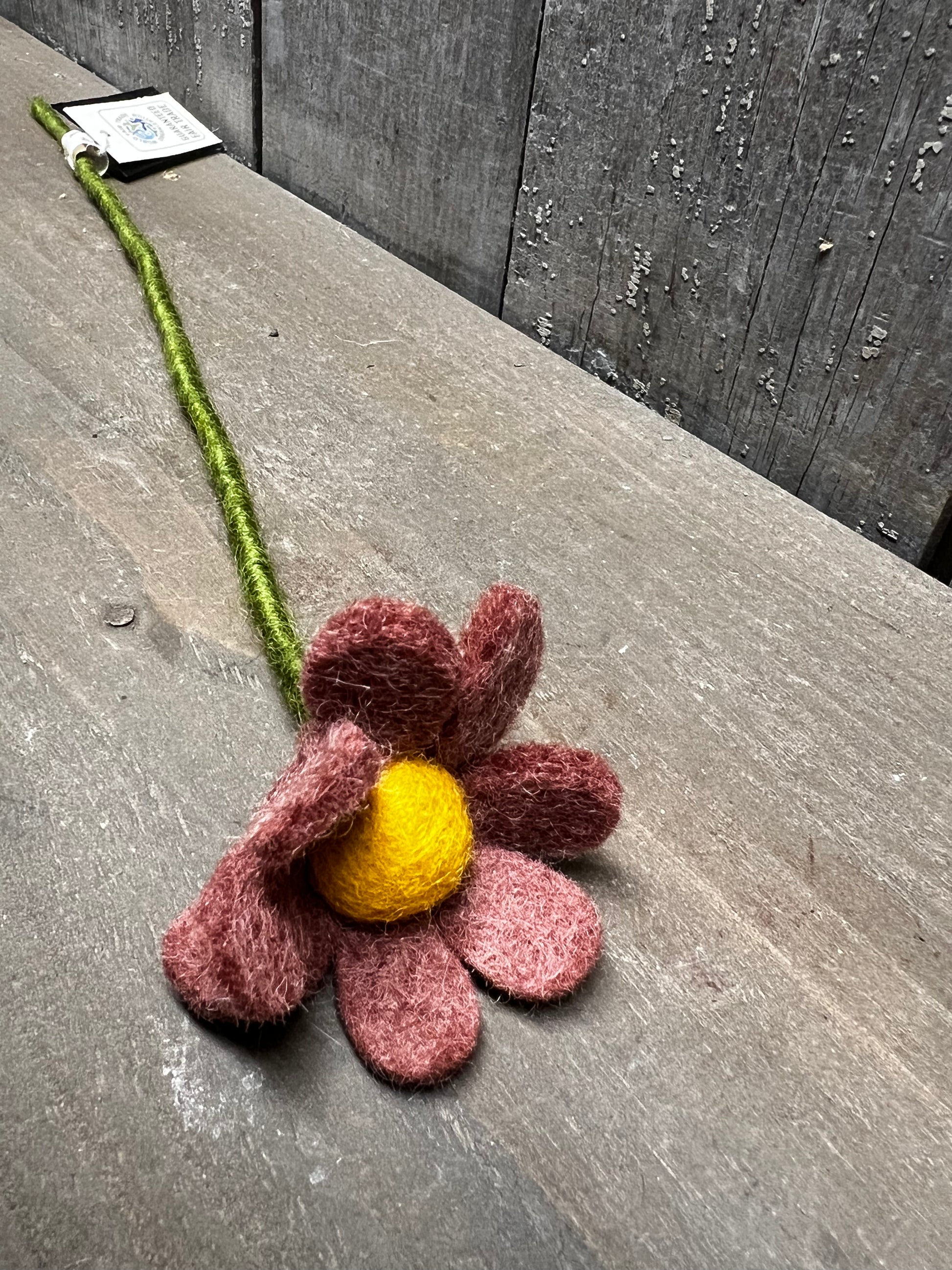 Perfect for vase and baskets, made from felted wool. Measures 13" long and stem is bendable. Photo may show brighter than the actual color. Price is per stem. Also shown with other flowers for inspiration.