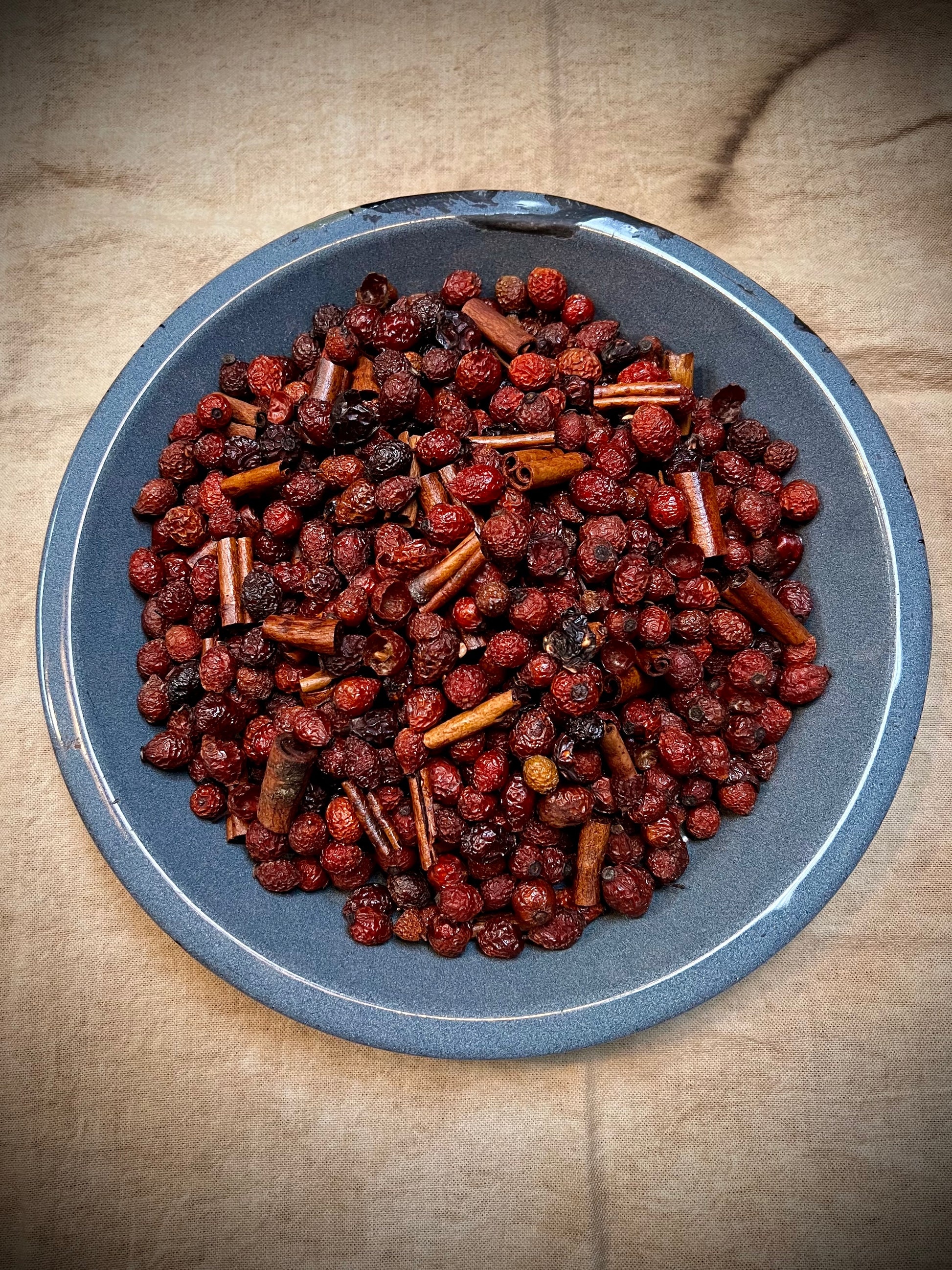 The combination of rose hips and cinnamon sticks make a delightful bowl filler. Highly scented in Cinnamon, the 8 ounce bag will fill most smaller bowls. Shown is 2 BAGS (16 ounce) in a 10.5" enamelware pan. Please note the scented oil can mark wooden bowls and fabric.