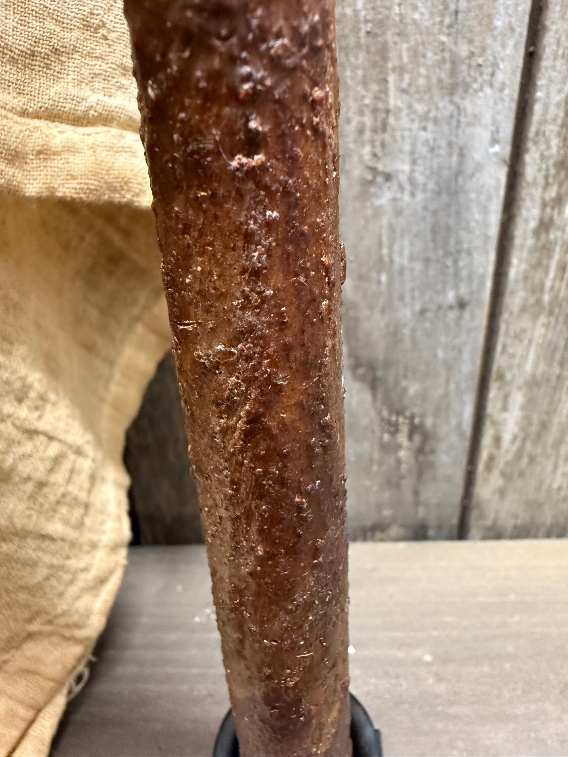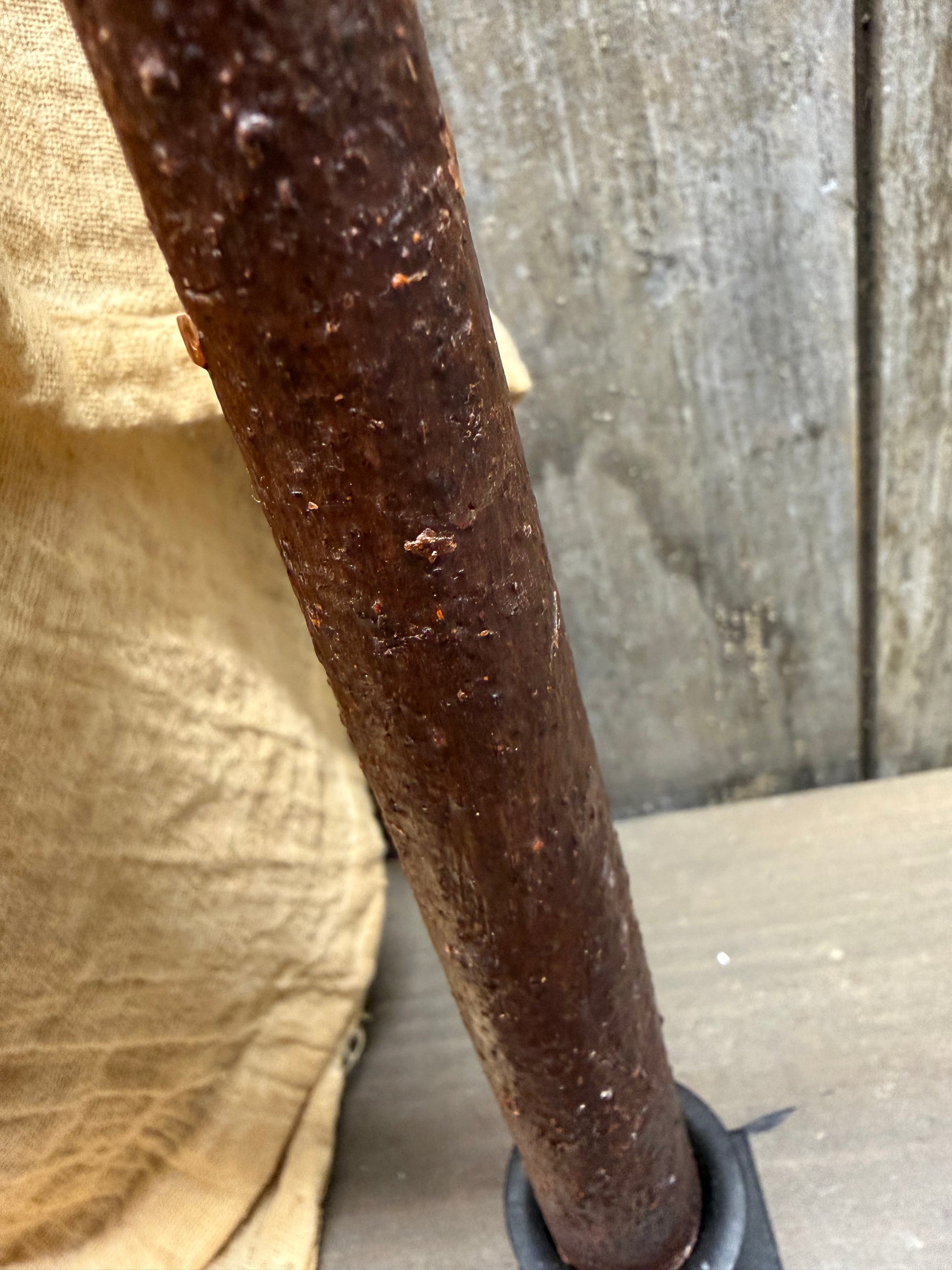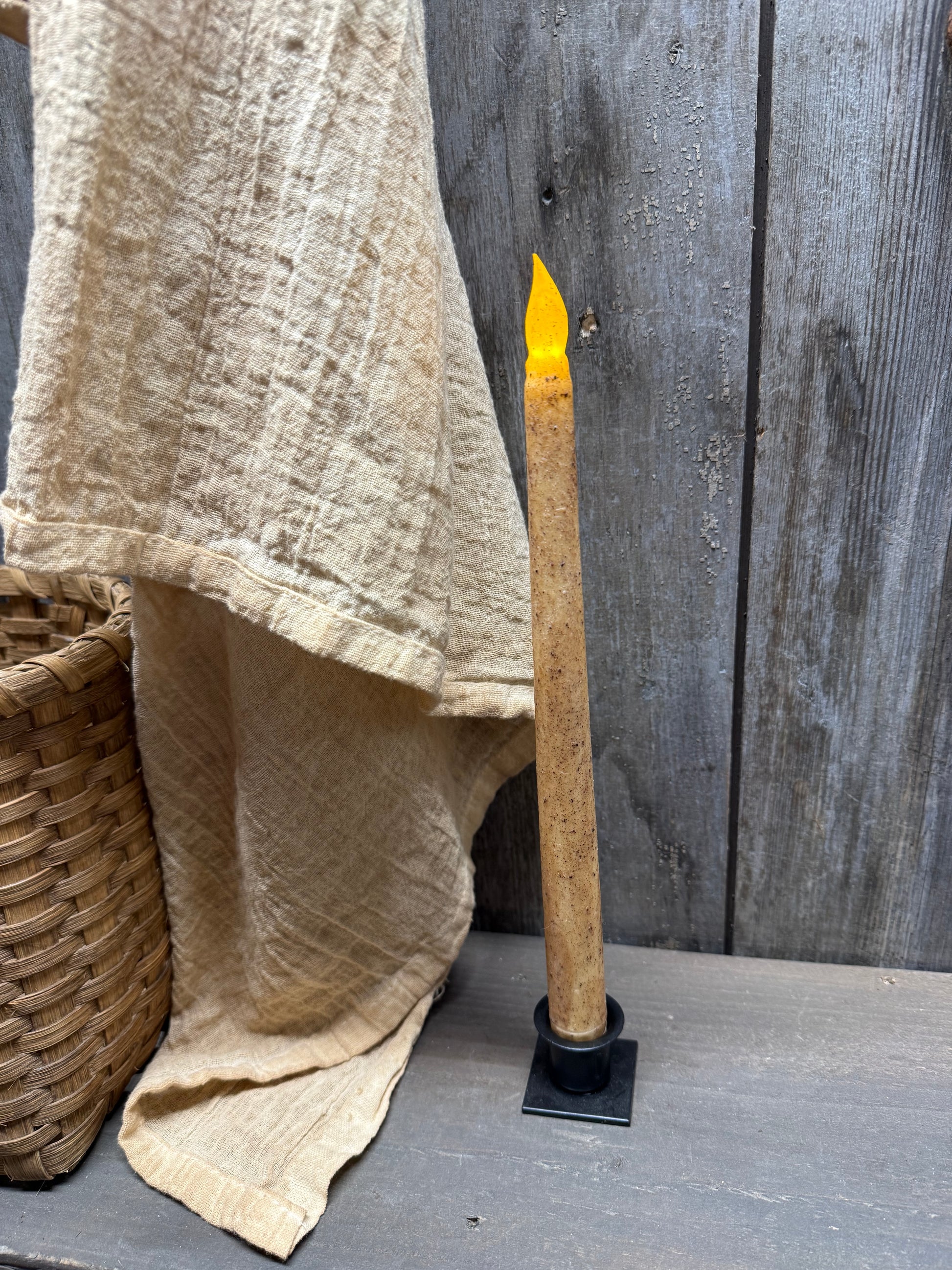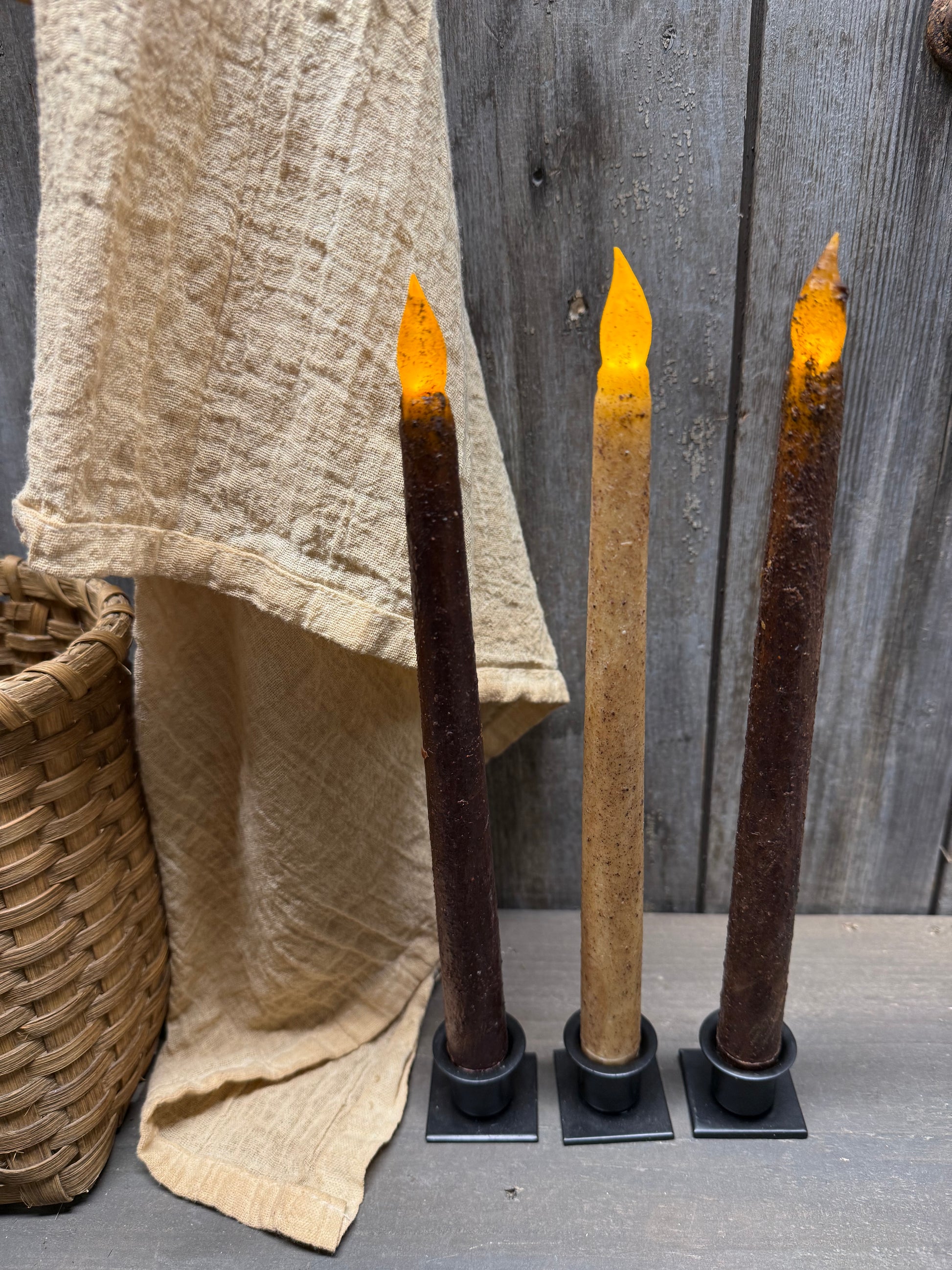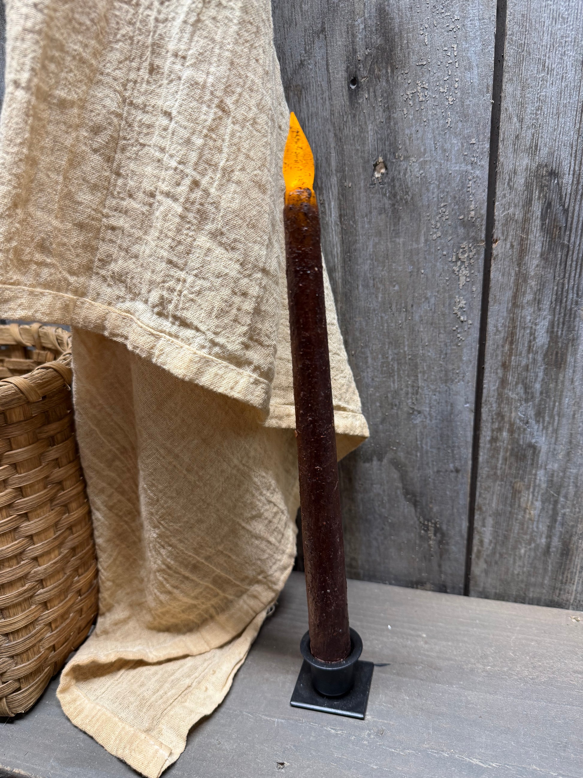 What a great look! This TIMER Taper is 10.75" tall and has a slight flicker to the flame. Dipped in wax for a primitive look. Please note the Burnt Burgundy and the Burnt Mustard are close in color by the burgundy has a reddish look. Time will set when the 2 AAA batteries are inserted (not included) and the flame come on. Candle cups sold separately.