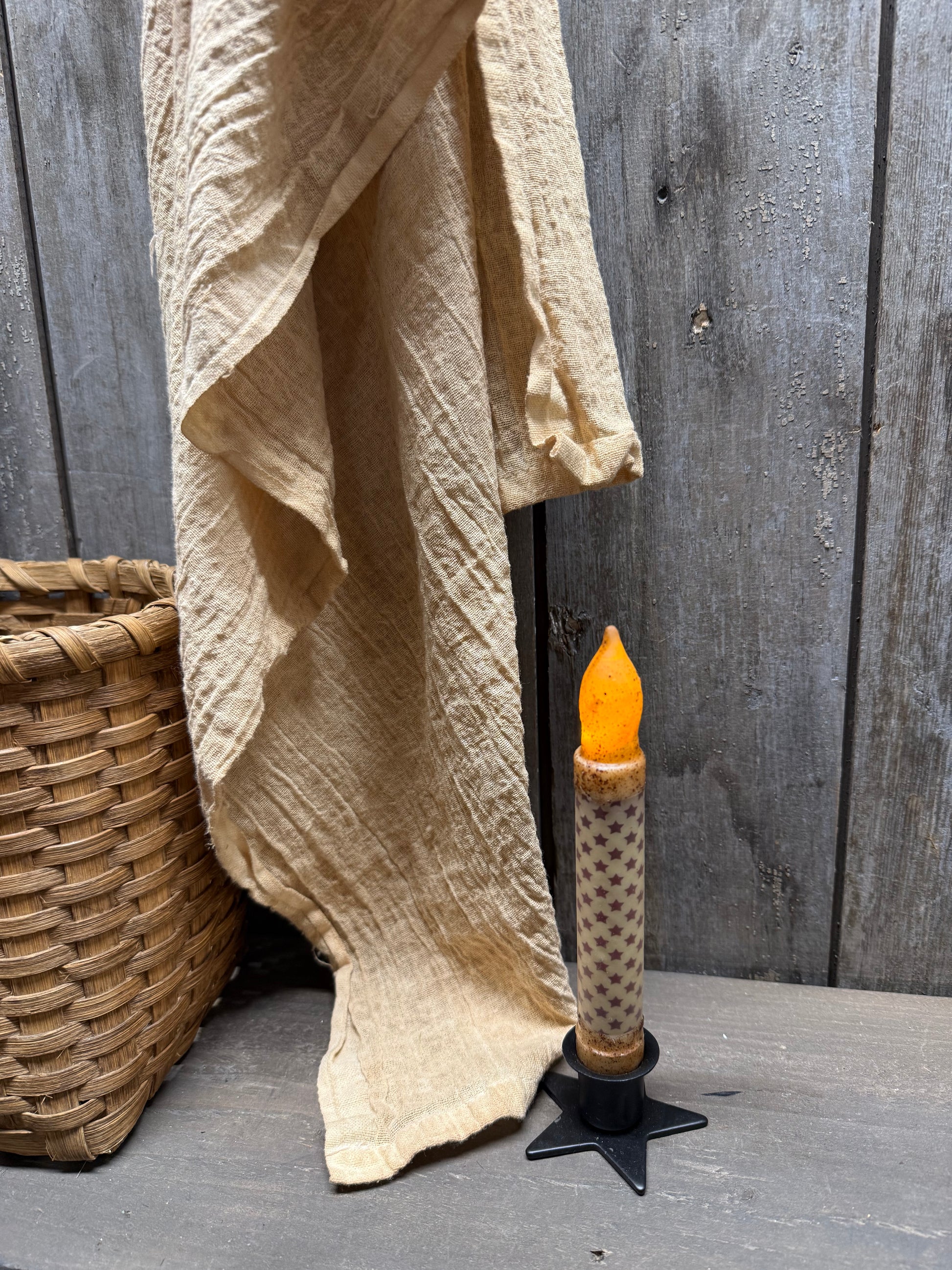 Perfect for your patriotic display and holiday time too. This 6" waxed taper has a TIMER function and has a red star printed wrap. 2 AA batteries needed, not included. Star holder sold separately. Flame has a slight flicker. Timer will start when the batteries are inserted and the candle light us.