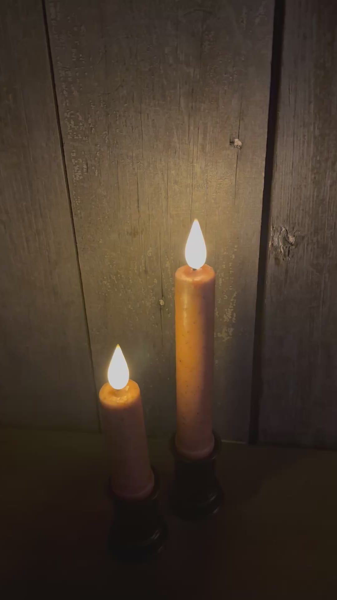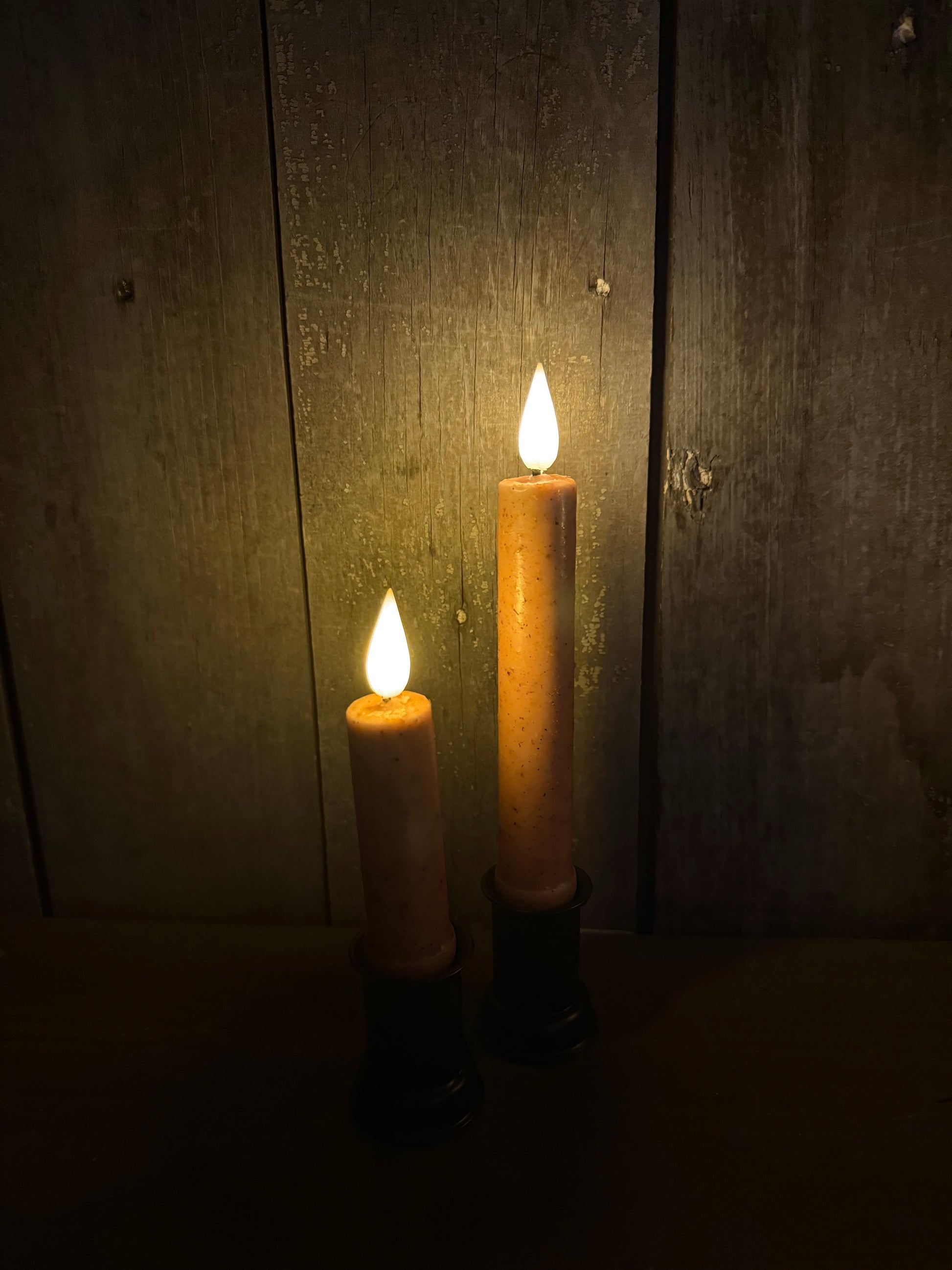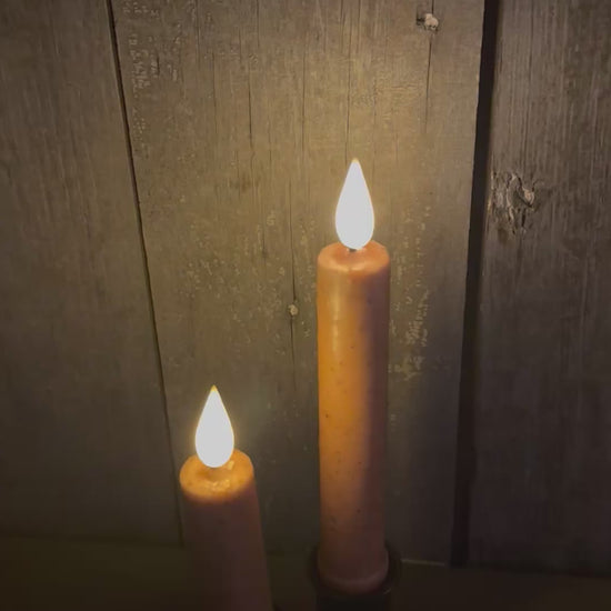 A must for the primitive home. The LED bulb of this 6 hour TIMER taper has a bright yet warm glow and a slight flicker. Covered in wax, they look beautiful in candle holders, on window sills or hung in one of our spiral door hangers, sold separately. Available in 4.5" and 6". CANDLE CUP NOT INCLUDED!